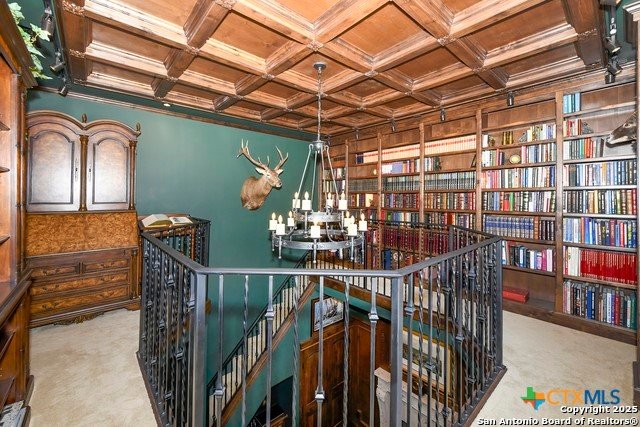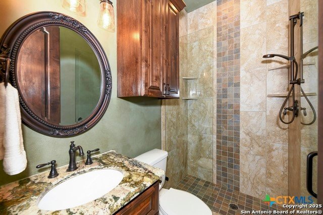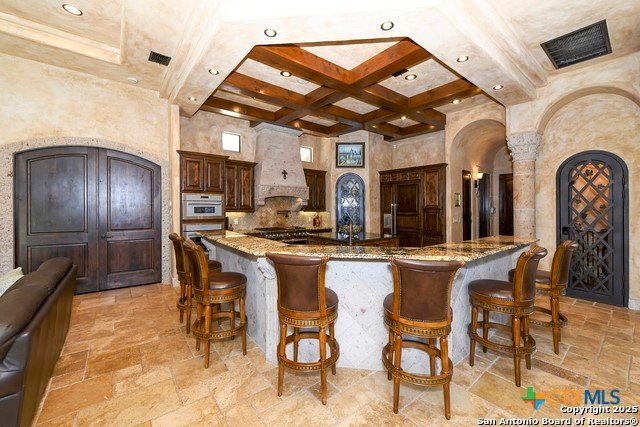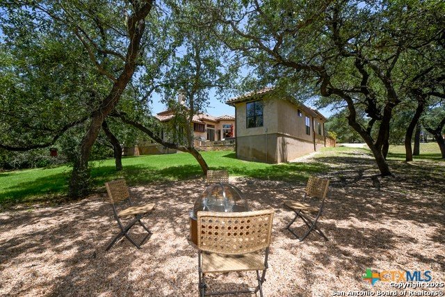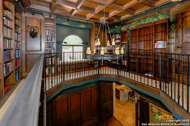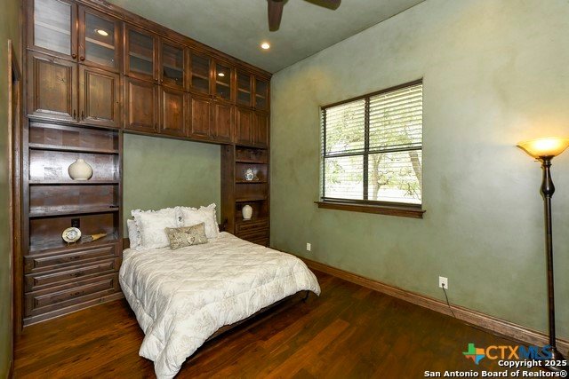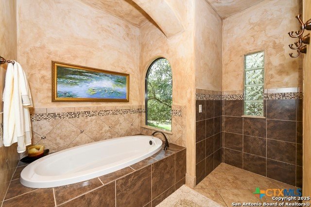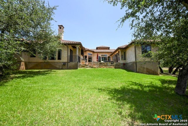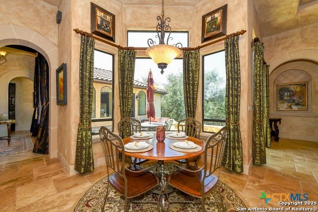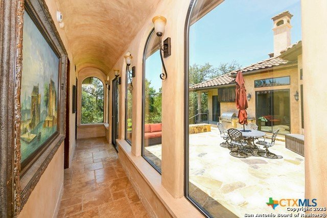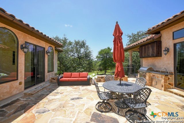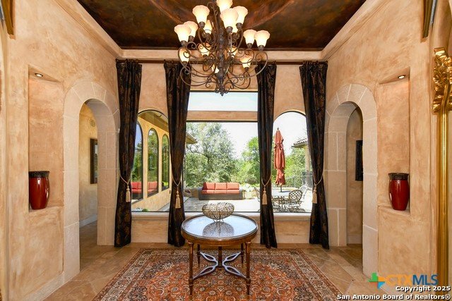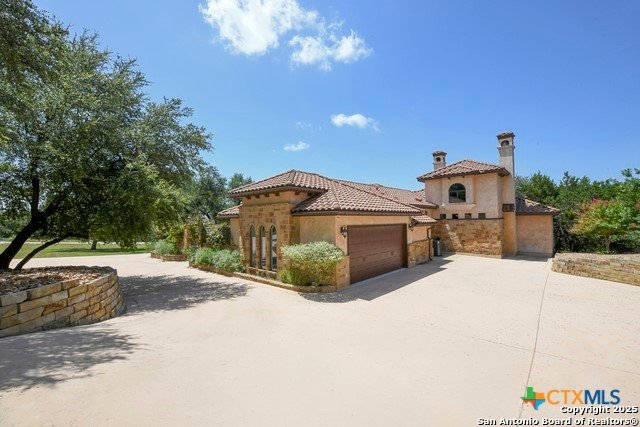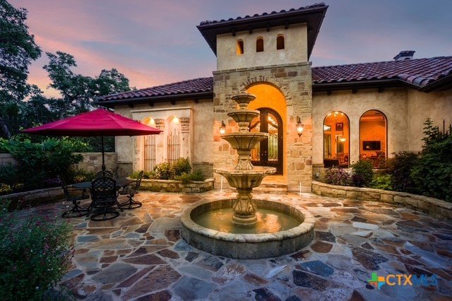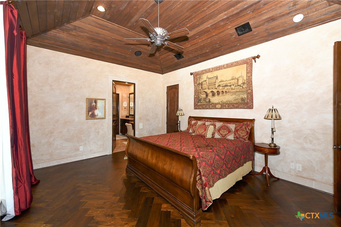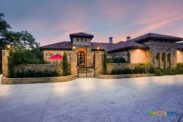 Amazing one of a kind custom built home on an acre in the hill country community of River Chase. True craftsmanship and premium materials, creating stunning living spaces. The sprawling modern floor plan features high ceilings, floor-to-ceiling windows, and stained wood T&G ceilings, flooding the interiors with abundant natural light. Custom ceiling and architectural details, upgraded light fixtures, a Cantera stone fireplace surround, and Versailles-pattern travertine flooring elevate the home's elegance. The chef's kitchen boasts Thermador stainless steel appliances, including a built-in refrigerator, dual dishwashers, a dual oven range, and an additional wall oven. The oversized master retreat offers herringbone-pattern wood floors, patio access, a spa-like bath with an oversized shower featuring three shower heads and a rain head, an expansive walk-in closet, and direct access to the study. Spacious guest suites come with large walk-in closets and built-in Murphy beds. Interior upgrades include an underground wine cellar, a two-story library with wood paneling on walls and ceilings, a temperature-controlled wine room, a central vacuum system, chiseled travertine, and herringbone wood flooring. Additional features are a slide-out coffee station in both the kitchen and master, old world stucco interior walls, powder bath, and guest room, and high-level granite and marble surfaces throughout. TThis home is prewired for a pool, equipped with whole-house surge protection, a new HVAC system in the main house (less than one year old), a hide-a-hose vacuum system, a water softener, and whole-house audio. Community has swimming pool, work out facility & gated river park.