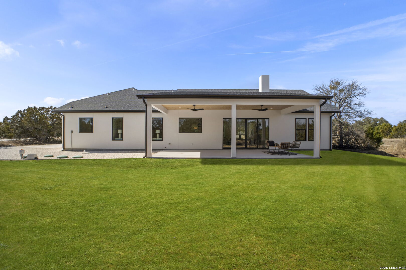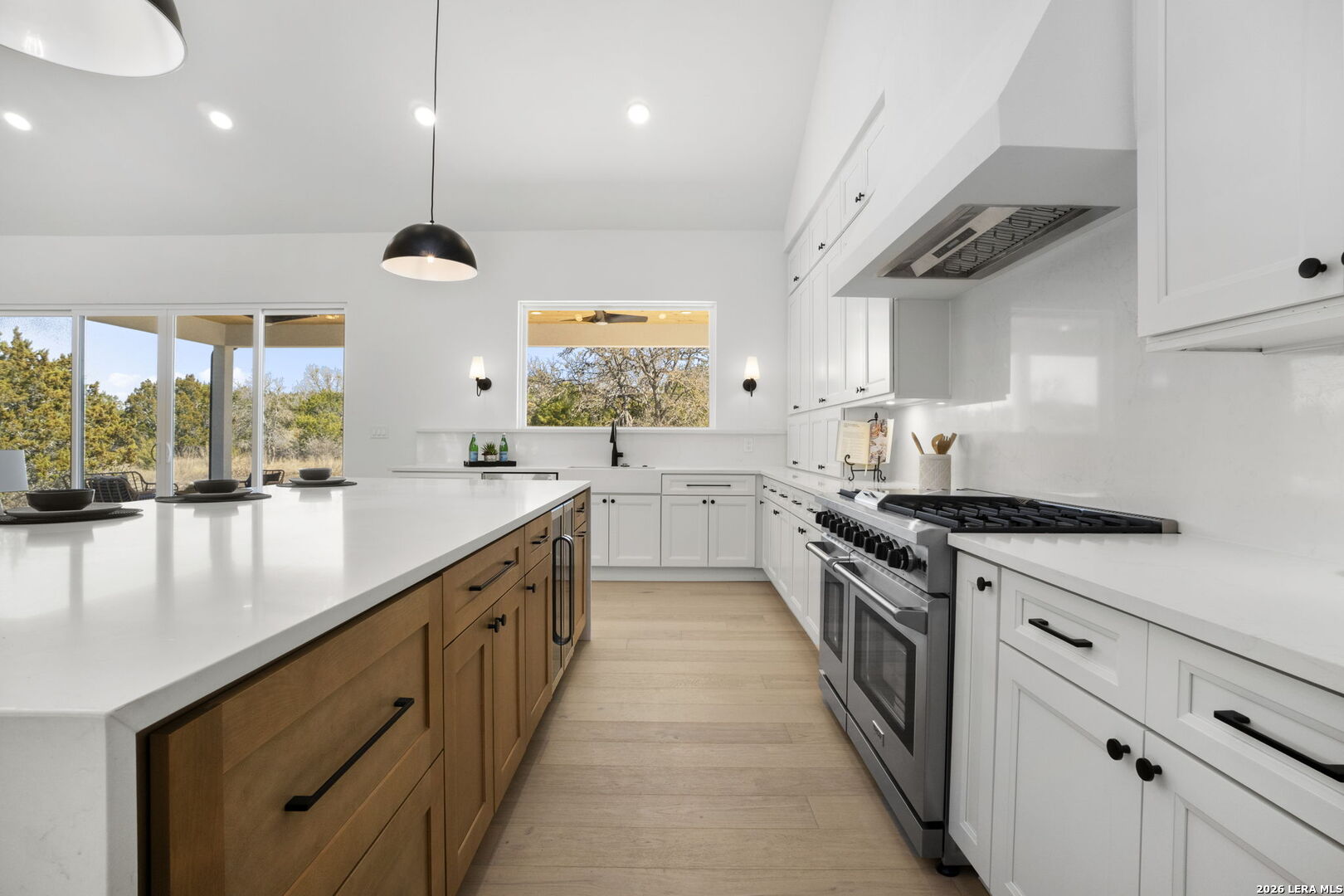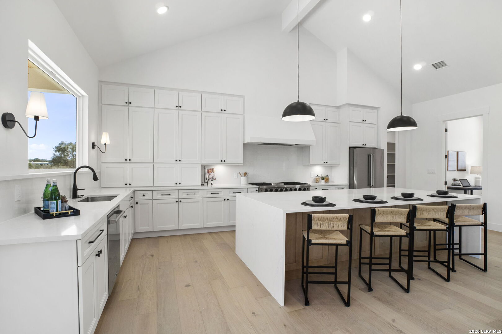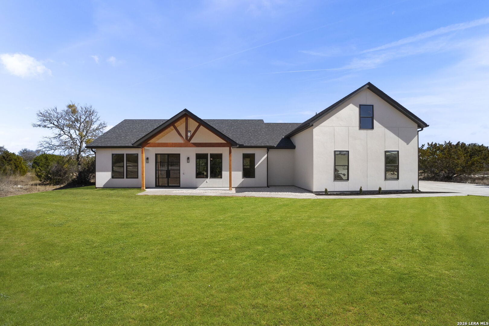Welcome home to this beautifully crafted newly built modern residence situated on 2.01 acres in Bandera, Texas, offering the perfect blend of luxury, space, and Hill Country living. Thoughtfully designed with an open-concept layout, this home showcases quality craftsmanship and high-end finishes throughout. Vaulted and coffered ceilings enhance the spacious feel of the main living areas, while hardwood flooring spans the main level, including all bedrooms. The heart of the home opens into a bright and inviting living space, ideal for both everyday living and entertaining. The gourmet kitchen is a true centerpiece, featuring an oversized island, custom cabinetry, and a full THOR appliance package, including the refrigerator. A gas range, custom vent hood, and decorative sconce lighting framing the kitchen window combine style with functionality. The primary suite is conveniently located on the main level, offering a private retreat with ample space and comfort. An additional secondary suite upstairs provides flexibility for guests, extended family, or a private living area. This 4-bedroom, 3.5-bath home is turn-key and move-in ready, and includes a 1-2-10 builder warranty for added peace of mind. Outside, the expansive 2.01-acre lot provides privacy, room to roam, and endless potential for outdoor living, future enhancements, or simply enjoying the peaceful surroundings of the Texas Hill Country. This property presents a rare opportunity to own a high-quality new construction home on acreage-truly a must-see to appreciate the design, space, and setting.