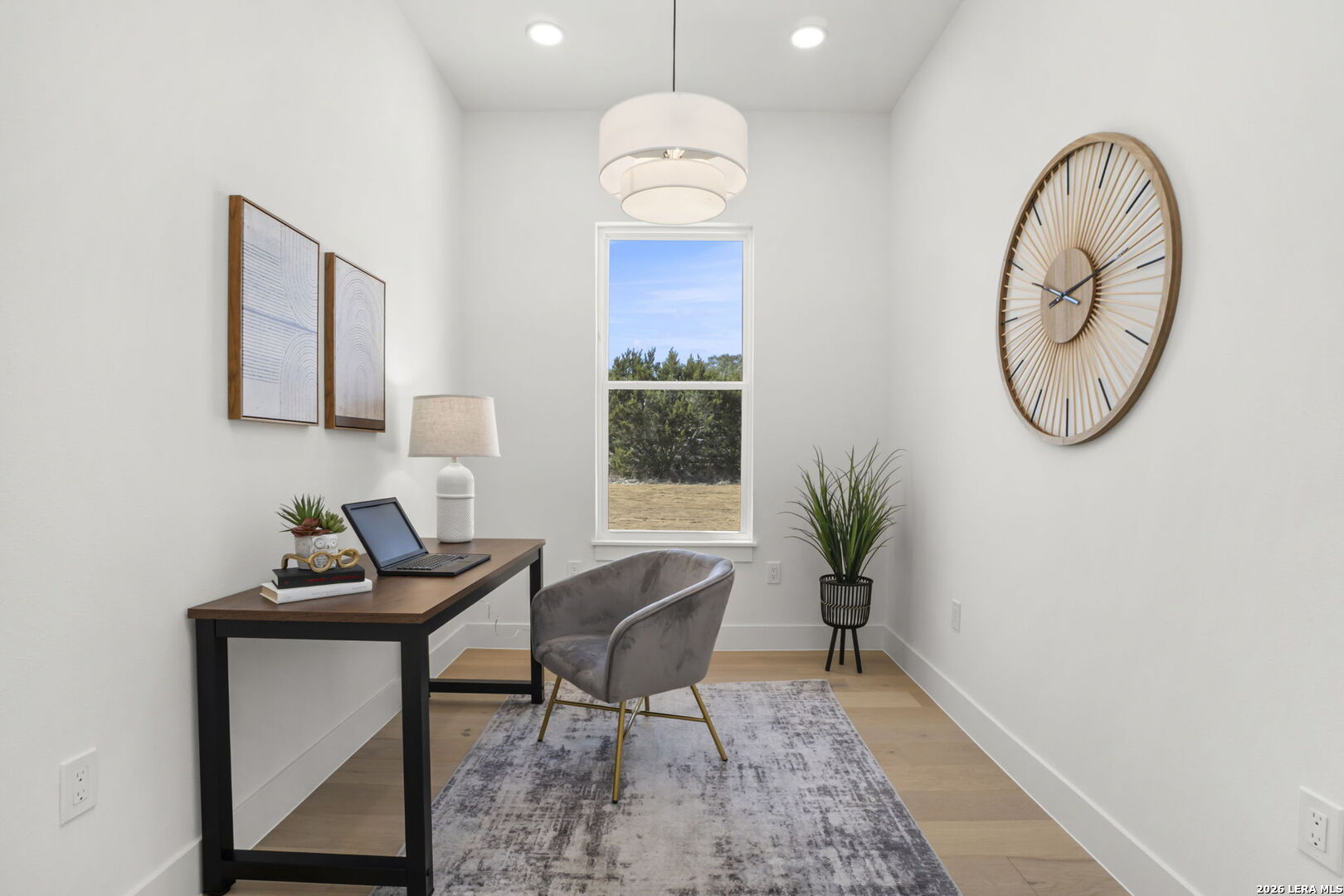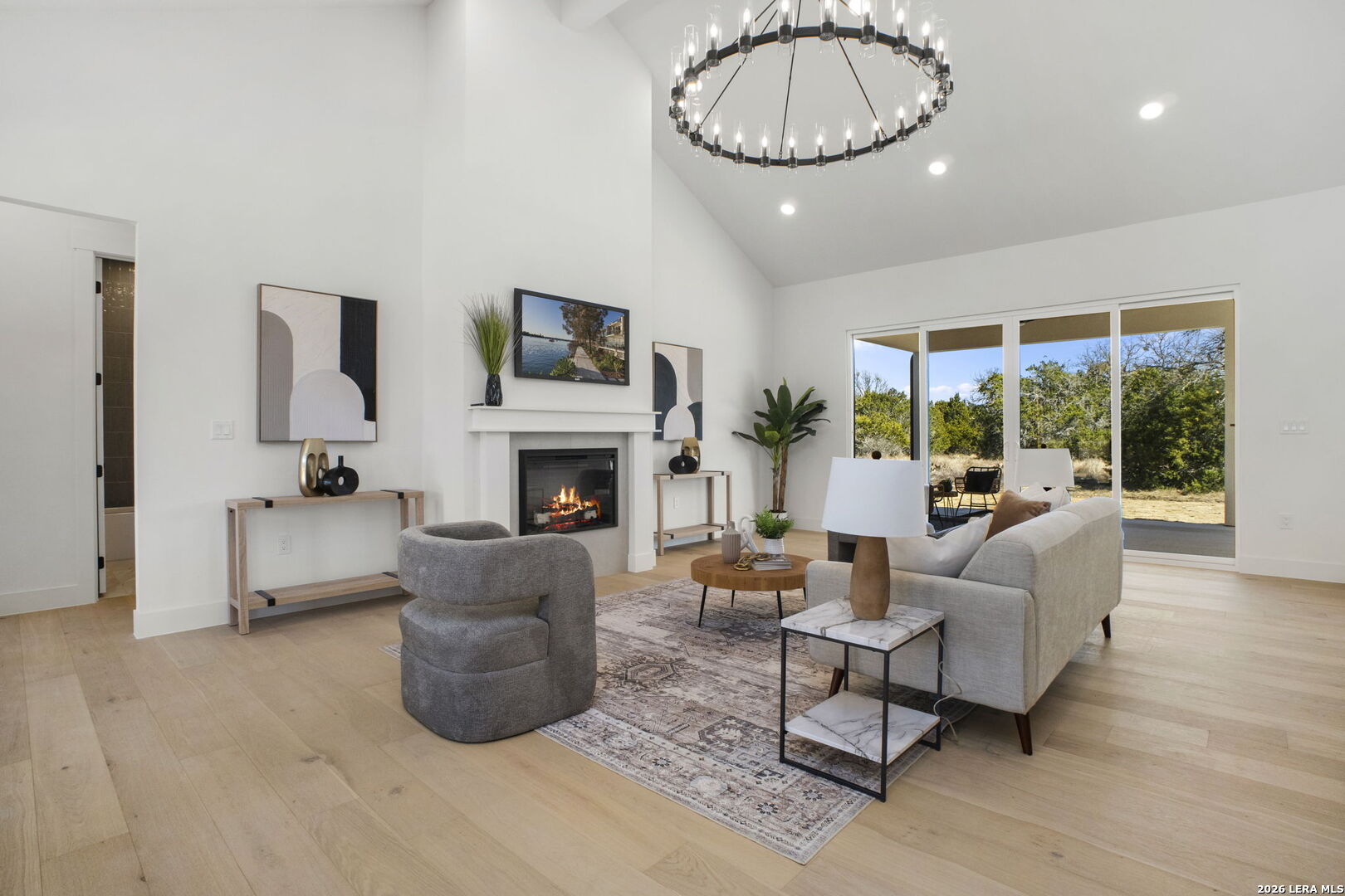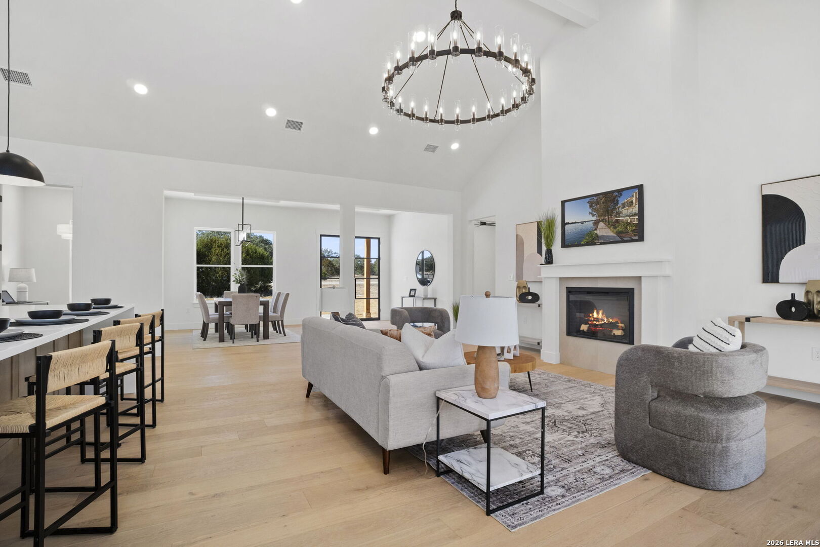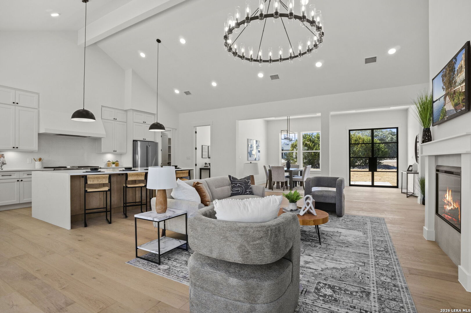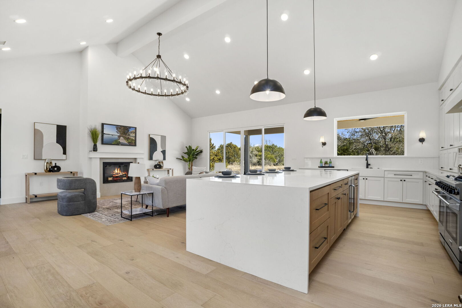 Welcome home to this beautifully crafted newly built modern residence situated on 2.01 acres in Bandera, Texas, offering the perfect blend of luxury, space, and Hill Country living. Thoughtfully designed with an open-concept layout, this home showcases quality craftsmanship and high-end finishes throughout. Vaulted and coffered ceilings enhance the spacious feel of the main living areas, while hardwood flooring spans the main level, including all bedrooms. The heart of the home opens into a bright and inviting living space, ideal for both everyday living and entertaining. The gourmet kitchen is a true centerpiece, featuring an oversized island, custom cabinetry, and a full THOR appliance package, including the refrigerator. A gas range, custom vent hood, and decorative sconce lighting framing the kitchen window combine style with functionality. The primary suite is conveniently located on the main level, offering a private retreat with ample space and comfort. An additional secondary suite upstairs provides flexibility for guests, extended family, or a private living area. This 4-bedroom, 3.5-bath home is turn-key and move-in ready, and includes a 1-2-10 builder warranty for added peace of mind. Outside, the expansive 2.01-acre lot provides privacy, room to roam, and endless potential for outdoor living, future enhancements, or simply enjoying the peaceful surroundings of the Texas Hill Country. This property presents a rare opportunity to own a high-quality new construction home on acreage-truly a must-see to appreciate the design, space, and setting.