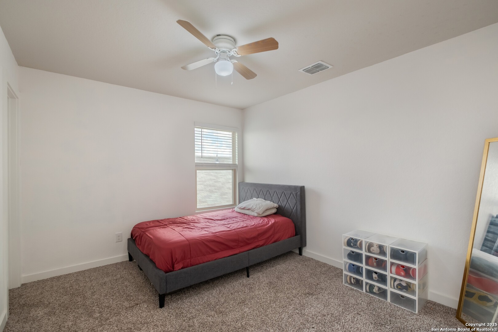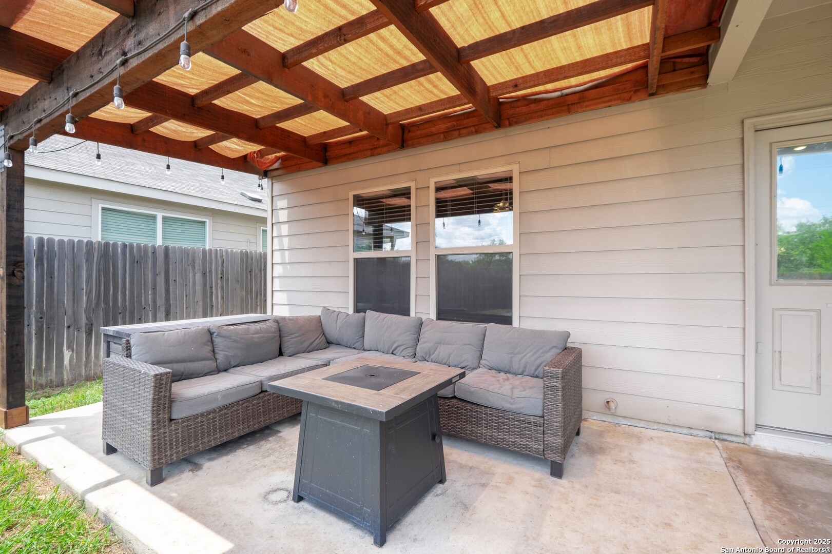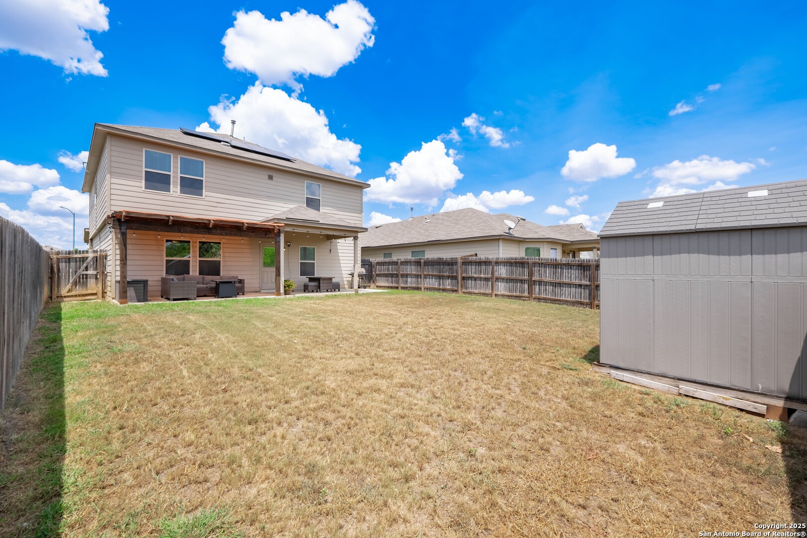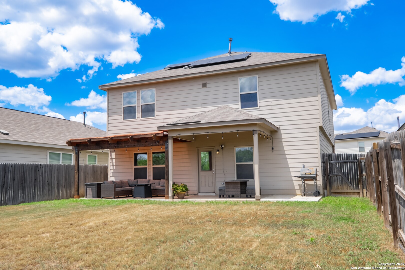 This beautiful 4-bedroom, 2.5-bath home offers 2,277 sq ft of spacious living on a 0.12-acre lot. Thoughtfully designed for comfort and functionality, the layout features a dedicated office/study just off the foyer and an open-concept living, dining, and kitchen space with granite counters, custom cabinets, a center island, and direct garage access. The home is equipped with a combination of gas and electric appliances, including a gas stove/oven and a gas-powered attic AC unit, while the water heater is electric. Upstairs, you'll find all four carpeted bedrooms, including a generous primary suite with a walk-in closet and an ensuite bath with a single vanity, walk-in shower, and soaking tub. A versatile bonus room provides space for a game room, media room, or second living area, and the laundry room is conveniently located upstairs for added ease and accessibility. Additional highlights include solar panels, a water softener, and a reverse osmosis system, all of which contribute to enhanced energy efficiency and modern comfort. Step outside to a covered patio and adjacent pergola, a private backyard with wood fencing that is ideal for morning coffee or entertaining, and a storage. Located in the desirable Republic Creek community, just along I-410, this home is close to Brooks City Base, H-E-B, Sam's Club, Walmart, Target, dining, and family entertainment, offering unbeatable access to everyday essentials and major routes.