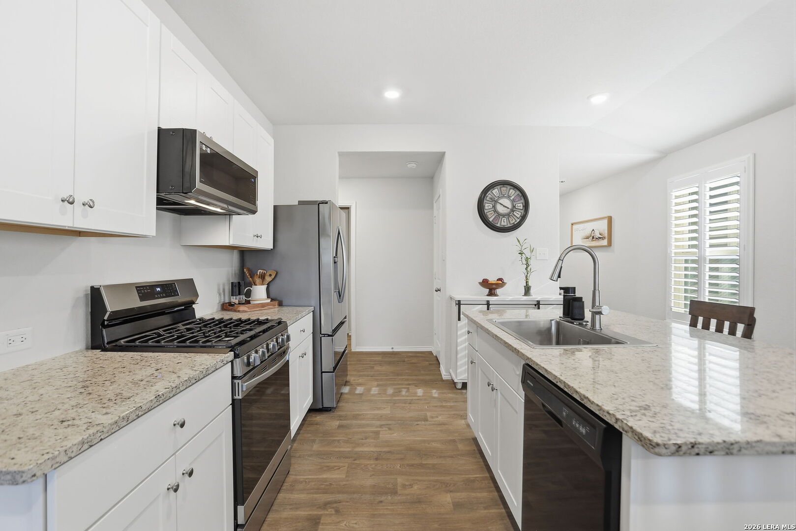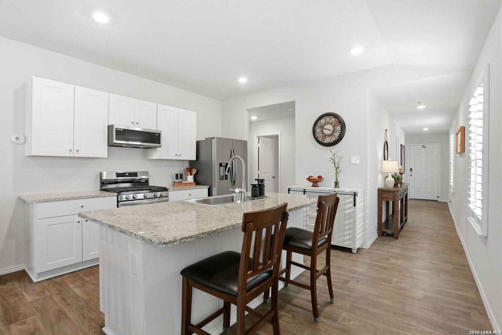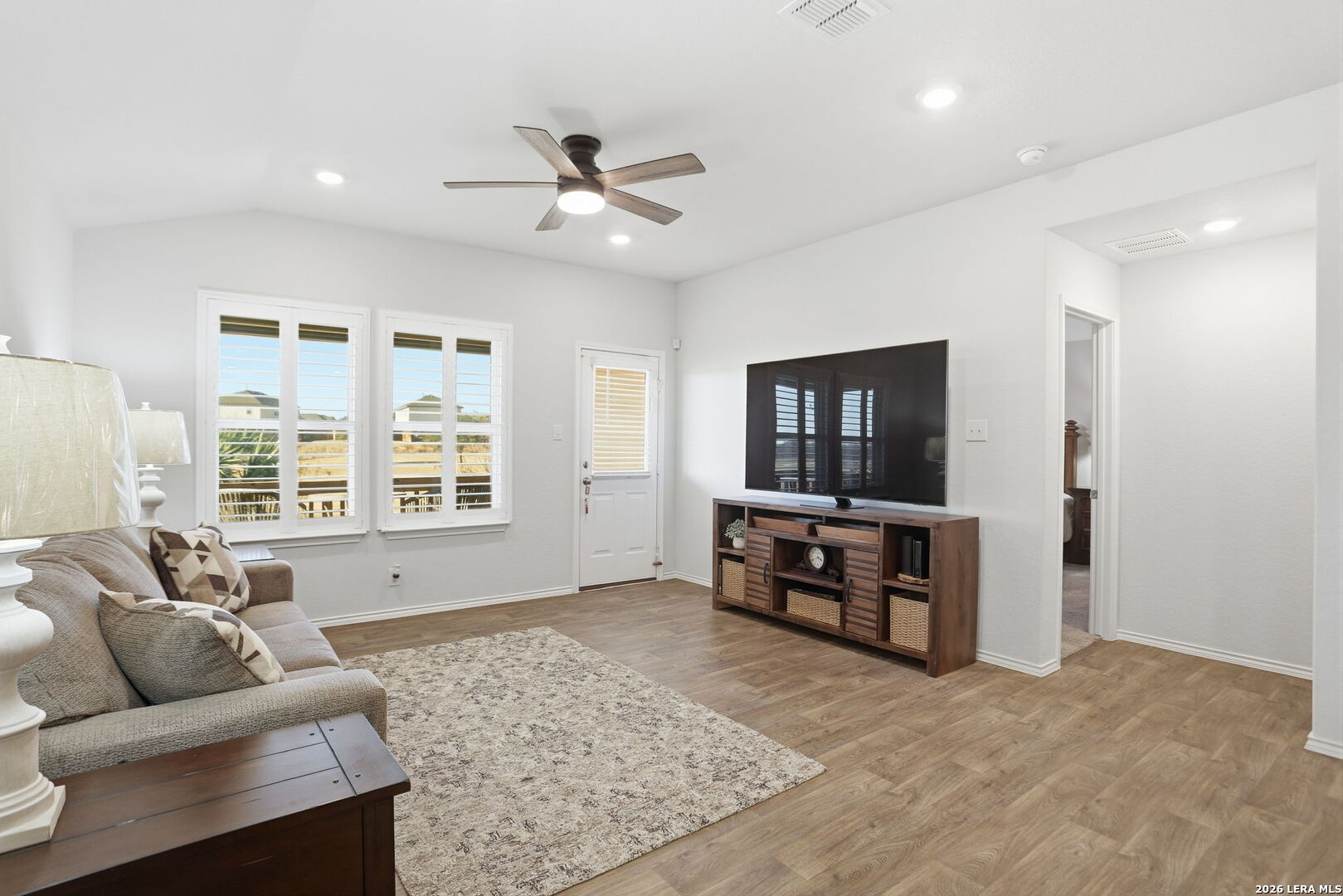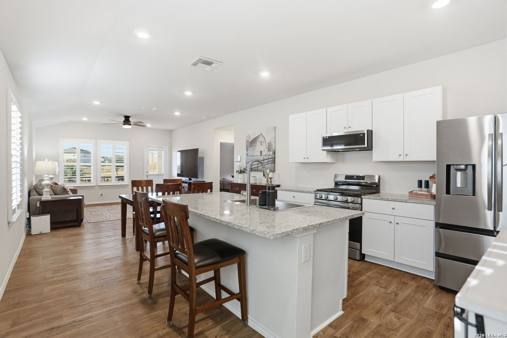 Welcome Home - to River Bend Golf Course Living in Floresville, Texas. This beautifully maintained home features 3 bedrooms and 2 bathrooms and sits on a premium lot overlooking the fairway at River Bend Golf Course. The home offers energy-efficient upgrades including exterior solar window screens, patio solar shades, and custom interior shutters, along with ceiling fans in the living room and all bedrooms and a front storm door. The landscaped backyard includes a flagstone patio and rear gate with direct views of the scenic fairway-perfect for relaxing or entertaining. The island kitchen features granite countertops, a new sink, and newer gas stove and microwave, with all appliances in excellent working condition and included with the home. The spacious primary suite includes custom storage systems by California Closets, with an additional custom closet in the second bathroom. The home is also equipped with smart security features including front and rear cameras, Google video Doorbell and Ring over head Garage camera. Residents enjoy community amenities including an 18-hole golf course, tennis courts, walking trails, and an Italian steakhouse restaurant, all just minutes from medical services, shopping, and schools. Over $41,677 in upgrades and improvements have been invested in the home, including new kitchen appliances (microwave, gas stove, and Samsung refrigerator), custom closets, custom blinds, energy-saving solar screens and patio shade, a flagstone patio, landscaping, backyard sidewalk extension, rear gate, storm door, ceiling fans, and additional interior updates-making this home move-in ready with thoughtful upgrades throughout.