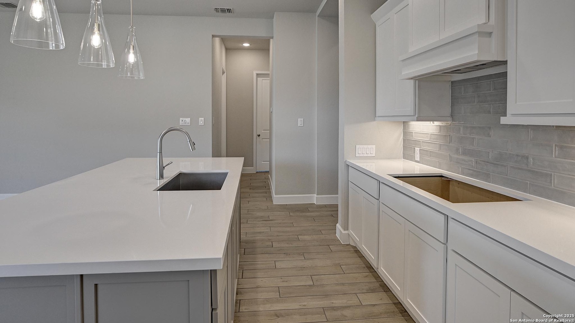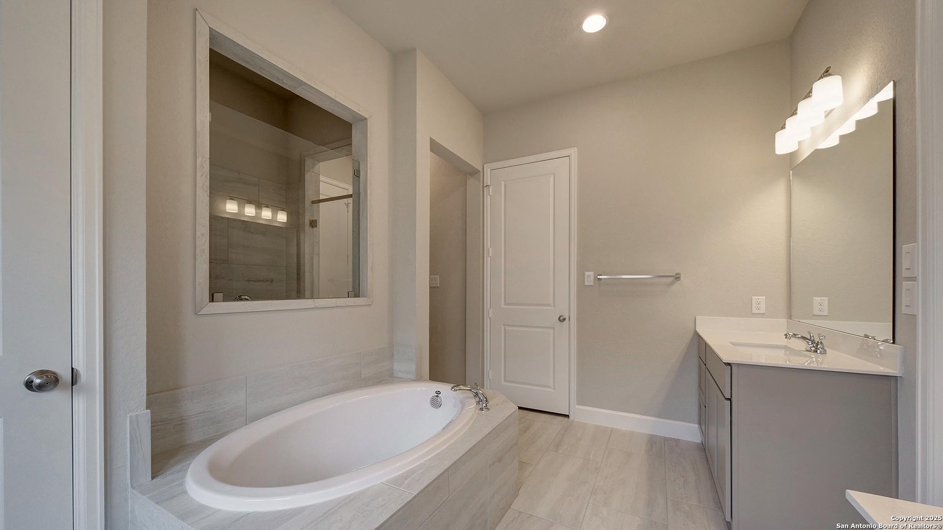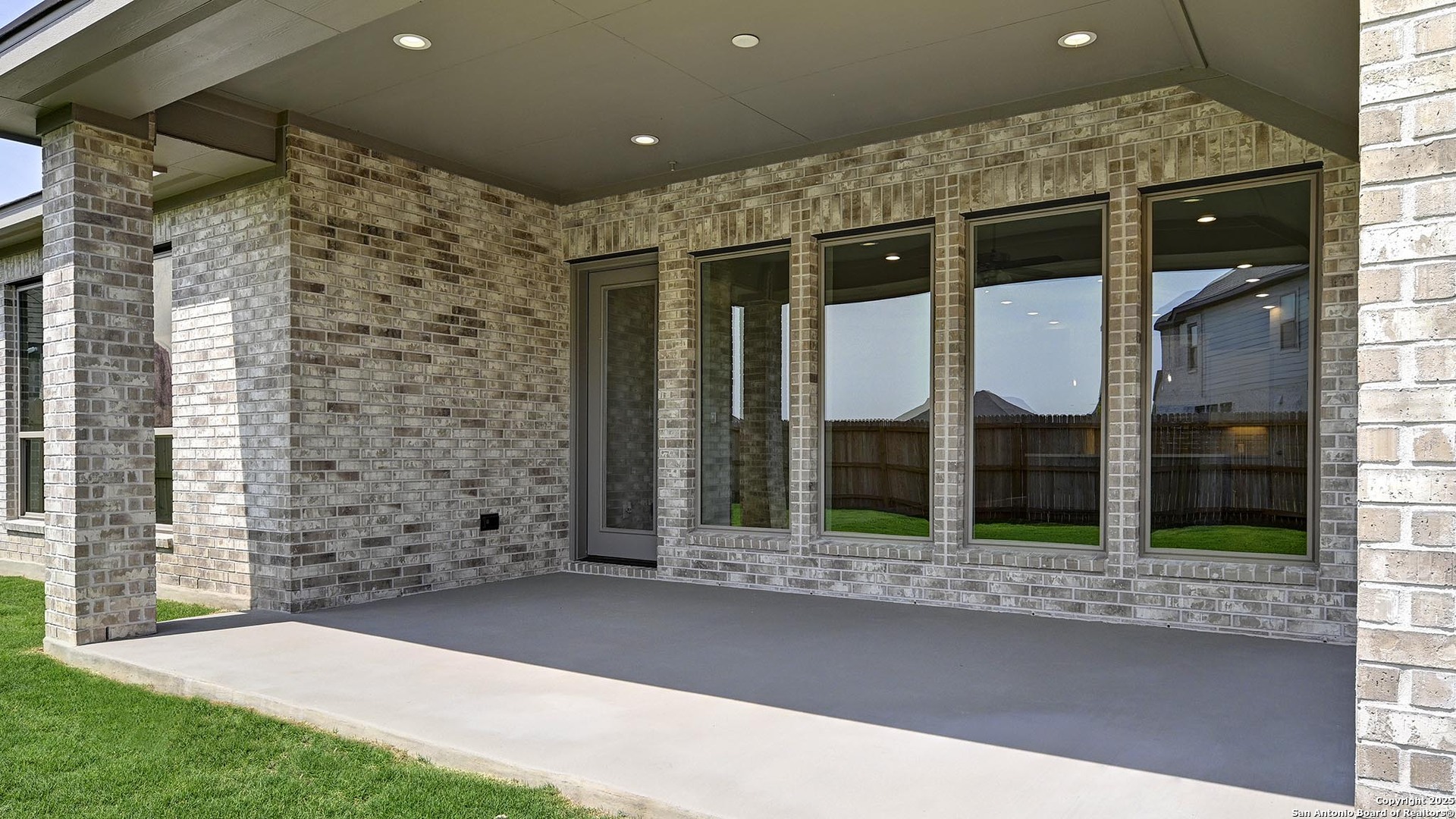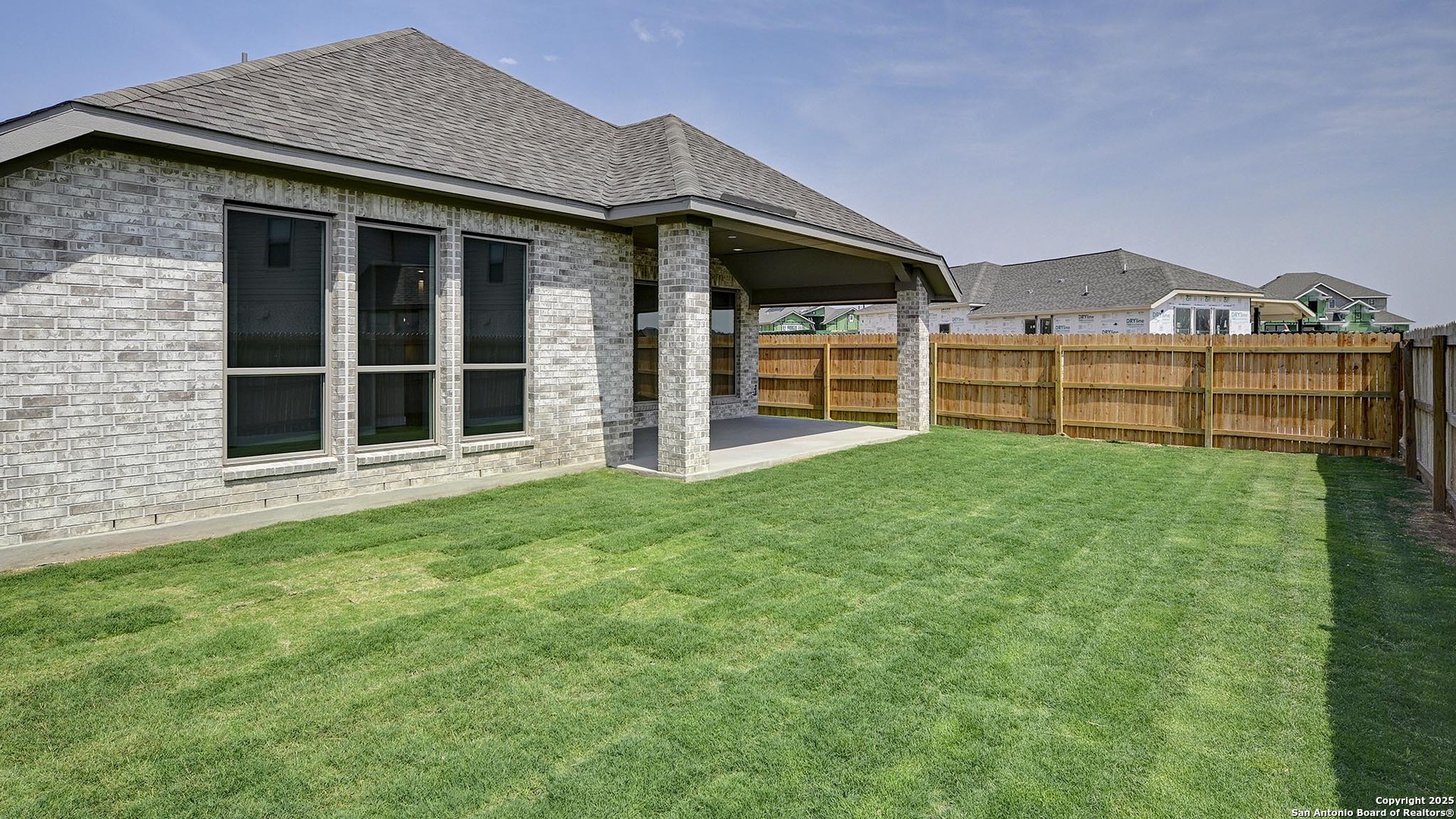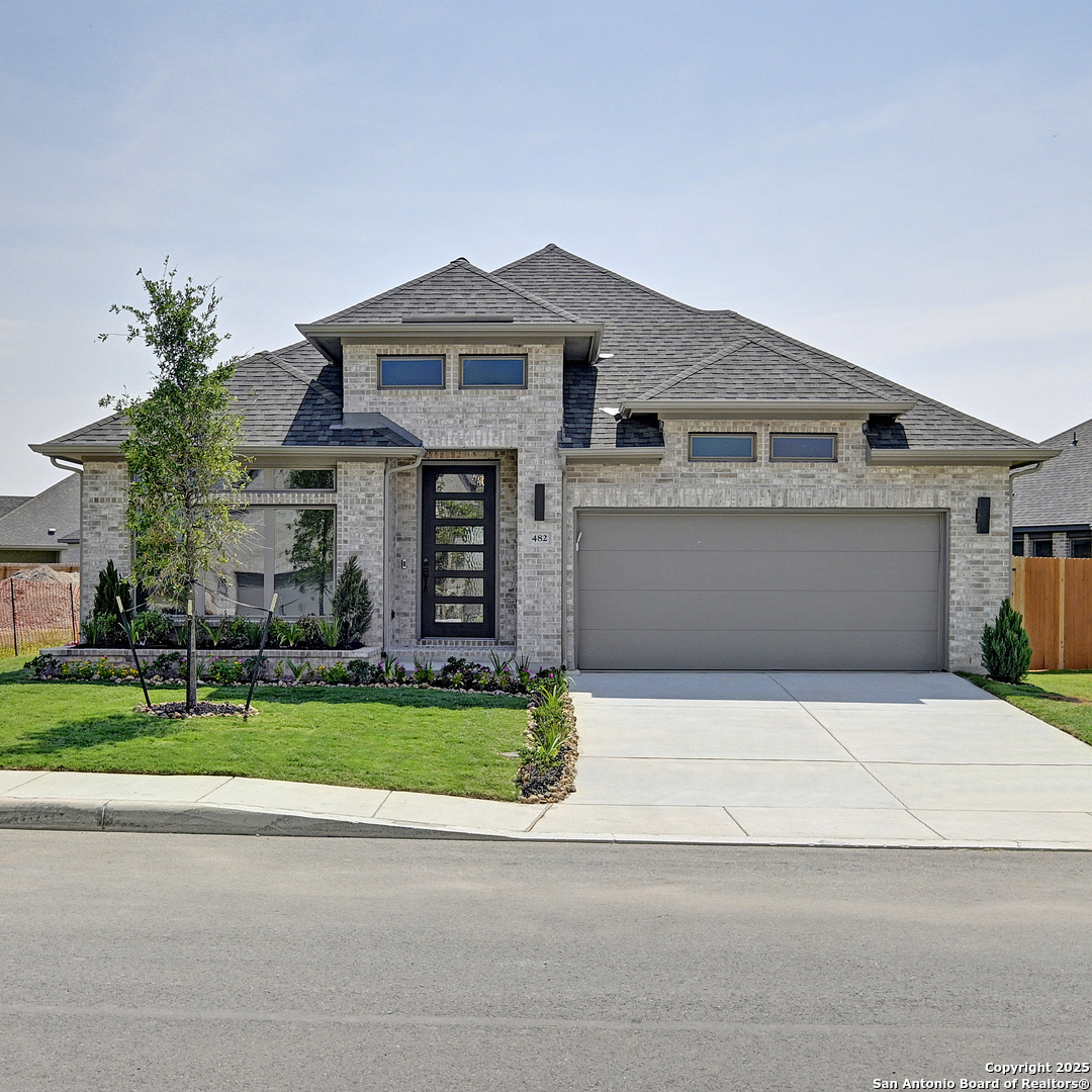 READY FOR MOVE-IN! Home office with French doors frame entry. Open family room with wall of windows extends through the dining area. Island kitchen offers built-in seating space and a corner walk-in pantry. Private primary suite with three large windows. Primary bathroom offers a French door entry, garden tub, separate glass enclosed shower, dual vanities, two walk-in closets and a linen closet. Guest suite with full bathroom and a walk-in closet. Additional bedrooms with walk-in closets, a utility room, additional bathroom and a linen closet. Extended covered backyard patio and 5-zone sprinkler system. Mud room off the two-car garage.