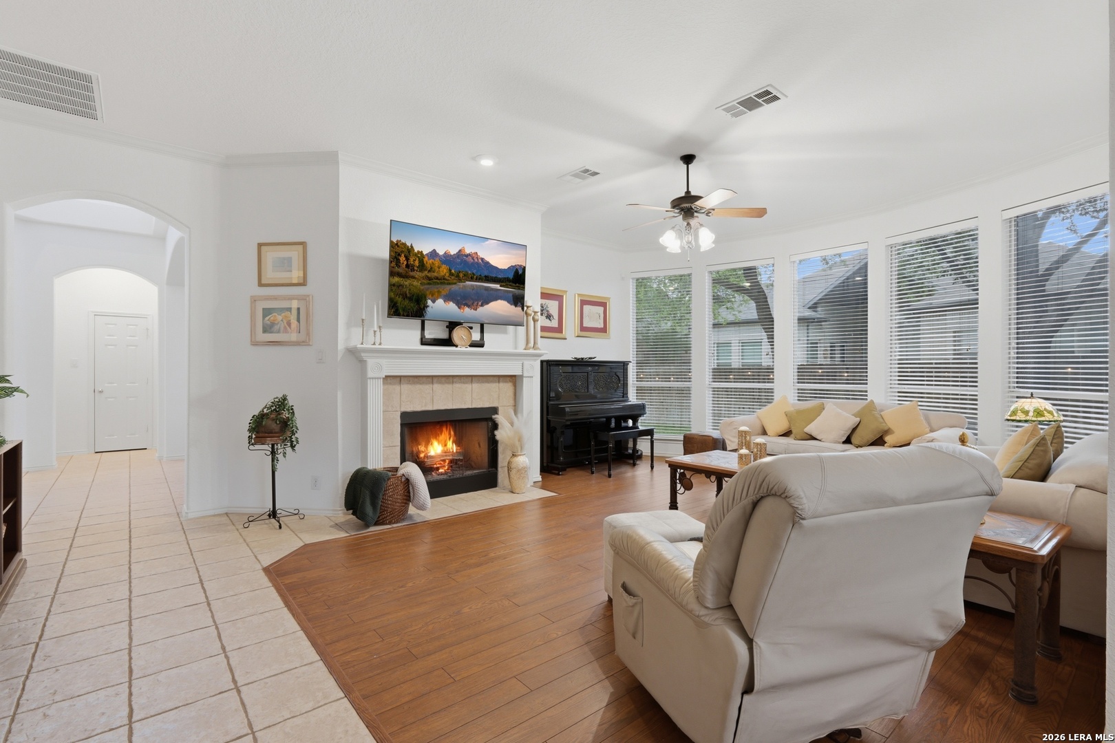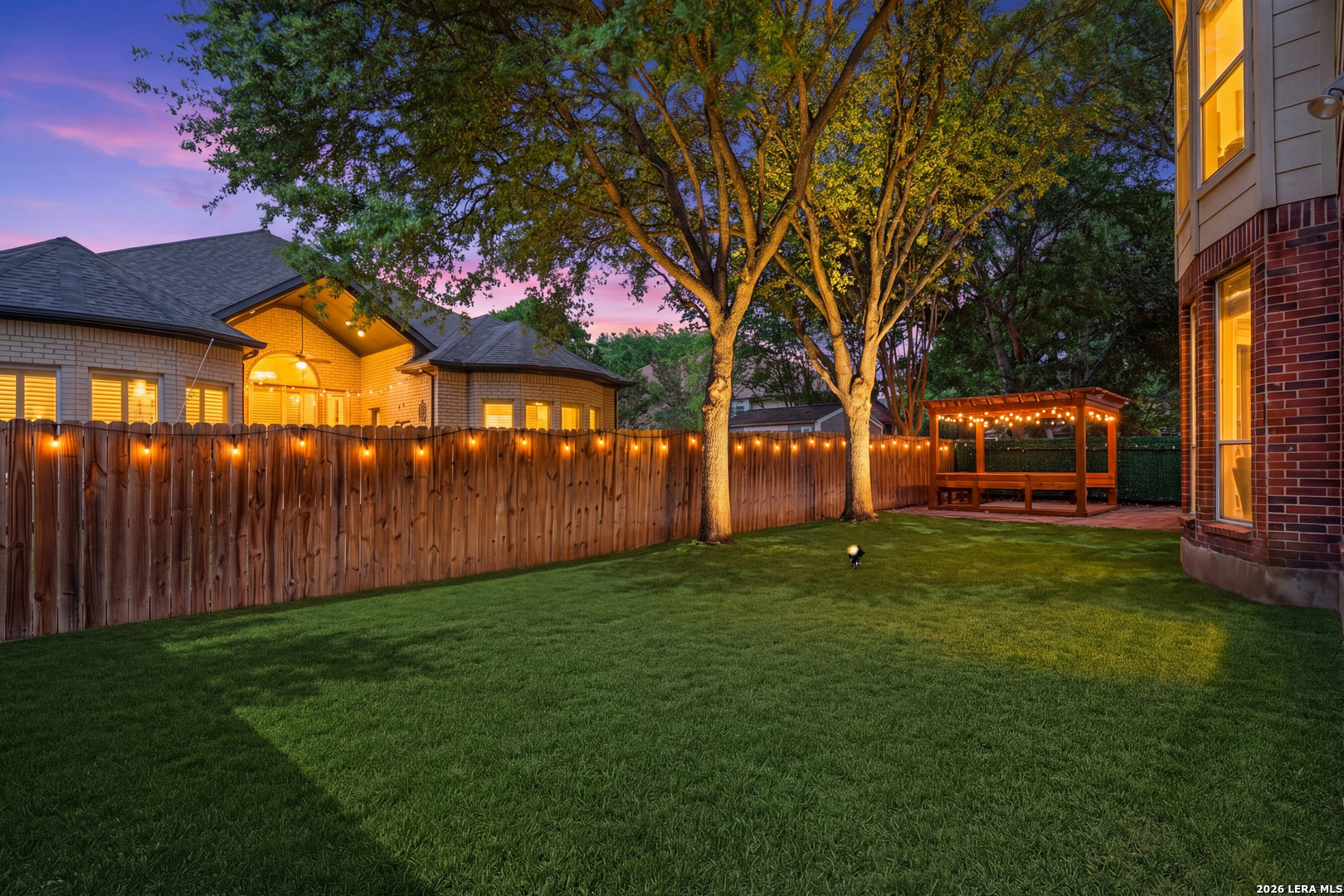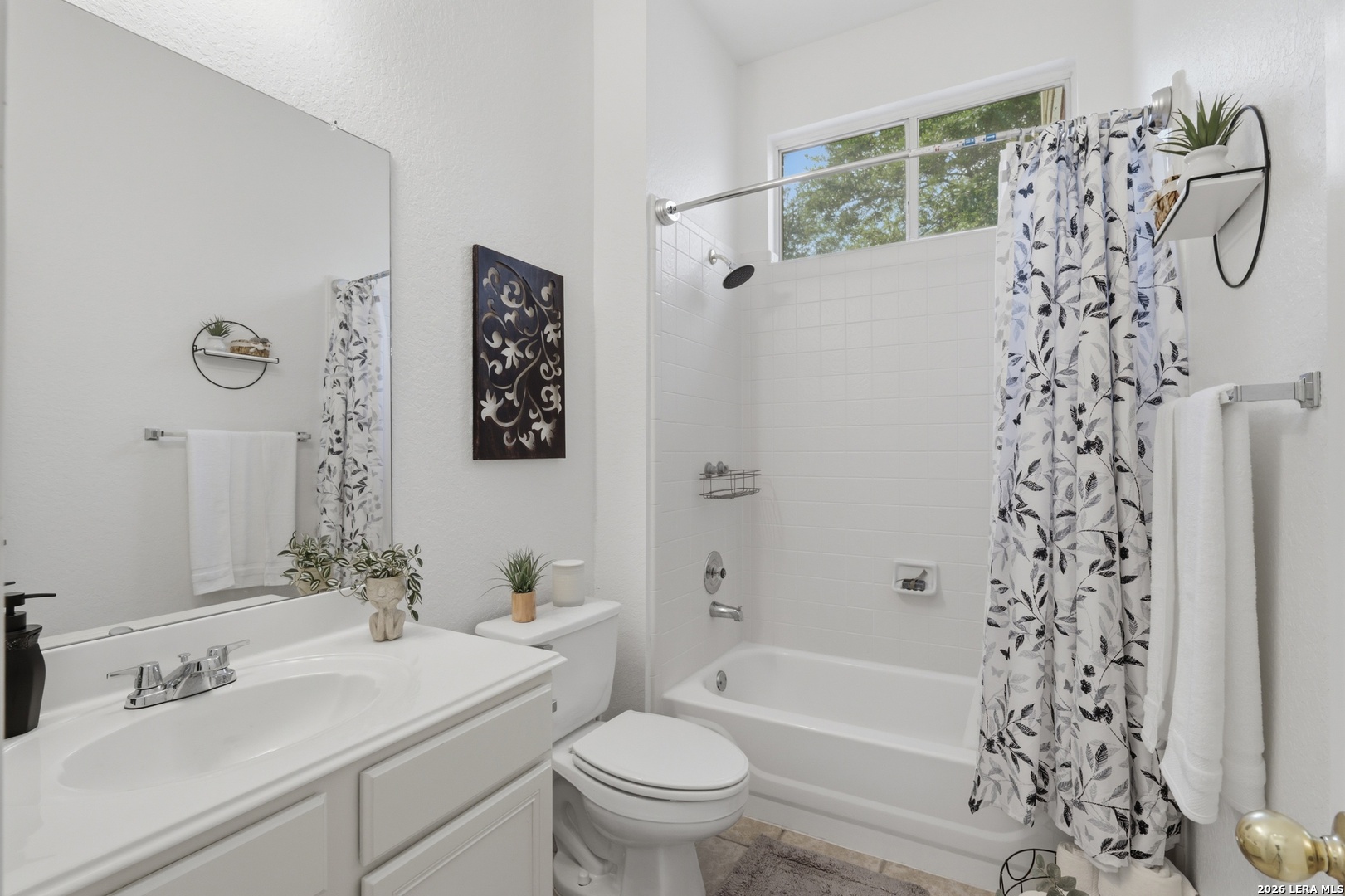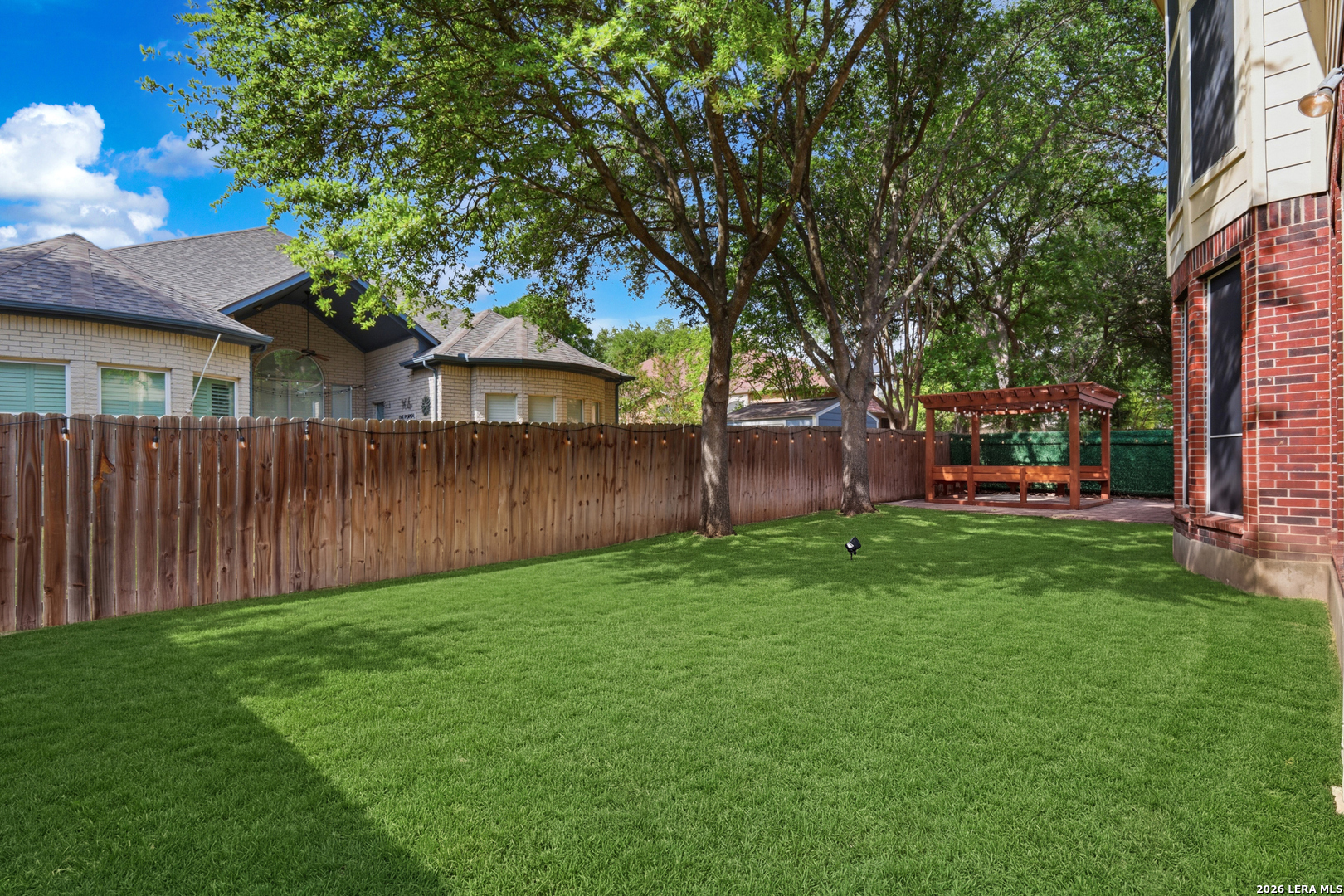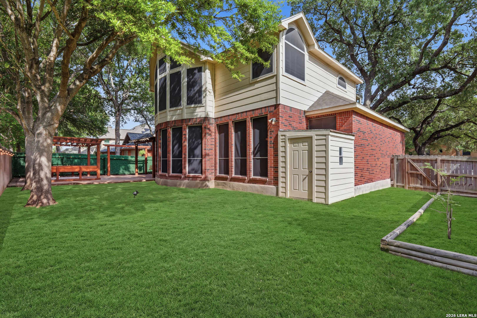 Stunning, meticulously maintained two-story home located in the highly desirable Woodbridge community. This exceptional residence is in a cul-de-sac and features 3 spacious bedrooms, 3 full bathrooms, a home office, a 2-car garage, and a full sprinkler system. Step inside to an inviting open-concept layout filled with natural light, highlighted by soaring ceilings, tall windows, and a spacious living room with a cozy fireplace. The gourmet kitchen is a chef's dream, showcasing granite countertops, custom cabinetry, a large island with a breakfast bar, and seamless flow into the living and dining areas, perfect for both everyday living and entertaining. The main level offers a home office, multiple living and dining spaces designed for comfort and functionality, and a guest bedroom. Upstairs, the expansive primary suite features a wall of windows and a beautifully appointed en suite bath complete with a soaking tub, walk-in shower, dual vanities, and a generous walk-in closet. The second floor also includes well-sized secondary bedrooms and a large game room with built-in cabinetry, ideal for a media room, study, or flexible living space. Enjoy outdoor living under the covered patio or relax in the charming gazebo with built-in seating, all surrounded by mature oak trees in a peaceful setting. Conveniently located near parks, shopping, dining, and entertainment, including The Forum at Olympia Parkway, IKEA, RBFCU, Academy, and Costco. Just minutes from Randolph Brooks Air Force Base and Fort Sam Houston, with easy access to I-35 and Loop 1604, and a short drive to New Braunfels and San Marcos Outlets. This exceptional home offers the perfect blend of comfort, style, and location. The security system is leased and will be removed prior to closing. This one won't last!