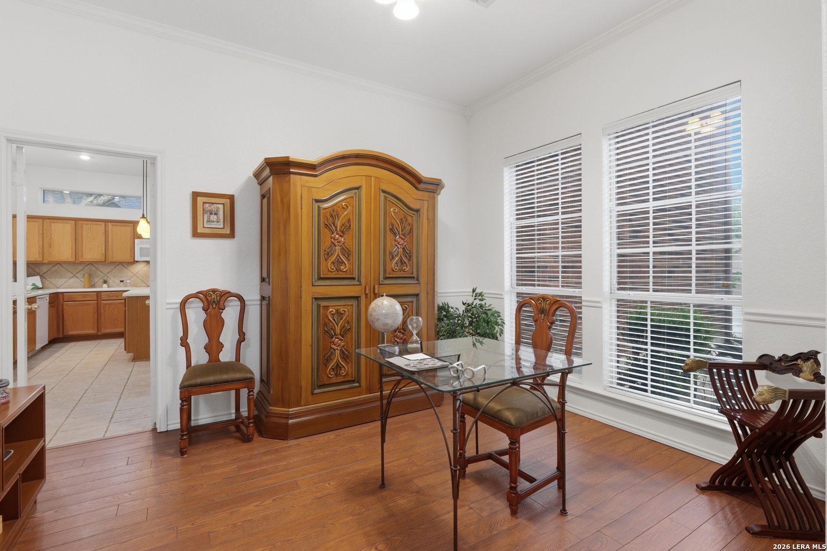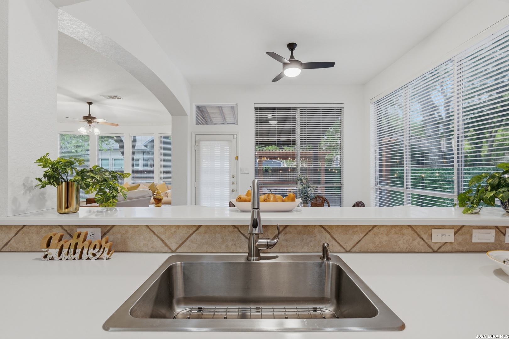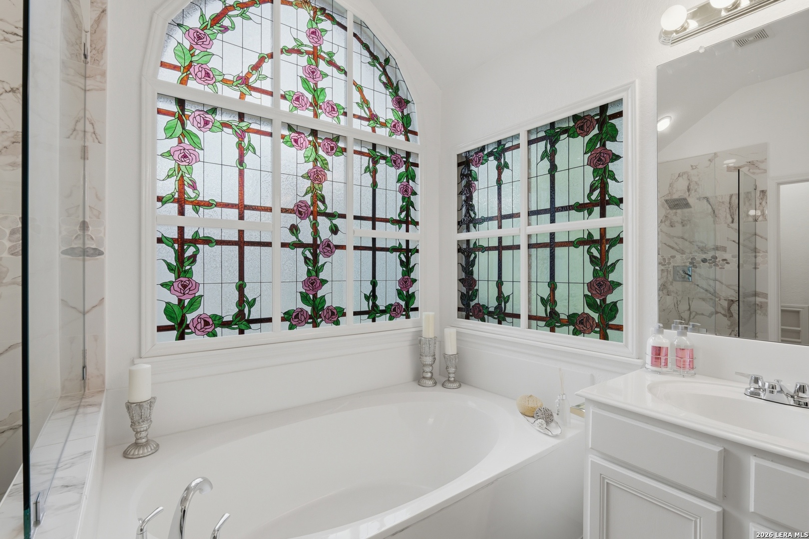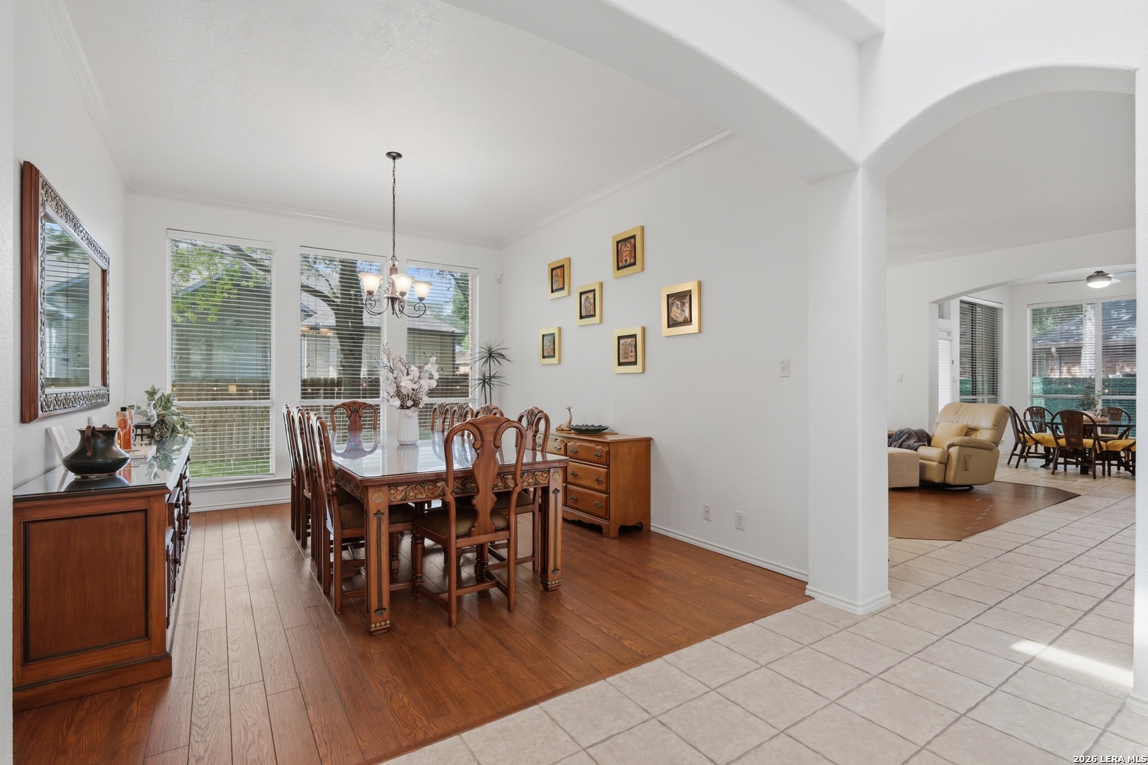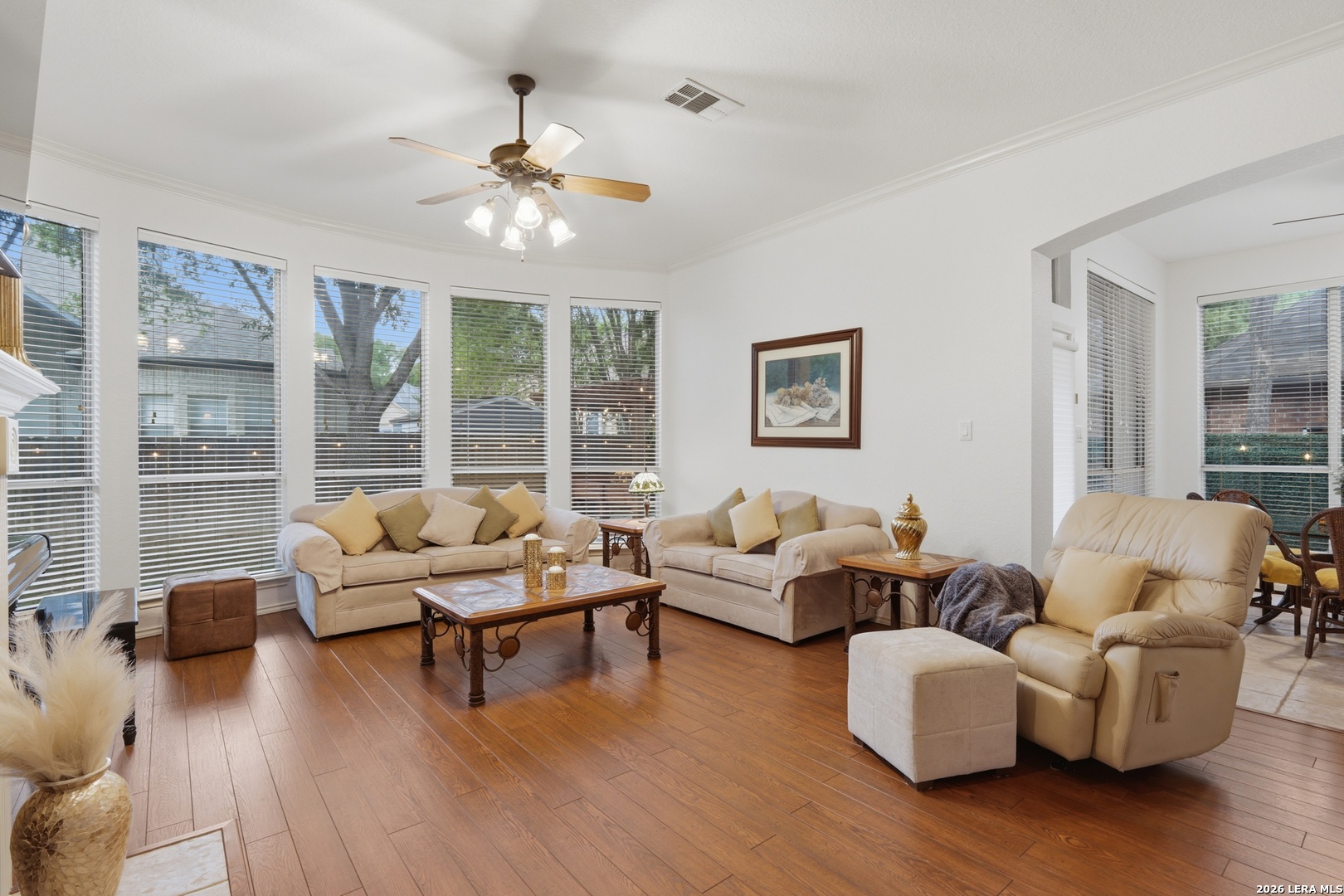 Stunning, meticulously maintained two-story home located in the highly desirable Woodbridge community. This exceptional residence is in a cul-de-sac and features 3 spacious bedrooms, 3 full bathrooms, a home office, a 2-car garage, and a full sprinkler system. Step inside to an inviting open-concept layout filled with natural light, highlighted by soaring ceilings, tall windows, and a spacious living room with a cozy fireplace. The gourmet kitchen is a chef's dream, showcasing granite countertops, custom cabinetry, a large island with a breakfast bar, and seamless flow into the living and dining areas, perfect for both everyday living and entertaining. The main level offers a home office, multiple living and dining spaces designed for comfort and functionality, and a guest bedroom. Upstairs, the expansive primary suite features a wall of windows and a beautifully appointed en suite bath complete with a soaking tub, walk-in shower, dual vanities, and a generous walk-in closet. The second floor also includes well-sized secondary bedrooms and a large game room with built-in cabinetry, ideal for a media room, study, or flexible living space. Enjoy outdoor living under the covered patio or relax in the charming gazebo with built-in seating, all surrounded by mature oak trees in a peaceful setting. Conveniently located near parks, shopping, dining, and entertainment, including The Forum at Olympia Parkway, IKEA, RBFCU, Academy, and Costco. Just minutes from Randolph Brooks Air Force Base and Fort Sam Houston, with easy access to I-35 and Loop 1604, and a short drive to New Braunfels and San Marcos Outlets. This exceptional home offers the perfect blend of comfort, style, and location. The security system is leased and will be removed prior to closing. This one won't last!