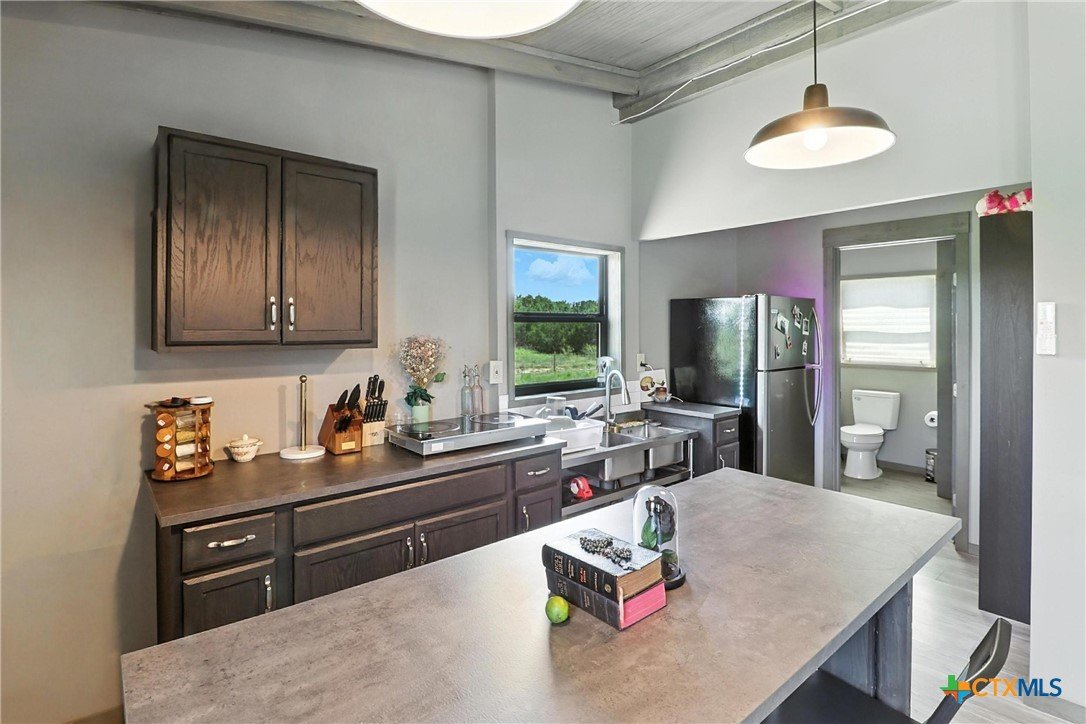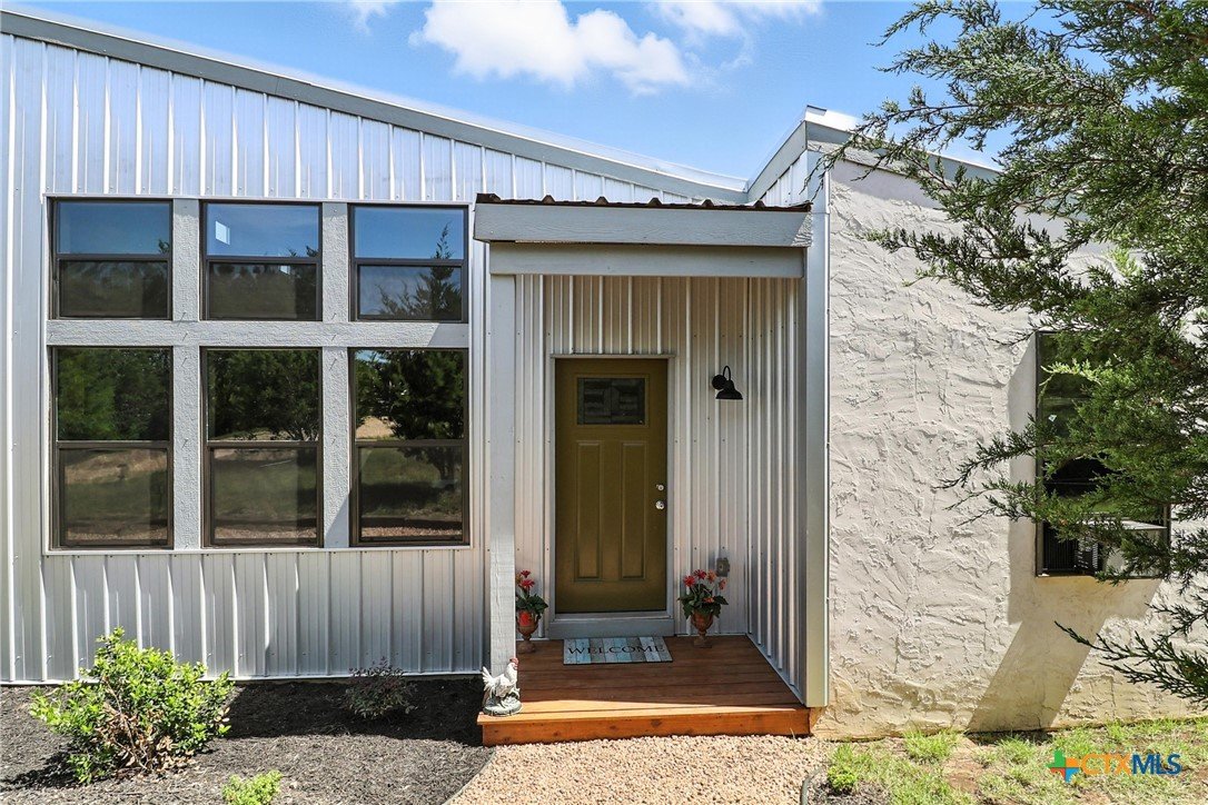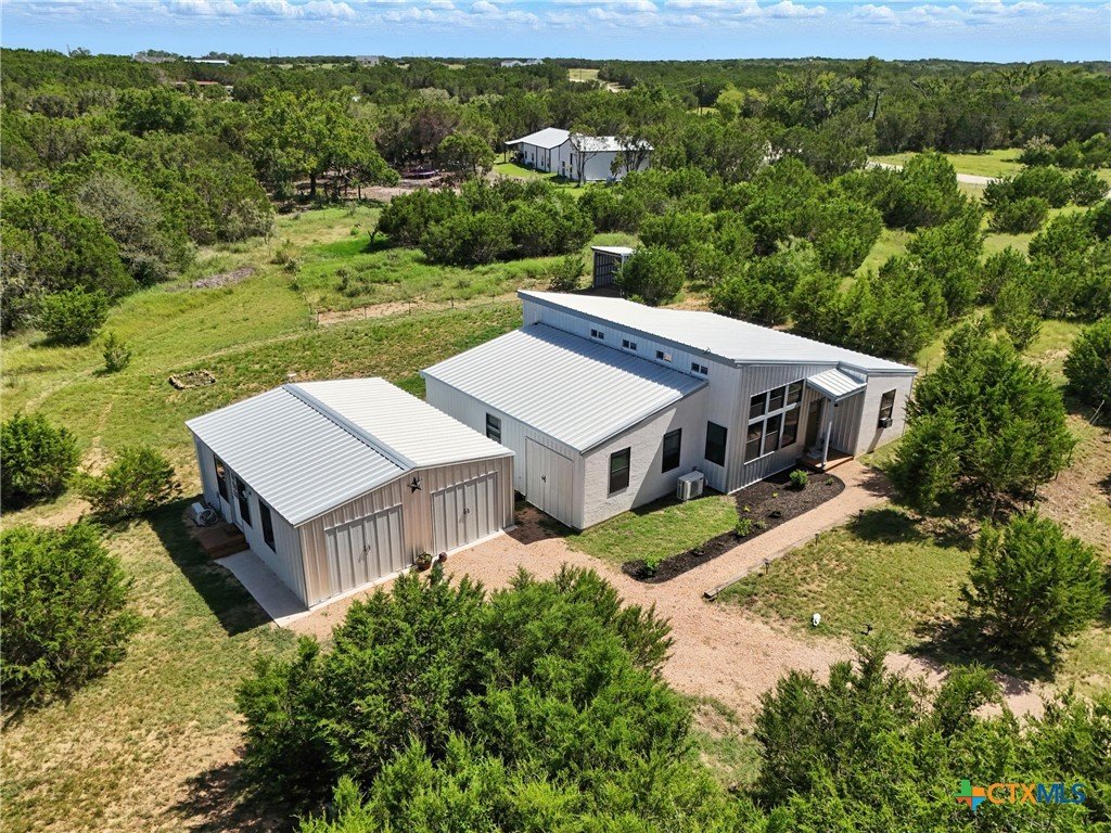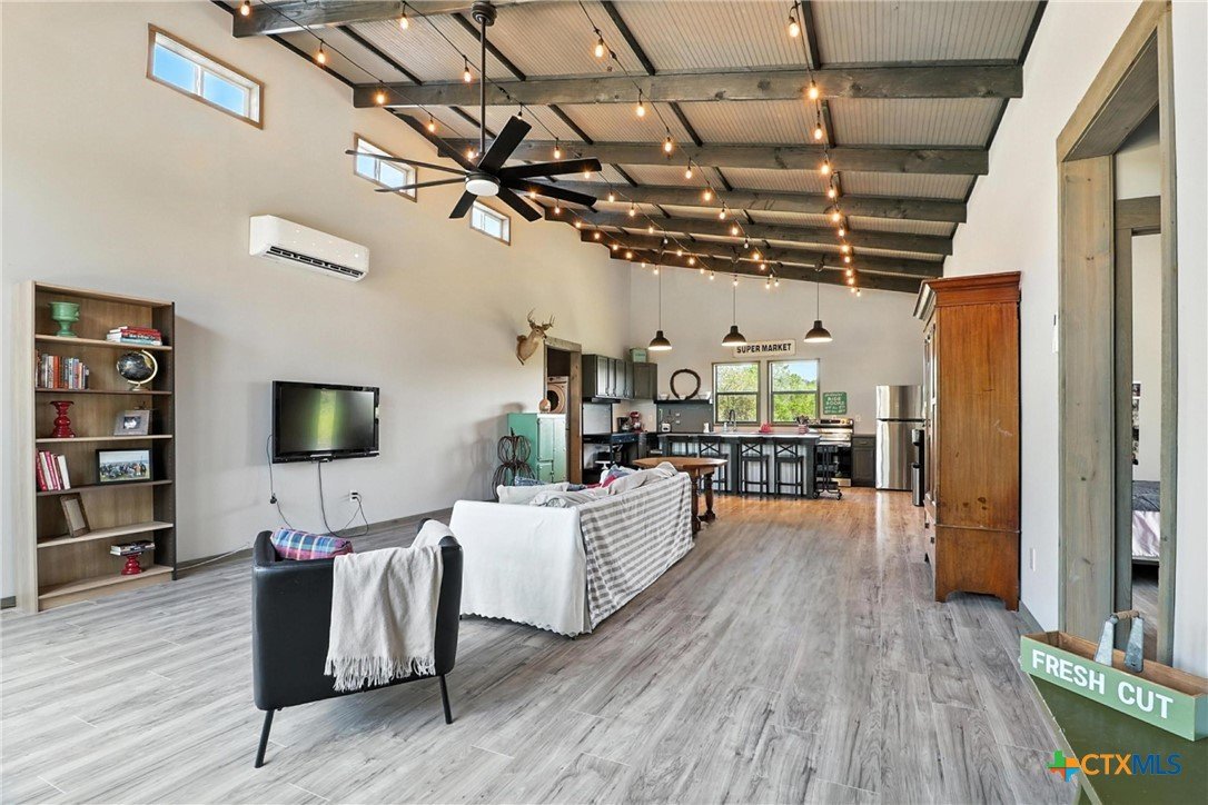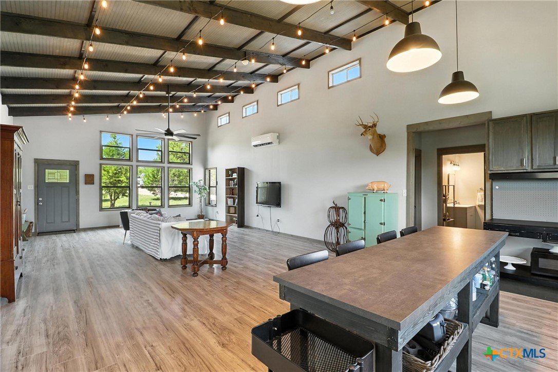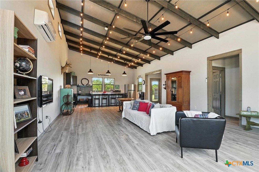 AFFORDABLE Country Living has Arrived! This barndo style home built in 2022 features three bedrooms, two bathrooms, great room style living/dining with a split plan. Kitchen is open to the entire great room area with island dining adorned with pendant lighting as a visual separation. Soaring beamed ceilings give the feeling of sprawling space in this 1684 sq ft main home. Dual head mini-split for the primary suite and main area, small window units for each of the additional bedrooms. Covered front porch greets you and the covered back porch is great for sunset views. Additionally, an attached storage room could easily be made into additional living space or is excellent storage as is. Detached two-car metal garage with an approximately 400 sq ft HVAC space with full bathroom gives you ample options. This space is the perfect home office, hobby space, studio, or potential ADU. Fenced and cross-fenced with a loafing shed; bring your horse! Ag use letter with low taxes. Minimal restrictions in this gated community. If you have been looking for your own little piece of Texas country at an affordable price, welcome to 495 Hurst Place Blvd! This value cannot be beat!! PRICED TO SELL