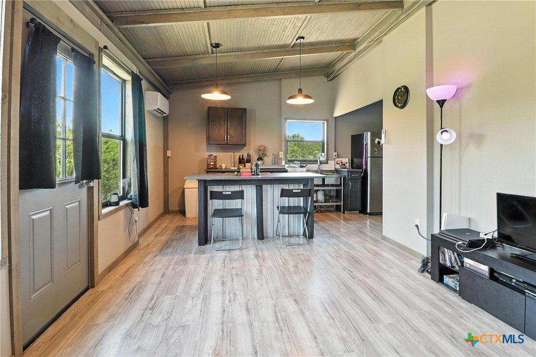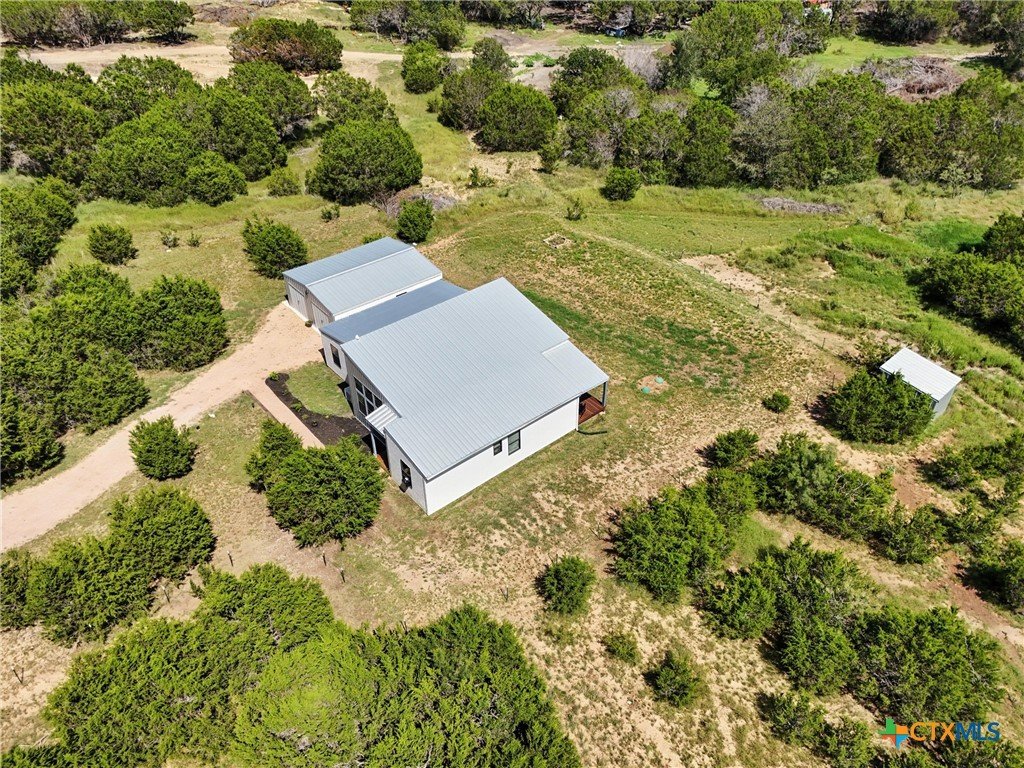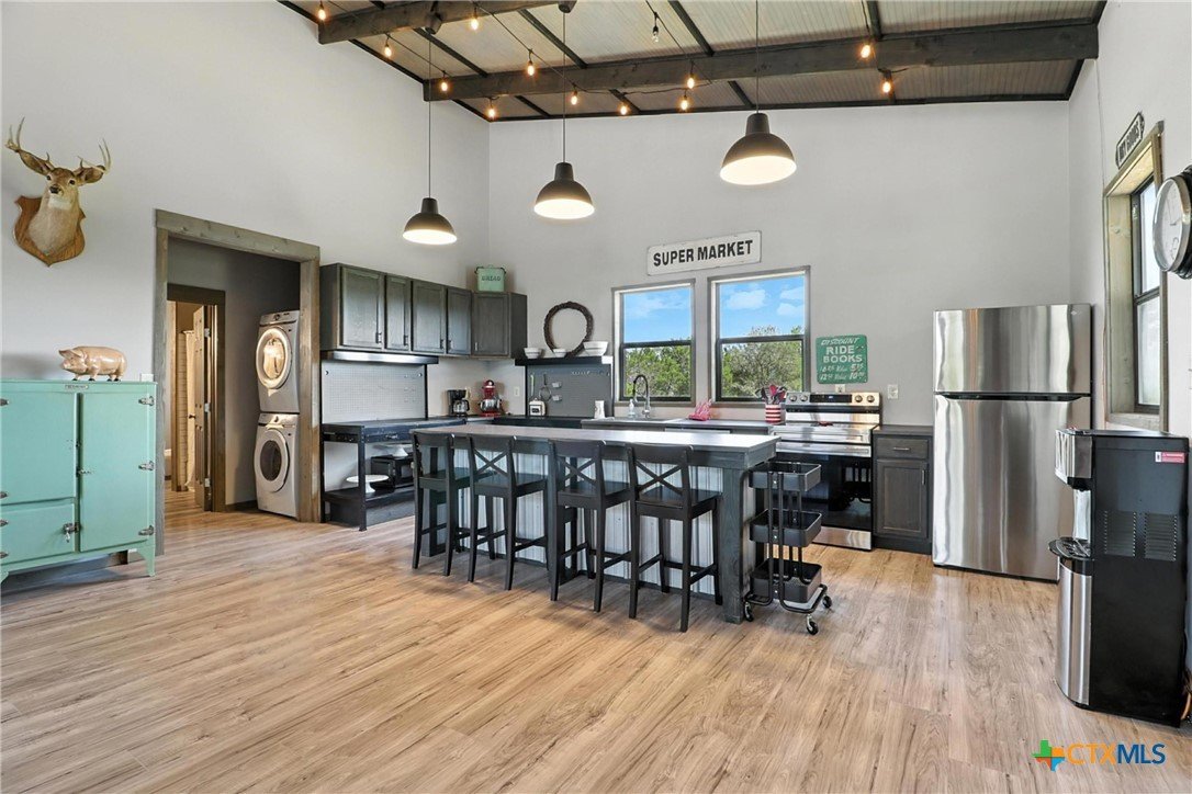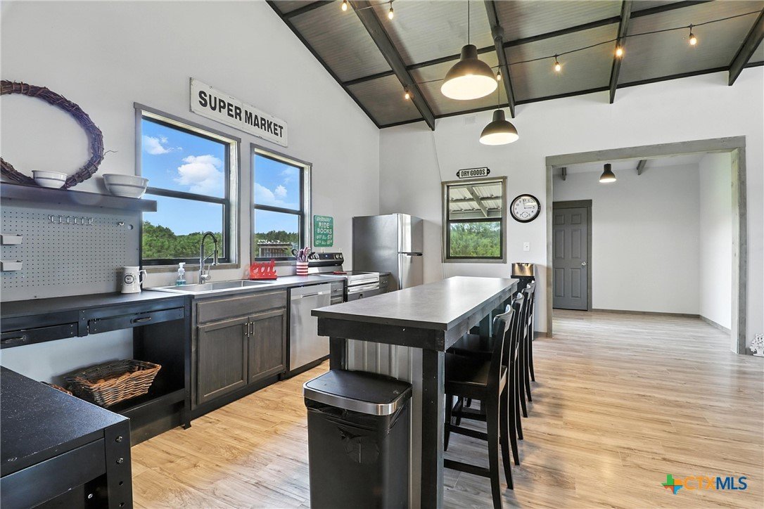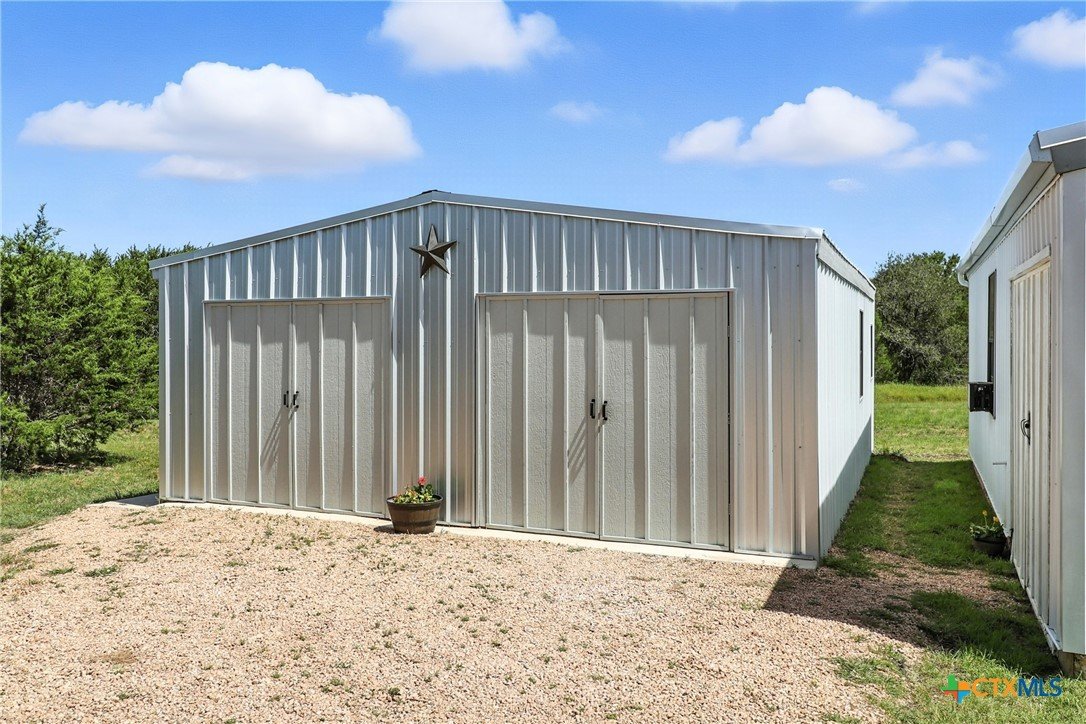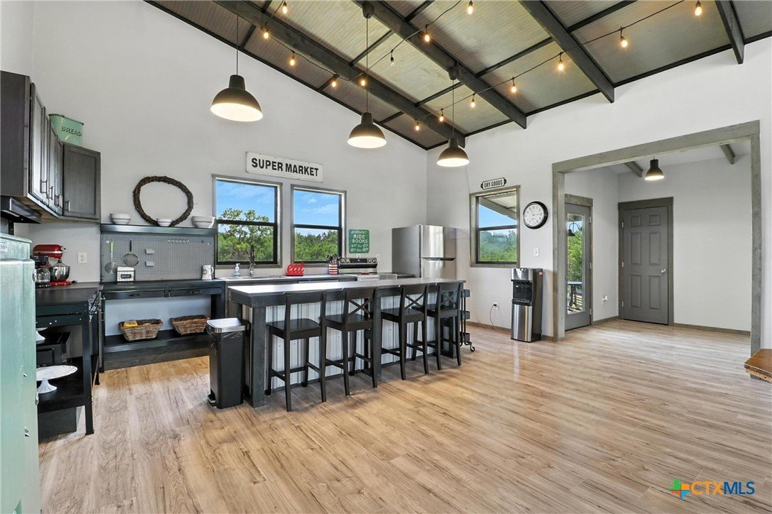 AFFORDABLE Country Living has Arrived! This barndo style home built in 2022 features three bedrooms, two bathrooms, great room style living/dining with a split plan. Kitchen is open to the entire great room area with island dining adorned with pendant lighting as a visual separation. Soaring beamed ceilings give the feeling of sprawling space in this 1684 sq ft main home. Dual head mini-split for the primary suite and main area, small window units for each of the additional bedrooms. Covered front porch greets you and the covered back porch is great for sunset views. Additionally, an attached storage room could easily be made into additional living space or is excellent storage as is. Detached two-car metal garage with an approximately 400 sq ft HVAC space with full bathroom gives you ample options. This space is the perfect home office, hobby space, studio, or potential ADU. Fenced and cross-fenced with a loafing shed; bring your horse! Ag use letter with low taxes. Minimal restrictions in this gated community. If you have been looking for your own little piece of Texas country at an affordable price, welcome to 495 Hurst Place Blvd! This value cannot be beat!! PRICED TO SELL