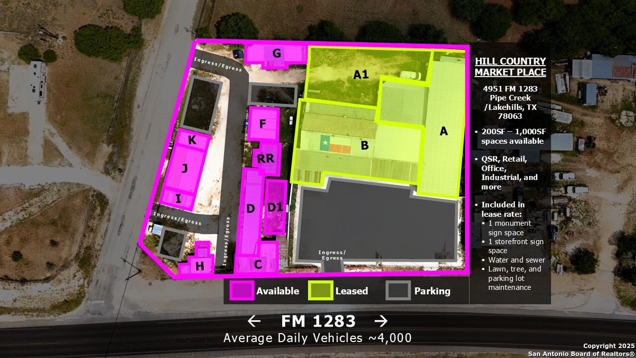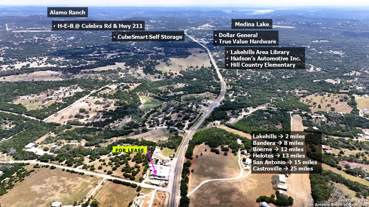 Hill Country Market Place is a mixed-use center in the booming northwest San Antonio corridor, nestled between Helotes, Bandera, Lakehills/Medina Lake, and Alamo Ranch. Anchored by The Eagle's Nest, a popular full-service bar and grill, you can anticipate built-in customer traffic from the surrounding local and extended Lakehills/Pipe Creek, Texas markets. This unique property offers exceptional flexibility: capitalize on the inward-facing courtyard design to create a vibrant market center, and/or establish your quick service restaurant, retail, office, service business, automotive or industrial establishment. Generously equipped with ample utilities, lighting, fencing/gates, and multiple ingress/egress points throughout, the location offers great utility for high-convenience operations that benefit from takeout and drive-thru features, and can also serve retail, office, and appointment-based businesses. Available spaces range from 200 to 1,000 square feet and vary from from shell/frame to second generation conditions, giving you the freedom to execute your vision or move into a turnkey setup. Secure your spot in this high-growth area. Schedule your tour today!