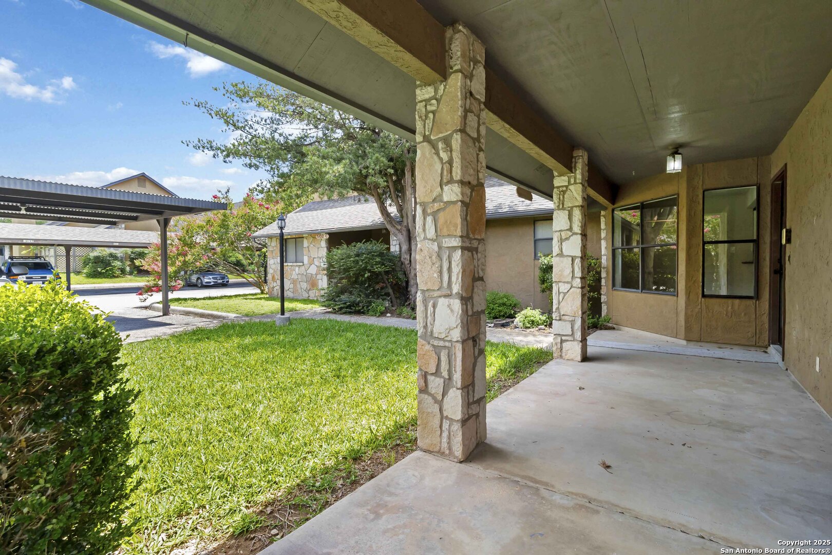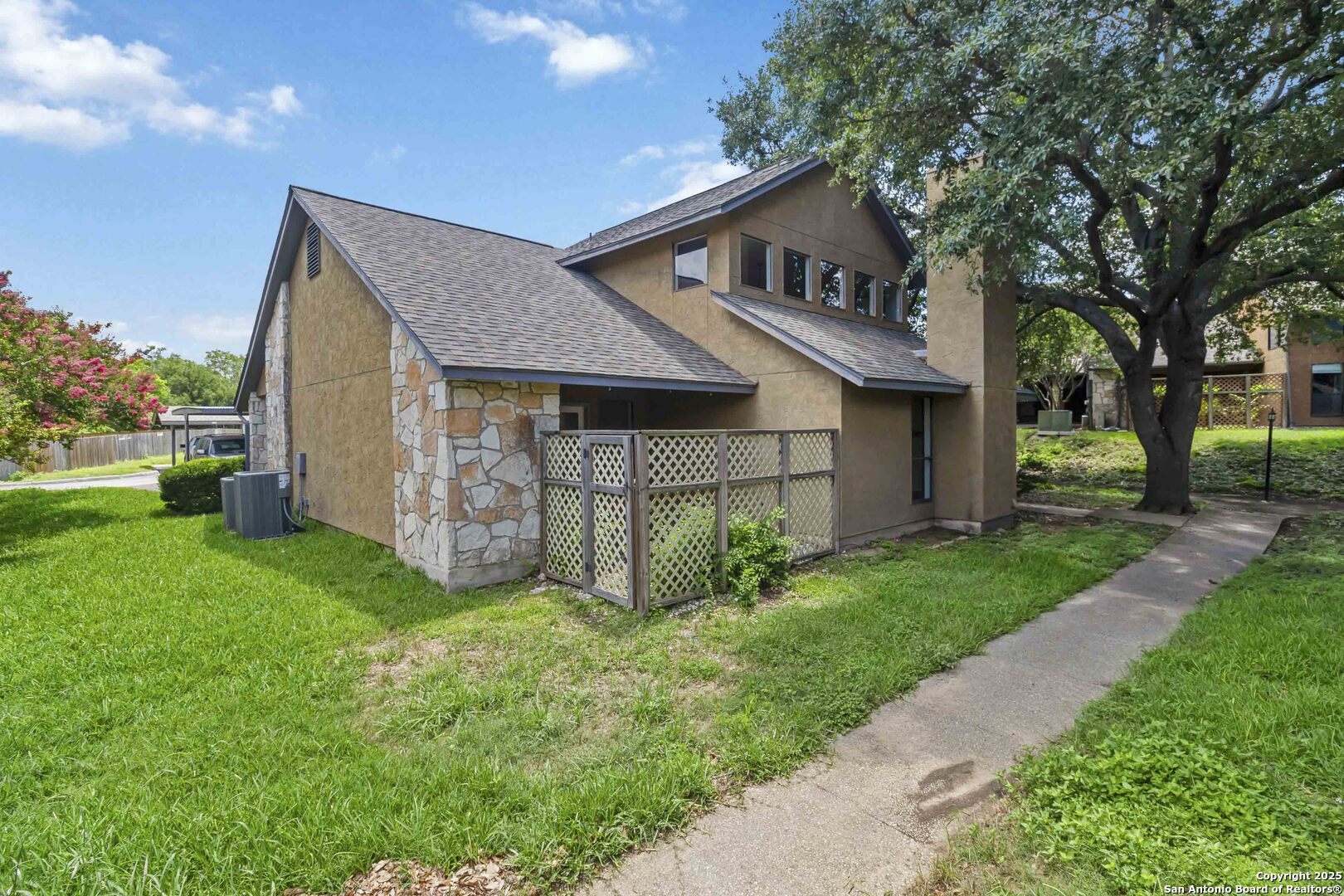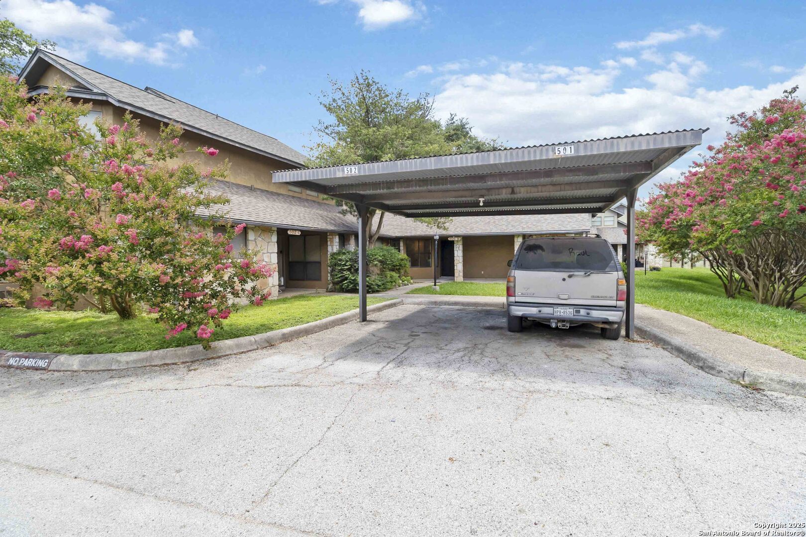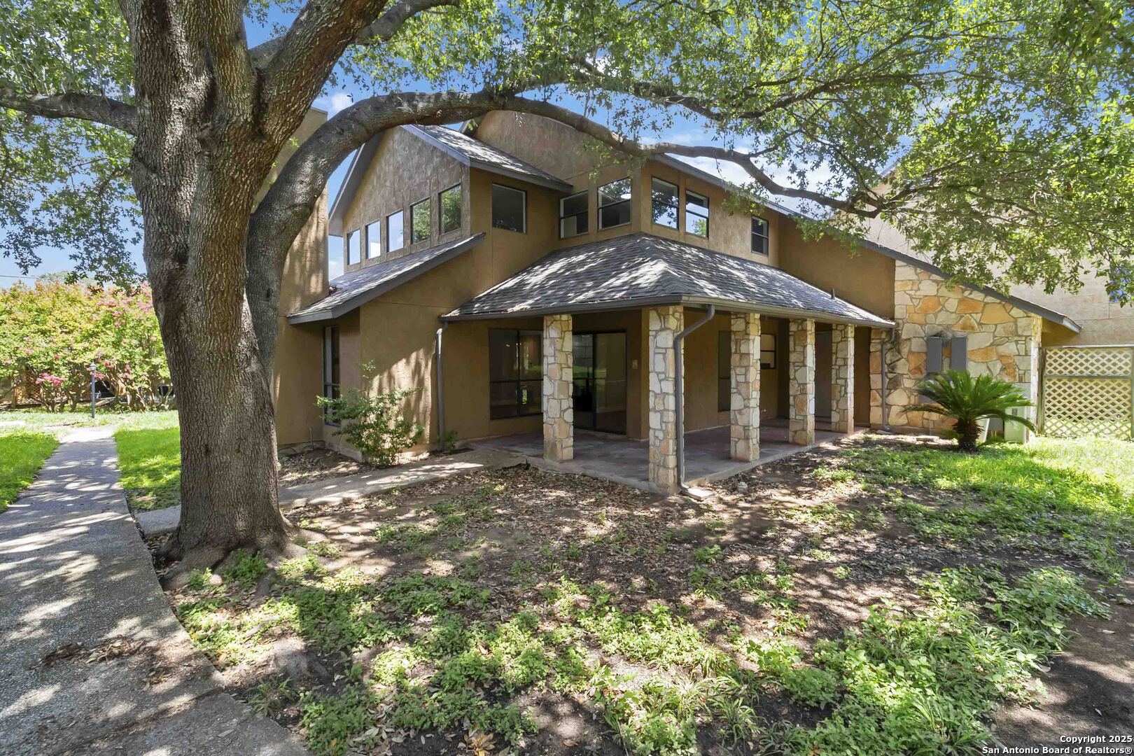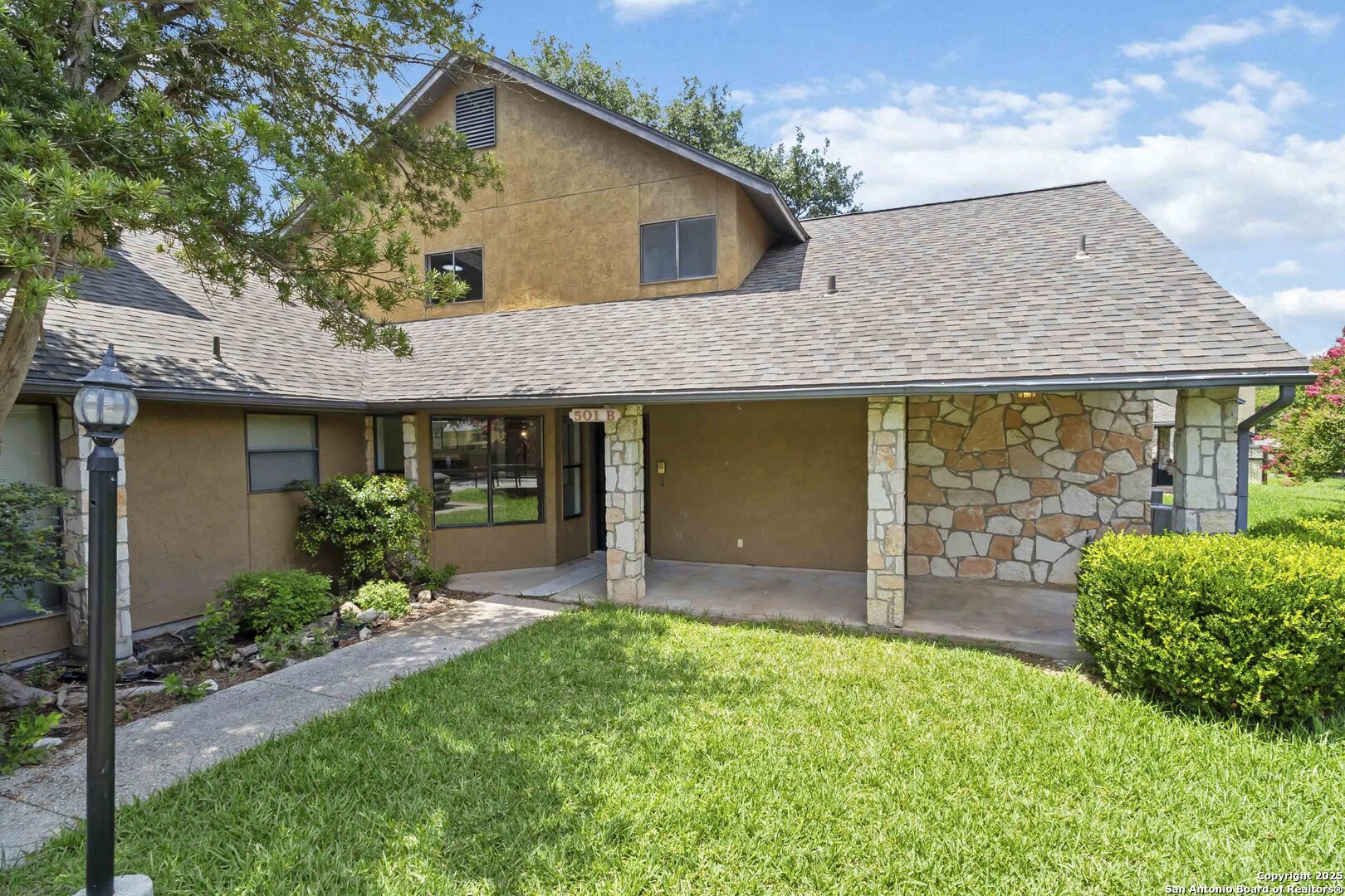 Welcome to 501 Thetford, a thoughtfully updated 3-bedroom, 2.5-bath condominium nestled in a charming gated community in San Antonio. This spacious home blends modern finishes with functional living across two well-designed levels. Step inside to discover brand new vinyl plank flooring on the main level and plush Shaw carpeting upstairs, all set against a freshly repainted backdrop in designer-selected hues. The downstairs primary suite offers privacy and comfort with a walk-in closet, fully equipped ensuite bath, and direct access to a serene private patio. The flexible third bedroom includes a built-in desk, making it perfect for a home office or creative space. A cozy living room features a wood-burning fireplace and wet bar-ideal for both relaxation and entertaining-while the kitchen shines with granite countertops and a double-basin sink. Upstairs, two additional bedrooms provide separation and quiet, perfect for guests or family. Enjoy the benefits of community living with access to a well-maintained clubhouse and sparkling pool.