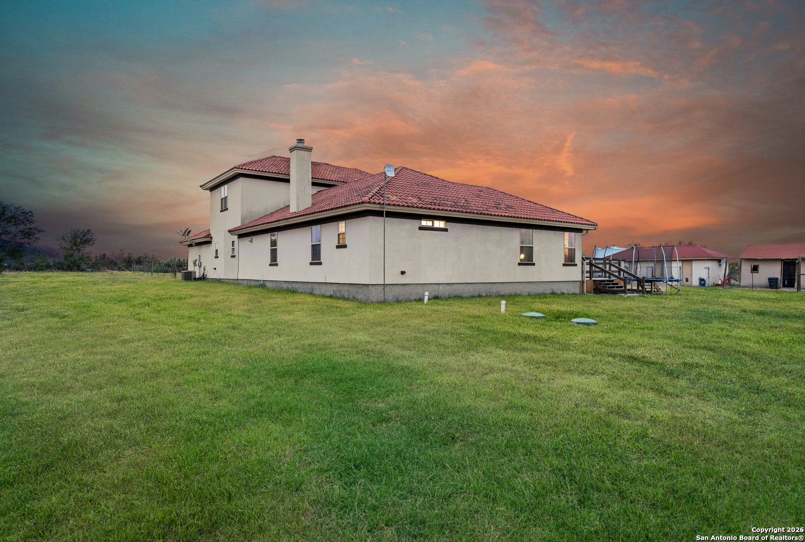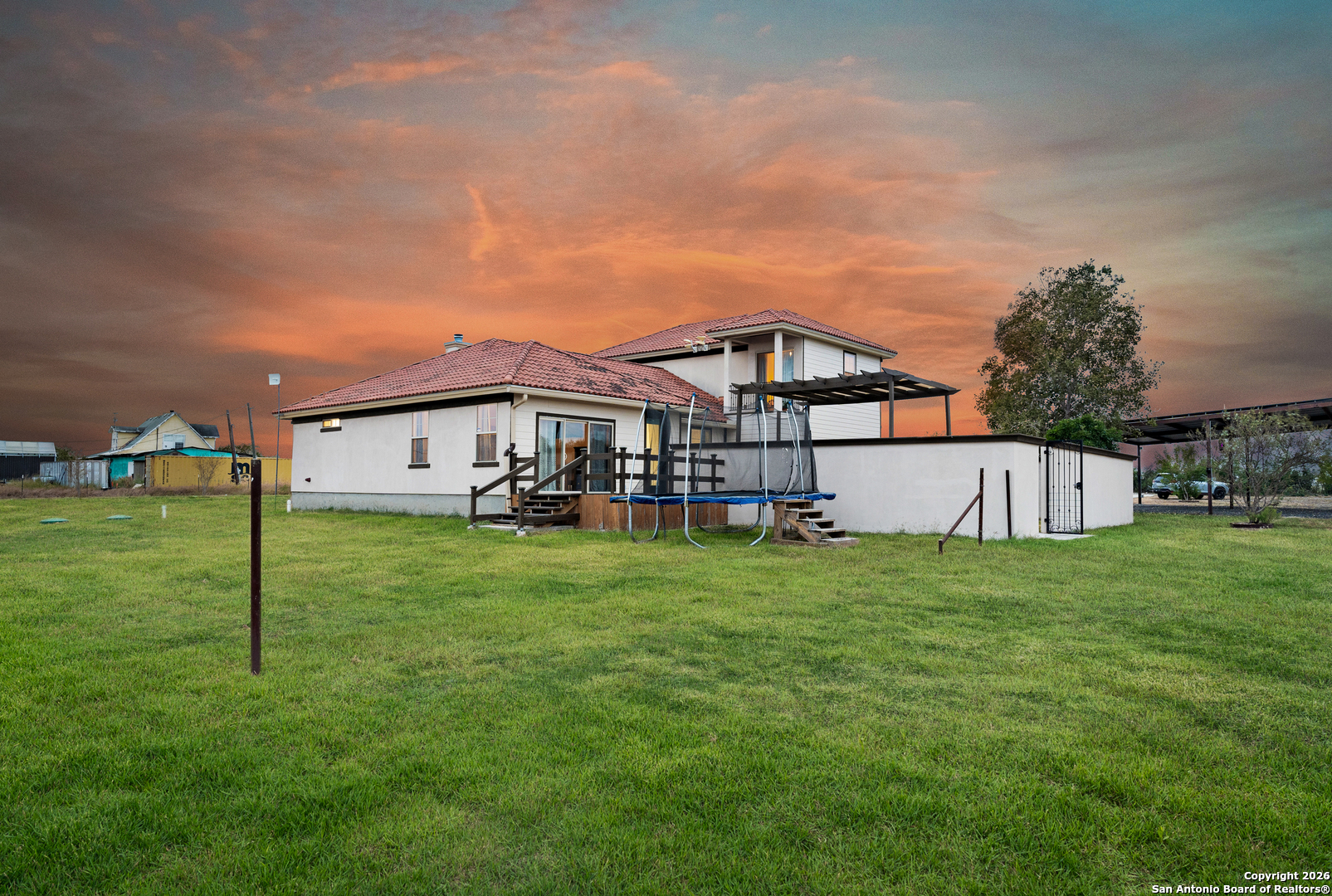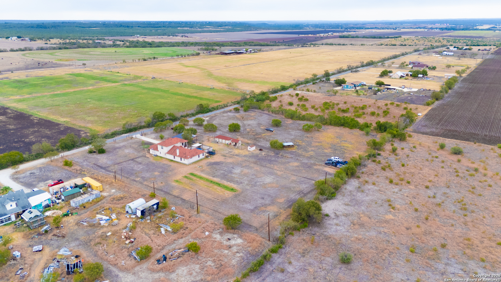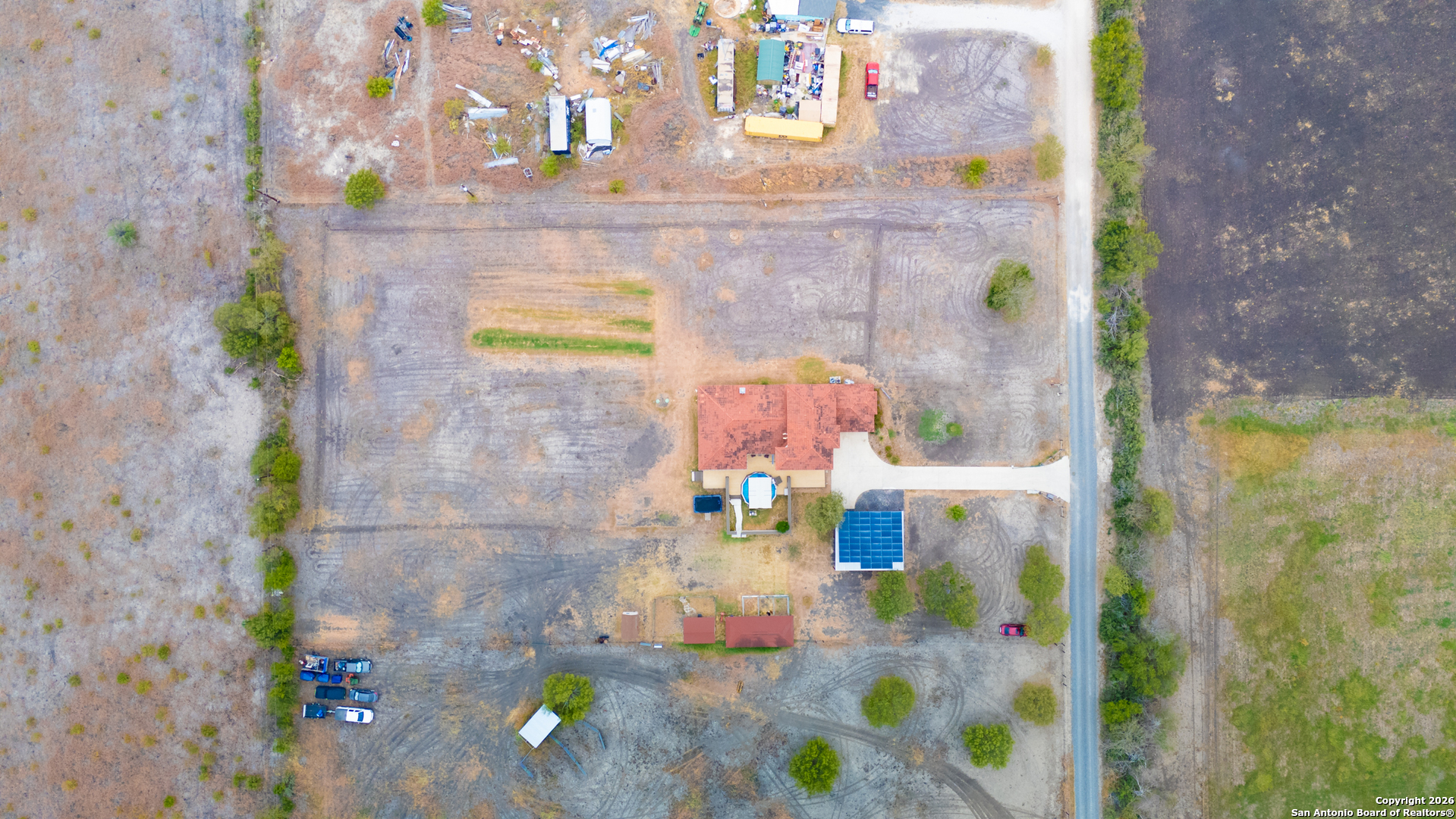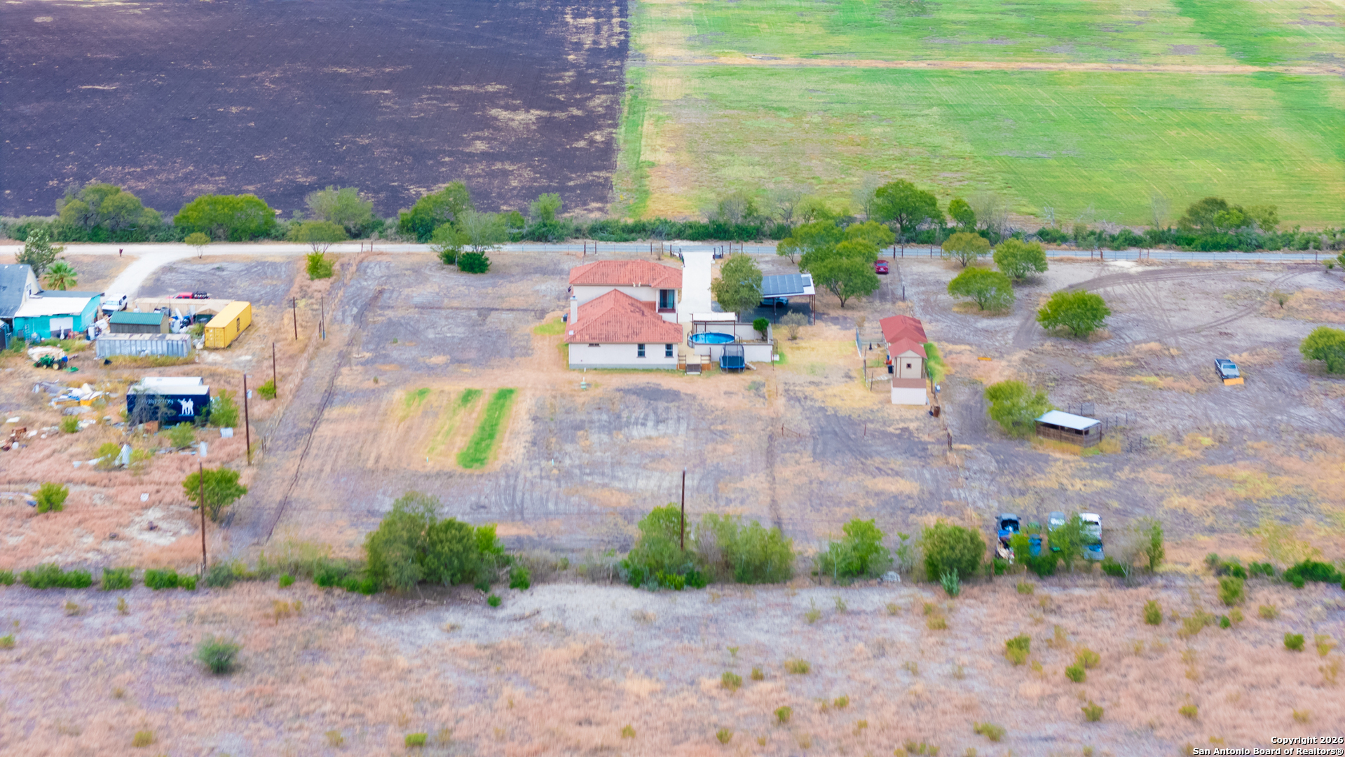 Stunning 5-acre homestead in La Coste, Texas featuring a Spanish-style residence with 4 bedrooms, 4 full bathrooms, and approximately 3,227 sq ft of living space. Set behind a private gate, this property offers a long driveway, carport, and 2-car garage, combining privacy with timeless curb appeal. The home is equipped with solar panels, offering energy efficiency and reduced utility costs. Recent improvements include a newly installed AC unit and updated deck boards and railing. Inside, enjoy an open-concept layout with tall ceilings, decorative beams, and abundant natural light. The chef's kitchen features stainless steel appliances, solid-surface countertops, ample cabinetry, and dual sinks. Three bedrooms are located on the main level, while the upstairs offers a fourth bedroom, full bath, and versatile bonus room ideal for an office, media room, or flex space. Outdoor amenities are designed for both relaxation and functionality, including an expansive patio, above-ground pool with enhanced landscaping and flower beds along the pool wall, rebuilt chicken coop, dog kennel, and wide-open acreage. The 5-acre property offers endless opportunities for outdoor living, gardening, or animals, all while providing convenient access to Castroville and San Antonio.