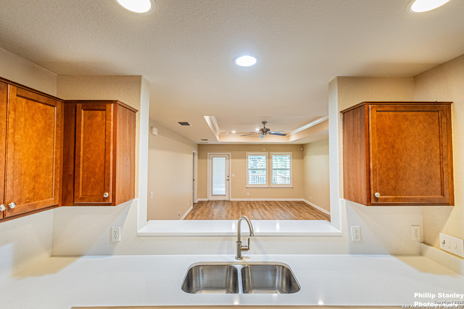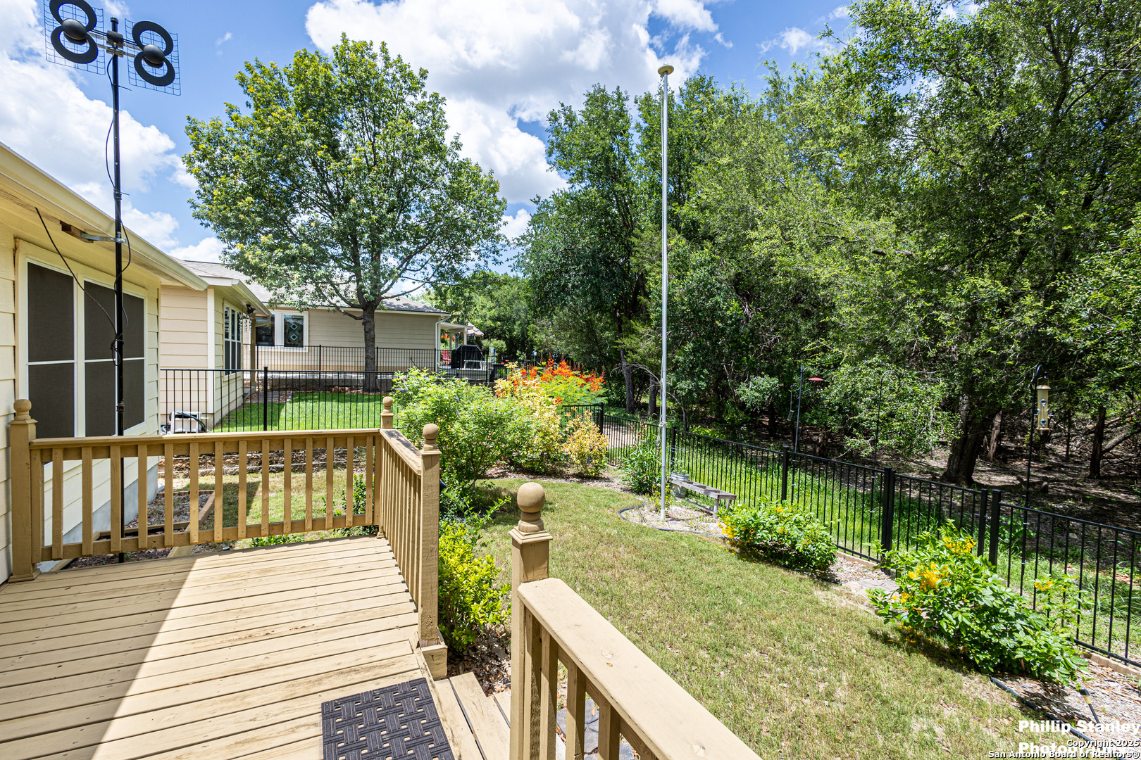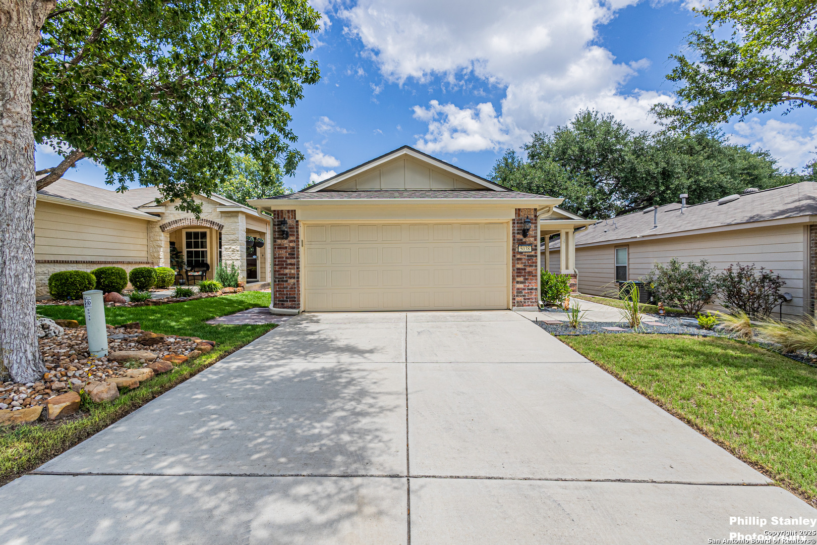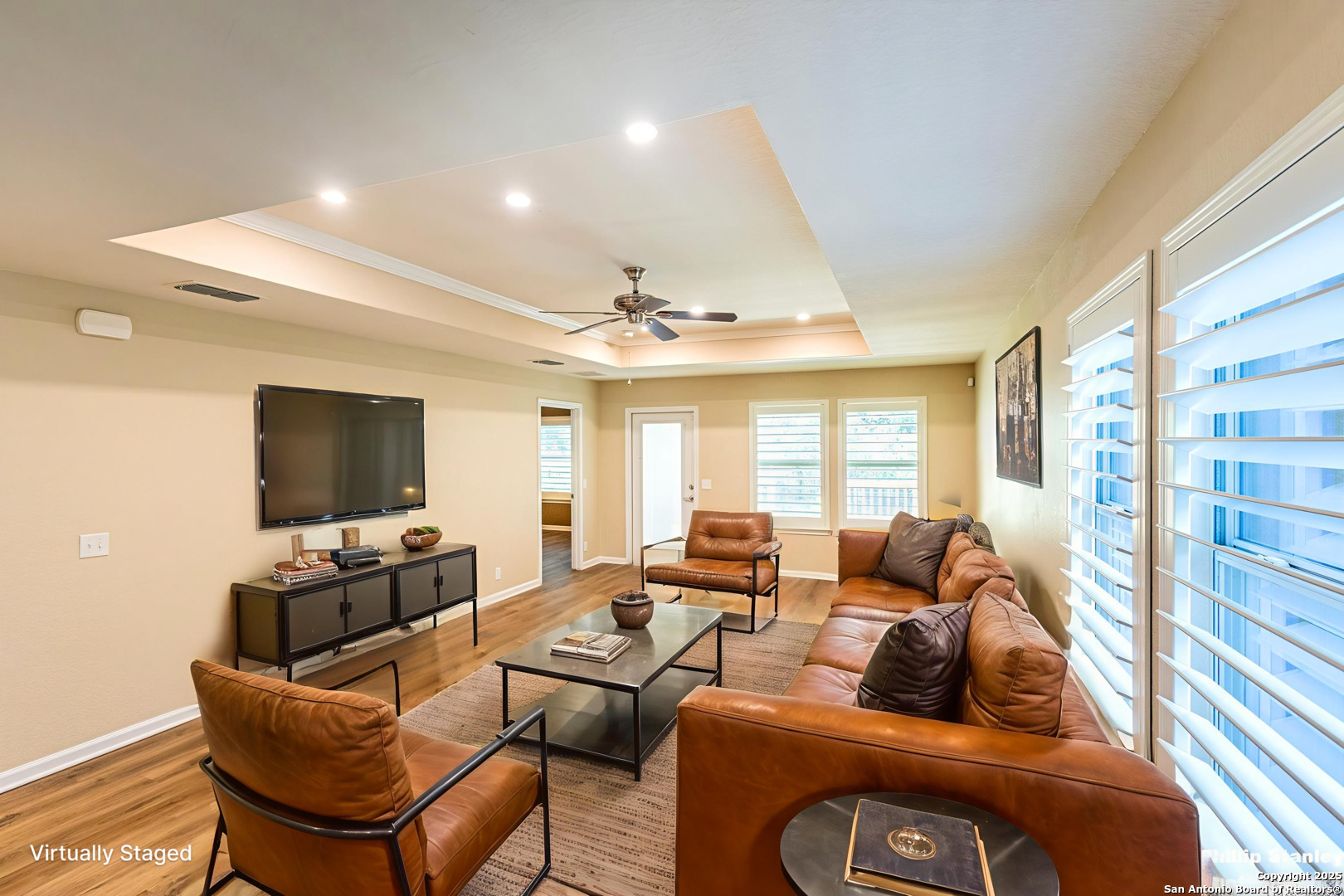 Impeccable Gem in Del Webb 55+ Hill Country Retreat: Welcome to this beautifully maintained one-story home that radiates pride of ownership at every turn. Featuring 2 bedrooms, 2 bathrooms, and a versatile flex room ideal for a home office, craft space, or cozy TV room. Step inside to find luxury vinyl plank flooring throughout, plantation shutters, elegant tray ceilings, and crown molding in both the primary suite and family room. The kitchen boasts solid surface countertops and all appliances, offering both style and function. Step outside to your extended covered patio and take in the serene beauty of a private backyard that backs to a lush greenbelt. It's the perfect spot to unwind while watching birds and deer pass by. Whether you're enjoying peaceful mornings or hosting evening gatherings, this home is truly a Hill Country retreat.