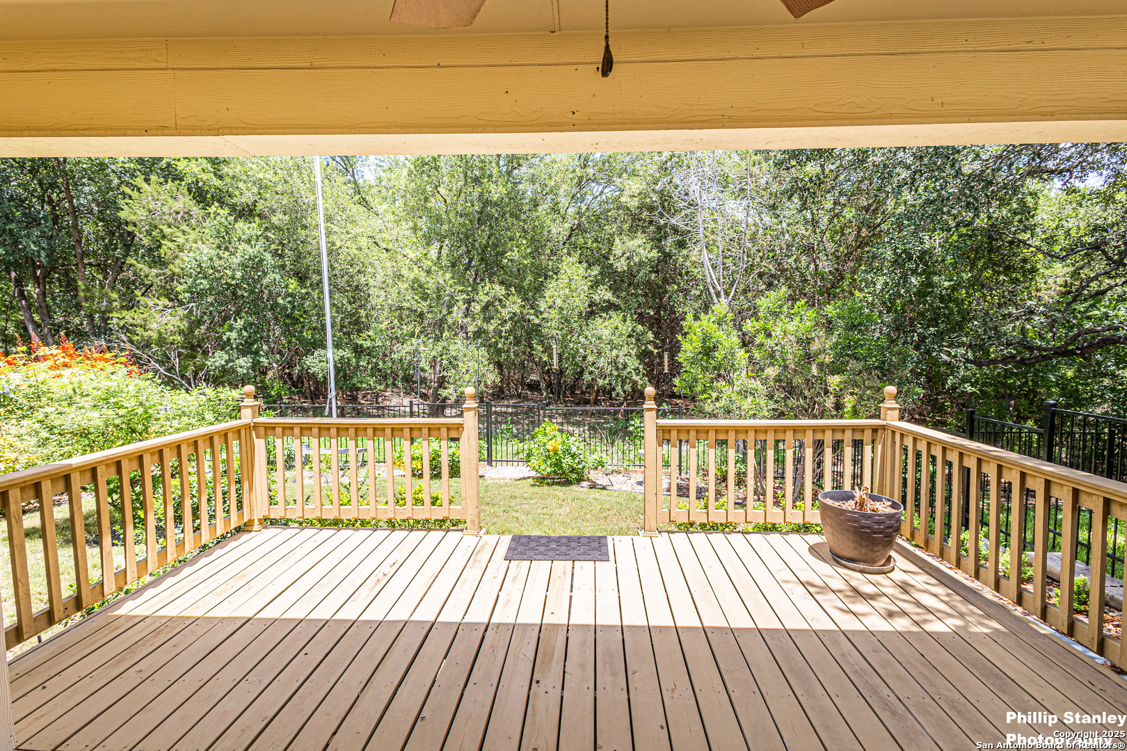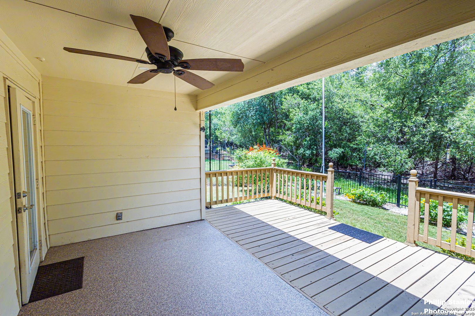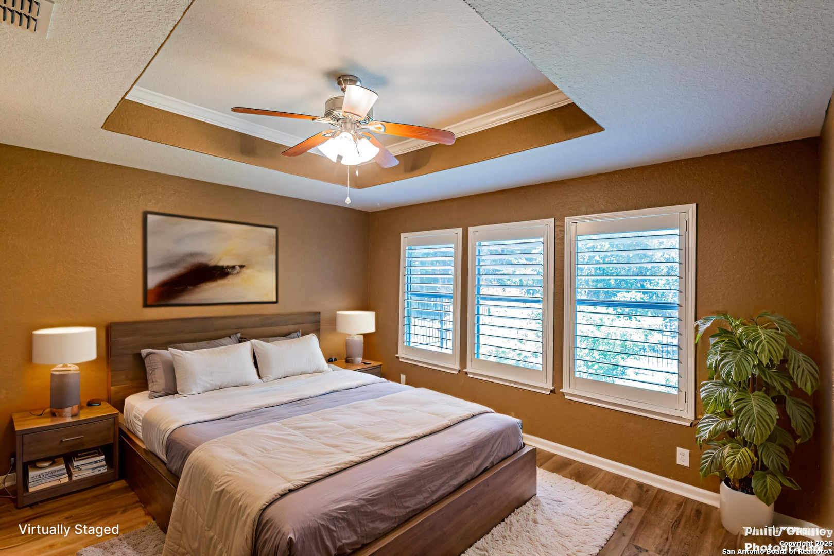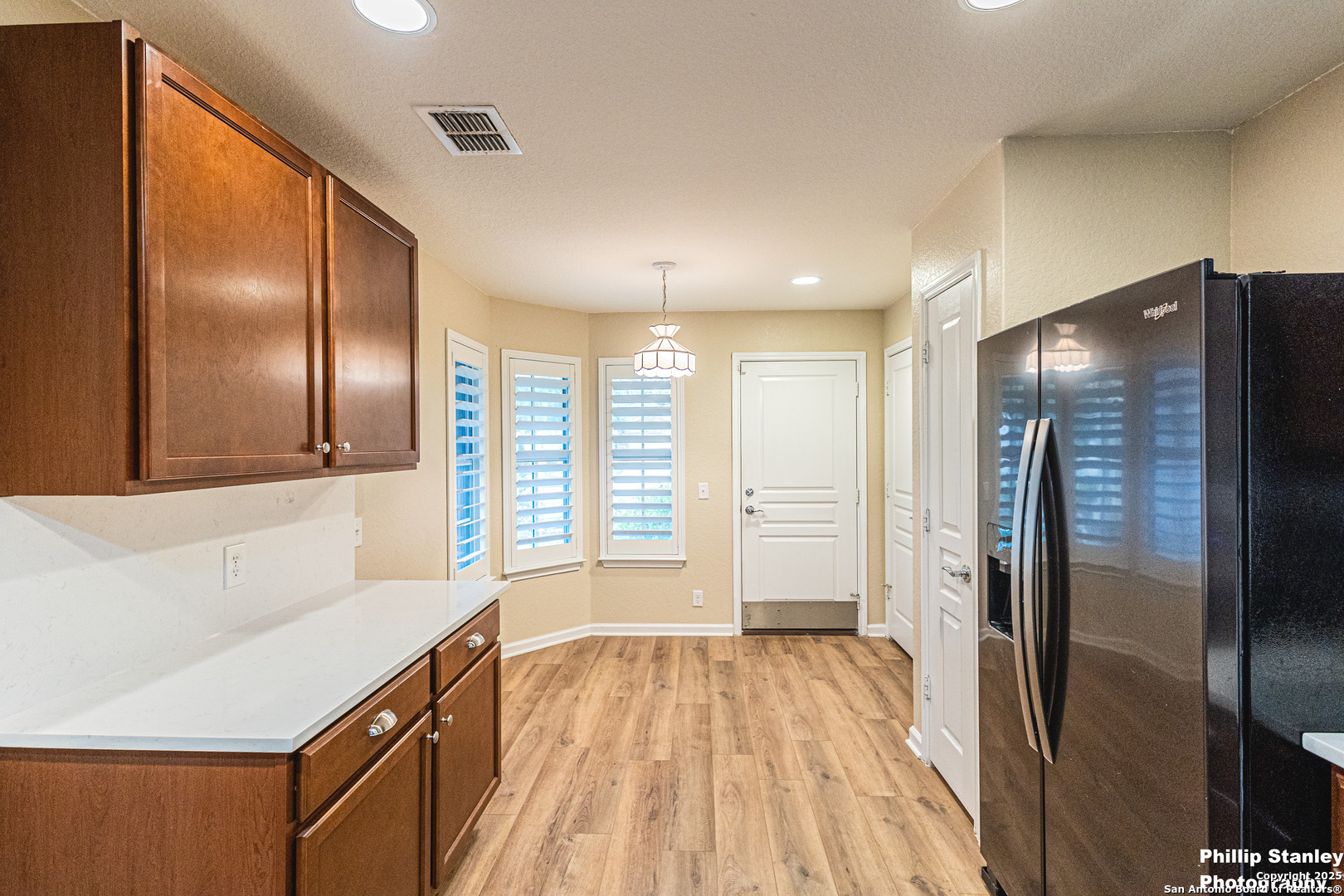 Impeccable Gem in Del Webb 55+ Hill Country Retreat: Welcome to this beautifully maintained one-story home that radiates pride of ownership at every turn. Featuring 2 bedrooms, 2 bathrooms, and a versatile flex room ideal for a home office, craft space, or cozy TV room. Step inside to find luxury vinyl plank flooring throughout, plantation shutters, elegant tray ceilings, and crown molding in both the primary suite and family room. The kitchen boasts solid surface countertops and all appliances, offering both style and function. Step outside to your extended covered patio and take in the serene beauty of a private backyard that backs to a lush greenbelt. It's the perfect spot to unwind while watching birds and deer pass by. Whether you're enjoying peaceful mornings or hosting evening gatherings, this home is truly a Hill Country retreat.