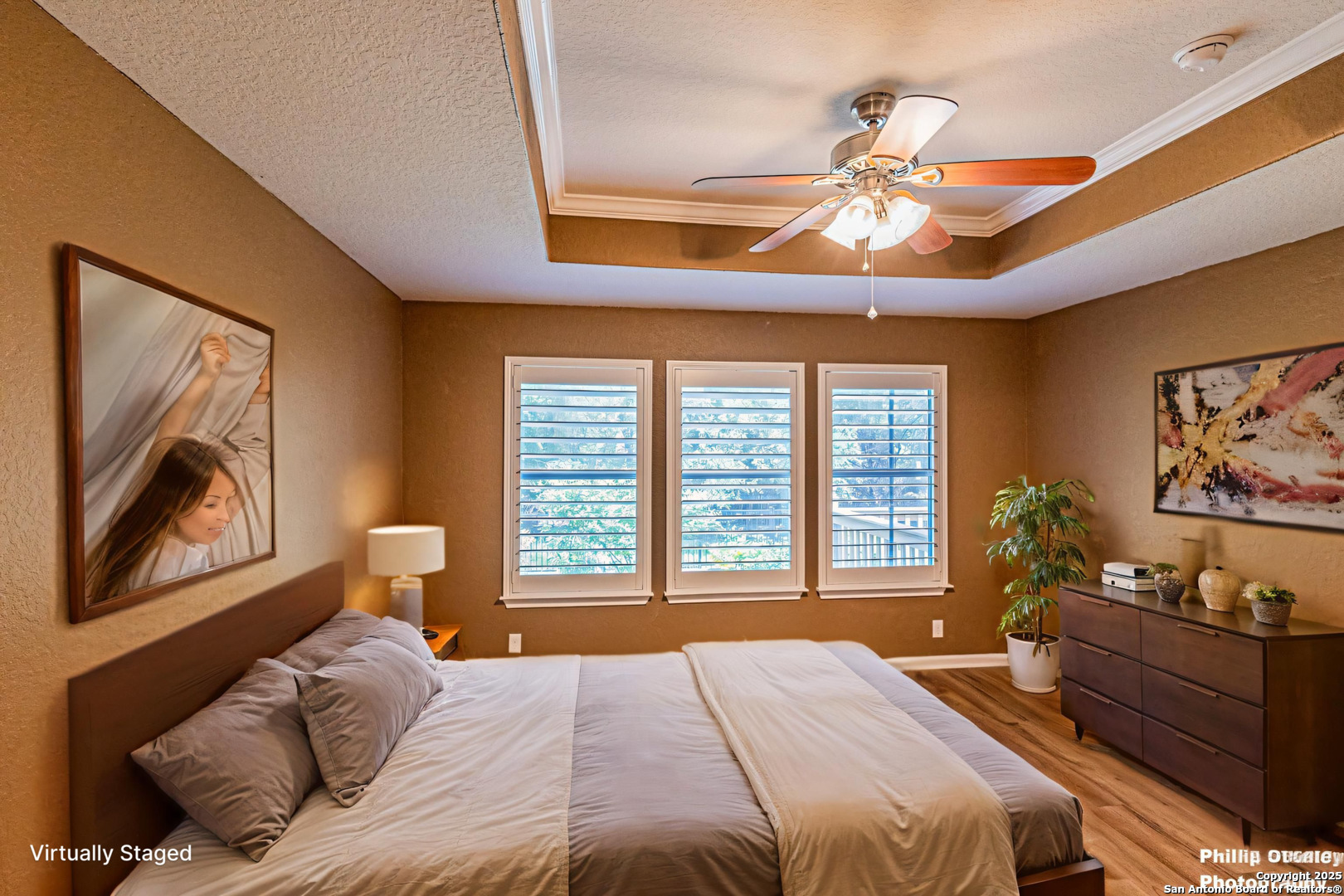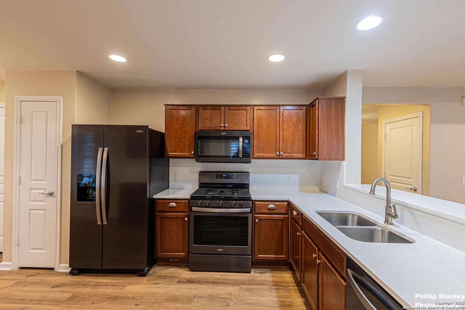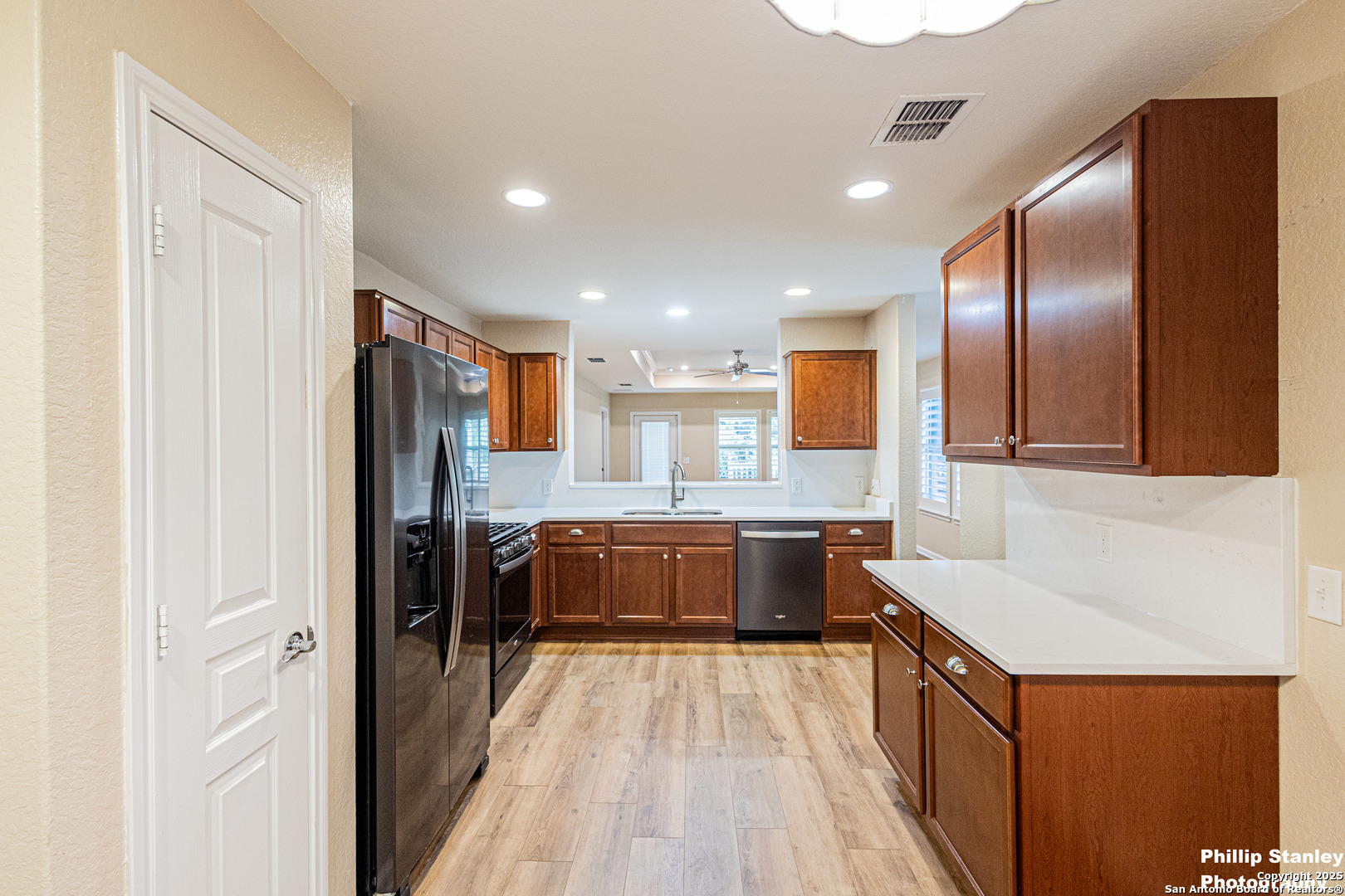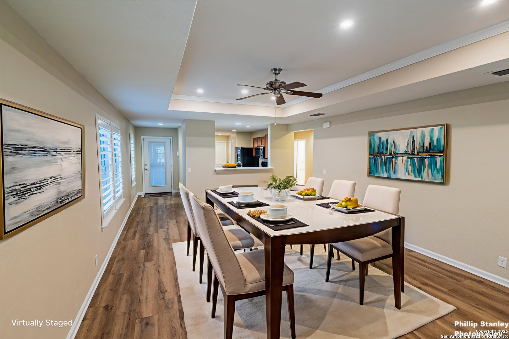 Impeccable Gem in Del Webb 55+ Hill Country Retreat: Welcome to this beautifully maintained one-story home that radiates pride of ownership at every turn. Featuring 2 bedrooms, 2 bathrooms, and a versatile flex room ideal for a home office, craft space, or cozy TV room. Step inside to find luxury vinyl plank flooring throughout, plantation shutters, elegant tray ceilings, and crown molding in both the primary suite and family room. The kitchen boasts solid surface countertops and all appliances, offering both style and function. Step outside to your extended covered patio and take in the serene beauty of a private backyard that backs to a lush greenbelt. It's the perfect spot to unwind while watching birds and deer pass by. Whether you're enjoying peaceful mornings or hosting evening gatherings, this home is truly a Hill Country retreat.