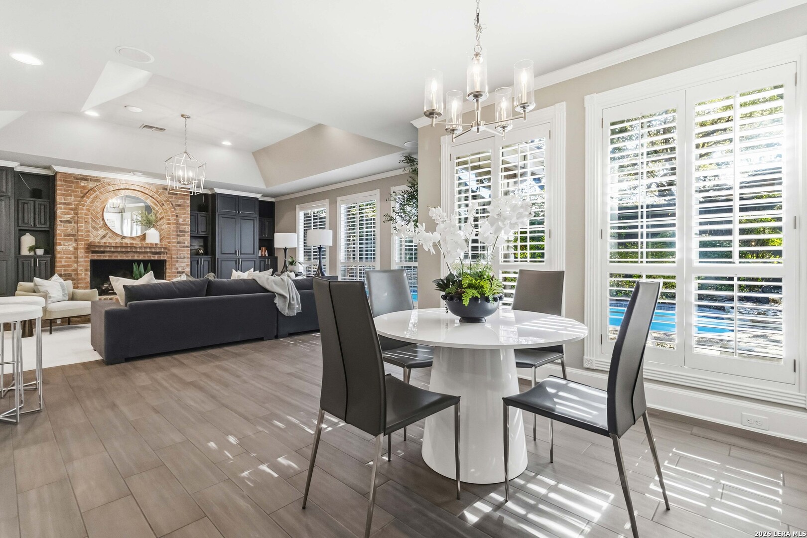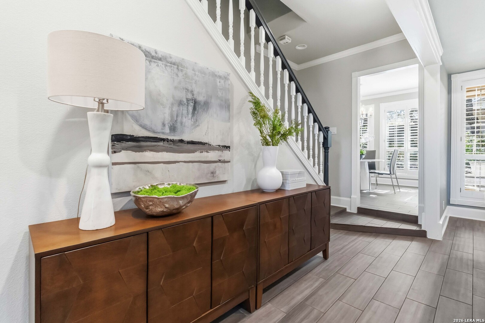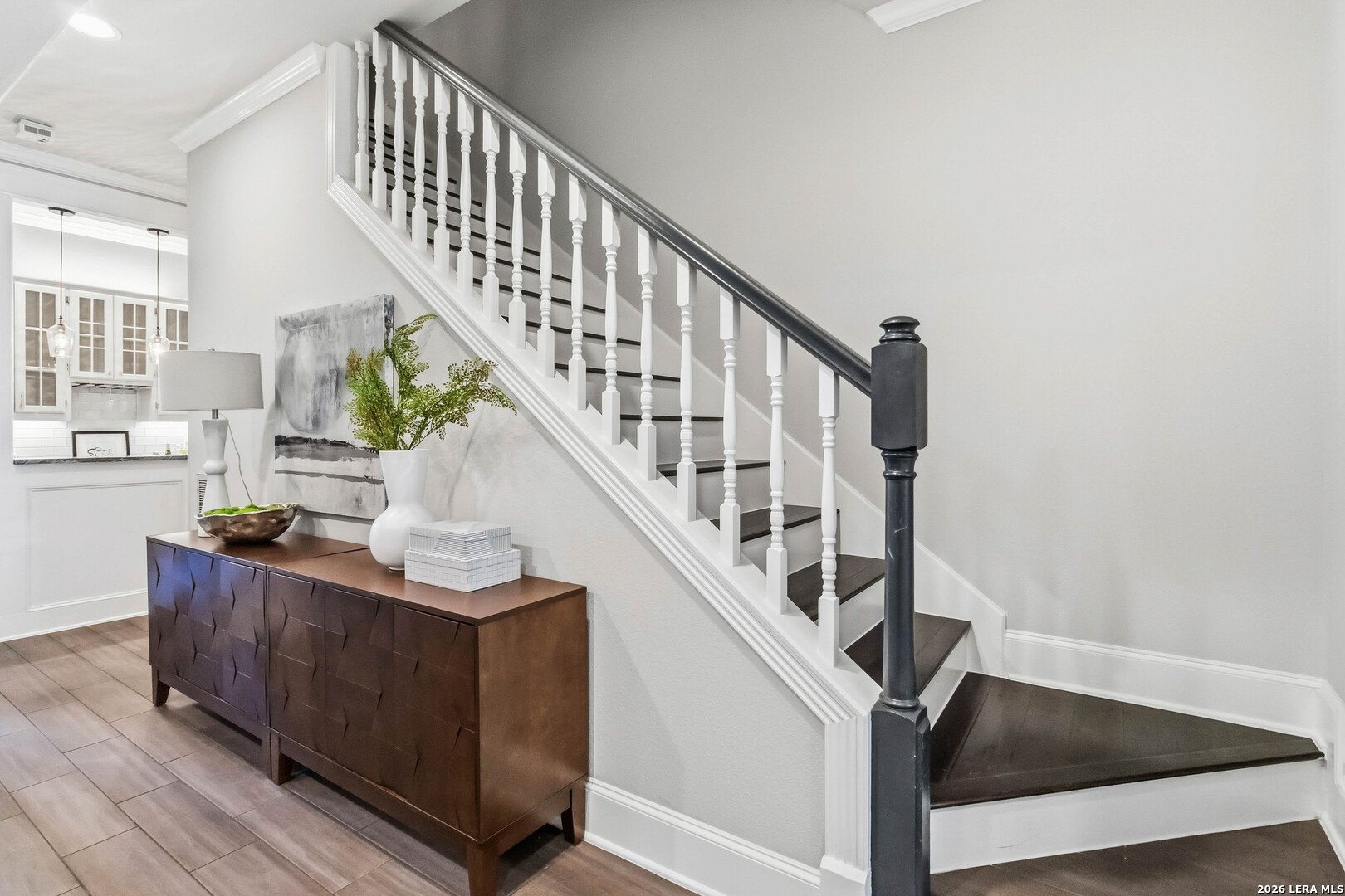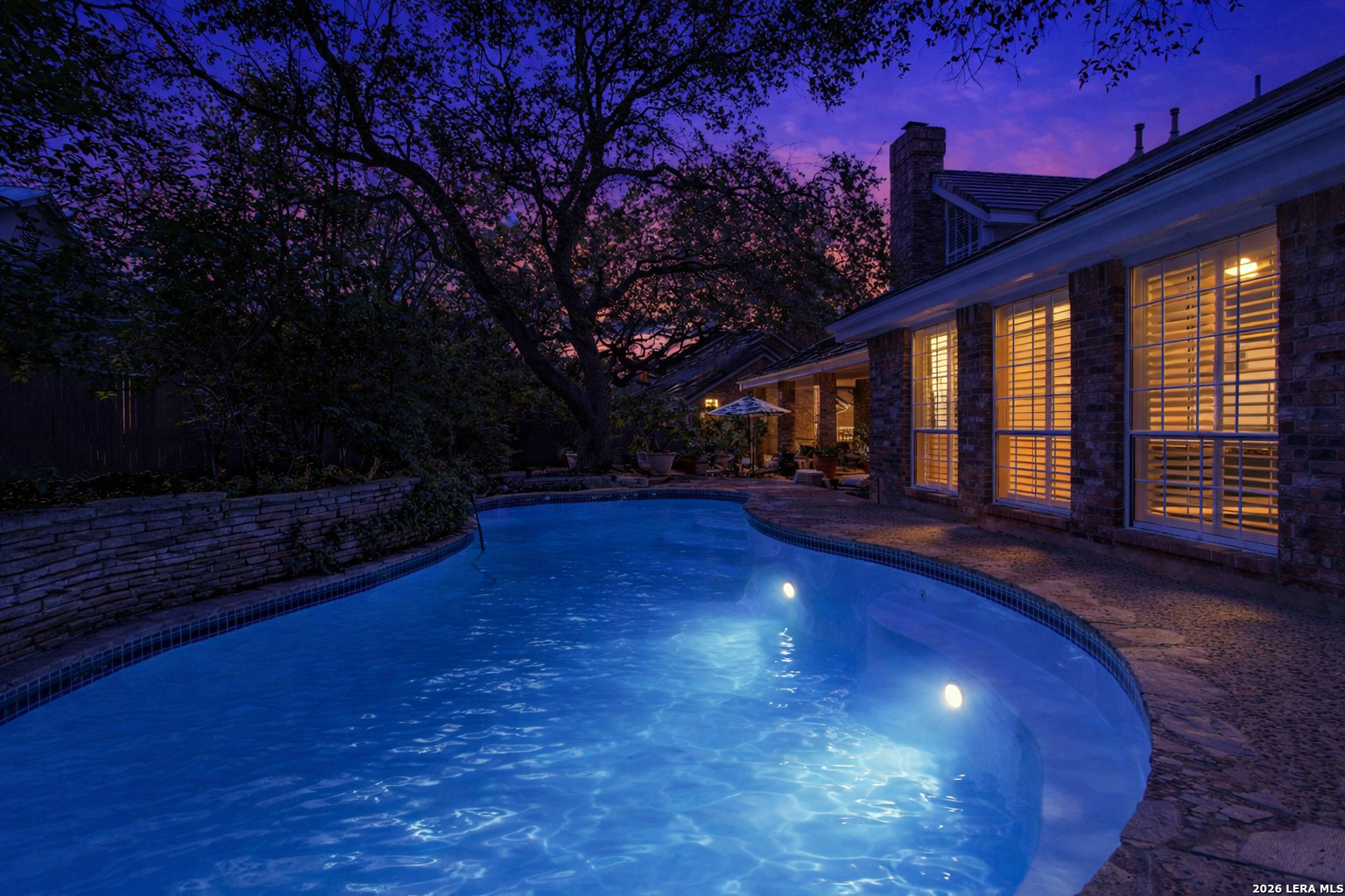 Welcome to Bluff View, a centrally located neighborhood known for its peaceful streets and the canopy of mature oak trees. Over generations, residents have built a warm, connected community that blends long standing tradition with a fresh, modern energy. Bluff View's rich history and welcoming character are part of what makes this community a special place to be home. The property offers convenient access to US 281 / I-37, Loop 1604, Bitters Road, Blanco Road, Wurzbach Parkway and Huebner Road making daily routines and city amenities within easy reach. The grand entry is defined by 19 foot tall ceilings that immediately set the tone for this beautiful home. This property offers four bedrooms and four bathrooms, plus a convenient and updated half bath located on the main level. Each bedroom includes its own private bath, providing comfort, privacy and convenience throughout the home. Architectural detailing was preserved and elevated throughout this home. Enhanced crown molding and extra tall baseboards highlight the home's traditional character while adding refinement to each room. These details frame the spaces beautifully, reinforcing the quality of craftsmanship and lending a timeless, finished feel from floor to ceiling. Downstairs, durable wood like tile flooring was selected for both style and function, offering the warmth of hardwood with the resilience needed for a busy household. Wood flooring was added all throughout the second floor, providing continuity, warmth, and an elevated finish. The kitchen underwent a complete transformation, with the original space fully demolished and reimagined to meet modern living standards. Monte Blanc Quartzite countertops, all new cabinetry, stainless steel appliances, and updated lighting come together in a space that is both functional and striking. Above bar and recessed lighting were added to enhance ambiance and highlight the kitchen as a central gathering place. The main living areas were reimagined to improve flow and everyday use while still maintaining a sense of scale. By removing the wall between the breakfast area and living room, the home now offers a more open and connected layout ideal for both entertaining and daily life. High ceilings, abundant natural light, and clean sightlines create living spaces that feel expansive and comfortable. Two of the upstairs bathrooms were fully updated with tubs removed in favor of oversized walk in showers, finished with elegant glass enclosures and specialty tile flooring. Granite and marble countertops add a refined style to each one. The primary suite was further refined by relocating the bedroom entry to create a seamless flow off the living areas. The primary suite features two walk in closets with double layered, hanging spaces, taking advantage of the home's high ceilings. The exterior of the home has been thoughtfully maintained. The fence was recently stained to enhance both durability and overall curb appeal. The heated pool allows for comfortable enjoyment well beyond the summer months, while the hot tub is conveniently accessed from the patio off the primary suite, creating a seamless indoor to outdoor experience.