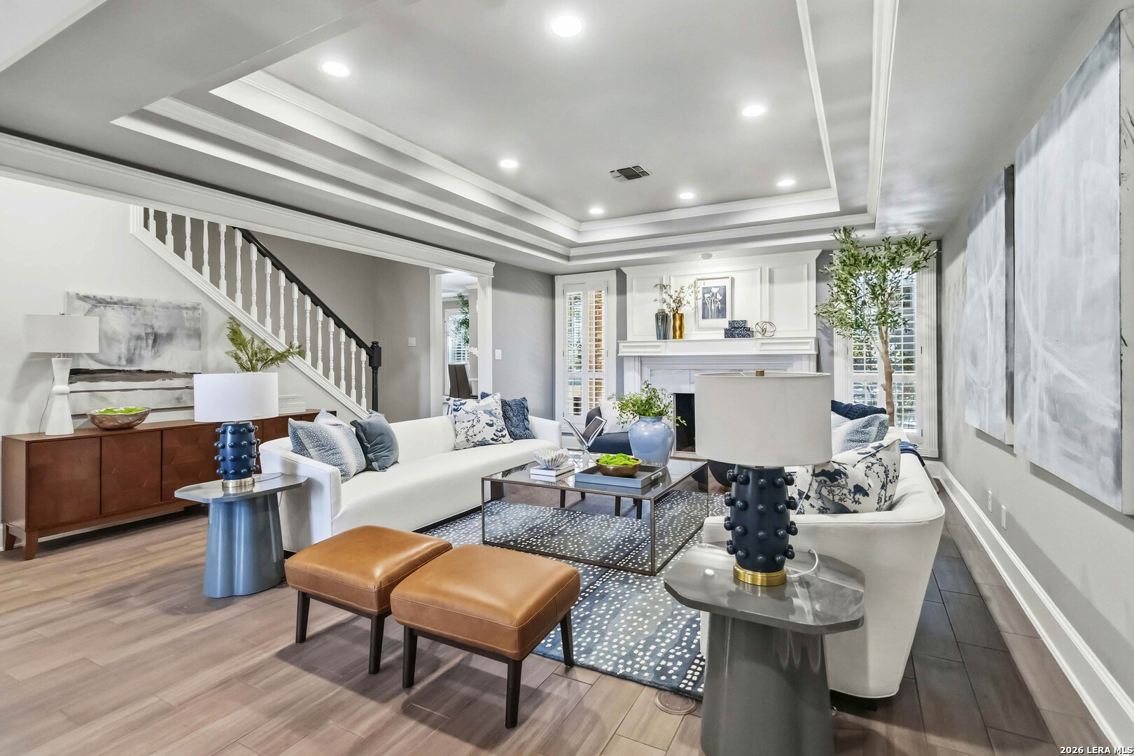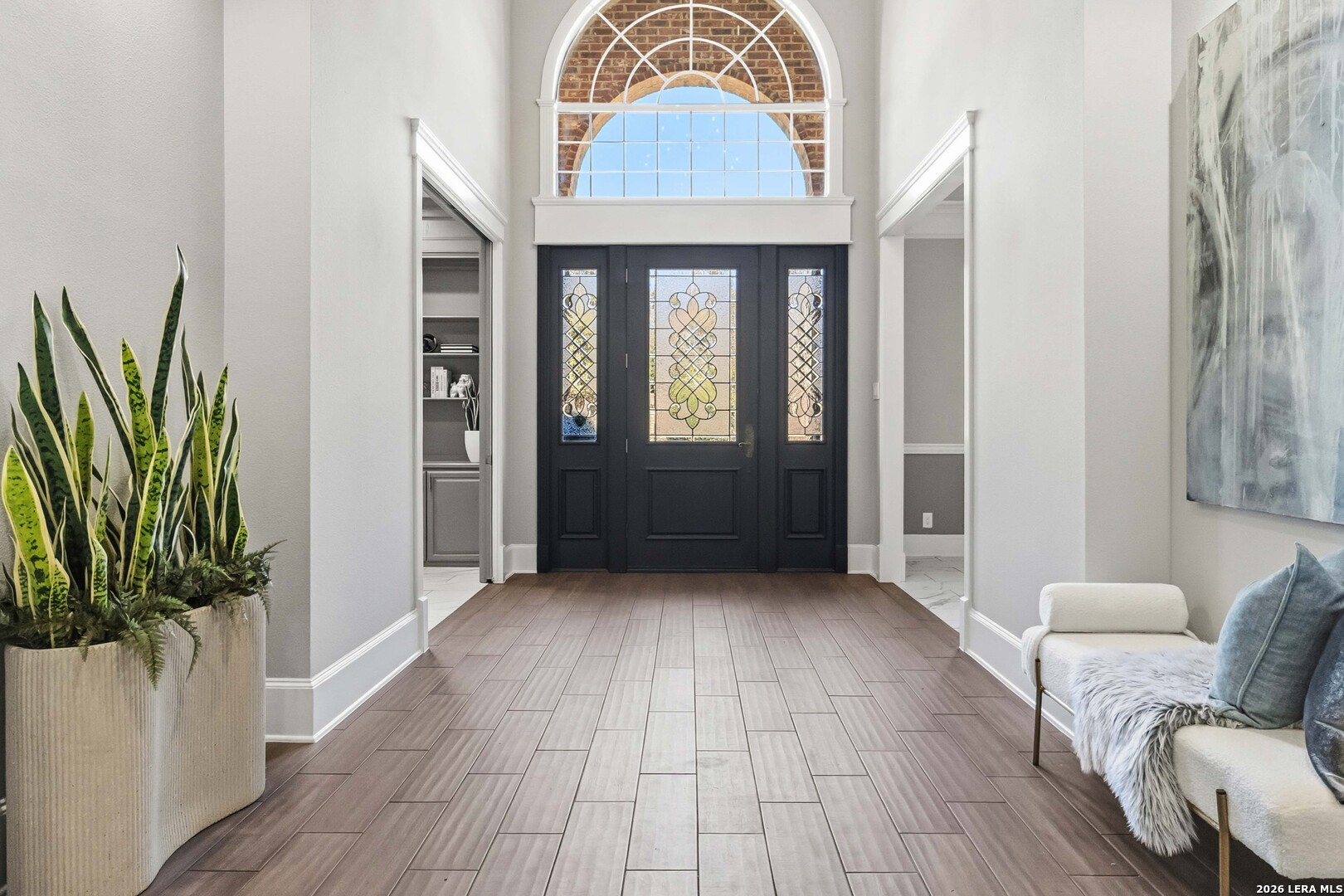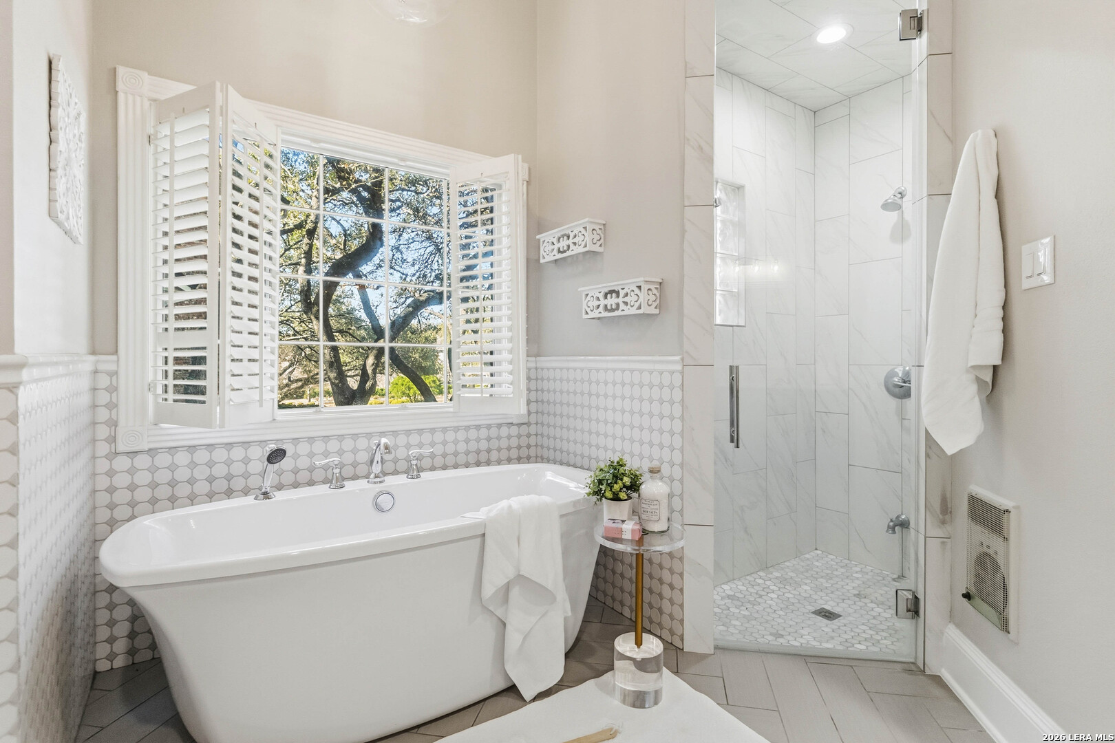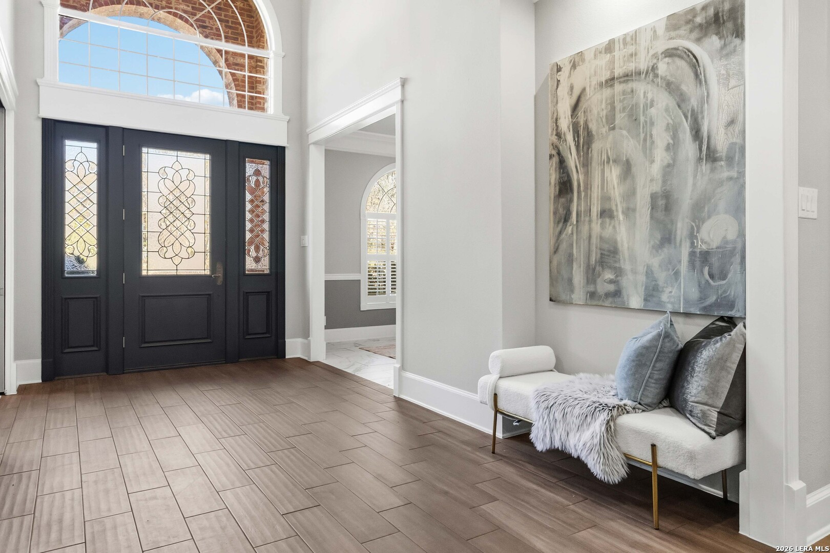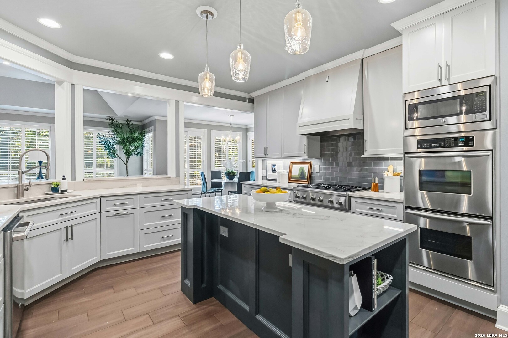 Welcome to Bluff View, a centrally located neighborhood known for its peaceful streets and the canopy of mature oak trees. Over generations, residents have built a warm, connected community that blends long standing tradition with a fresh, modern energy. Bluff View's rich history and welcoming character are part of what makes this community a special place to be home. The property offers convenient access to US 281 / I-37, Loop 1604, Bitters Road, Blanco Road, Wurzbach Parkway and Huebner Road making daily routines and city amenities within easy reach. The grand entry is defined by 19 foot tall ceilings that immediately set the tone for this beautiful home. This property offers four bedrooms and four bathrooms, plus a convenient and updated half bath located on the main level. Each bedroom includes its own private bath, providing comfort, privacy and convenience throughout the home. Architectural detailing was preserved and elevated throughout this home. Enhanced crown molding and extra tall baseboards highlight the home's traditional character while adding refinement to each room. These details frame the spaces beautifully, reinforcing the quality of craftsmanship and lending a timeless, finished feel from floor to ceiling. Downstairs, durable wood like tile flooring was selected for both style and function, offering the warmth of hardwood with the resilience needed for a busy household. Wood flooring was added all throughout the second floor, providing continuity, warmth, and an elevated finish. The kitchen underwent a complete transformation, with the original space fully demolished and reimagined to meet modern living standards. Monte Blanc Quartzite countertops, all new cabinetry, stainless steel appliances, and updated lighting come together in a space that is both functional and striking. Above bar and recessed lighting were added to enhance ambiance and highlight the kitchen as a central gathering place. The main living areas were reimagined to improve flow and everyday use while still maintaining a sense of scale. By removing the wall between the breakfast area and living room, the home now offers a more open and connected layout ideal for both entertaining and daily life. High ceilings, abundant natural light, and clean sightlines create living spaces that feel expansive and comfortable. Two of the upstairs bathrooms were fully updated with tubs removed in favor of oversized walk in showers, finished with elegant glass enclosures and specialty tile flooring. Granite and marble countertops add a refined style to each one. The primary suite was further refined by relocating the bedroom entry to create a seamless flow off the living areas. The primary suite features two walk in closets with double layered, hanging spaces, taking advantage of the home's high ceilings. The exterior of the home has been thoughtfully maintained. The fence was recently stained to enhance both durability and overall curb appeal. The heated pool allows for comfortable enjoyment well beyond the summer months, while the hot tub is conveniently accessed from the patio off the primary suite, creating a seamless indoor to outdoor experience.