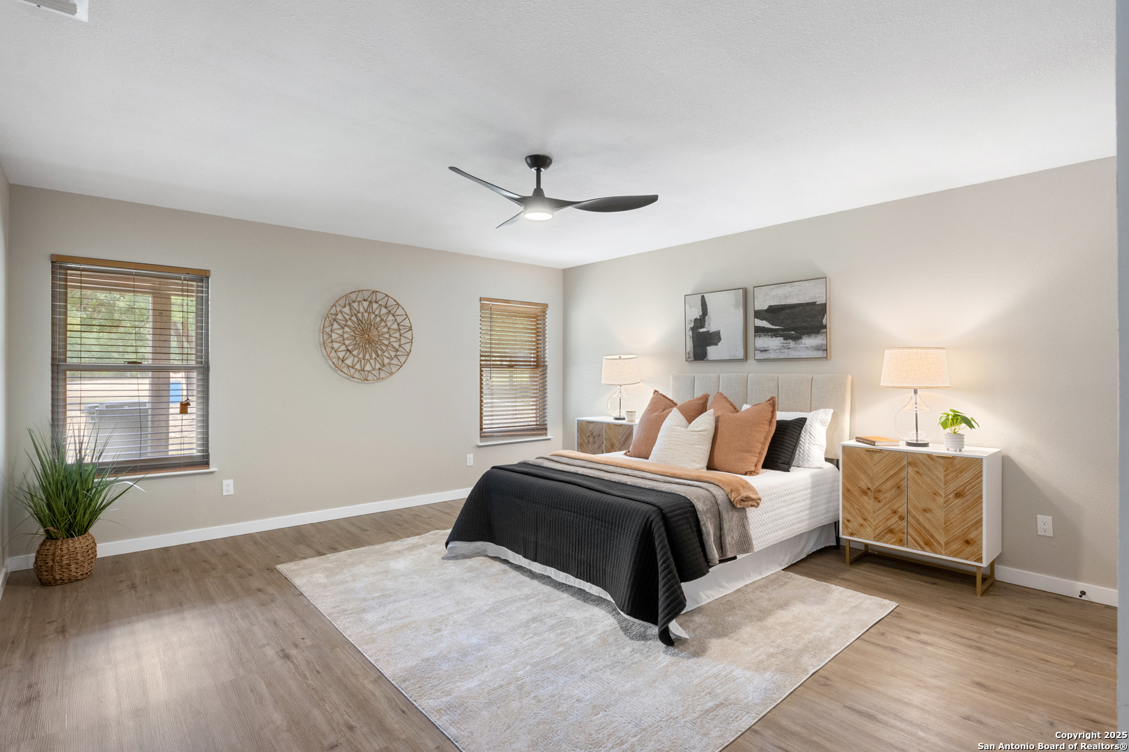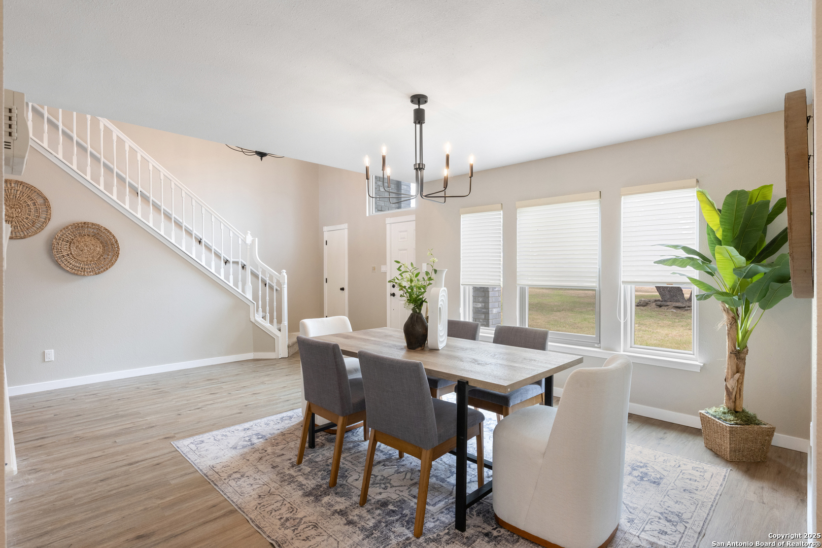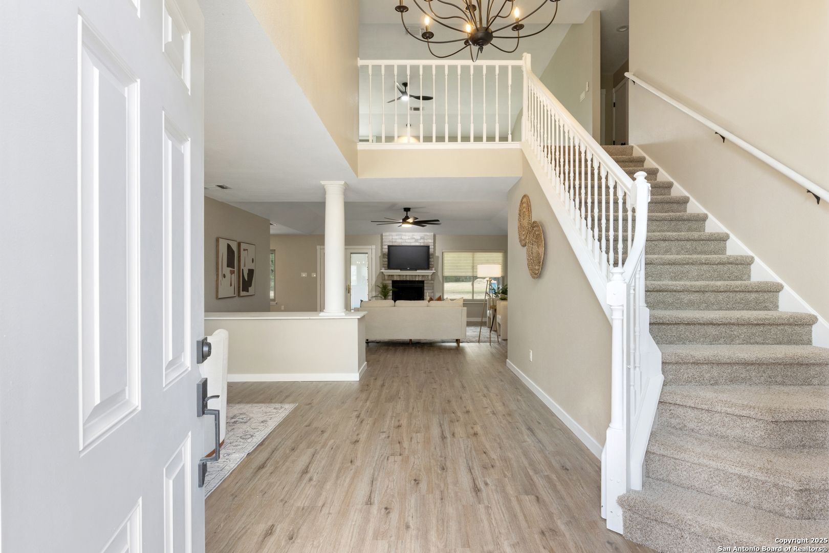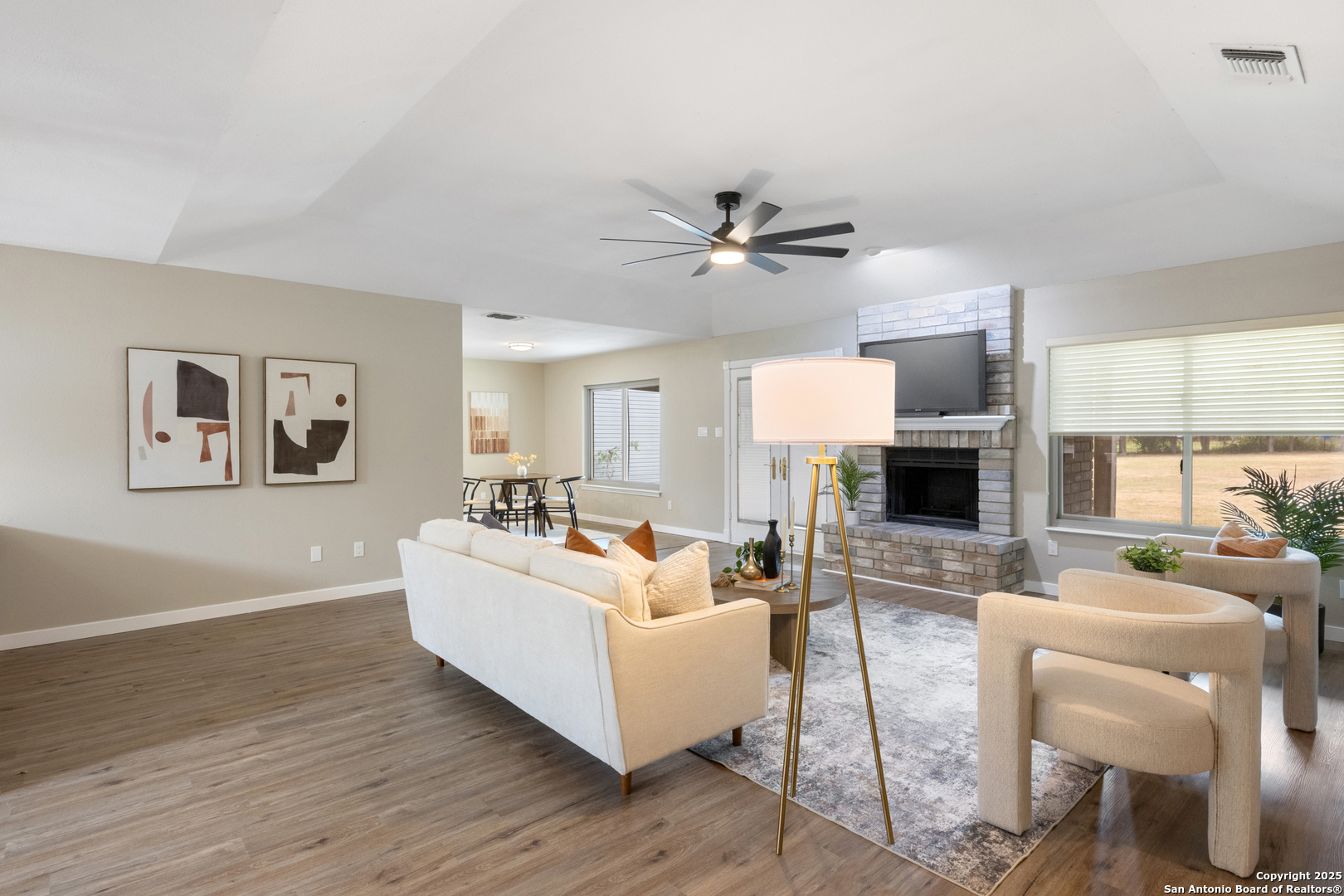 Welcome to your dream home in the desirable Oak Village North community of Bulverde, nestled in the top-rated Comal ISD and zoned to the sought-after Johnson Ranch and Smithson Valley schools. This stunning two-story brick residence offers the perfect blend of privacy, space, and comfort. All set on a beautifully treed 1-acre lot. As you arrive, you'll be greeted by mature oak trees, a spacious detached garage, and a welcoming covered front patio perfect for morning coffee or evening relaxation. Step inside to nearly 3,000 square feet of living space thoughtfully designed with both functionality and a luxurious ambiance. The grand entry opens to high ceilings and two spacious living areas. Both featuring cozy fireplaces ideal for gathering or quiet evenings. A formal dining room provides the perfect setting for holiday meals, while the additional eat-in kitchen space is ideal for everyday living. The island kitchen is a chef's delight with ample counter space, a walk-in pantry, and both casual and formal dining options nearby. The primary suite is conveniently located downstairs, offering a private retreat with a walk-in closet and a luxurious full bath featuring double vanities. Upstairs, you'll find additional bedrooms and an immense balcony that overlooks the scenic backyard - a peaceful spot to unwind. Throughout the home, you'll find upgraded luxury vinyl flooring, plush carpet in select rooms, ceiling fans, and elegant touches like a chandelier and large windows bringing in natural light. Step outside to enjoy the expansive backyard with mature trees, ideal for play, gardening, or entertaining under the large covered patio. Whether you're hosting summer BBQs or simply enjoying the quiet peace, this outdoor space offers endless possibilities. Located in the heart of Bulverde, you're just a short drive from the natural wonders of the Texas Hill Country, including the Guadalupe River, Canyon Lake, and the famous Natural Bridge Caverns. Enjoy the charm of small-town living with the convenience of shopping, dining, and entertainment just minutes away. Don't miss your opportunity to own a spacious retreat with modern comforts and refreshed character, all on a rare 1-acre lot in one of the most desirable parts of Texas. Schedule your showing today!