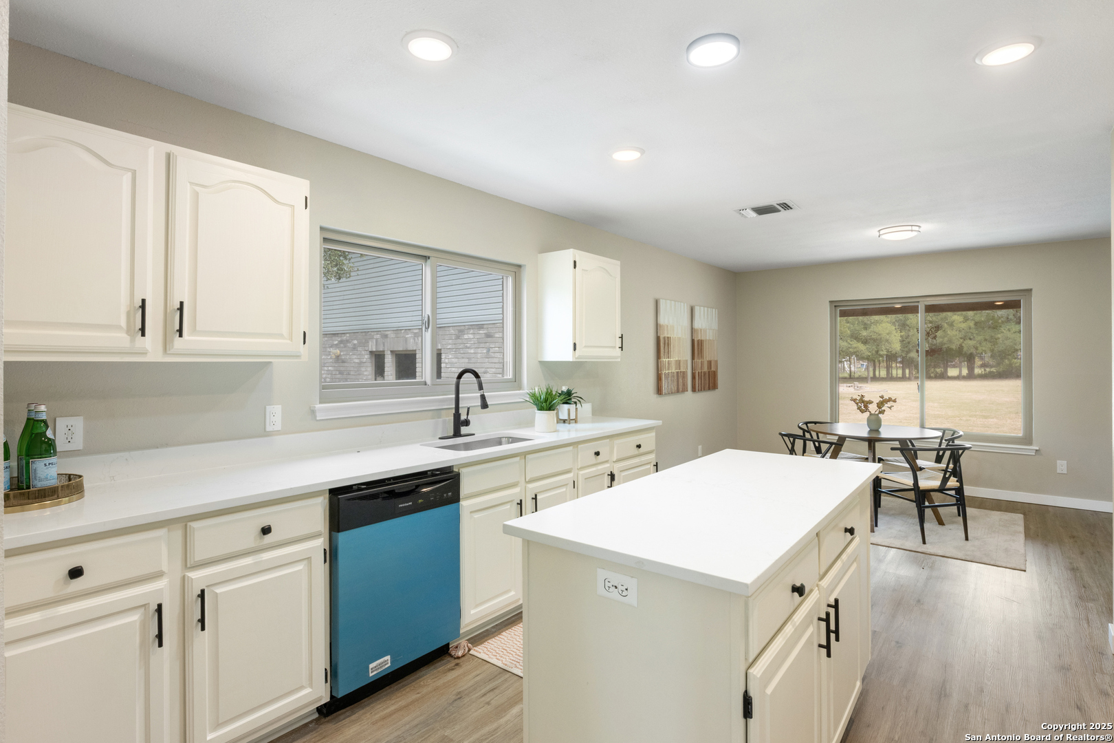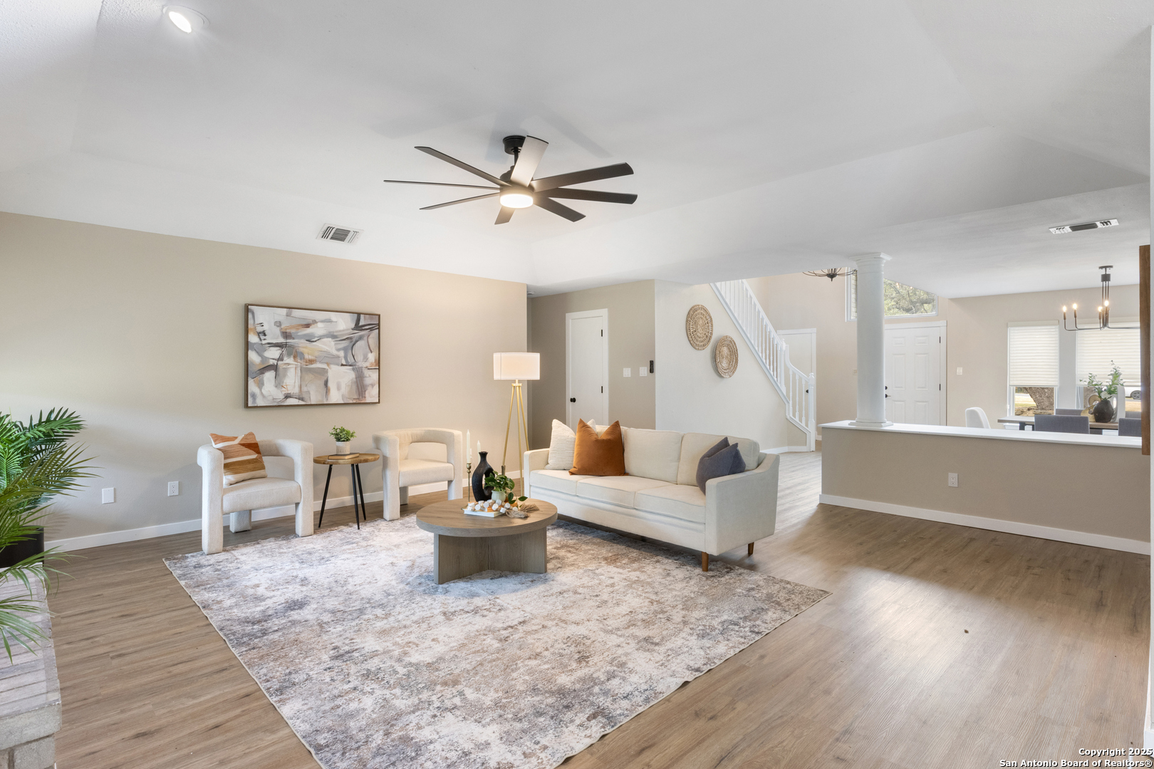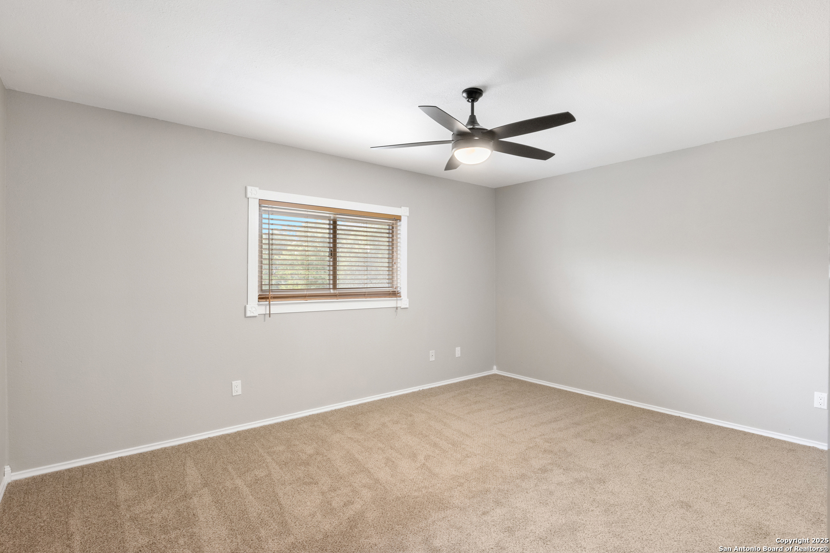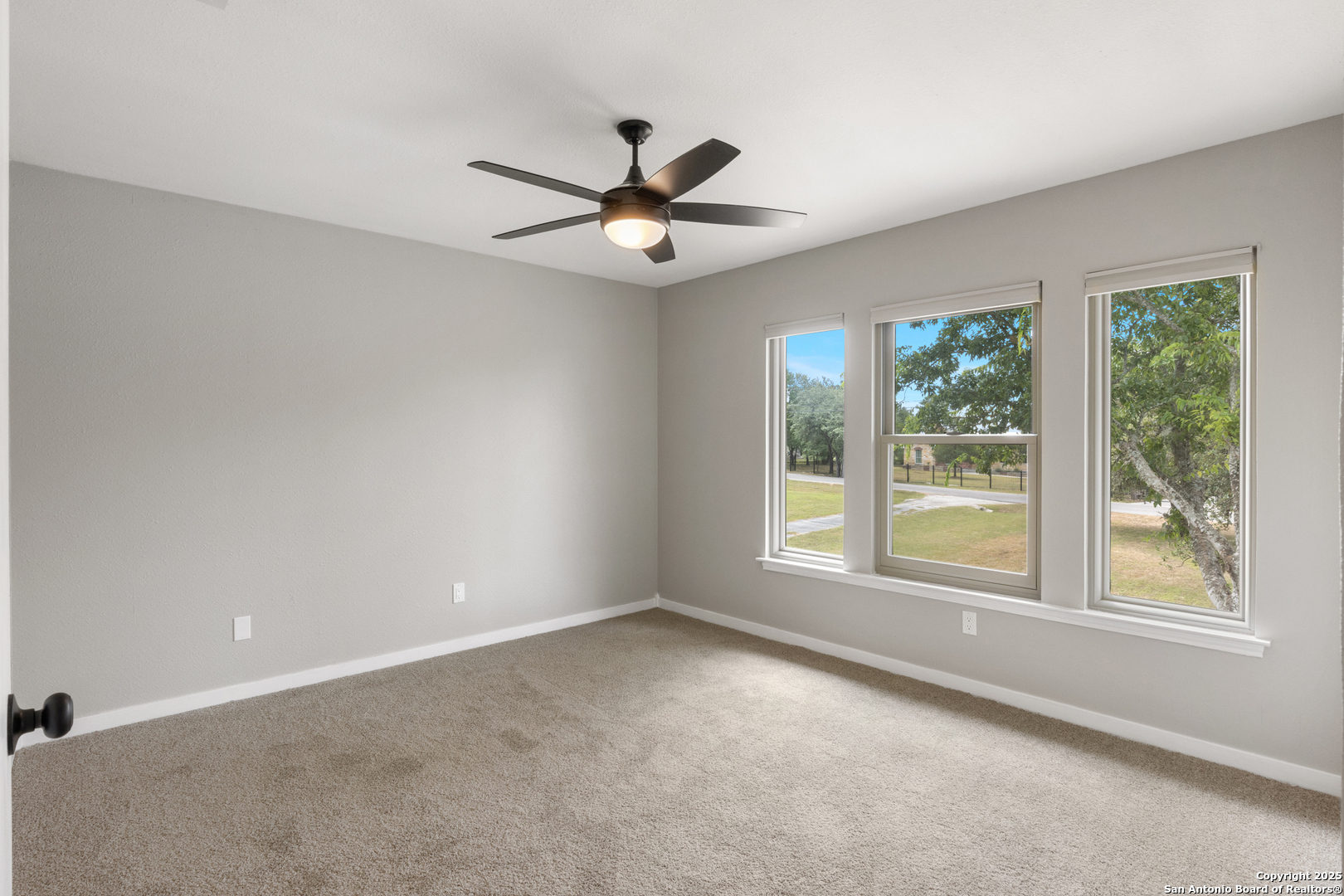 Welcome to your dream home in the desirable Oak Village North community of Bulverde, nestled in the top-rated Comal ISD and zoned to the sought-after Johnson Ranch and Smithson Valley schools. This stunning two-story brick residence offers the perfect blend of privacy, space, and comfort. All set on a beautifully treed 1-acre lot. As you arrive, you'll be greeted by mature oak trees, a spacious detached garage, and a welcoming covered front patio perfect for morning coffee or evening relaxation. Step inside to nearly 3,000 square feet of living space thoughtfully designed with both functionality and a luxurious ambiance. The grand entry opens to high ceilings and two spacious living areas. Both featuring cozy fireplaces ideal for gathering or quiet evenings. A formal dining room provides the perfect setting for holiday meals, while the additional eat-in kitchen space is ideal for everyday living. The island kitchen is a chef's delight with ample counter space, a walk-in pantry, and both casual and formal dining options nearby. The primary suite is conveniently located downstairs, offering a private retreat with a walk-in closet and a luxurious full bath featuring double vanities. Upstairs, you'll find additional bedrooms and an immense balcony that overlooks the scenic backyard - a peaceful spot to unwind. Throughout the home, you'll find upgraded luxury vinyl flooring, plush carpet in select rooms, ceiling fans, and elegant touches like a chandelier and large windows bringing in natural light. Step outside to enjoy the expansive backyard with mature trees, ideal for play, gardening, or entertaining under the large covered patio. Whether you're hosting summer BBQs or simply enjoying the quiet peace, this outdoor space offers endless possibilities. Located in the heart of Bulverde, you're just a short drive from the natural wonders of the Texas Hill Country, including the Guadalupe River, Canyon Lake, and the famous Natural Bridge Caverns. Enjoy the charm of small-town living with the convenience of shopping, dining, and entertainment just minutes away. Don't miss your opportunity to own a spacious retreat with modern comforts and refreshed character, all on a rare 1-acre lot in one of the most desirable parts of Texas. Schedule your showing today!
