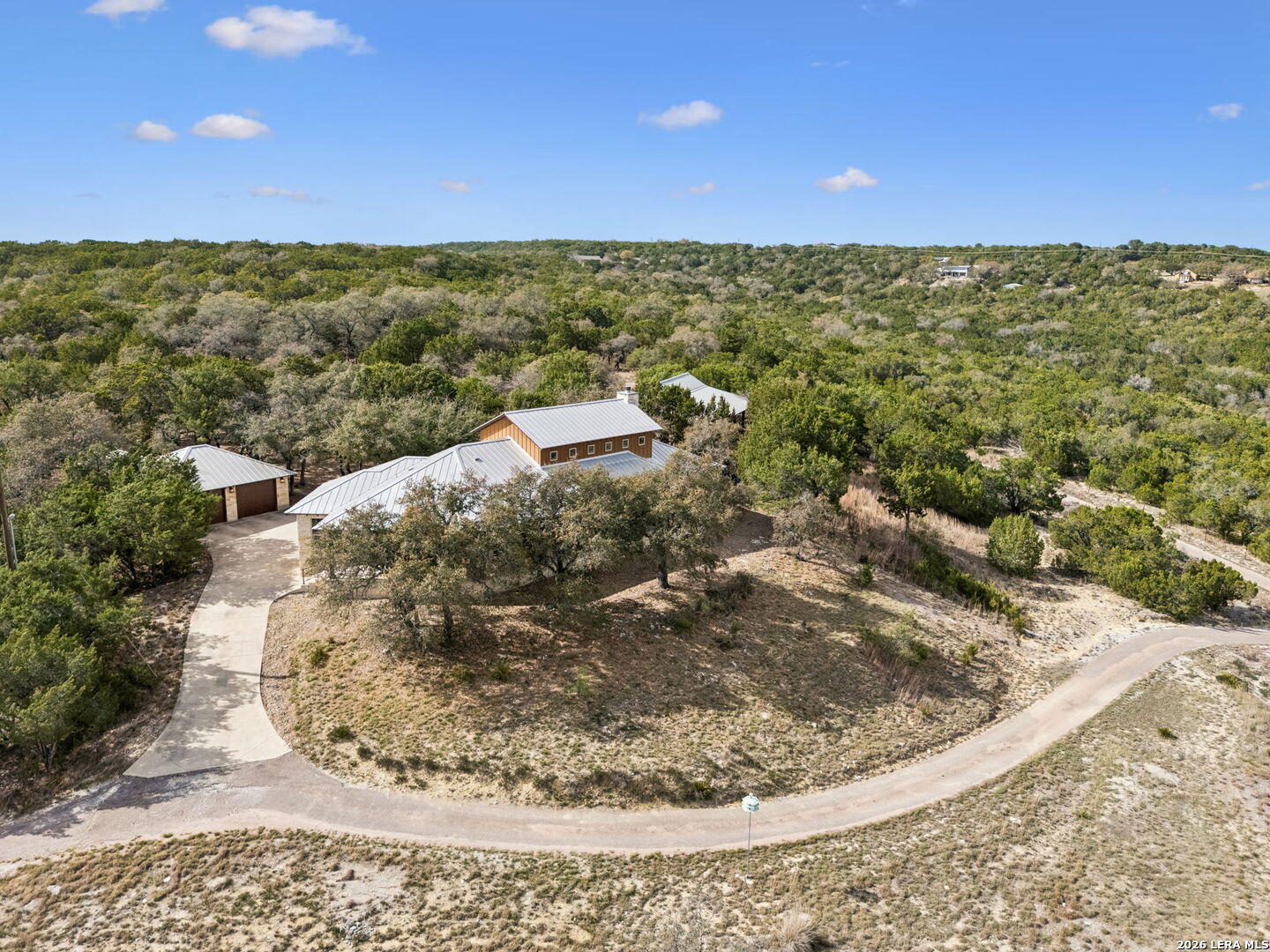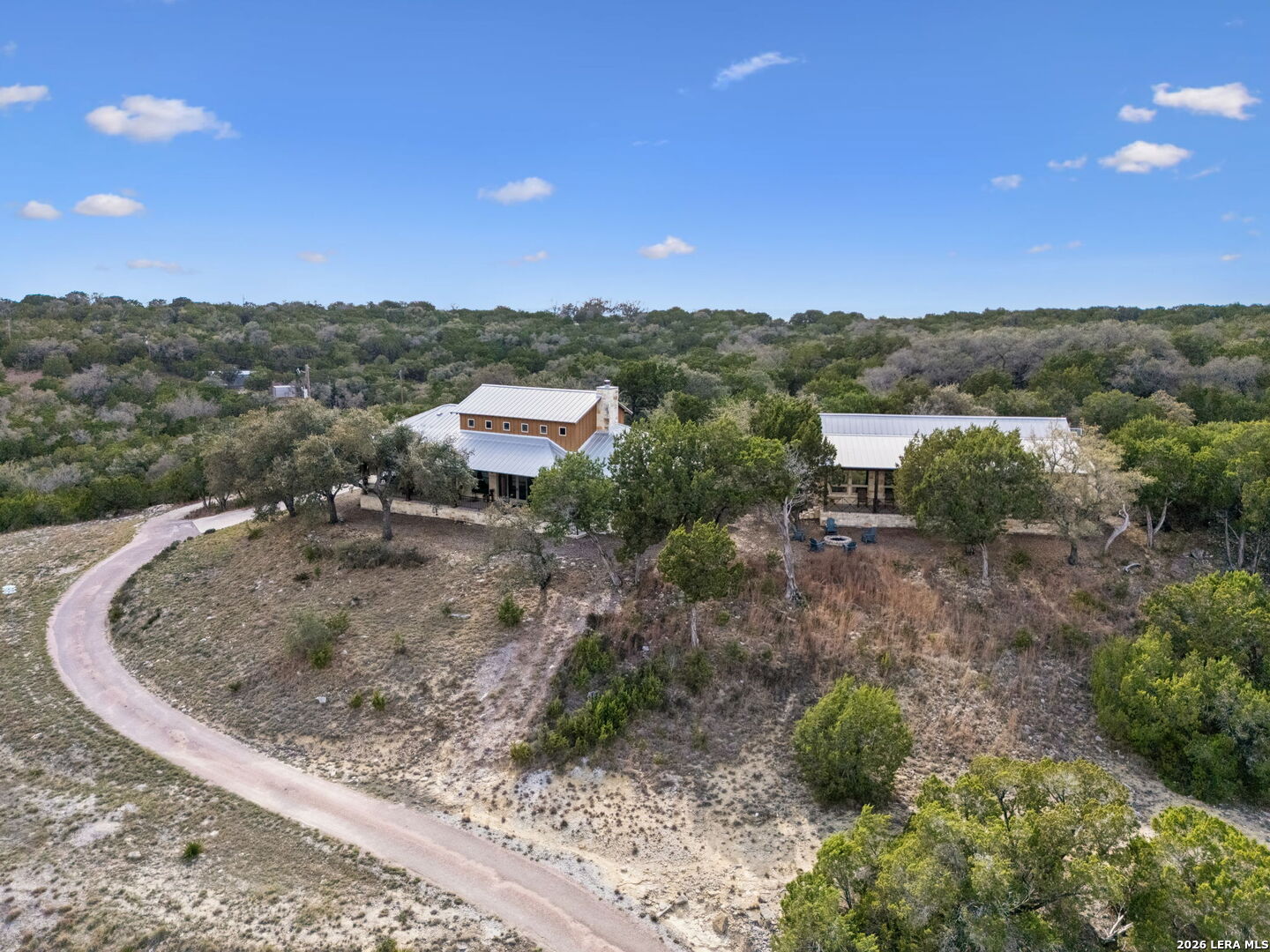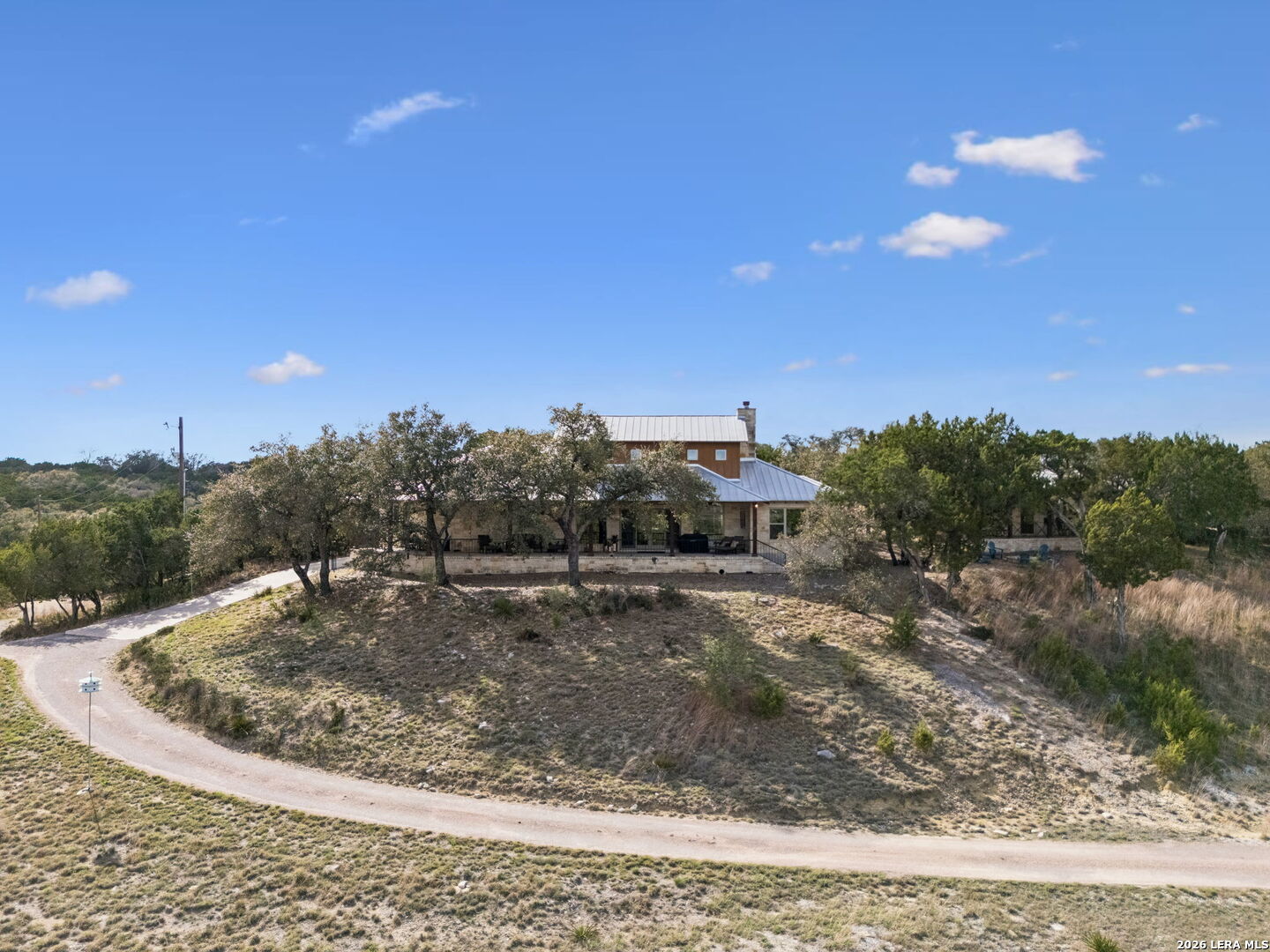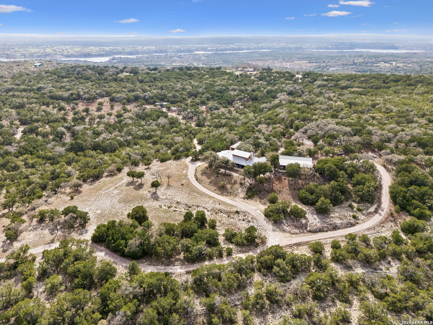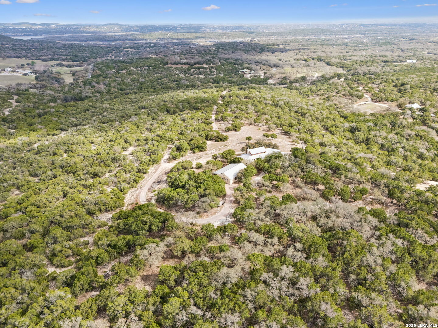 Tucked behind a private gated entrance and positioned deep within approximately 25.5 acres of rolling Hill Country terrain, 5214 Travis Peak Trail offers a rare combination of privacy, breathtaking views, and flexible living with two residences, a main home and guest home (both are 2 beds/2 baths each) on one spectacular property. Perched atop the land, the property captures sweeping panoramic vistas that stretch for miles, delivering unforgettable sunrise and sunset views. The main residence, built by respected custom builder Riata Builders, features timeless Hill Country architecture with a full stone exterior and metal roof designed for durability and character. Inside, the home opens to a dramatic living room highlighted by soaring 24-foot wood beam ceilings, rich engineered wood flooring, and a striking wood-burning fireplace with custom carved detailing and wood mantle. Recessed wall niches on each side of the fireplace create architectural interest while oversized windows frame the surrounding landscape. The dining area sits perfectly between the living room and kitchen beneath elegant chandeliers, creating a welcoming gathering space for entertaining. Just beyond, a temperature-controlled wine room with etched wine-themed flooring offers the perfect place to store and showcase your collection. The kitchen is designed for both function and entertaining, featuring granite countertops, a large granite island with electrical outlets, GE Monogram appliances, recessed lighting, under-cabinet lighting, pull-out storage systems, built-in refrigerator, double-door oven, dishwasher, and ice maker. A spacious walk-in pantry with a secondary refrigerator provides additional storage and convenience. The primary suite offers privacy and direct patio access with beautiful Hill Country views. The primary bathroom includes a large soaking tub, walk-in shower, dual sinks, unique tile work, and a spacious walk-in closet complete with built-in shelving, dressers, and shoe storage. A secondary bedroom with walk-in closet and beautifully tiled bathroom is located just down a short hallway. Outdoor living is a highlight of the property with a full-length covered porch featuring wood beam ceilings and ceiling fans, plus a nearby fire pit gathering area perfect for enjoying quiet Hill Country evenings. Beyond the main home sits a fully independent guest residence, also built by Riata Builders, transforming the property into a true compound. The guest house includes a spacious living and entertainment area with concrete floors, pool table, shuffleboard, and surround sound. The kitchen features a granite island with electrical outlet, dining area, pantry, dishwasher, refrigerator, ice maker, and recessed lighting. Two bedrooms are located in the guest house, including a primary-sized bedroom with walk-in closet and private bath with copper sink and shower. A second bedroom with walk-in closet is served by a hall bath with walk-in shower. A stackable washer and dryer provide added convenience. Additional property features include a private well, septic system, hot water recirculation system in the main home (excluding kitchen), gated entrance, private driveway, two-car garage, and expansive outdoor entertaining spaces. Located on a private road within Broken Creek, residents enjoy access to a private boat ramp just down Travis Peak, as well as close proximity to Flat Creek Winery & Restaurant and LCRA's Gloster Bend Park with Lake Travis access. With two residences, incredible views, and 25.5 unrestricted acres, this property represents a rare opportunity to own a private Hill Country estate where natural beauty, luxury, and lifestyle come together.