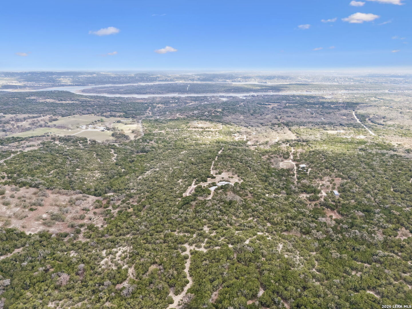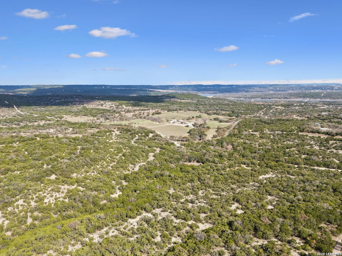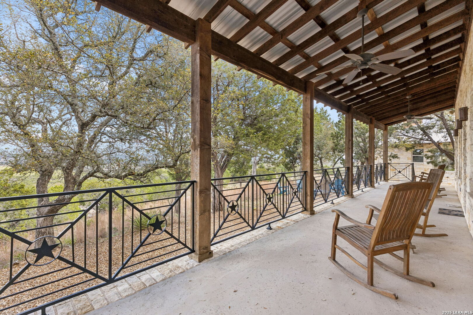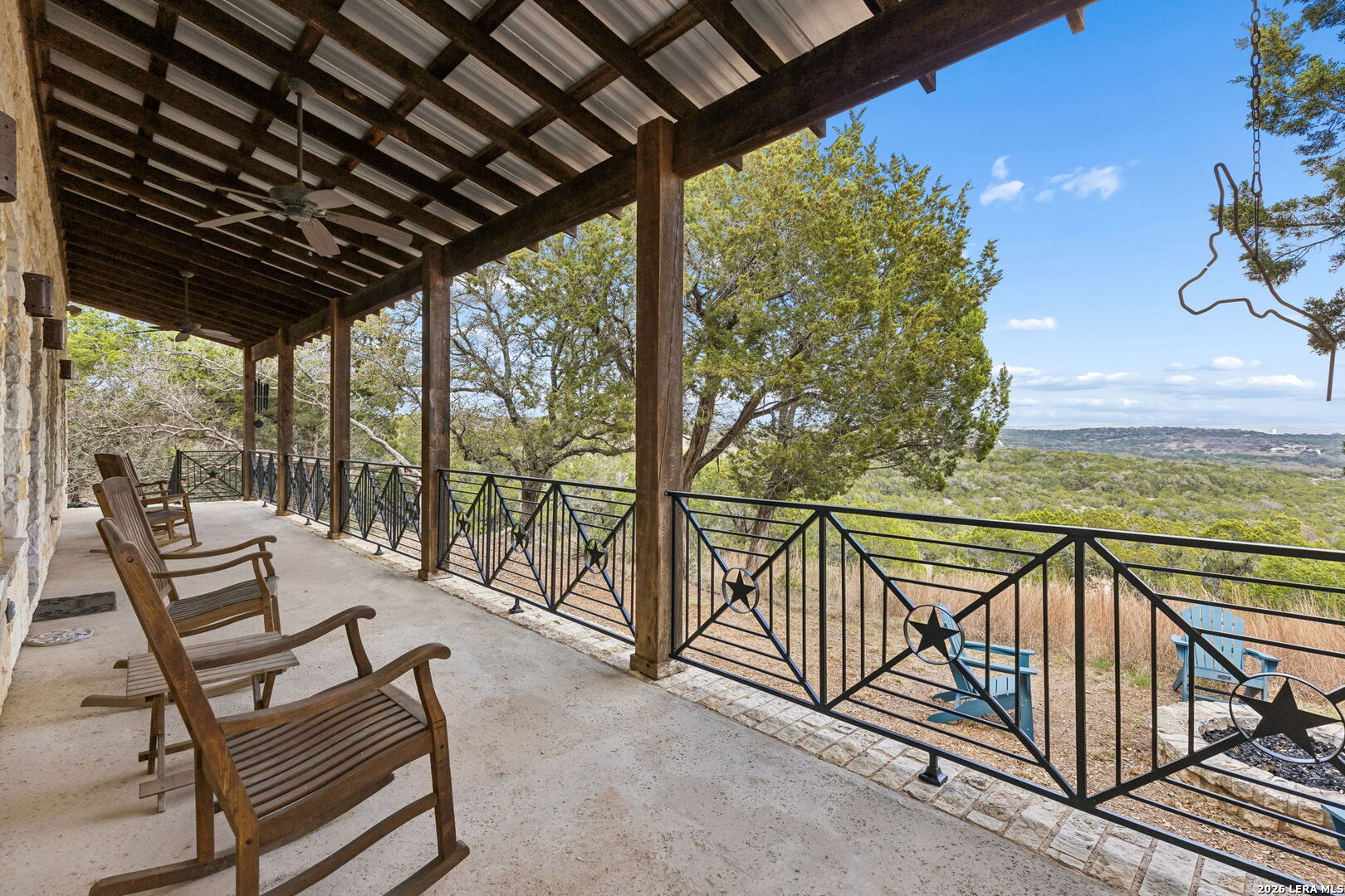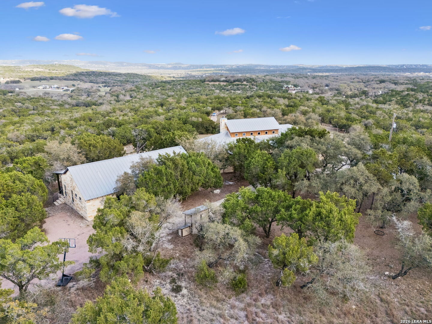 Tucked behind a private gated entrance and positioned deep within approximately 25.5 acres of rolling Hill Country terrain, 5214 Travis Peak Trail offers a rare combination of privacy, breathtaking views, and flexible living with two residences, a main home and guest home (both are 2 beds/2 baths each) on one spectacular property. Perched atop the land, the property captures sweeping panoramic vistas that stretch for miles, delivering unforgettable sunrise and sunset views. The main residence, built by respected custom builder Riata Builders, features timeless Hill Country architecture with a full stone exterior and metal roof designed for durability and character. Inside, the home opens to a dramatic living room highlighted by soaring 24-foot wood beam ceilings, rich engineered wood flooring, and a striking wood-burning fireplace with custom carved detailing and wood mantle. Recessed wall niches on each side of the fireplace create architectural interest while oversized windows frame the surrounding landscape. The dining area sits perfectly between the living room and kitchen beneath elegant chandeliers, creating a welcoming gathering space for entertaining. Just beyond, a temperature-controlled wine room with etched wine-themed flooring offers the perfect place to store and showcase your collection. The kitchen is designed for both function and entertaining, featuring granite countertops, a large granite island with electrical outlets, GE Monogram appliances, recessed lighting, under-cabinet lighting, pull-out storage systems, built-in refrigerator, double-door oven, dishwasher, and ice maker. A spacious walk-in pantry with a secondary refrigerator provides additional storage and convenience. The primary suite offers privacy and direct patio access with beautiful Hill Country views. The primary bathroom includes a large soaking tub, walk-in shower, dual sinks, unique tile work, and a spacious walk-in closet complete with built-in shelving, dressers, and shoe storage. A secondary bedroom with walk-in closet and beautifully tiled bathroom is located just down a short hallway. Outdoor living is a highlight of the property with a full-length covered porch featuring wood beam ceilings and ceiling fans, plus a nearby fire pit gathering area perfect for enjoying quiet Hill Country evenings. Beyond the main home sits a fully independent guest residence, also built by Riata Builders, transforming the property into a true compound. The guest house includes a spacious living and entertainment area with concrete floors, pool table, shuffleboard, and surround sound. The kitchen features a granite island with electrical outlet, dining area, pantry, dishwasher, refrigerator, ice maker, and recessed lighting. Two bedrooms are located in the guest house, including a primary-sized bedroom with walk-in closet and private bath with copper sink and shower. A second bedroom with walk-in closet is served by a hall bath with walk-in shower. A stackable washer and dryer provide added convenience. Additional property features include a private well, septic system, hot water recirculation system in the main home (excluding kitchen), gated entrance, private driveway, two-car garage, and expansive outdoor entertaining spaces. Located on a private road within Broken Creek, residents enjoy access to a private boat ramp just down Travis Peak, as well as close proximity to Flat Creek Winery & Restaurant and LCRA's Gloster Bend Park with Lake Travis access. With two residences, incredible views, and 25.5 unrestricted acres, this property represents a rare opportunity to own a private Hill Country estate where natural beauty, luxury, and lifestyle come together.