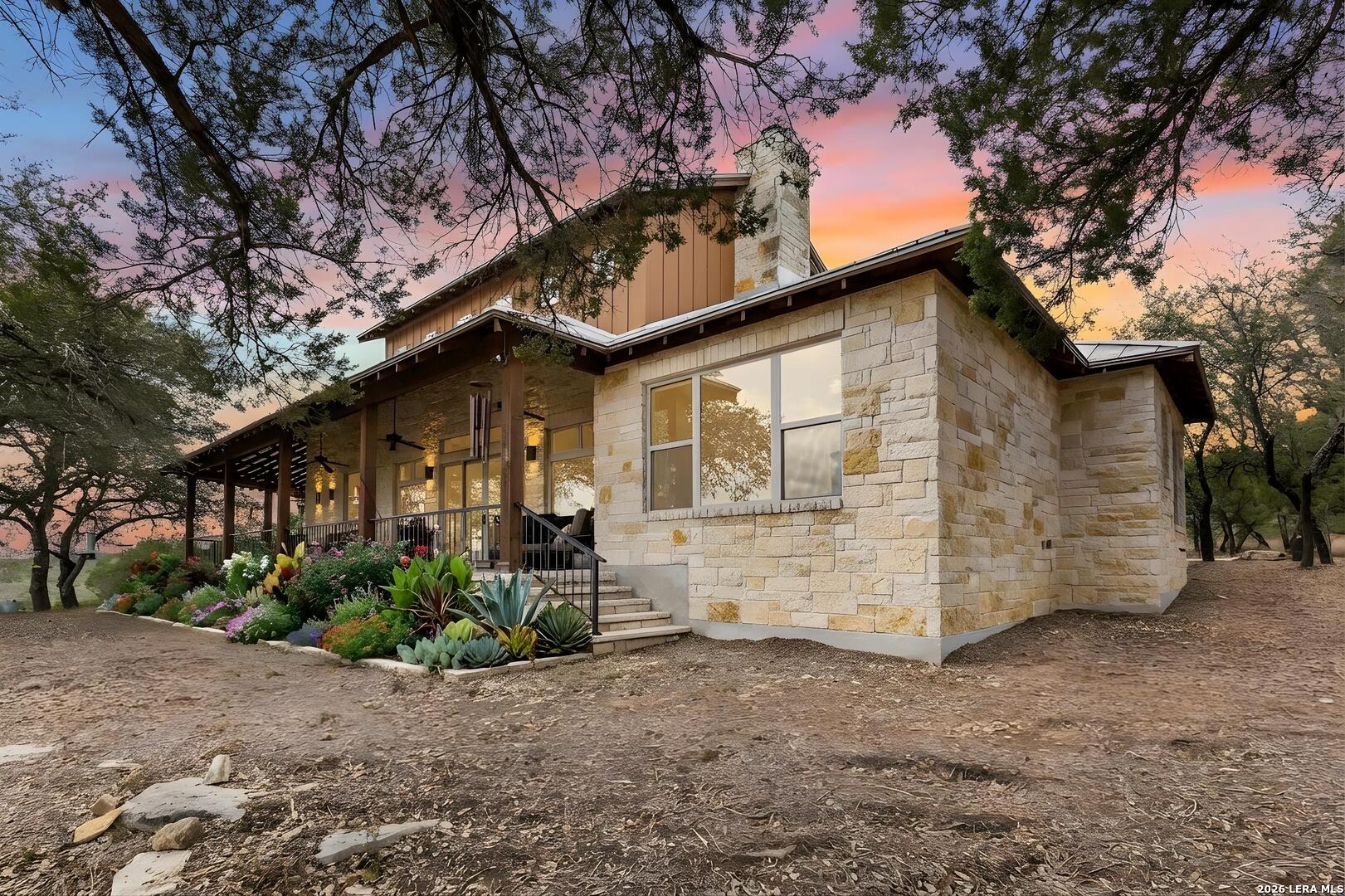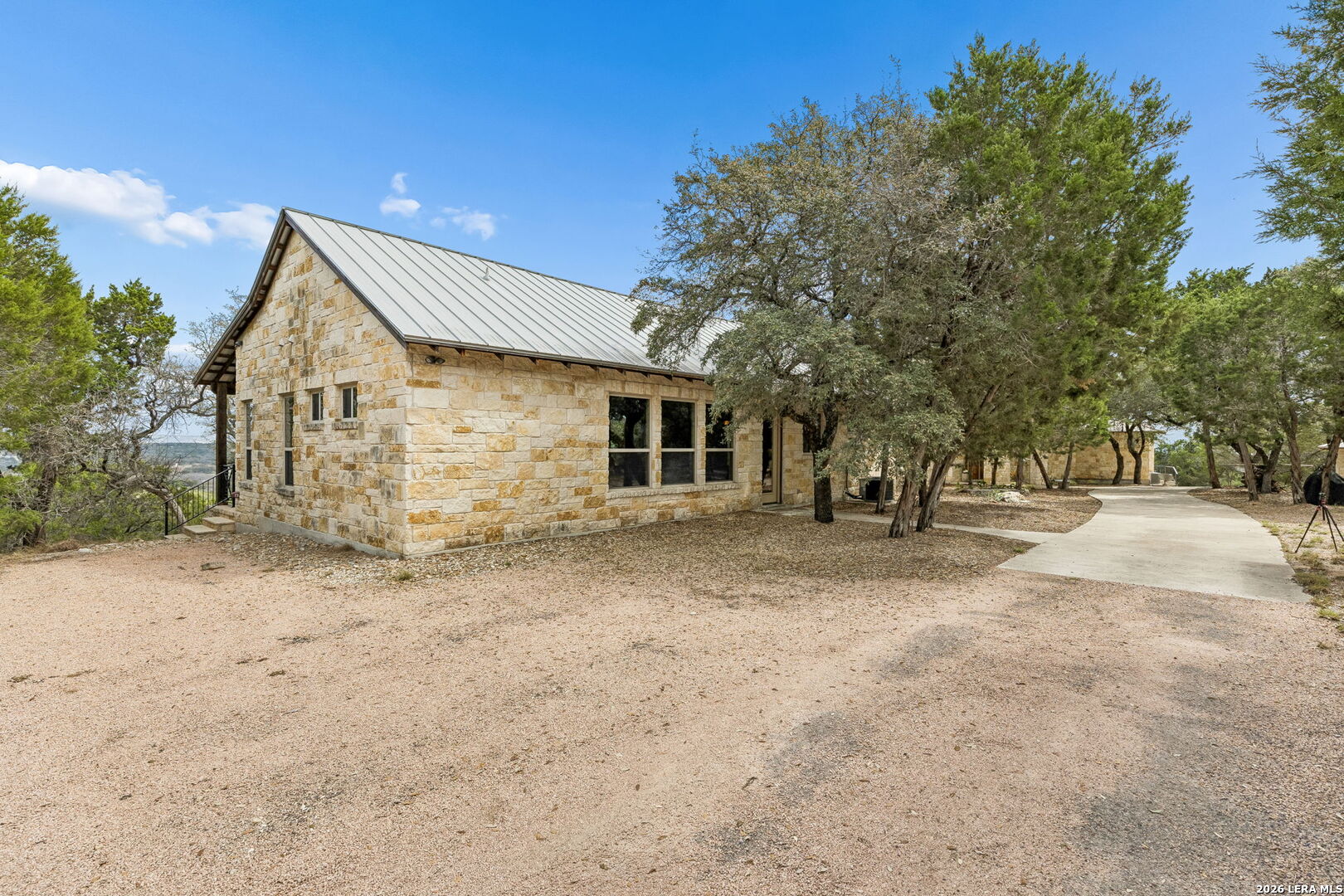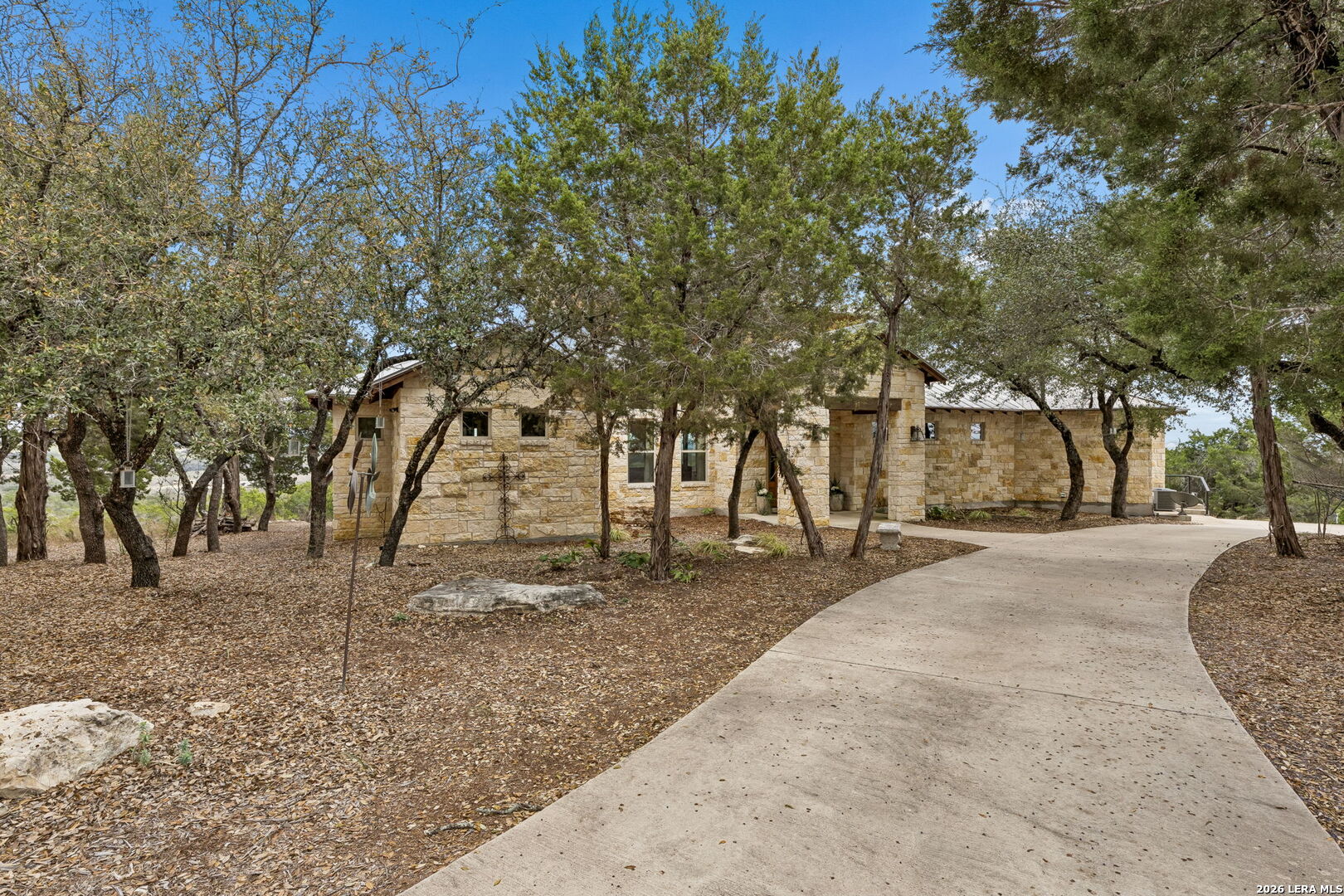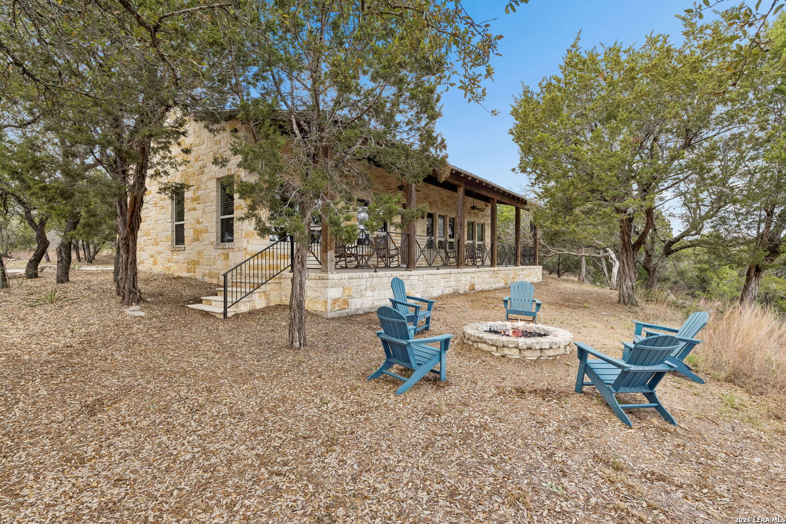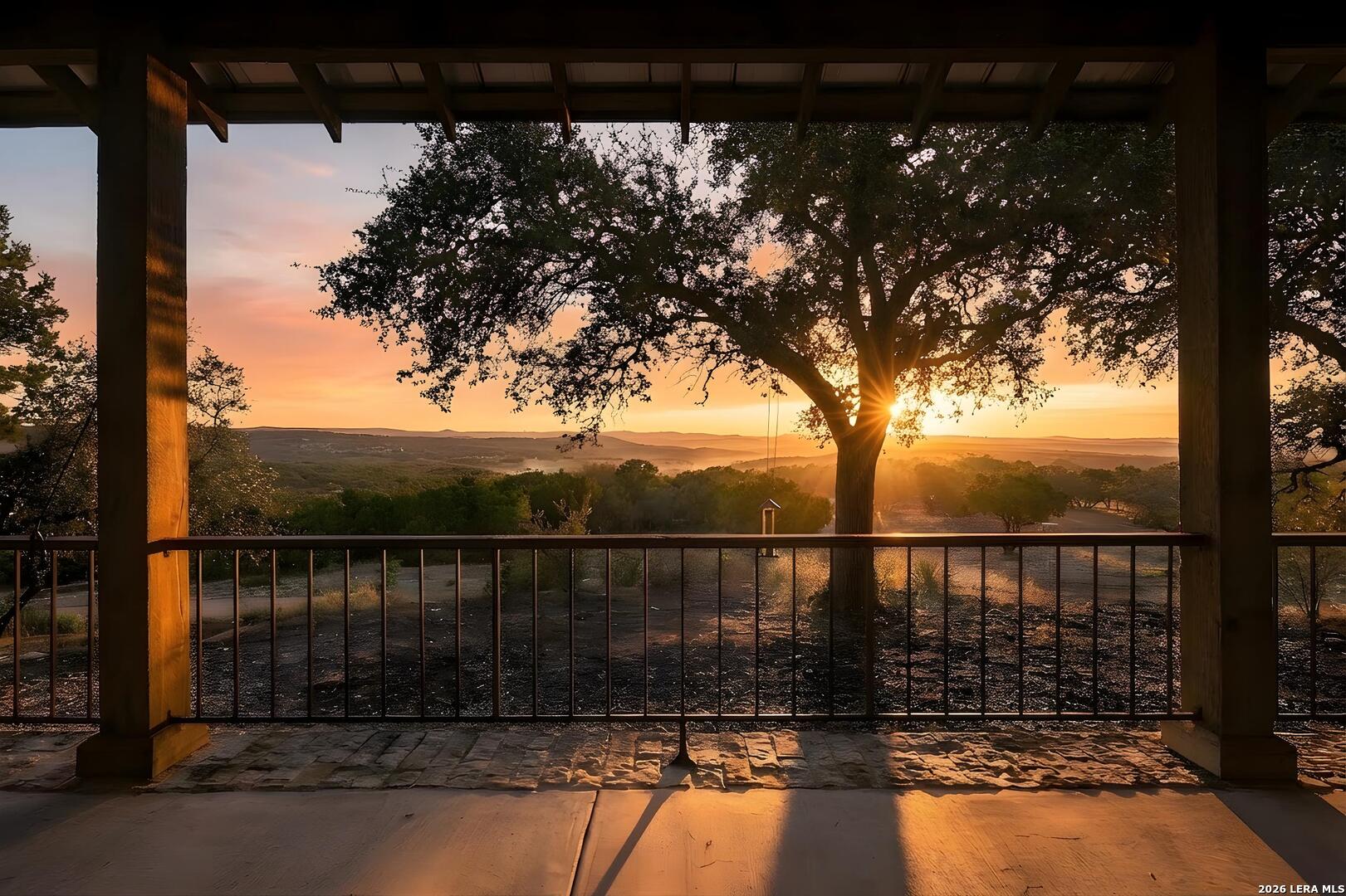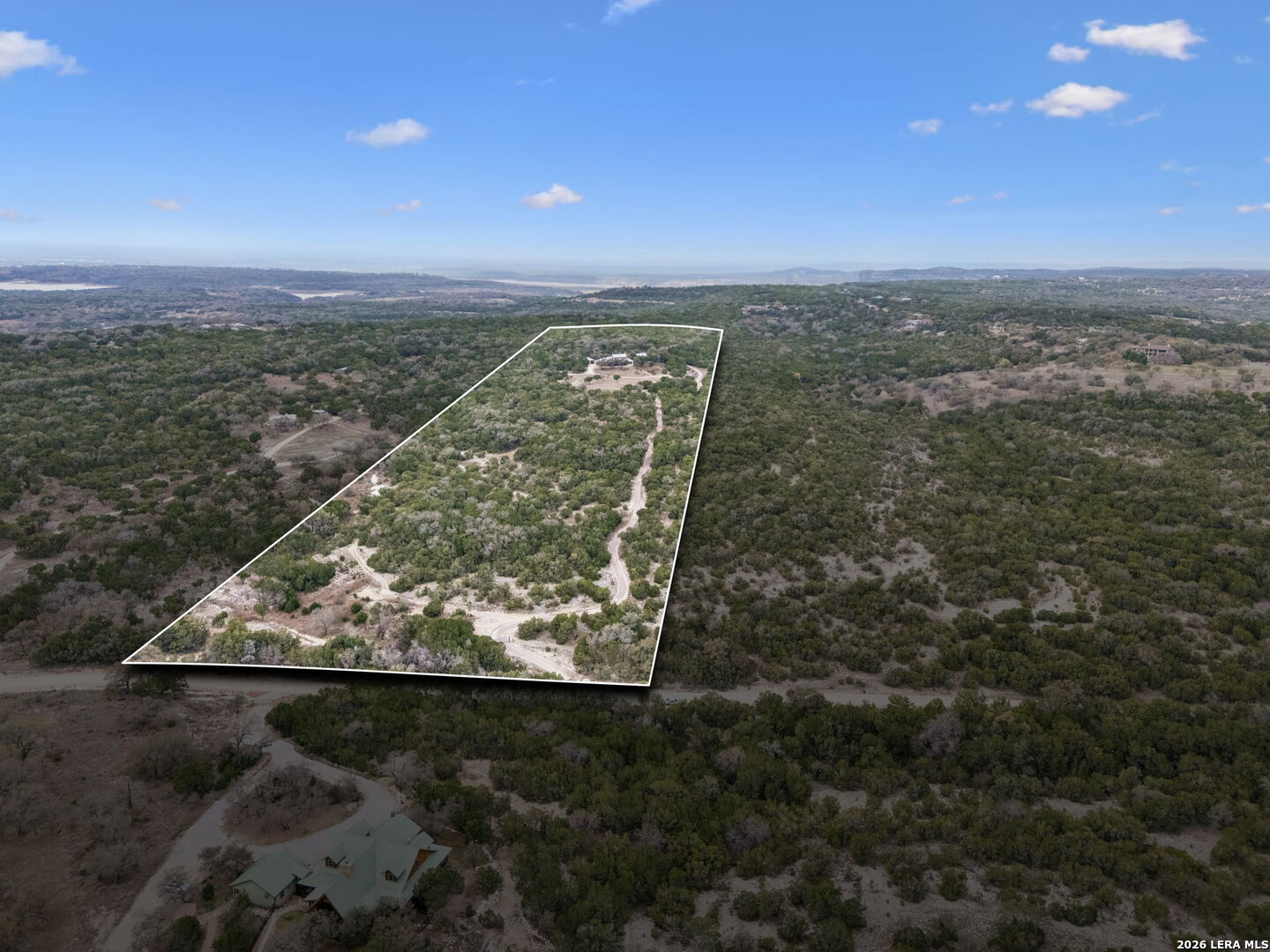 Tucked behind a private gated entrance and positioned deep within approximately 25.5 acres of rolling Hill Country terrain, 5214 Travis Peak Trail offers a rare combination of privacy, breathtaking views, and flexible living with two residences, a main home and guest home (both are 2 beds/2 baths each) on one spectacular property. Perched atop the land, the property captures sweeping panoramic vistas that stretch for miles, delivering unforgettable sunrise and sunset views. The main residence, built by respected custom builder Riata Builders, features timeless Hill Country architecture with a full stone exterior and metal roof designed for durability and character. Inside, the home opens to a dramatic living room highlighted by soaring 24-foot wood beam ceilings, rich engineered wood flooring, and a striking wood-burning fireplace with custom carved detailing and wood mantle. Recessed wall niches on each side of the fireplace create architectural interest while oversized windows frame the surrounding landscape. The dining area sits perfectly between the living room and kitchen beneath elegant chandeliers, creating a welcoming gathering space for entertaining. Just beyond, a temperature-controlled wine room with etched wine-themed flooring offers the perfect place to store and showcase your collection. The kitchen is designed for both function and entertaining, featuring granite countertops, a large granite island with electrical outlets, GE Monogram appliances, recessed lighting, under-cabinet lighting, pull-out storage systems, built-in refrigerator, double-door oven, dishwasher, and ice maker. A spacious walk-in pantry with a secondary refrigerator provides additional storage and convenience. The primary suite offers privacy and direct patio access with beautiful Hill Country views. The primary bathroom includes a large soaking tub, walk-in shower, dual sinks, unique tile work, and a spacious walk-in closet complete with built-in shelving, dressers, and shoe storage. A secondary bedroom with walk-in closet and beautifully tiled bathroom is located just down a short hallway. Outdoor living is a highlight of the property with a full-length covered porch featuring wood beam ceilings and ceiling fans, plus a nearby fire pit gathering area perfect for enjoying quiet Hill Country evenings. Beyond the main home sits a fully independent guest residence, also built by Riata Builders, transforming the property into a true compound. The guest house includes a spacious living and entertainment area with concrete floors, pool table, shuffleboard, and surround sound. The kitchen features a granite island with electrical outlet, dining area, pantry, dishwasher, refrigerator, ice maker, and recessed lighting. Two bedrooms are located in the guest house, including a primary-sized bedroom with walk-in closet and private bath with copper sink and shower. A second bedroom with walk-in closet is served by a hall bath with walk-in shower. A stackable washer and dryer provide added convenience. Additional property features include a private well, septic system, hot water recirculation system in the main home (excluding kitchen), gated entrance, private driveway, two-car garage, and expansive outdoor entertaining spaces. Located on a private road within Broken Creek, residents enjoy access to a private boat ramp just down Travis Peak, as well as close proximity to Flat Creek Winery & Restaurant and LCRA's Gloster Bend Park with Lake Travis access. With two residences, incredible views, and 25.5 unrestricted acres, this property represents a rare opportunity to own a private Hill Country estate where natural beauty, luxury, and lifestyle come together.