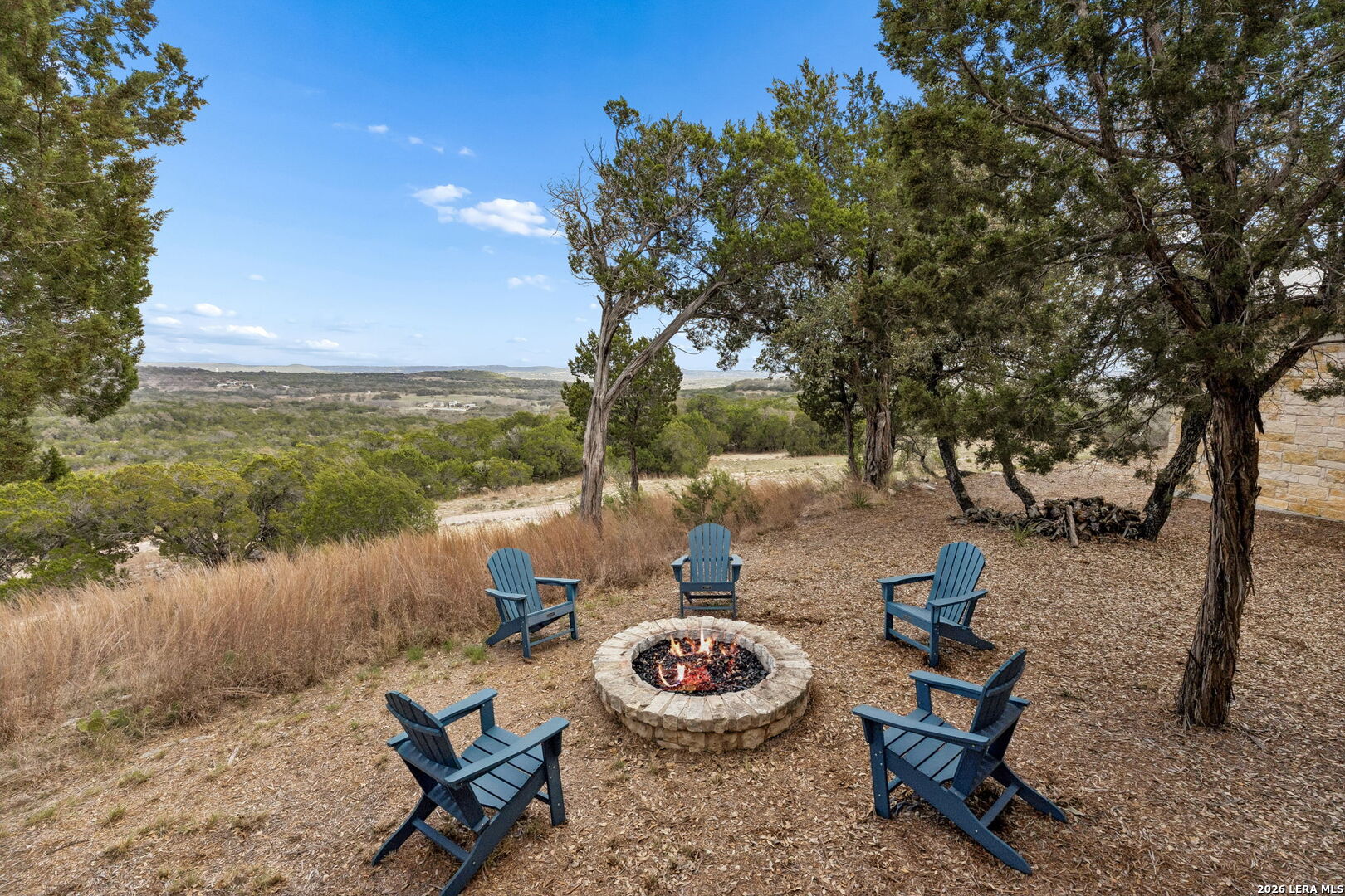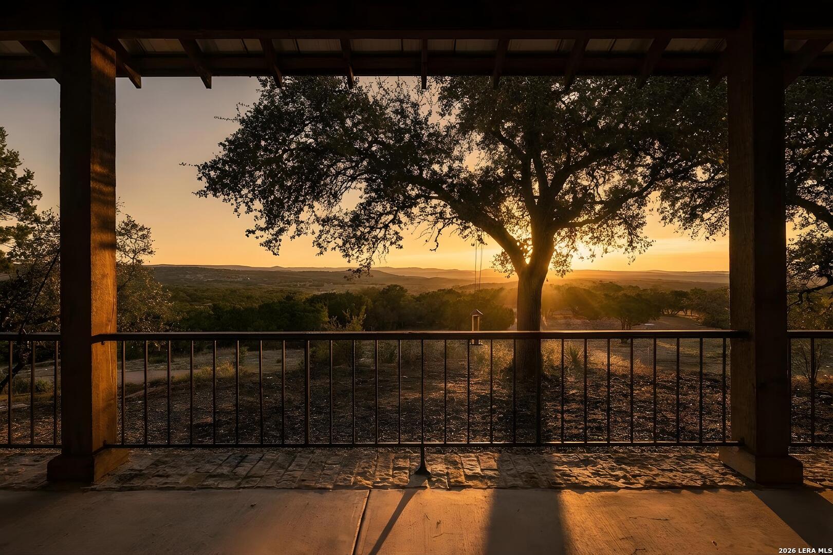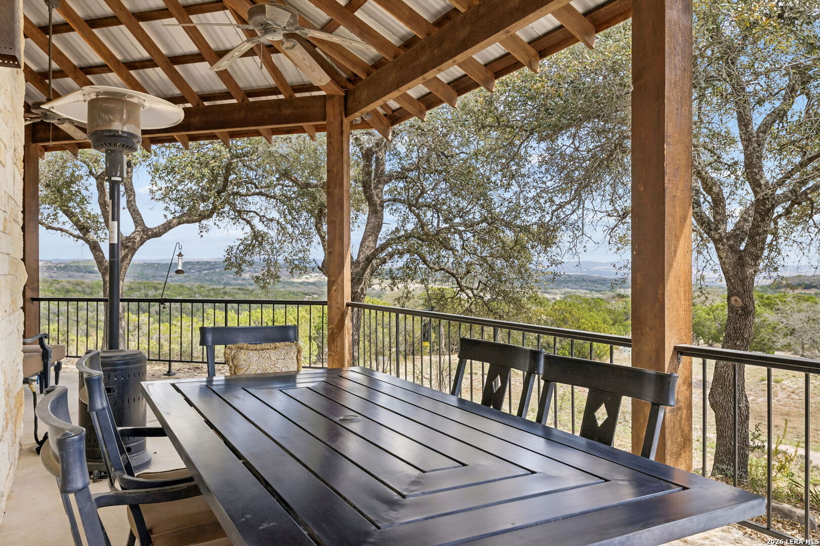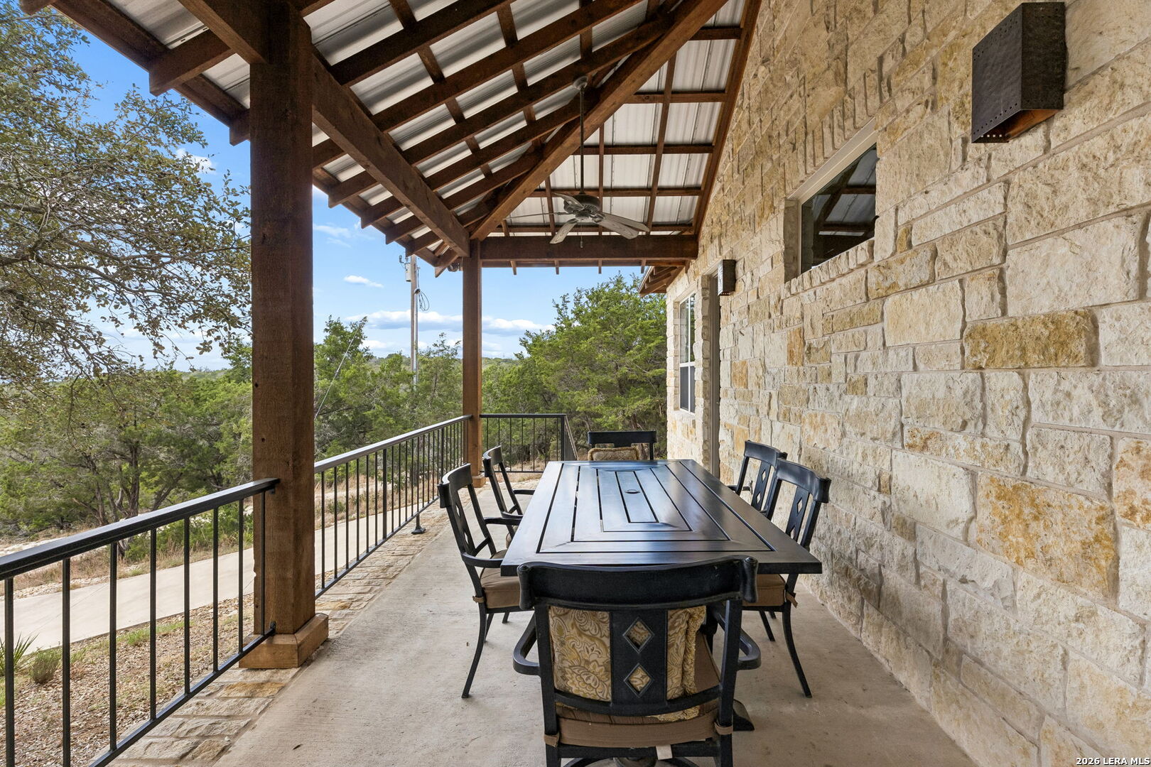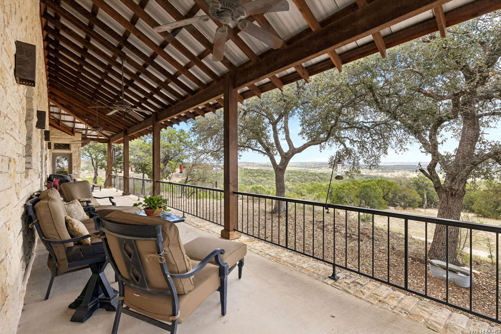 Tucked behind a private gated entrance and positioned deep within approximately 25.5 acres of rolling Hill Country terrain, 5214 Travis Peak Trail offers a rare combination of privacy, breathtaking views, and flexible living with two residences, a main home and guest home (both are 2 beds/2 baths each) on one spectacular property. Perched atop the land, the property captures sweeping panoramic vistas that stretch for miles, delivering unforgettable sunrise and sunset views. The main residence, built by respected custom builder Riata Builders, features timeless Hill Country architecture with a full stone exterior and metal roof designed for durability and character. Inside, the home opens to a dramatic living room highlighted by soaring 24-foot wood beam ceilings, rich engineered wood flooring, and a striking wood-burning fireplace with custom carved detailing and wood mantle. Recessed wall niches on each side of the fireplace create architectural interest while oversized windows frame the surrounding landscape. The dining area sits perfectly between the living room and kitchen beneath elegant chandeliers, creating a welcoming gathering space for entertaining. Just beyond, a temperature-controlled wine room with etched wine-themed flooring offers the perfect place to store and showcase your collection. The kitchen is designed for both function and entertaining, featuring granite countertops, a large granite island with electrical outlets, GE Monogram appliances, recessed lighting, under-cabinet lighting, pull-out storage systems, built-in refrigerator, double-door oven, dishwasher, and ice maker. A spacious walk-in pantry with a secondary refrigerator provides additional storage and convenience. The primary suite offers privacy and direct patio access with beautiful Hill Country views. The primary bathroom includes a large soaking tub, walk-in shower, dual sinks, unique tile work, and a spacious walk-in closet complete with built-in shelving, dressers, and shoe storage. A secondary bedroom with walk-in closet and beautifully tiled bathroom is located just down a short hallway. Outdoor living is a highlight of the property with a full-length covered porch featuring wood beam ceilings and ceiling fans, plus a nearby fire pit gathering area perfect for enjoying quiet Hill Country evenings. Beyond the main home sits a fully independent guest residence, also built by Riata Builders, transforming the property into a true compound. The guest house includes a spacious living and entertainment area with concrete floors, pool table, shuffleboard, and surround sound. The kitchen features a granite island with electrical outlet, dining area, pantry, dishwasher, refrigerator, ice maker, and recessed lighting. Two bedrooms are located in the guest house, including a primary-sized bedroom with walk-in closet and private bath with copper sink and shower. A second bedroom with walk-in closet is served by a hall bath with walk-in shower. A stackable washer and dryer provide added convenience. Additional property features include a private well, septic system, hot water recirculation system in the main home (excluding kitchen), gated entrance, private driveway, two-car garage, and expansive outdoor entertaining spaces. Located on a private road within Broken Creek, residents enjoy access to a private boat ramp just down Travis Peak, as well as close proximity to Flat Creek Winery & Restaurant and LCRA's Gloster Bend Park with Lake Travis access. With two residences, incredible views, and 25.5 unrestricted acres, this property represents a rare opportunity to own a private Hill Country estate where natural beauty, luxury, and lifestyle come together.