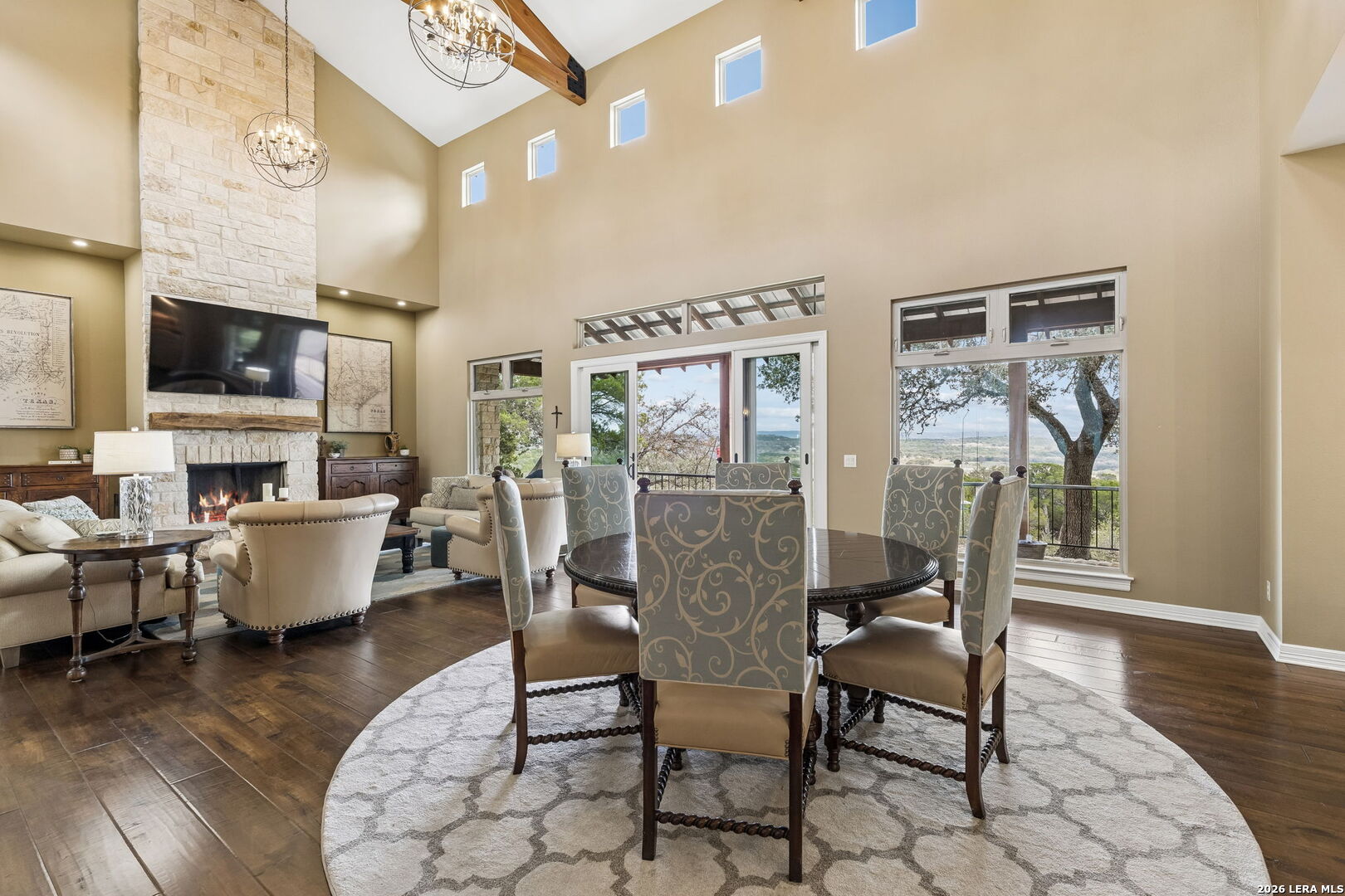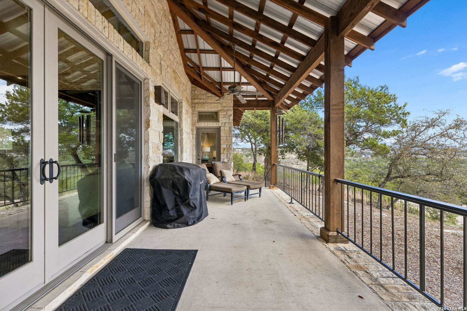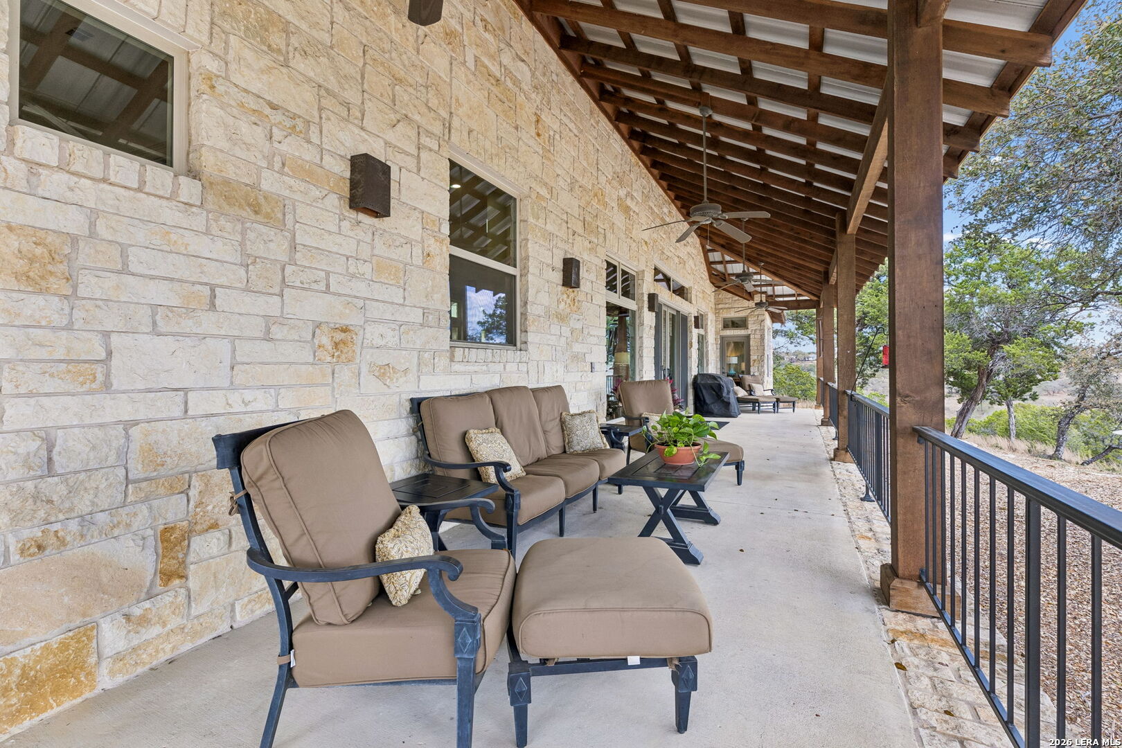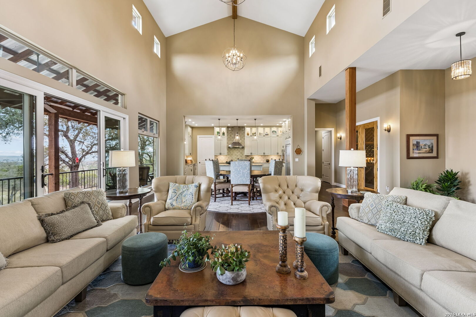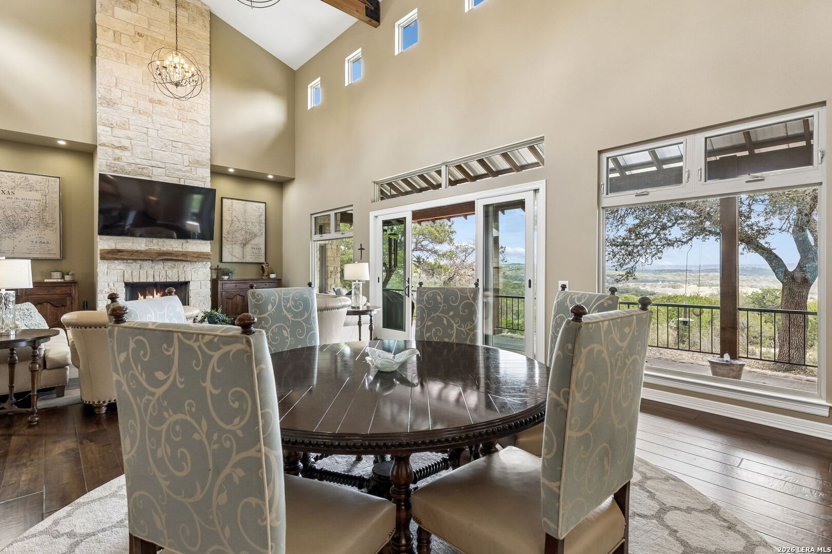 Tucked behind a private gated entrance and positioned deep within approximately 25.5 acres of rolling Hill Country terrain, 5214 Travis Peak Trail offers a rare combination of privacy, breathtaking views, and flexible living with two residences, a main home and guest home (both are 2 beds/2 baths each) on one spectacular property. Perched atop the land, the property captures sweeping panoramic vistas that stretch for miles, delivering unforgettable sunrise and sunset views. The main residence, built by respected custom builder Riata Builders, features timeless Hill Country architecture with a full stone exterior and metal roof designed for durability and character. Inside, the home opens to a dramatic living room highlighted by soaring 24-foot wood beam ceilings, rich engineered wood flooring, and a striking wood-burning fireplace with custom carved detailing and wood mantle. Recessed wall niches on each side of the fireplace create architectural interest while oversized windows frame the surrounding landscape. The dining area sits perfectly between the living room and kitchen beneath elegant chandeliers, creating a welcoming gathering space for entertaining. Just beyond, a temperature-controlled wine room with etched wine-themed flooring offers the perfect place to store and showcase your collection. The kitchen is designed for both function and entertaining, featuring granite countertops, a large granite island with electrical outlets, GE Monogram appliances, recessed lighting, under-cabinet lighting, pull-out storage systems, built-in refrigerator, double-door oven, dishwasher, and ice maker. A spacious walk-in pantry with a secondary refrigerator provides additional storage and convenience. The primary suite offers privacy and direct patio access with beautiful Hill Country views. The primary bathroom includes a large soaking tub, walk-in shower, dual sinks, unique tile work, and a spacious walk-in closet complete with built-in shelving, dressers, and shoe storage. A secondary bedroom with walk-in closet and beautifully tiled bathroom is located just down a short hallway. Outdoor living is a highlight of the property with a full-length covered porch featuring wood beam ceilings and ceiling fans, plus a nearby fire pit gathering area perfect for enjoying quiet Hill Country evenings. Beyond the main home sits a fully independent guest residence, also built by Riata Builders, transforming the property into a true compound. The guest house includes a spacious living and entertainment area with concrete floors, pool table, shuffleboard, and surround sound. The kitchen features a granite island with electrical outlet, dining area, pantry, dishwasher, refrigerator, ice maker, and recessed lighting. Two bedrooms are located in the guest house, including a primary-sized bedroom with walk-in closet and private bath with copper sink and shower. A second bedroom with walk-in closet is served by a hall bath with walk-in shower. A stackable washer and dryer provide added convenience. Additional property features include a private well, septic system, hot water recirculation system in the main home (excluding kitchen), gated entrance, private driveway, two-car garage, and expansive outdoor entertaining spaces. Located on a private road within Broken Creek, residents enjoy access to a private boat ramp just down Travis Peak, as well as close proximity to Flat Creek Winery & Restaurant and LCRA's Gloster Bend Park with Lake Travis access. With two residences, incredible views, and 25.5 unrestricted acres, this property represents a rare opportunity to own a private Hill Country estate where natural beauty, luxury, and lifestyle come together.