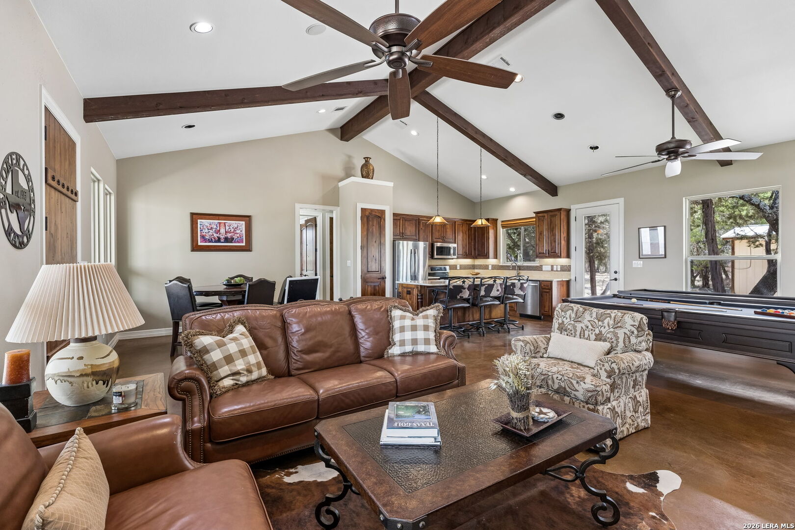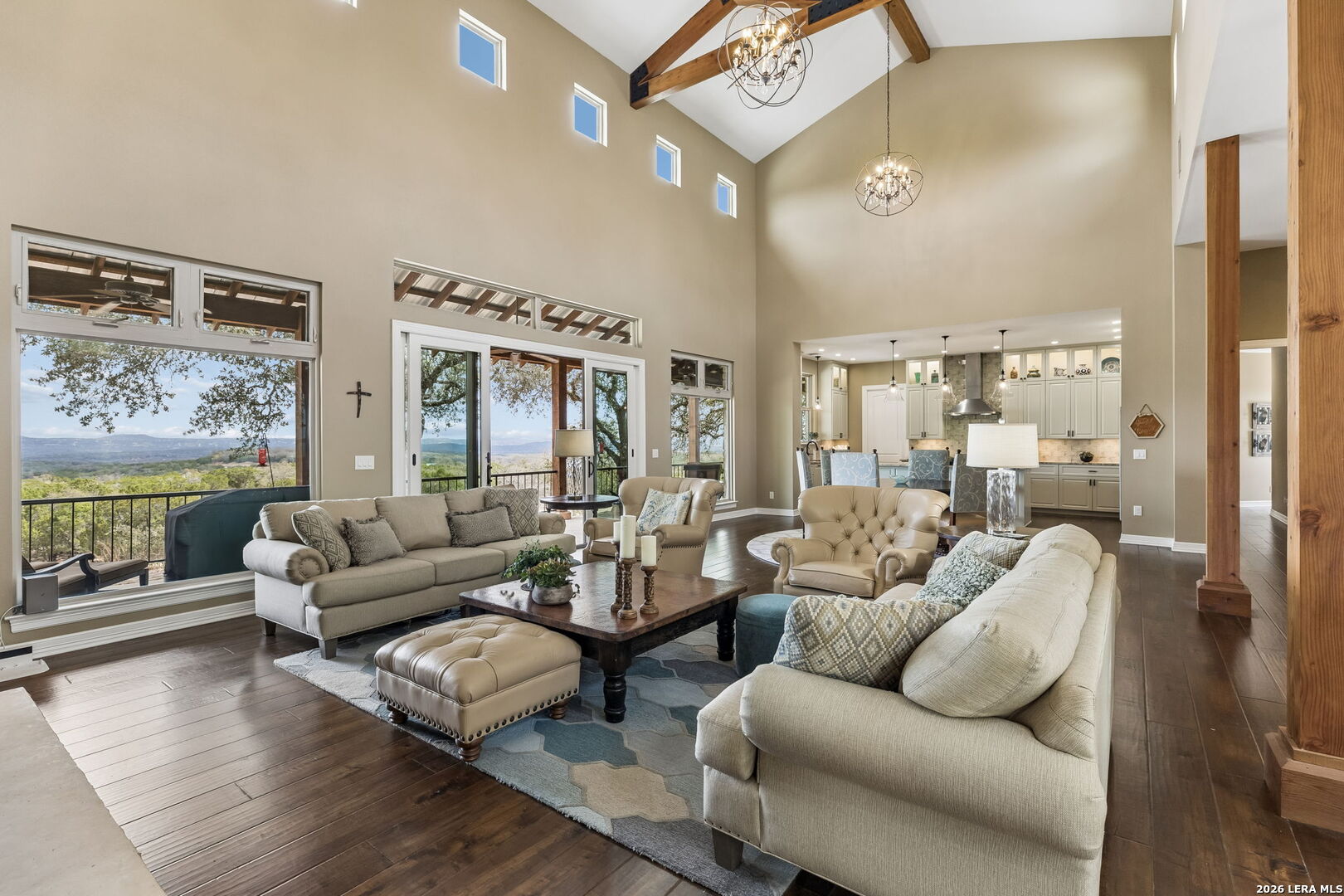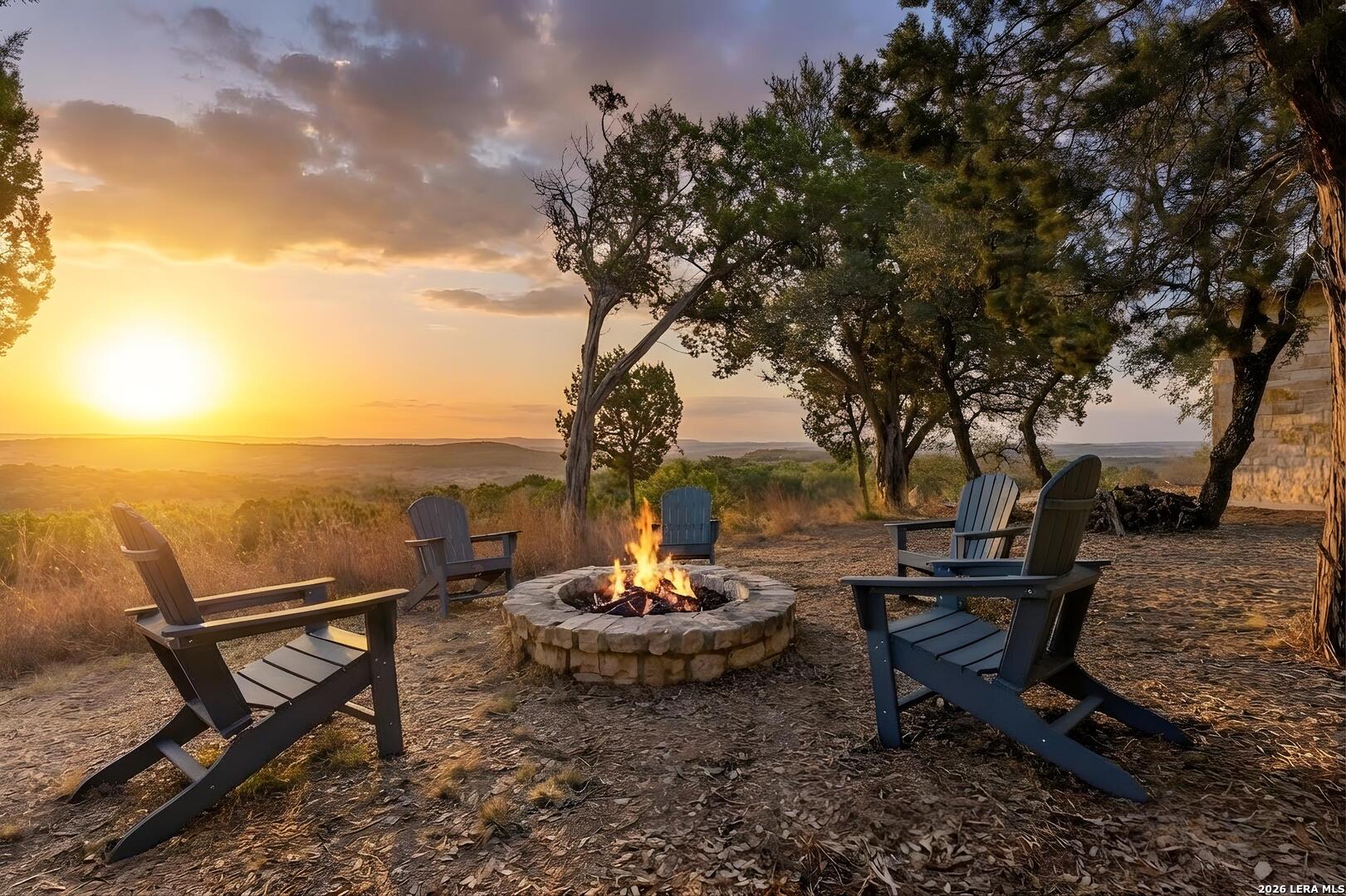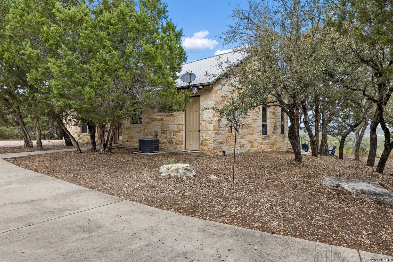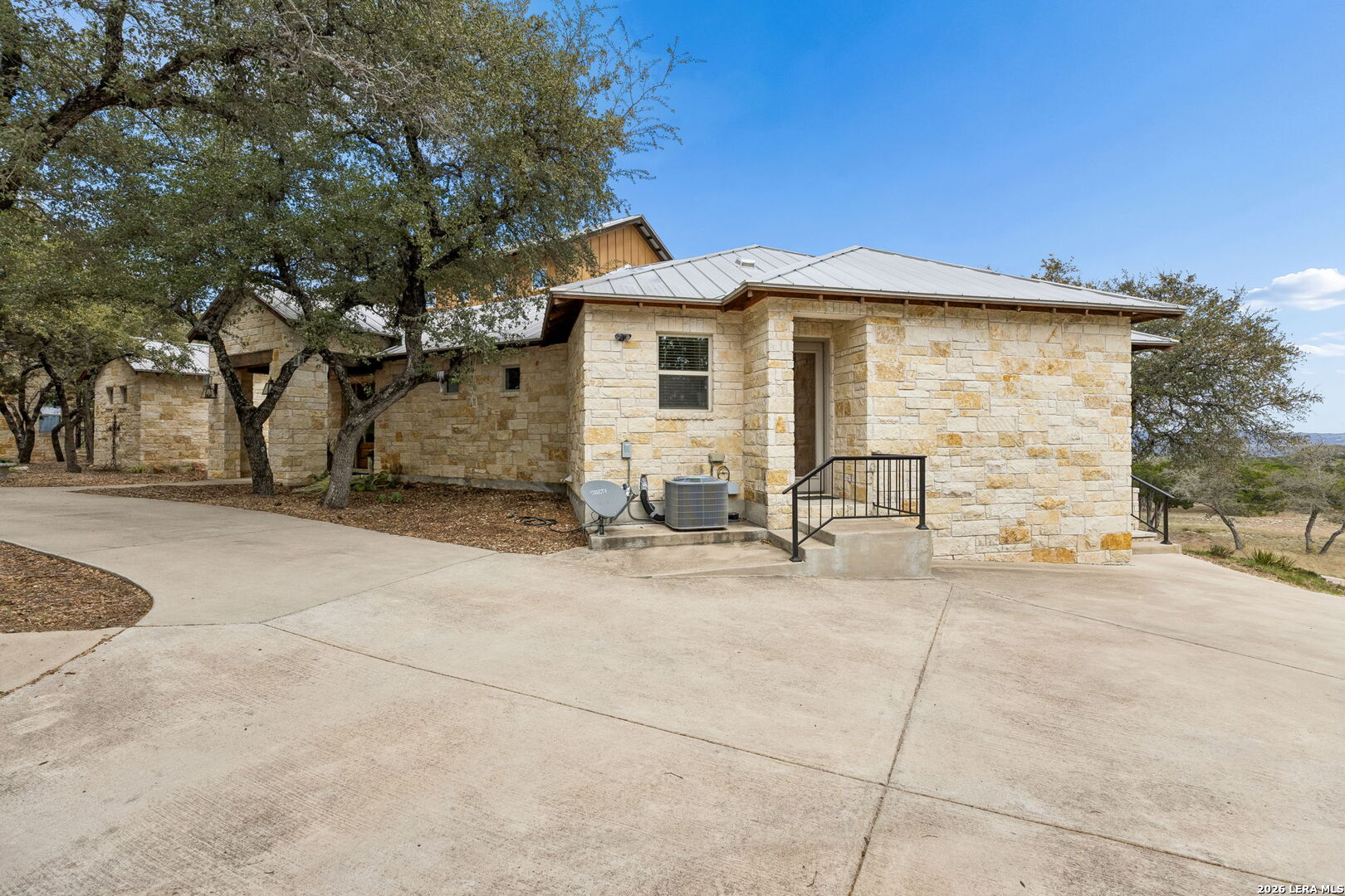 Tucked behind a private gated entrance and positioned deep within approximately 25.5 acres of rolling Hill Country terrain, 5214 Travis Peak Trail offers a rare combination of privacy, breathtaking views, and flexible living with two residences, a main home and guest home (both are 2 beds/2 baths each) on one spectacular property. Perched atop the land, the property captures sweeping panoramic vistas that stretch for miles, delivering unforgettable sunrise and sunset views. The main residence, built by respected custom builder Riata Builders, features timeless Hill Country architecture with a full stone exterior and metal roof designed for durability and character. Inside, the home opens to a dramatic living room highlighted by soaring 24-foot wood beam ceilings, rich engineered wood flooring, and a striking wood-burning fireplace with custom carved detailing and wood mantle. Recessed wall niches on each side of the fireplace create architectural interest while oversized windows frame the surrounding landscape. The dining area sits perfectly between the living room and kitchen beneath elegant chandeliers, creating a welcoming gathering space for entertaining. Just beyond, a temperature-controlled wine room with etched wine-themed flooring offers the perfect place to store and showcase your collection. The kitchen is designed for both function and entertaining, featuring granite countertops, a large granite island with electrical outlets, GE Monogram appliances, recessed lighting, under-cabinet lighting, pull-out storage systems, built-in refrigerator, double-door oven, dishwasher, and ice maker. A spacious walk-in pantry with a secondary refrigerator provides additional storage and convenience. The primary suite offers privacy and direct patio access with beautiful Hill Country views. The primary bathroom includes a large soaking tub, walk-in shower, dual sinks, unique tile work, and a spacious walk-in closet complete with built-in shelving, dressers, and shoe storage. A secondary bedroom with walk-in closet and beautifully tiled bathroom is located just down a short hallway. Outdoor living is a highlight of the property with a full-length covered porch featuring wood beam ceilings and ceiling fans, plus a nearby fire pit gathering area perfect for enjoying quiet Hill Country evenings. Beyond the main home sits a fully independent guest residence, also built by Riata Builders, transforming the property into a true compound. The guest house includes a spacious living and entertainment area with concrete floors, pool table, shuffleboard, and surround sound. The kitchen features a granite island with electrical outlet, dining area, pantry, dishwasher, refrigerator, ice maker, and recessed lighting. Two bedrooms are located in the guest house, including a primary-sized bedroom with walk-in closet and private bath with copper sink and shower. A second bedroom with walk-in closet is served by a hall bath with walk-in shower. A stackable washer and dryer provide added convenience. Additional property features include a private well, septic system, hot water recirculation system in the main home (excluding kitchen), gated entrance, private driveway, two-car garage, and expansive outdoor entertaining spaces. Located on a private road within Broken Creek, residents enjoy access to a private boat ramp just down Travis Peak, as well as close proximity to Flat Creek Winery & Restaurant and LCRA's Gloster Bend Park with Lake Travis access. With two residences, incredible views, and 25.5 unrestricted acres, this property represents a rare opportunity to own a private Hill Country estate where natural beauty, luxury, and lifestyle come together.