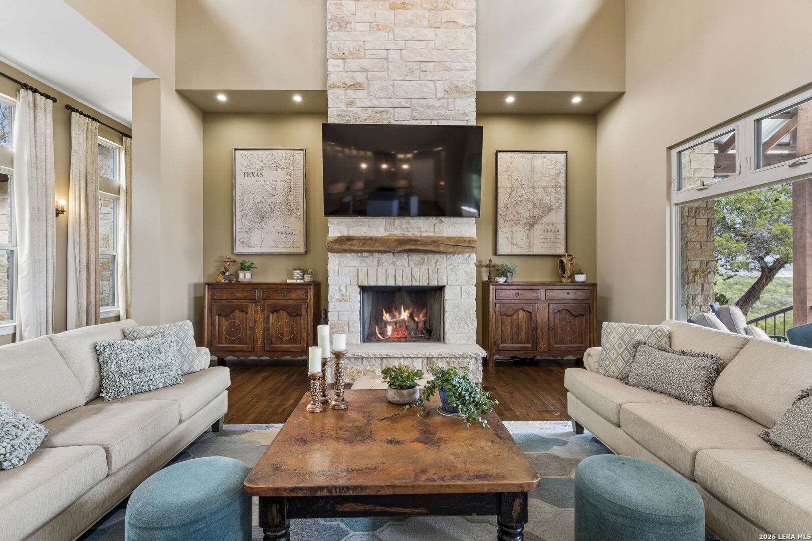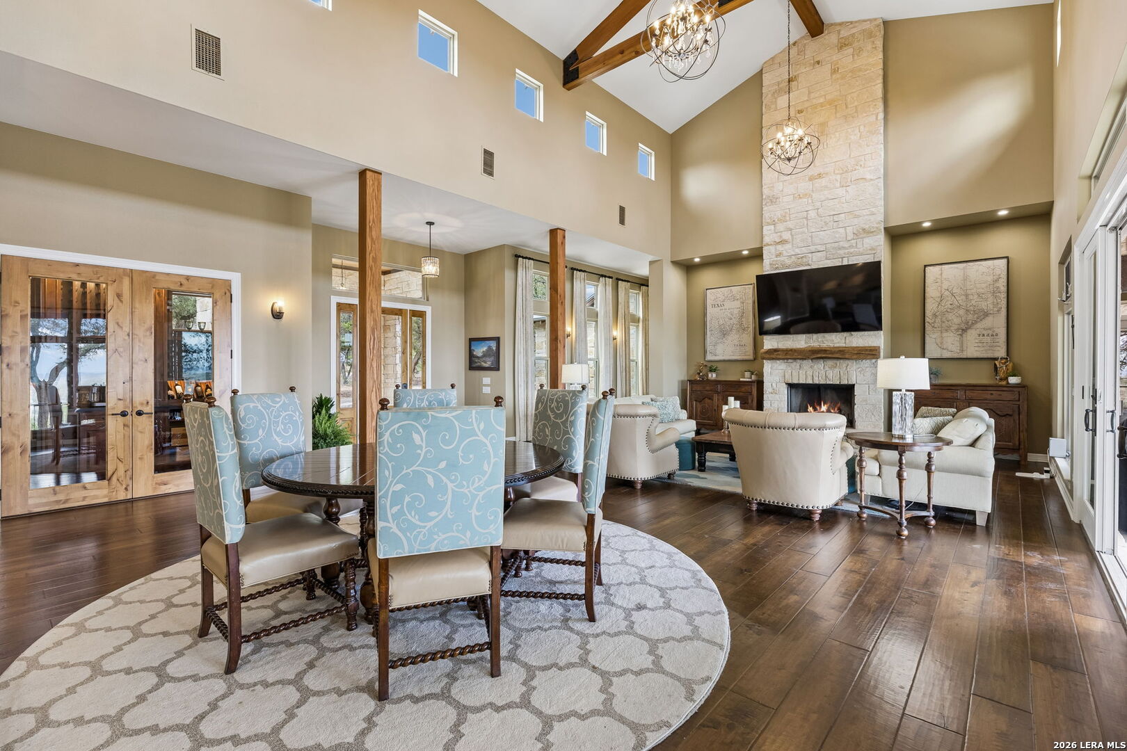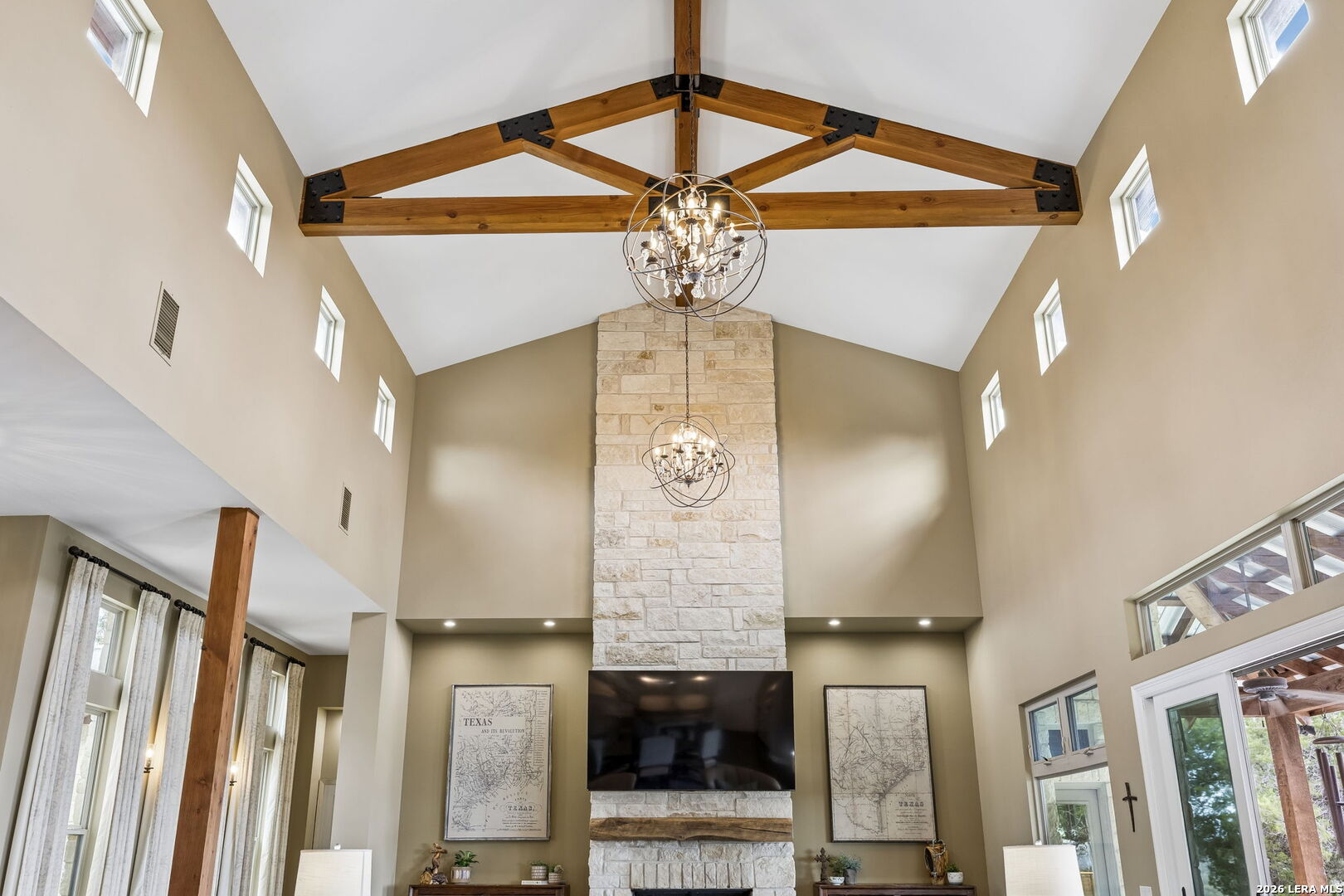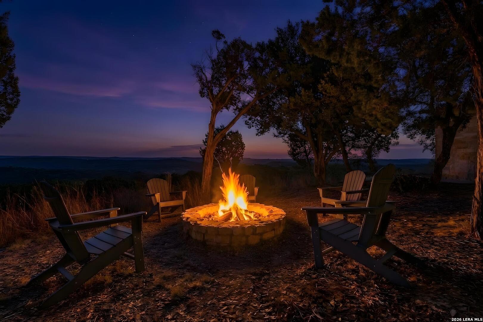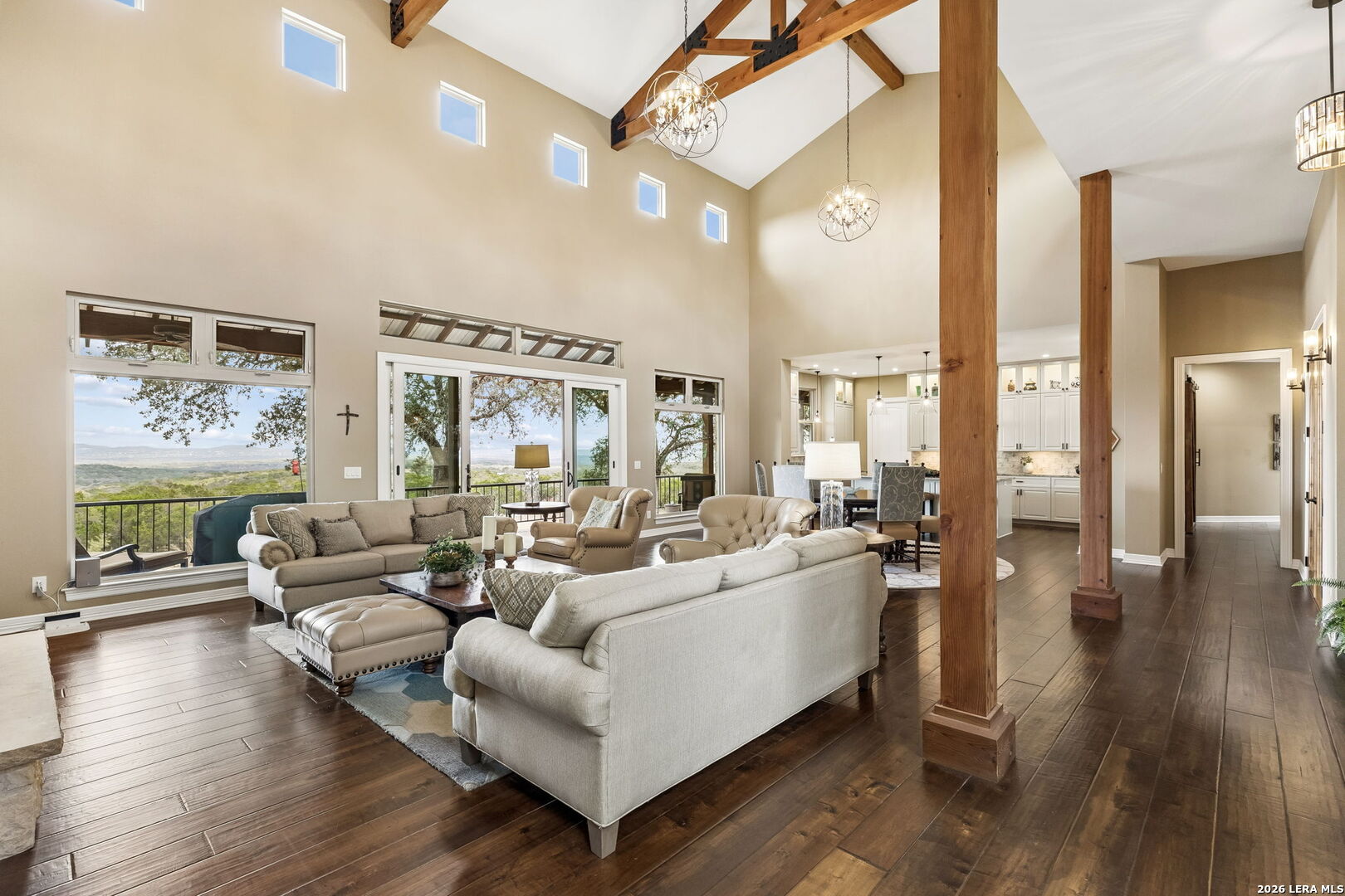 Tucked behind a private gated entrance and positioned deep within approximately 25.5 acres of rolling Hill Country terrain, 5214 Travis Peak Trail offers a rare combination of privacy, breathtaking views, and flexible living with two residences, a main home and guest home (both are 2 beds/2 baths each) on one spectacular property. Perched atop the land, the property captures sweeping panoramic vistas that stretch for miles, delivering unforgettable sunrise and sunset views. The main residence, built by respected custom builder Riata Builders, features timeless Hill Country architecture with a full stone exterior and metal roof designed for durability and character. Inside, the home opens to a dramatic living room highlighted by soaring 24-foot wood beam ceilings, rich engineered wood flooring, and a striking wood-burning fireplace with custom carved detailing and wood mantle. Recessed wall niches on each side of the fireplace create architectural interest while oversized windows frame the surrounding landscape. The dining area sits perfectly between the living room and kitchen beneath elegant chandeliers, creating a welcoming gathering space for entertaining. Just beyond, a temperature-controlled wine room with etched wine-themed flooring offers the perfect place to store and showcase your collection. The kitchen is designed for both function and entertaining, featuring granite countertops, a large granite island with electrical outlets, GE Monogram appliances, recessed lighting, under-cabinet lighting, pull-out storage systems, built-in refrigerator, double-door oven, dishwasher, and ice maker. A spacious walk-in pantry with a secondary refrigerator provides additional storage and convenience. The primary suite offers privacy and direct patio access with beautiful Hill Country views. The primary bathroom includes a large soaking tub, walk-in shower, dual sinks, unique tile work, and a spacious walk-in closet complete with built-in shelving, dressers, and shoe storage. A secondary bedroom with walk-in closet and beautifully tiled bathroom is located just down a short hallway. Outdoor living is a highlight of the property with a full-length covered porch featuring wood beam ceilings and ceiling fans, plus a nearby fire pit gathering area perfect for enjoying quiet Hill Country evenings. Beyond the main home sits a fully independent guest residence, also built by Riata Builders, transforming the property into a true compound. The guest house includes a spacious living and entertainment area with concrete floors, pool table, shuffleboard, and surround sound. The kitchen features a granite island with electrical outlet, dining area, pantry, dishwasher, refrigerator, ice maker, and recessed lighting. Two bedrooms are located in the guest house, including a primary-sized bedroom with walk-in closet and private bath with copper sink and shower. A second bedroom with walk-in closet is served by a hall bath with walk-in shower. A stackable washer and dryer provide added convenience. Additional property features include a private well, septic system, hot water recirculation system in the main home (excluding kitchen), gated entrance, private driveway, two-car garage, and expansive outdoor entertaining spaces. Located on a private road within Broken Creek, residents enjoy access to a private boat ramp just down Travis Peak, as well as close proximity to Flat Creek Winery & Restaurant and LCRA's Gloster Bend Park with Lake Travis access. With two residences, incredible views, and 25.5 unrestricted acres, this property represents a rare opportunity to own a private Hill Country estate where natural beauty, luxury, and lifestyle come together.