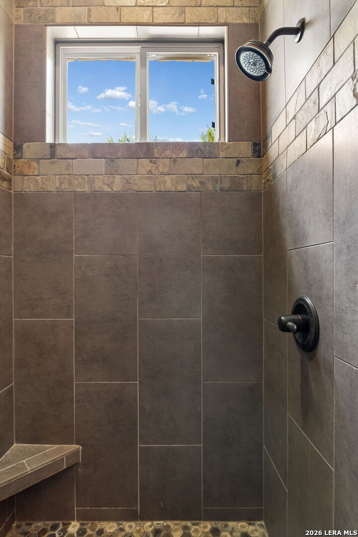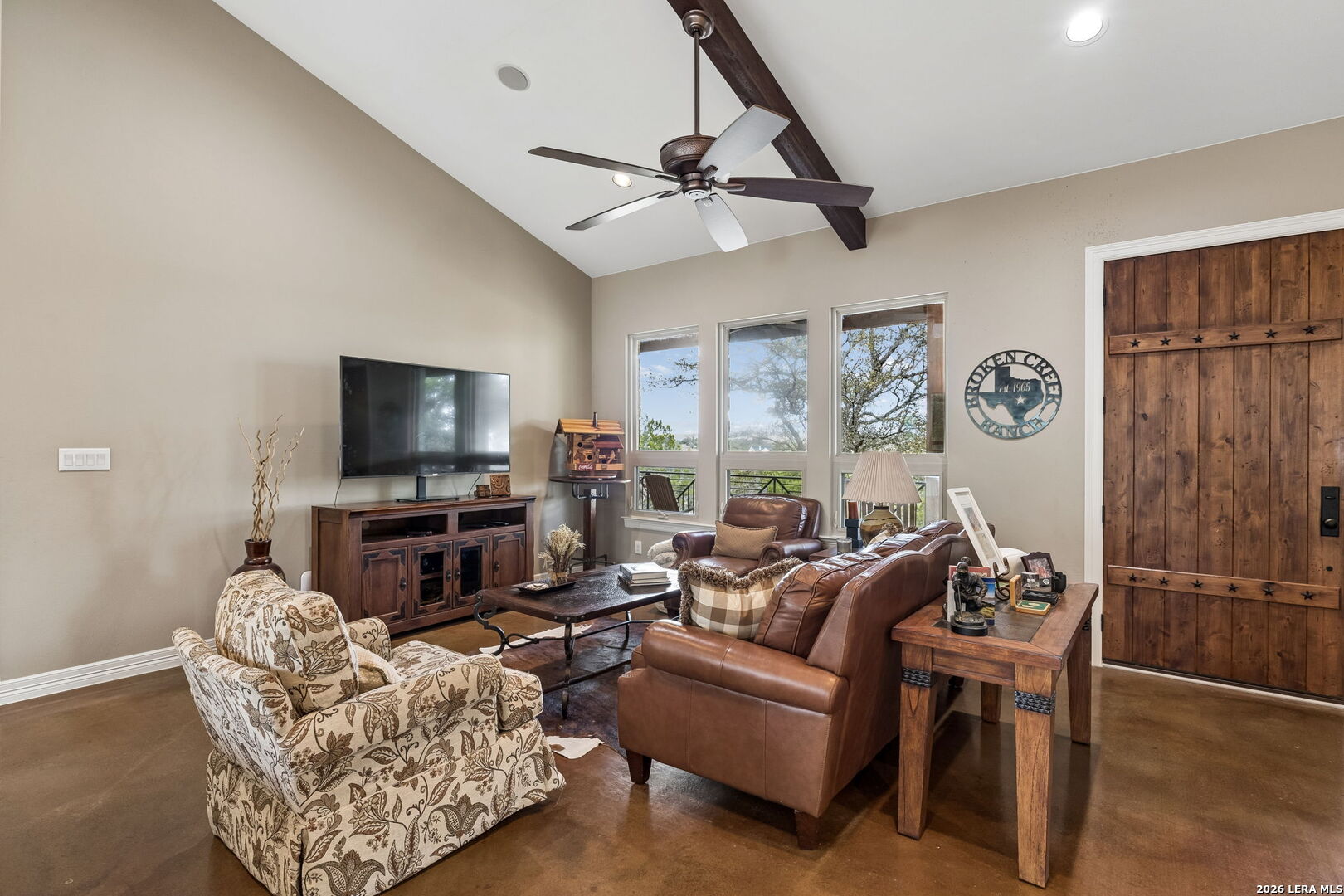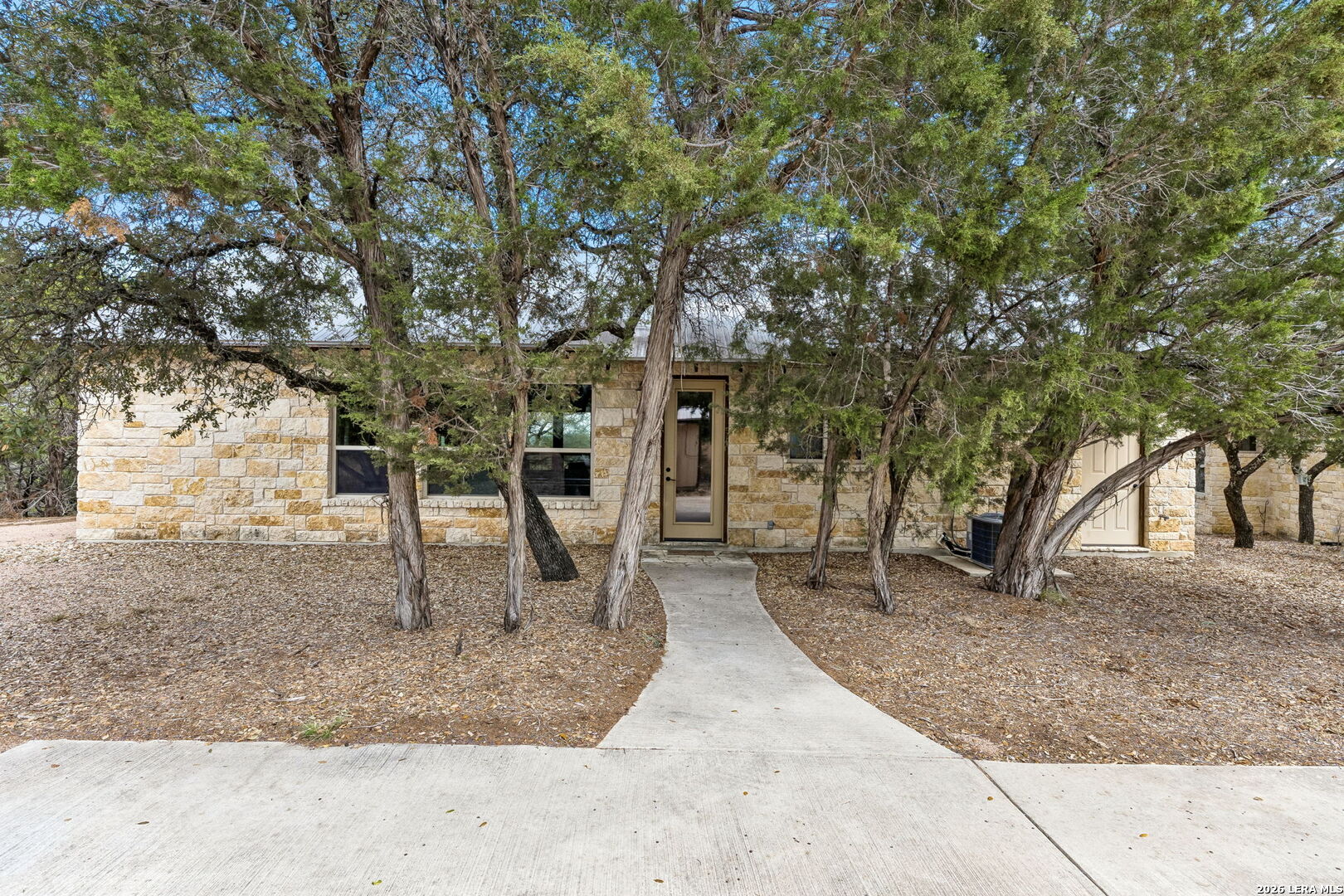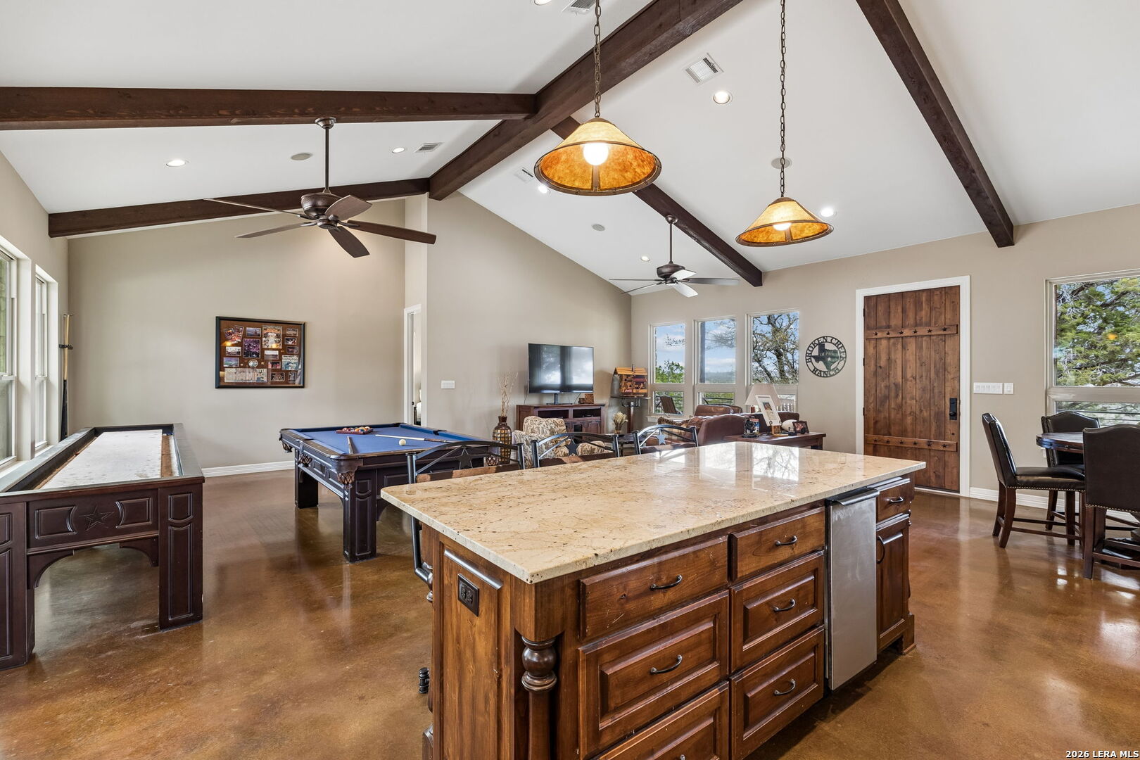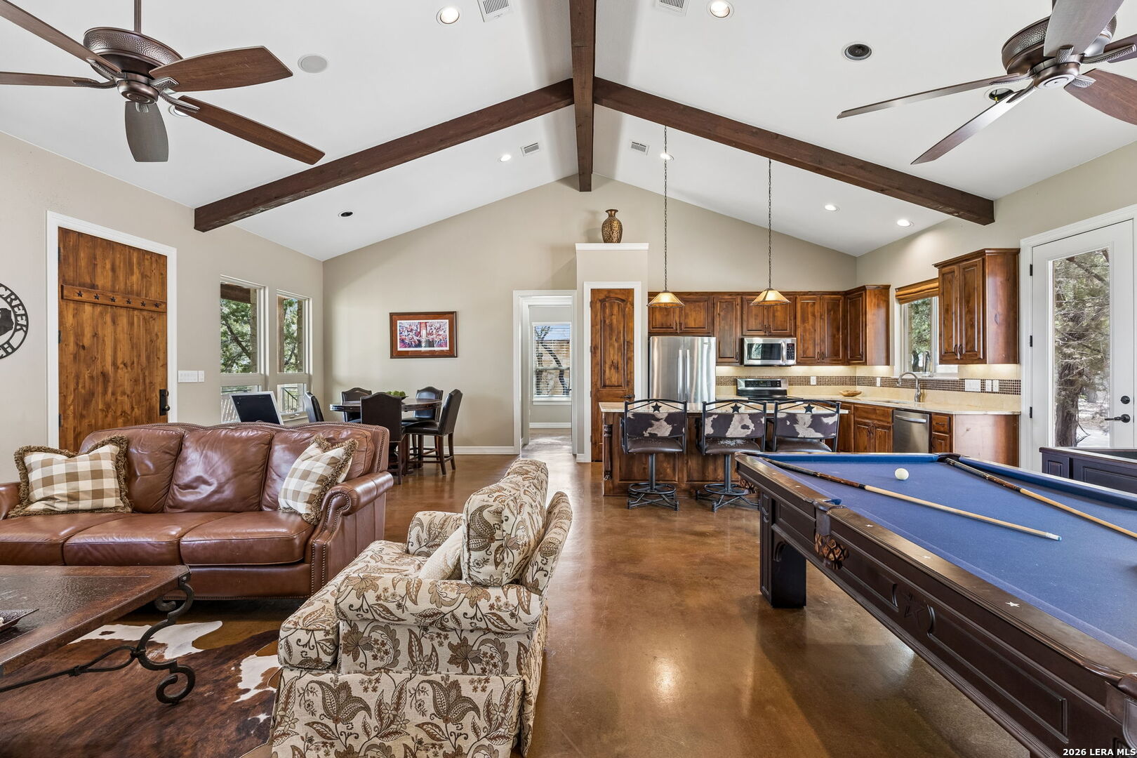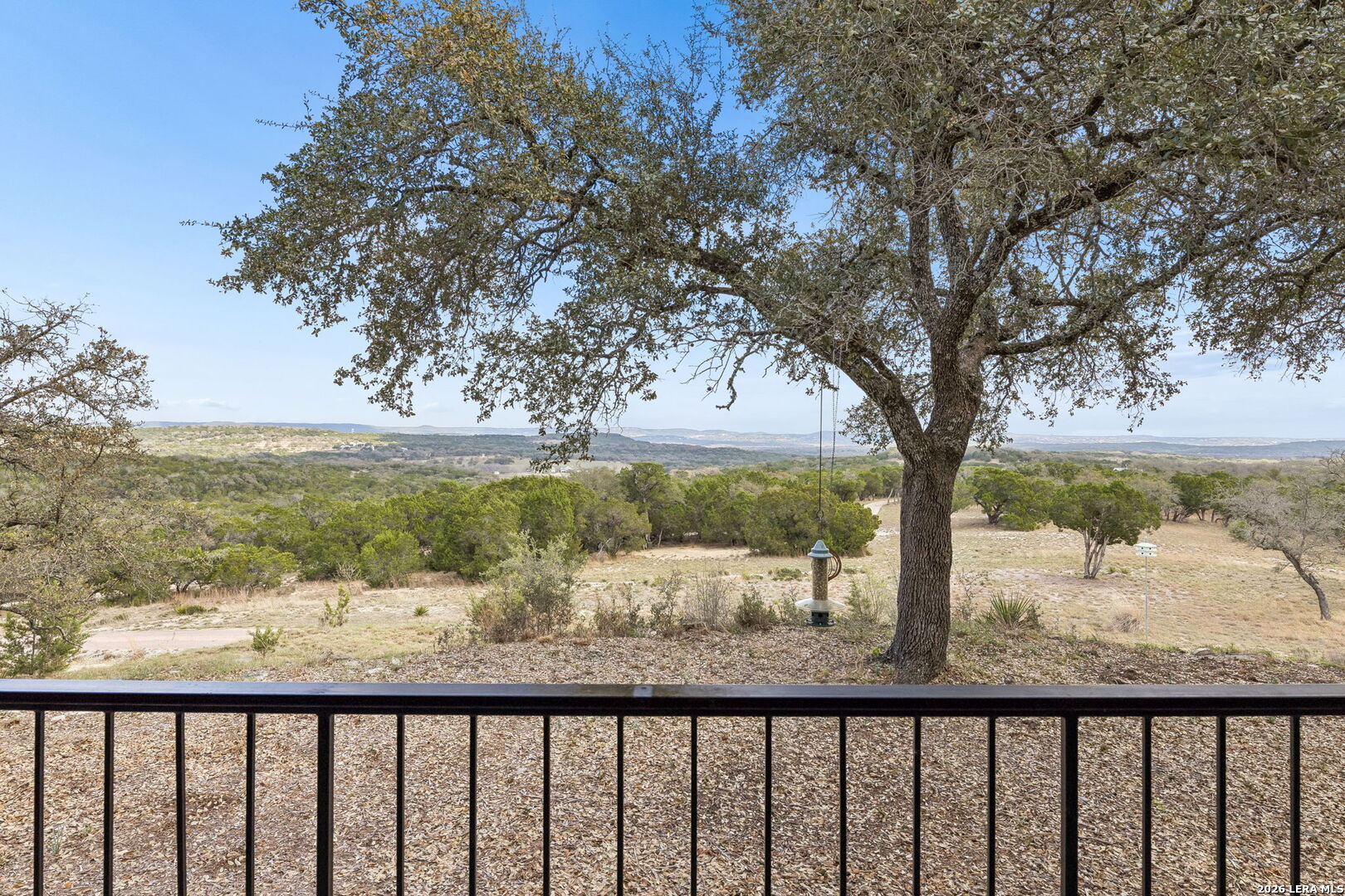 Tucked behind a private gated entrance and positioned deep within approximately 25.5 acres of rolling Hill Country terrain, 5214 Travis Peak Trail offers a rare combination of privacy, breathtaking views, and flexible living with two residences, a main home and guest home (both are 2 beds/2 baths each) on one spectacular property. Perched atop the land, the property captures sweeping panoramic vistas that stretch for miles, delivering unforgettable sunrise and sunset views. The main residence, built by respected custom builder Riata Builders, features timeless Hill Country architecture with a full stone exterior and metal roof designed for durability and character. Inside, the home opens to a dramatic living room highlighted by soaring 24-foot wood beam ceilings, rich engineered wood flooring, and a striking wood-burning fireplace with custom carved detailing and wood mantle. Recessed wall niches on each side of the fireplace create architectural interest while oversized windows frame the surrounding landscape. The dining area sits perfectly between the living room and kitchen beneath elegant chandeliers, creating a welcoming gathering space for entertaining. Just beyond, a temperature-controlled wine room with etched wine-themed flooring offers the perfect place to store and showcase your collection. The kitchen is designed for both function and entertaining, featuring granite countertops, a large granite island with electrical outlets, GE Monogram appliances, recessed lighting, under-cabinet lighting, pull-out storage systems, built-in refrigerator, double-door oven, dishwasher, and ice maker. A spacious walk-in pantry with a secondary refrigerator provides additional storage and convenience. The primary suite offers privacy and direct patio access with beautiful Hill Country views. The primary bathroom includes a large soaking tub, walk-in shower, dual sinks, unique tile work, and a spacious walk-in closet complete with built-in shelving, dressers, and shoe storage. A secondary bedroom with walk-in closet and beautifully tiled bathroom is located just down a short hallway. Outdoor living is a highlight of the property with a full-length covered porch featuring wood beam ceilings and ceiling fans, plus a nearby fire pit gathering area perfect for enjoying quiet Hill Country evenings. Beyond the main home sits a fully independent guest residence, also built by Riata Builders, transforming the property into a true compound. The guest house includes a spacious living and entertainment area with concrete floors, pool table, shuffleboard, and surround sound. The kitchen features a granite island with electrical outlet, dining area, pantry, dishwasher, refrigerator, ice maker, and recessed lighting. Two bedrooms are located in the guest house, including a primary-sized bedroom with walk-in closet and private bath with copper sink and shower. A second bedroom with walk-in closet is served by a hall bath with walk-in shower. A stackable washer and dryer provide added convenience. Additional property features include a private well, septic system, hot water recirculation system in the main home (excluding kitchen), gated entrance, private driveway, two-car garage, and expansive outdoor entertaining spaces. Located on a private road within Broken Creek, residents enjoy access to a private boat ramp just down Travis Peak, as well as close proximity to Flat Creek Winery & Restaurant and LCRA's Gloster Bend Park with Lake Travis access. With two residences, incredible views, and 25.5 unrestricted acres, this property represents a rare opportunity to own a private Hill Country estate where natural beauty, luxury, and lifestyle come together.