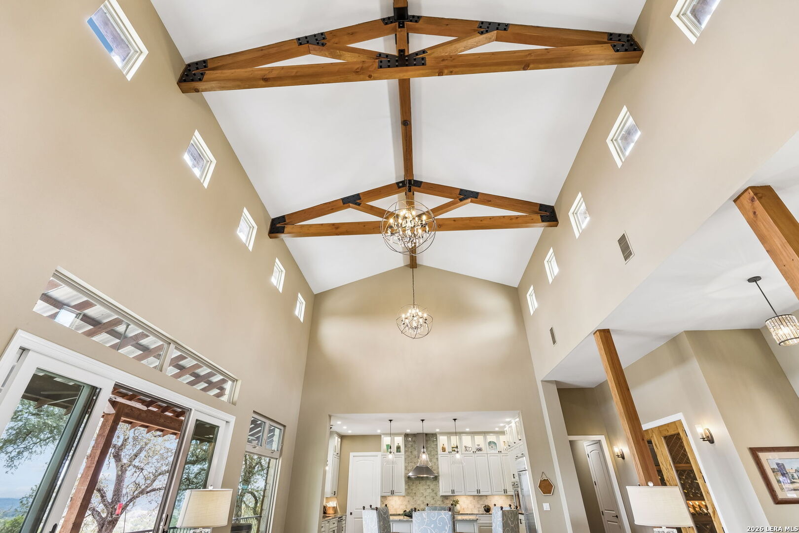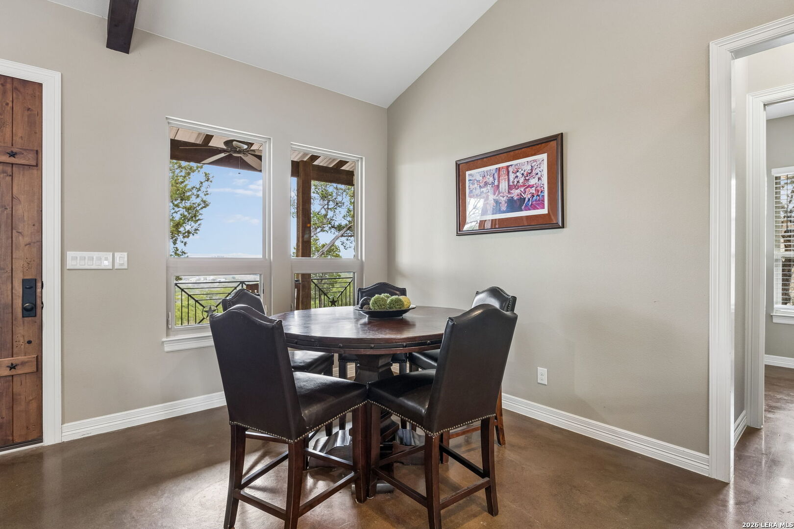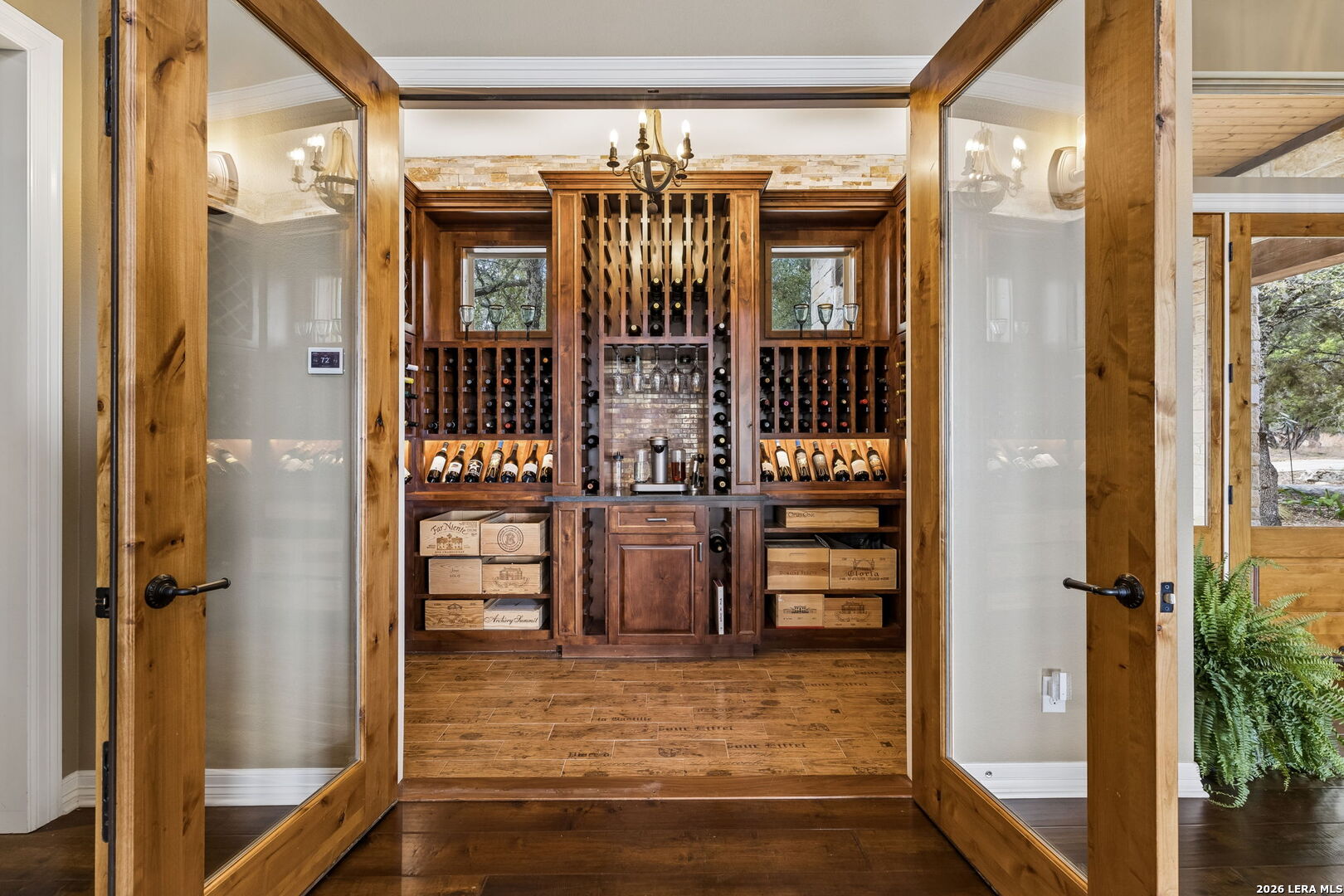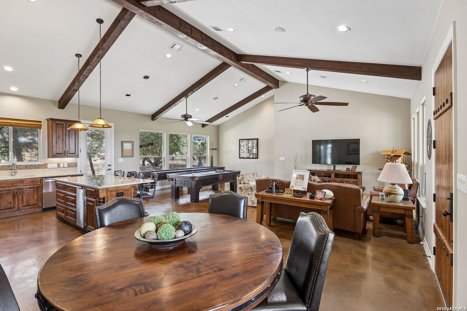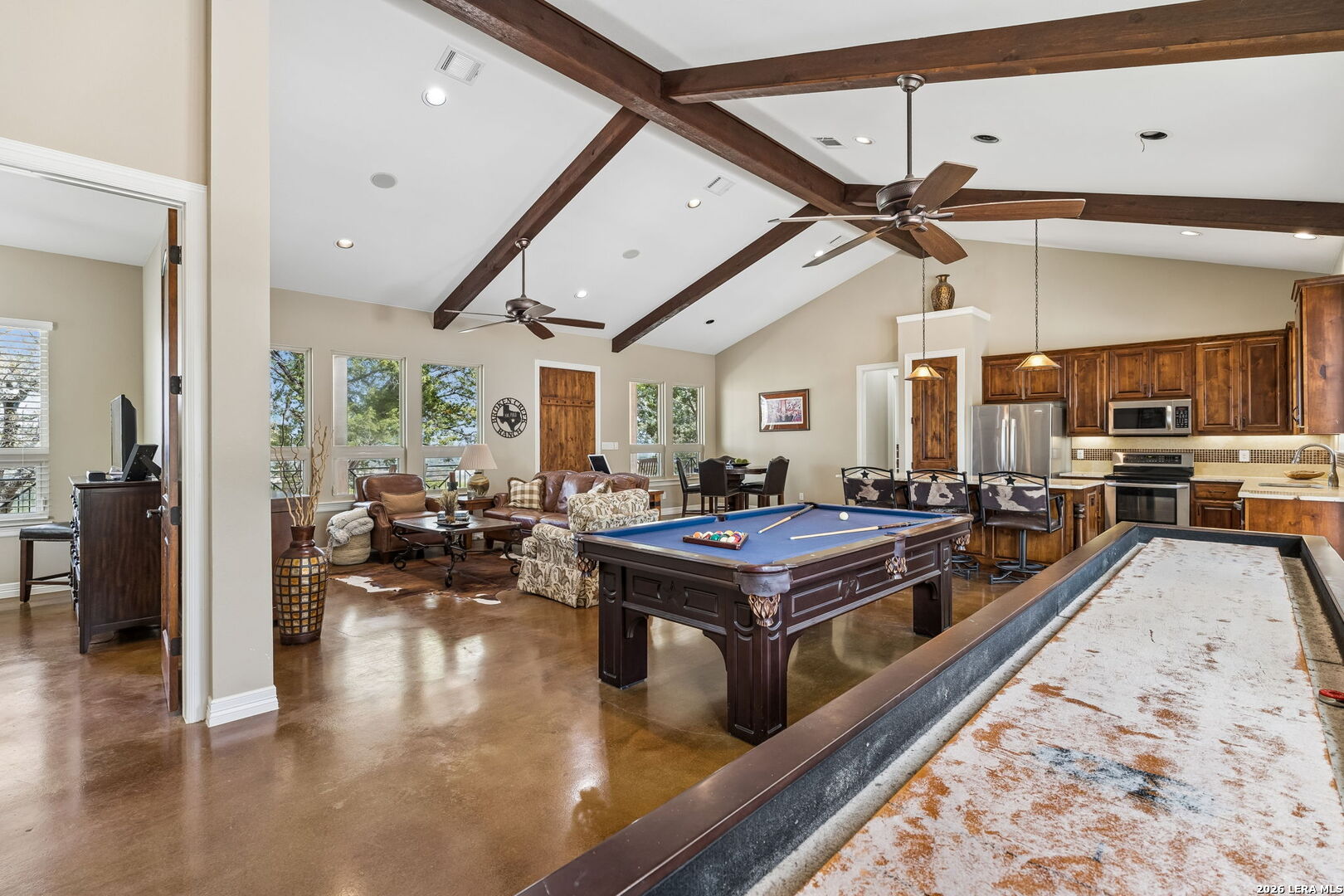 Tucked behind a private gated entrance and positioned deep within approximately 25.5 acres of rolling Hill Country terrain, 5214 Travis Peak Trail offers a rare combination of privacy, breathtaking views, and flexible living with two residences, a main home and guest home (both are 2 beds/2 baths each) on one spectacular property. Perched atop the land, the property captures sweeping panoramic vistas that stretch for miles, delivering unforgettable sunrise and sunset views. The main residence, built by respected custom builder Riata Builders, features timeless Hill Country architecture with a full stone exterior and metal roof designed for durability and character. Inside, the home opens to a dramatic living room highlighted by soaring 24-foot wood beam ceilings, rich engineered wood flooring, and a striking wood-burning fireplace with custom carved detailing and wood mantle. Recessed wall niches on each side of the fireplace create architectural interest while oversized windows frame the surrounding landscape. The dining area sits perfectly between the living room and kitchen beneath elegant chandeliers, creating a welcoming gathering space for entertaining. Just beyond, a temperature-controlled wine room with etched wine-themed flooring offers the perfect place to store and showcase your collection. The kitchen is designed for both function and entertaining, featuring granite countertops, a large granite island with electrical outlets, GE Monogram appliances, recessed lighting, under-cabinet lighting, pull-out storage systems, built-in refrigerator, double-door oven, dishwasher, and ice maker. A spacious walk-in pantry with a secondary refrigerator provides additional storage and convenience. The primary suite offers privacy and direct patio access with beautiful Hill Country views. The primary bathroom includes a large soaking tub, walk-in shower, dual sinks, unique tile work, and a spacious walk-in closet complete with built-in shelving, dressers, and shoe storage. A secondary bedroom with walk-in closet and beautifully tiled bathroom is located just down a short hallway. Outdoor living is a highlight of the property with a full-length covered porch featuring wood beam ceilings and ceiling fans, plus a nearby fire pit gathering area perfect for enjoying quiet Hill Country evenings. Beyond the main home sits a fully independent guest residence, also built by Riata Builders, transforming the property into a true compound. The guest house includes a spacious living and entertainment area with concrete floors, pool table, shuffleboard, and surround sound. The kitchen features a granite island with electrical outlet, dining area, pantry, dishwasher, refrigerator, ice maker, and recessed lighting. Two bedrooms are located in the guest house, including a primary-sized bedroom with walk-in closet and private bath with copper sink and shower. A second bedroom with walk-in closet is served by a hall bath with walk-in shower. A stackable washer and dryer provide added convenience. Additional property features include a private well, septic system, hot water recirculation system in the main home (excluding kitchen), gated entrance, private driveway, two-car garage, and expansive outdoor entertaining spaces. Located on a private road within Broken Creek, residents enjoy access to a private boat ramp just down Travis Peak, as well as close proximity to Flat Creek Winery & Restaurant and LCRA's Gloster Bend Park with Lake Travis access. With two residences, incredible views, and 25.5 unrestricted acres, this property represents a rare opportunity to own a private Hill Country estate where natural beauty, luxury, and lifestyle come together.
