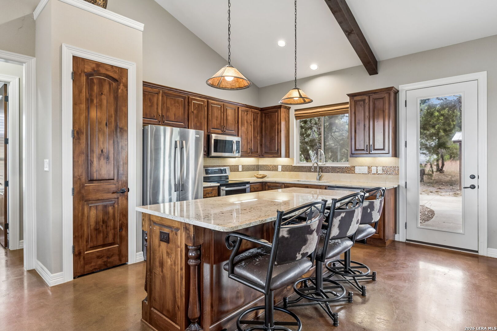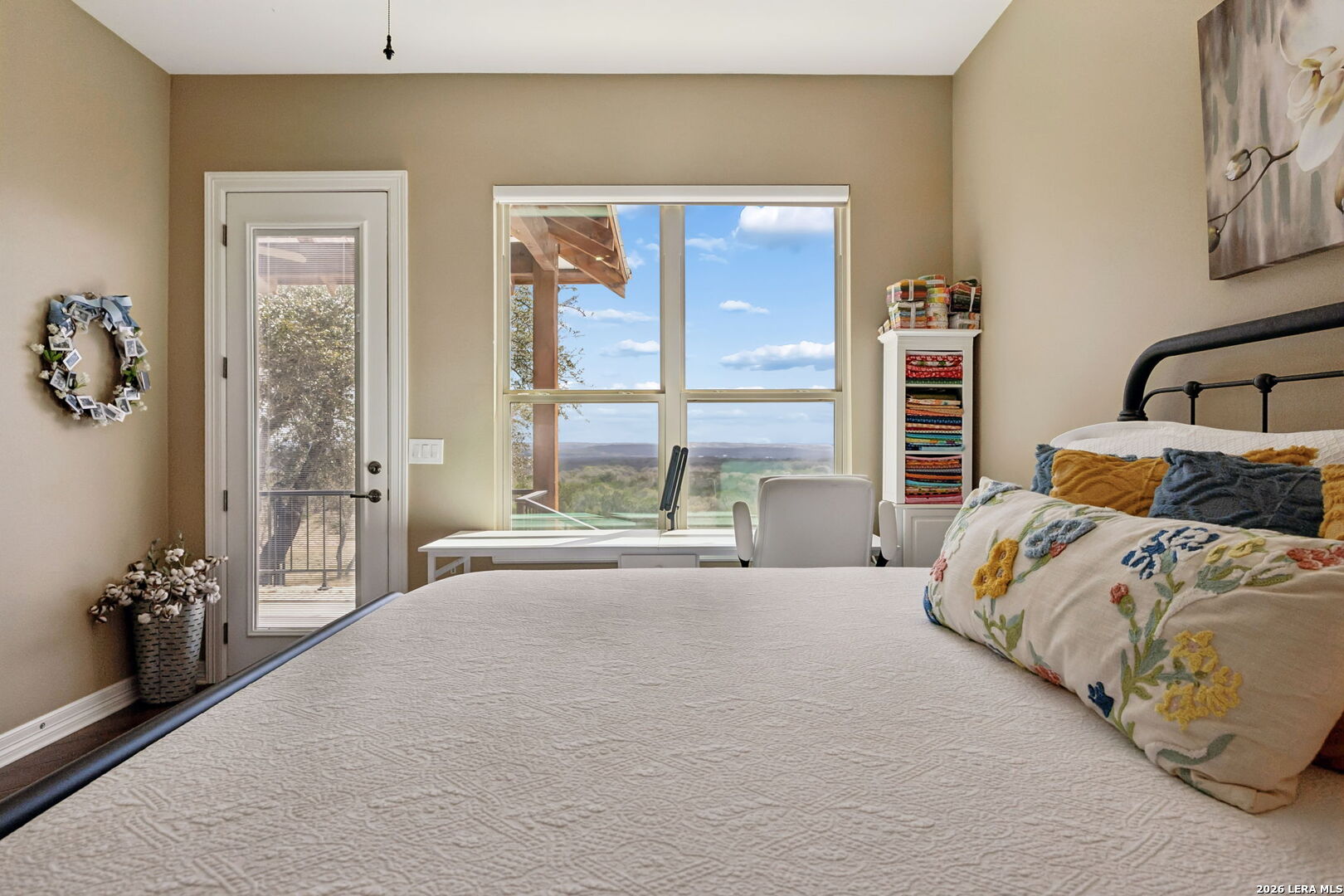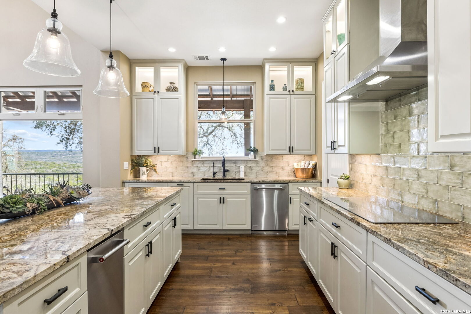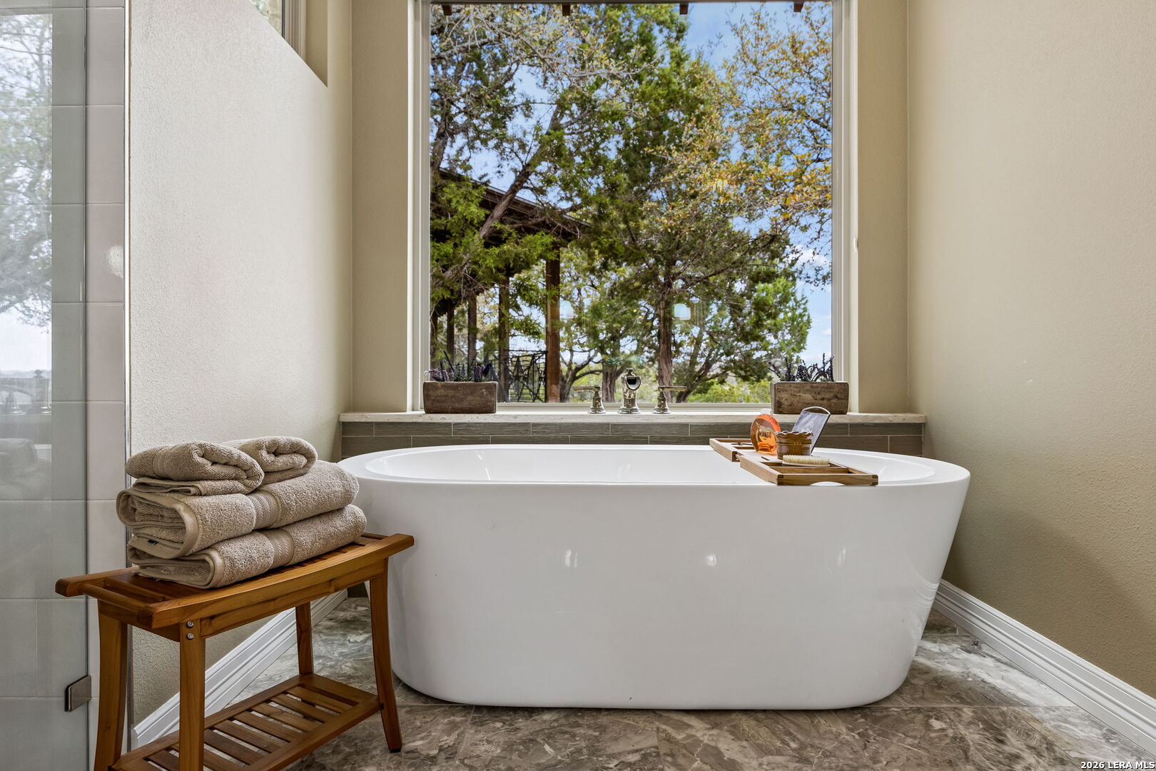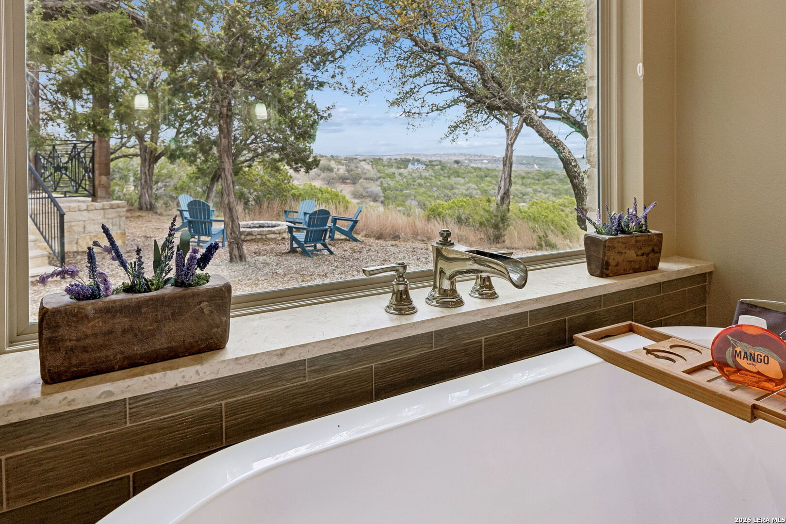 Tucked behind a private gated entrance and positioned deep within approximately 25.5 acres of rolling Hill Country terrain, 5214 Travis Peak Trail offers a rare combination of privacy, breathtaking views, and flexible living with two residences, a main home and guest home (both are 2 beds/2 baths each) on one spectacular property. Perched atop the land, the property captures sweeping panoramic vistas that stretch for miles, delivering unforgettable sunrise and sunset views. The main residence, built by respected custom builder Riata Builders, features timeless Hill Country architecture with a full stone exterior and metal roof designed for durability and character. Inside, the home opens to a dramatic living room highlighted by soaring 24-foot wood beam ceilings, rich engineered wood flooring, and a striking wood-burning fireplace with custom carved detailing and wood mantle. Recessed wall niches on each side of the fireplace create architectural interest while oversized windows frame the surrounding landscape. The dining area sits perfectly between the living room and kitchen beneath elegant chandeliers, creating a welcoming gathering space for entertaining. Just beyond, a temperature-controlled wine room with etched wine-themed flooring offers the perfect place to store and showcase your collection. The kitchen is designed for both function and entertaining, featuring granite countertops, a large granite island with electrical outlets, GE Monogram appliances, recessed lighting, under-cabinet lighting, pull-out storage systems, built-in refrigerator, double-door oven, dishwasher, and ice maker. A spacious walk-in pantry with a secondary refrigerator provides additional storage and convenience. The primary suite offers privacy and direct patio access with beautiful Hill Country views. The primary bathroom includes a large soaking tub, walk-in shower, dual sinks, unique tile work, and a spacious walk-in closet complete with built-in shelving, dressers, and shoe storage. A secondary bedroom with walk-in closet and beautifully tiled bathroom is located just down a short hallway. Outdoor living is a highlight of the property with a full-length covered porch featuring wood beam ceilings and ceiling fans, plus a nearby fire pit gathering area perfect for enjoying quiet Hill Country evenings. Beyond the main home sits a fully independent guest residence, also built by Riata Builders, transforming the property into a true compound. The guest house includes a spacious living and entertainment area with concrete floors, pool table, shuffleboard, and surround sound. The kitchen features a granite island with electrical outlet, dining area, pantry, dishwasher, refrigerator, ice maker, and recessed lighting. Two bedrooms are located in the guest house, including a primary-sized bedroom with walk-in closet and private bath with copper sink and shower. A second bedroom with walk-in closet is served by a hall bath with walk-in shower. A stackable washer and dryer provide added convenience. Additional property features include a private well, septic system, hot water recirculation system in the main home (excluding kitchen), gated entrance, private driveway, two-car garage, and expansive outdoor entertaining spaces. Located on a private road within Broken Creek, residents enjoy access to a private boat ramp just down Travis Peak, as well as close proximity to Flat Creek Winery & Restaurant and LCRA's Gloster Bend Park with Lake Travis access. With two residences, incredible views, and 25.5 unrestricted acres, this property represents a rare opportunity to own a private Hill Country estate where natural beauty, luxury, and lifestyle come together.