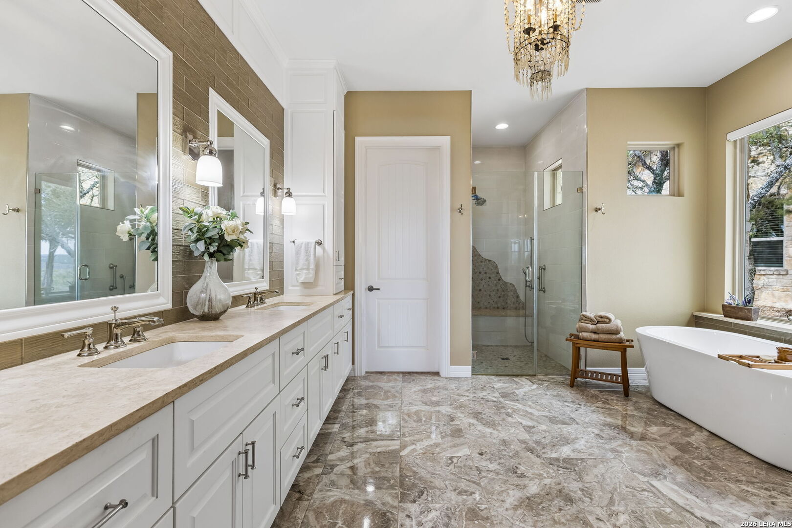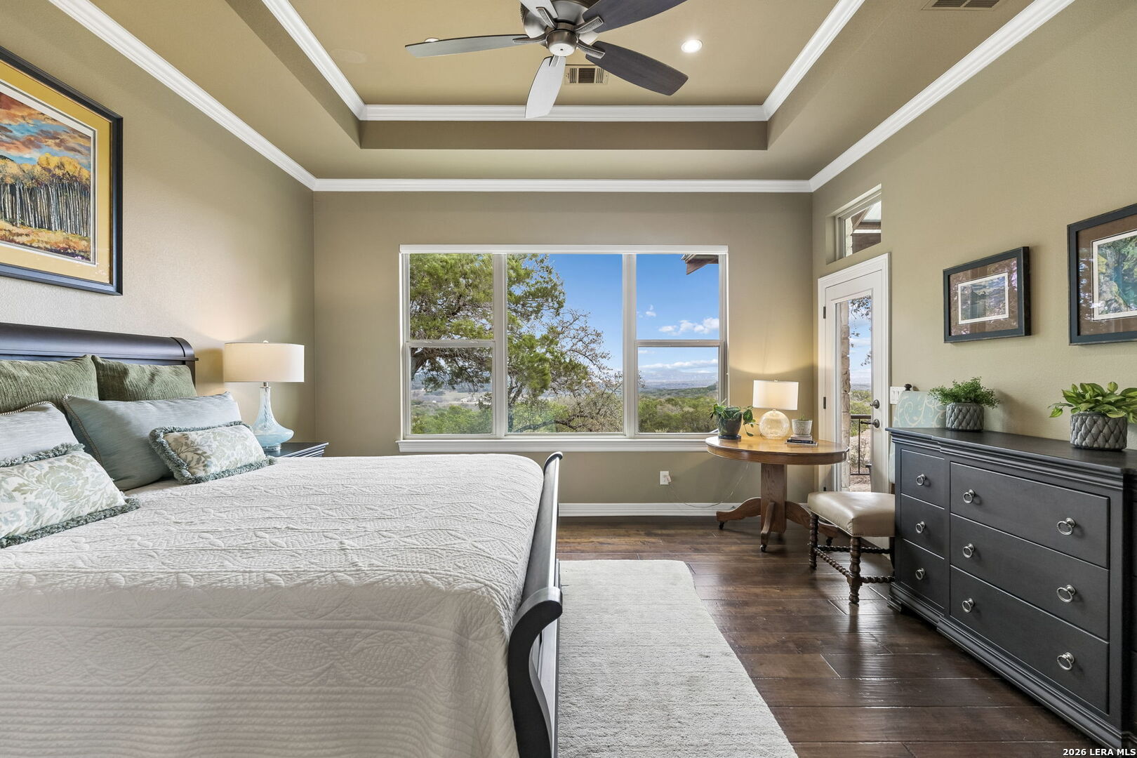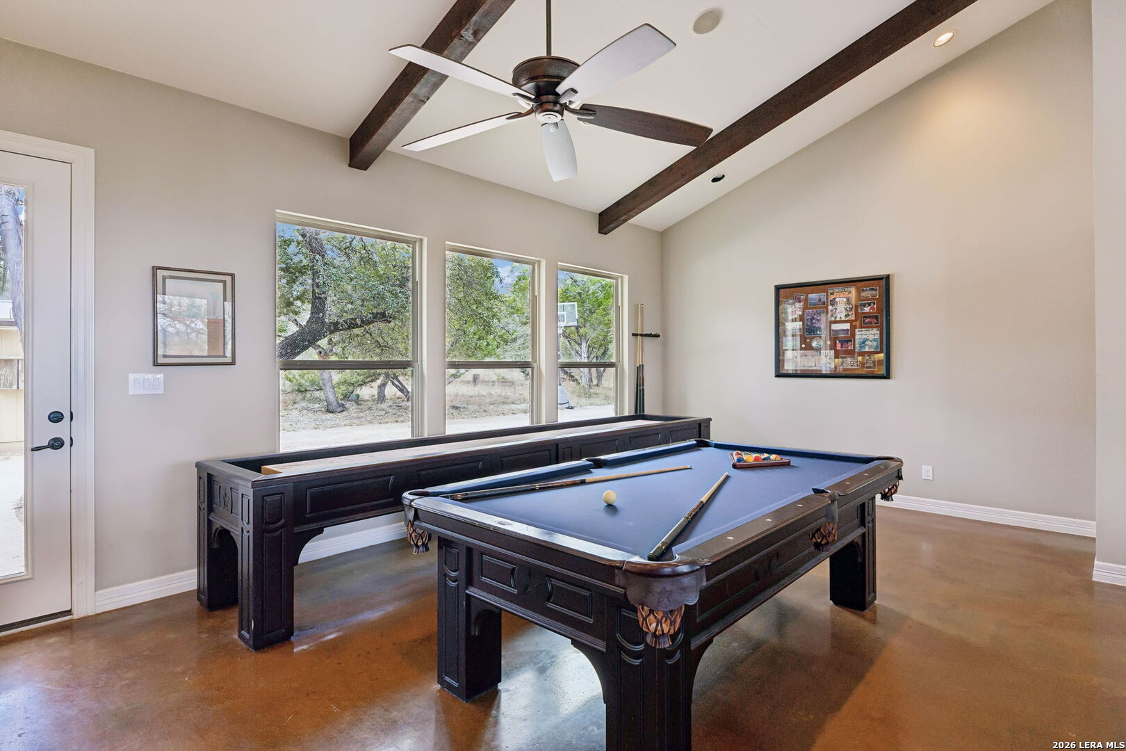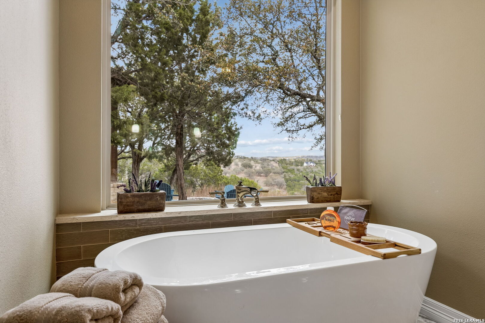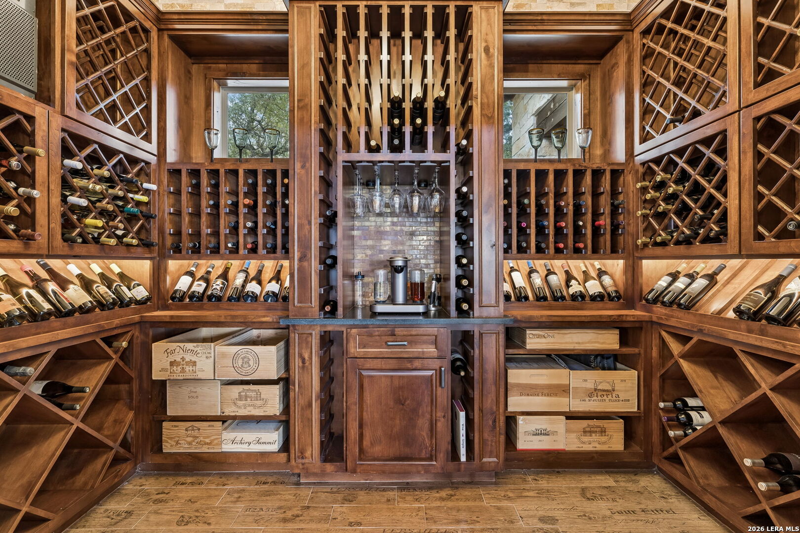 Tucked behind a private gated entrance and positioned deep within approximately 25.5 acres of rolling Hill Country terrain, 5214 Travis Peak Trail offers a rare combination of privacy, breathtaking views, and flexible living with two residences, a main home and guest home (both are 2 beds/2 baths each) on one spectacular property. Perched atop the land, the property captures sweeping panoramic vistas that stretch for miles, delivering unforgettable sunrise and sunset views. The main residence, built by respected custom builder Riata Builders, features timeless Hill Country architecture with a full stone exterior and metal roof designed for durability and character. Inside, the home opens to a dramatic living room highlighted by soaring 24-foot wood beam ceilings, rich engineered wood flooring, and a striking wood-burning fireplace with custom carved detailing and wood mantle. Recessed wall niches on each side of the fireplace create architectural interest while oversized windows frame the surrounding landscape. The dining area sits perfectly between the living room and kitchen beneath elegant chandeliers, creating a welcoming gathering space for entertaining. Just beyond, a temperature-controlled wine room with etched wine-themed flooring offers the perfect place to store and showcase your collection. The kitchen is designed for both function and entertaining, featuring granite countertops, a large granite island with electrical outlets, GE Monogram appliances, recessed lighting, under-cabinet lighting, pull-out storage systems, built-in refrigerator, double-door oven, dishwasher, and ice maker. A spacious walk-in pantry with a secondary refrigerator provides additional storage and convenience. The primary suite offers privacy and direct patio access with beautiful Hill Country views. The primary bathroom includes a large soaking tub, walk-in shower, dual sinks, unique tile work, and a spacious walk-in closet complete with built-in shelving, dressers, and shoe storage. A secondary bedroom with walk-in closet and beautifully tiled bathroom is located just down a short hallway. Outdoor living is a highlight of the property with a full-length covered porch featuring wood beam ceilings and ceiling fans, plus a nearby fire pit gathering area perfect for enjoying quiet Hill Country evenings. Beyond the main home sits a fully independent guest residence, also built by Riata Builders, transforming the property into a true compound. The guest house includes a spacious living and entertainment area with concrete floors, pool table, shuffleboard, and surround sound. The kitchen features a granite island with electrical outlet, dining area, pantry, dishwasher, refrigerator, ice maker, and recessed lighting. Two bedrooms are located in the guest house, including a primary-sized bedroom with walk-in closet and private bath with copper sink and shower. A second bedroom with walk-in closet is served by a hall bath with walk-in shower. A stackable washer and dryer provide added convenience. Additional property features include a private well, septic system, hot water recirculation system in the main home (excluding kitchen), gated entrance, private driveway, two-car garage, and expansive outdoor entertaining spaces. Located on a private road within Broken Creek, residents enjoy access to a private boat ramp just down Travis Peak, as well as close proximity to Flat Creek Winery & Restaurant and LCRA's Gloster Bend Park with Lake Travis access. With two residences, incredible views, and 25.5 unrestricted acres, this property represents a rare opportunity to own a private Hill Country estate where natural beauty, luxury, and lifestyle come together.