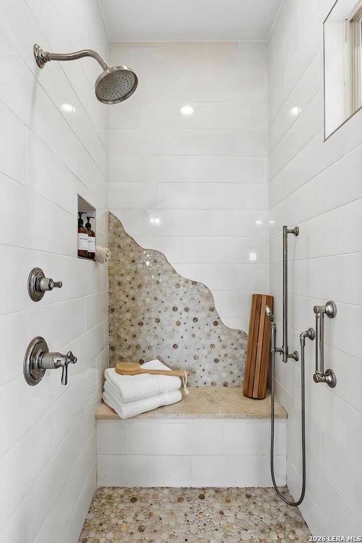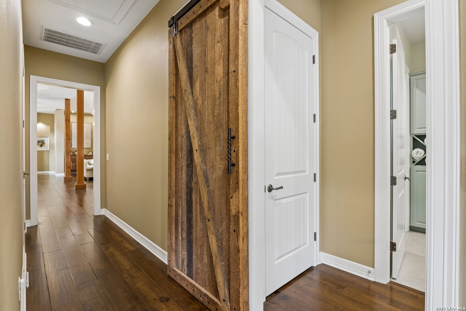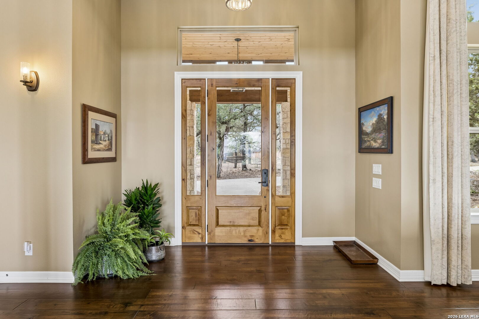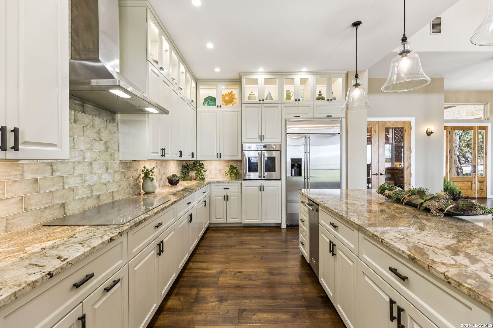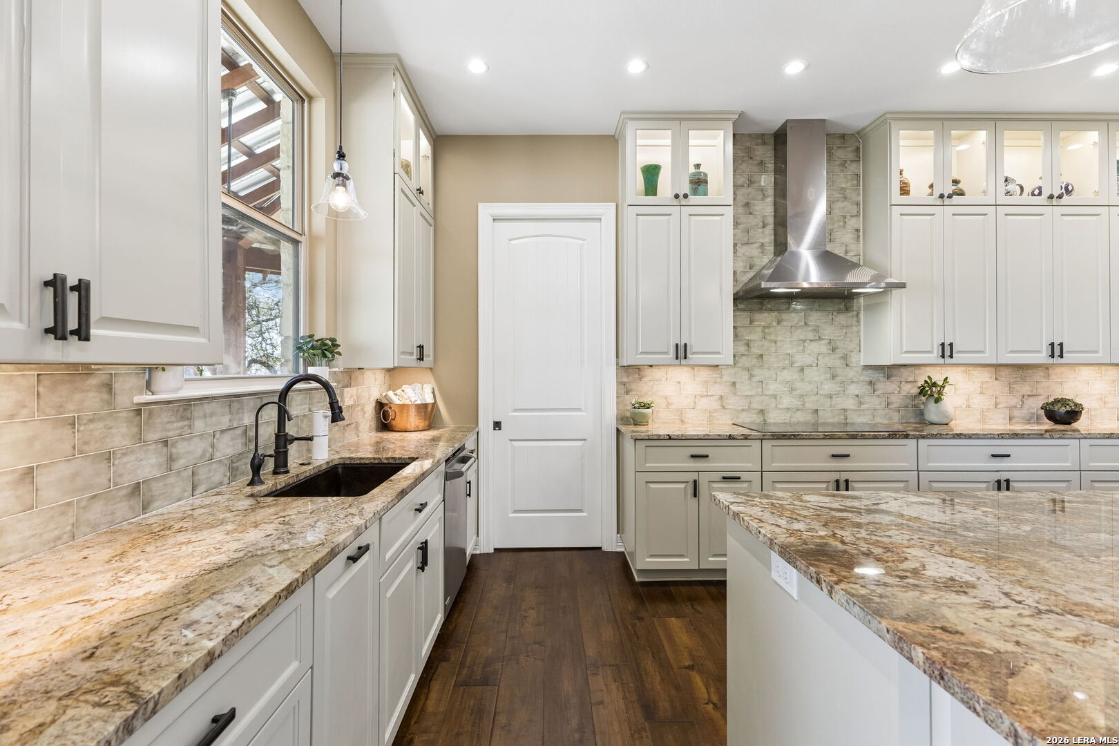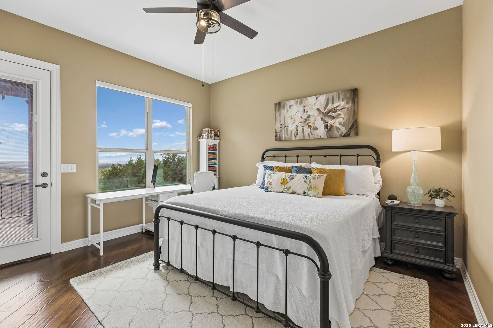 Tucked behind a private gated entrance and positioned deep within approximately 25.5 acres of rolling Hill Country terrain, 5214 Travis Peak Trail offers a rare combination of privacy, breathtaking views, and flexible living with two residences, a main home and guest home (both are 2 beds/2 baths each) on one spectacular property. Perched atop the land, the property captures sweeping panoramic vistas that stretch for miles, delivering unforgettable sunrise and sunset views. The main residence, built by respected custom builder Riata Builders, features timeless Hill Country architecture with a full stone exterior and metal roof designed for durability and character. Inside, the home opens to a dramatic living room highlighted by soaring 24-foot wood beam ceilings, rich engineered wood flooring, and a striking wood-burning fireplace with custom carved detailing and wood mantle. Recessed wall niches on each side of the fireplace create architectural interest while oversized windows frame the surrounding landscape. The dining area sits perfectly between the living room and kitchen beneath elegant chandeliers, creating a welcoming gathering space for entertaining. Just beyond, a temperature-controlled wine room with etched wine-themed flooring offers the perfect place to store and showcase your collection. The kitchen is designed for both function and entertaining, featuring granite countertops, a large granite island with electrical outlets, GE Monogram appliances, recessed lighting, under-cabinet lighting, pull-out storage systems, built-in refrigerator, double-door oven, dishwasher, and ice maker. A spacious walk-in pantry with a secondary refrigerator provides additional storage and convenience. The primary suite offers privacy and direct patio access with beautiful Hill Country views. The primary bathroom includes a large soaking tub, walk-in shower, dual sinks, unique tile work, and a spacious walk-in closet complete with built-in shelving, dressers, and shoe storage. A secondary bedroom with walk-in closet and beautifully tiled bathroom is located just down a short hallway. Outdoor living is a highlight of the property with a full-length covered porch featuring wood beam ceilings and ceiling fans, plus a nearby fire pit gathering area perfect for enjoying quiet Hill Country evenings. Beyond the main home sits a fully independent guest residence, also built by Riata Builders, transforming the property into a true compound. The guest house includes a spacious living and entertainment area with concrete floors, pool table, shuffleboard, and surround sound. The kitchen features a granite island with electrical outlet, dining area, pantry, dishwasher, refrigerator, ice maker, and recessed lighting. Two bedrooms are located in the guest house, including a primary-sized bedroom with walk-in closet and private bath with copper sink and shower. A second bedroom with walk-in closet is served by a hall bath with walk-in shower. A stackable washer and dryer provide added convenience. Additional property features include a private well, septic system, hot water recirculation system in the main home (excluding kitchen), gated entrance, private driveway, two-car garage, and expansive outdoor entertaining spaces. Located on a private road within Broken Creek, residents enjoy access to a private boat ramp just down Travis Peak, as well as close proximity to Flat Creek Winery & Restaurant and LCRA's Gloster Bend Park with Lake Travis access. With two residences, incredible views, and 25.5 unrestricted acres, this property represents a rare opportunity to own a private Hill Country estate where natural beauty, luxury, and lifestyle come together.
