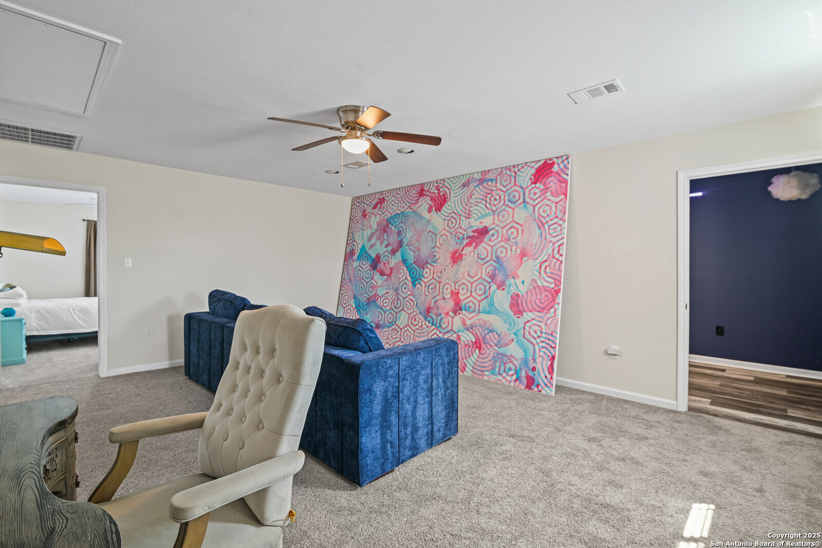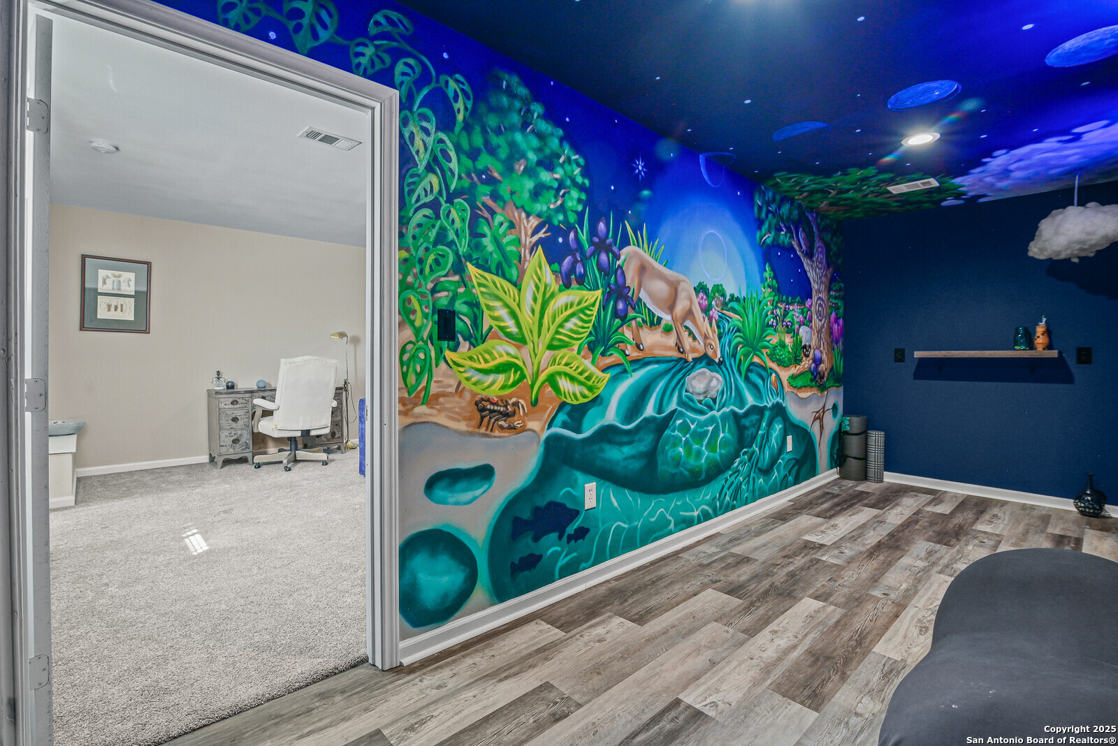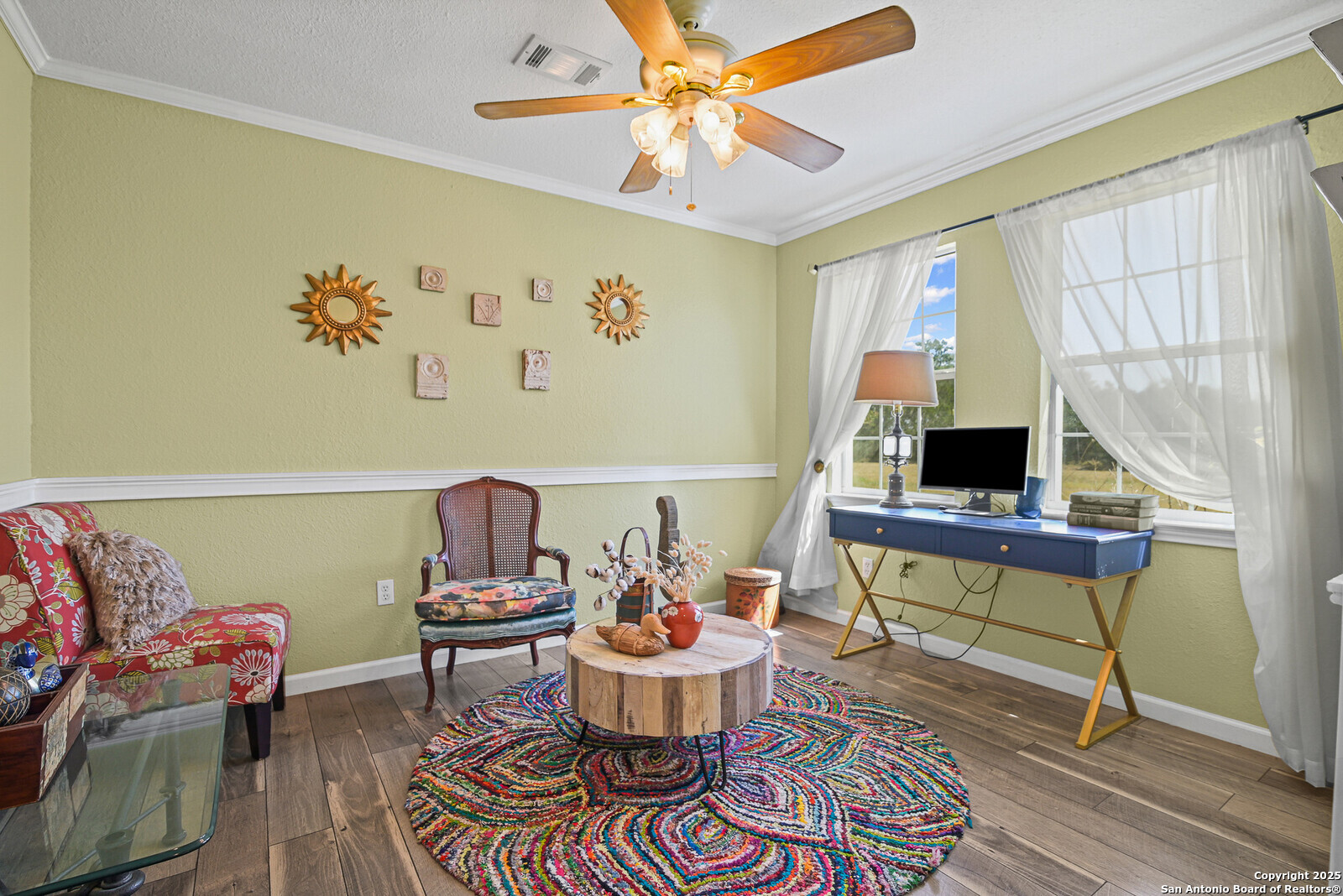Tucked away in the peaceful Texas Hill Country just outside Blanco, this welcoming 5 Acre Texas Country home in Rust Ranches blends comfort, privacy, seclusion, space, and country charm. The owner calls it the "The Sunshine House" and you will see why and it will not be the fact a sunrise mural is painted on the north side of the house either! It's the kind of place that feels good the moment you walk in, bright, open, and full of natural light. The kitchen is thoughtfully designed, ideal for cooking and gathering with family and friends along with a very large oversized gas range to really get that ranch cooking going strong! With two spacious living areas, there's plenty of room to relax, entertain, or simply unwind after a long day. Two of the bedrooms even feature their own cozy sitting areas perfect for reading, working, or just having a little extra space to call your own. Did we mention the owner's retreat has it's own kind of spa like feel with river stone walls surrounding the massage jetted soaking tub and an enormous large walk in shower? You will feel like you're pampered at home and never want to leave! Step outside to enjoy quiet mornings with a cup of coffee on the porch or evenings under the big Texas sky. Heck this property comes boasting a VERY large gameroom upstairs perfect for entertaining while separating the downstairs and upstairs spaces. Oh did we mention, one room is like a little cozy library room with a handpainted country mural on the wall and a full set up black lights behind it to REALLY make it pop? You will have to see this for yourself! Set on a beautiful stretch of land fully set with a 484 sq ft barn along with a 480 sq.ft. separate storage room; this property has SOO many directions you can take this with and really make it your own private country retreat! The gated entry with code and private drive deep into the property keeping the house secluded entirely from the main road is just what anyone wanting ultimate privacy will be attracted to! If you want to make it your own, this home offers the perfect balance of privacy and convenience close to local shops, wineries, and everything the Hill Country has to offer with the town of Blanco only a 8 min drive away.