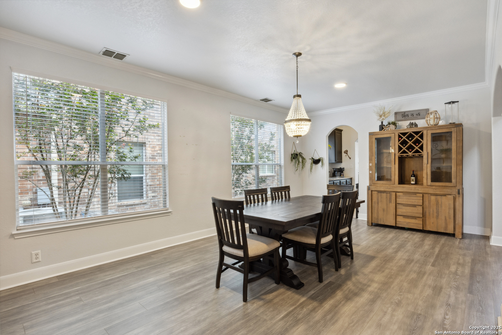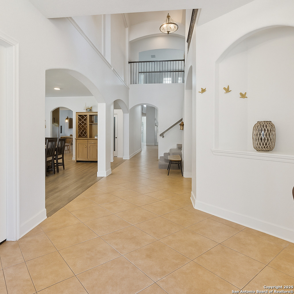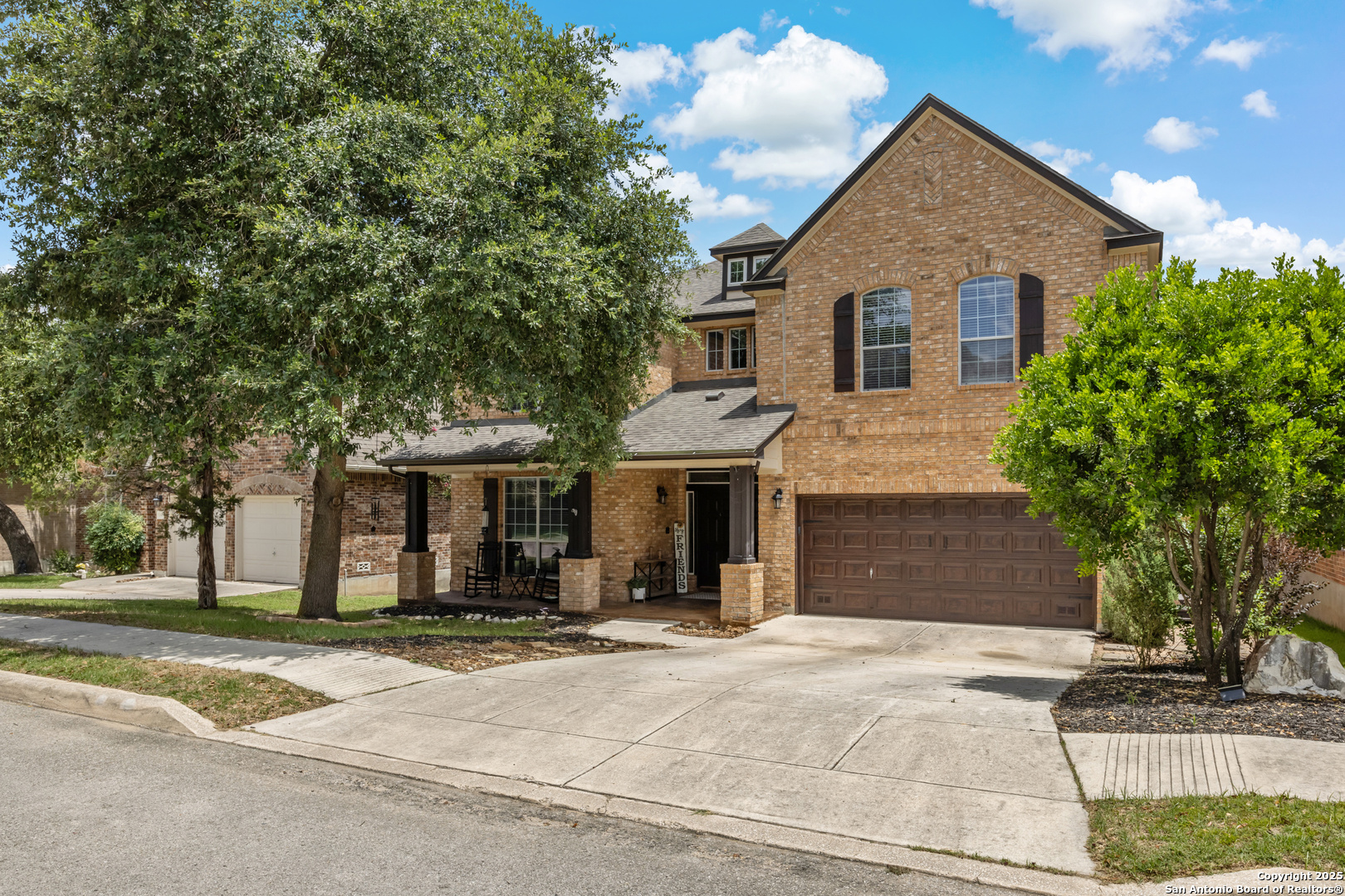 Nestled on a serene greenbelt in the gated community of The Ridge at Canyon Springs, this stunning 4,170 sq ft residence offers a rare combination of elegance, space, and function. With 5 bedrooms, 3.5 baths, and a 3-car tandem garage with custom cabinetry, this two-story brick home impresses from the start with a spacious front porch and double-door entry. Step inside to an expansive foyer flanked by a dedicated home office and formal living and dining rooms, all enhanced with elegant crown molding. The tile flooring throughout the entry, kitchen, and family room ensures durability and style. The family room showcases a Barcelona stone gas fireplace, creating a warm and inviting ambiance. Designed for the culinary enthusiast, the gourmet kitchen features a massive center island, granite countertops, abundant custom cabinetry, and a separate butler's pantry-perfect for entertaining or everyday living. The downstairs primary suite is a retreat of its own, with engineered wood flooring, crown molding, tray ceiling, and a spa-like bath offering dual vanities, a garden tub, and a walk-in shower. Upstairs, you'll find four generously sized bedrooms with two Jack-and-Jill bathrooms, a large game room with a dry bar, and a media room that could serve as a sixth bedroom thanks to its walk-in closet. Additional highlights include: Catwalk with wrought-iron railings, in-wall pest control system, LED lighting throughout, expansive deck and outdoor living space and fully fenced backyard. Enjoy walkable access to the community amenity center with a pool, and take advantage of the convenient location near H-E-B, CVS, Starbucks, and shopping and dining in Stone Oak. Located in the highly acclaimed NEISD School District.