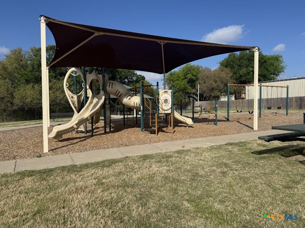 Steps from a community playground, basketball court, and green space — and that's just outside your front door. This 5-bedroom, 3.5-bath home in Spanish Oaks, Killeen, Texas delivers 3,155 sq ft of functional layout across two levels with two separate living areas, a main-floor primary suite, an upstairs game room, and room for everyone to spread out. The open-concept main level features new luxury vinyl plank flooring, fresh interior paint, and a kitchen anchored by granite countertops, a breakfast bar, updated electric range, dishwasher, microwave, and refrigerator — all flowing into a spacious Great Room with high ceilings and ceiling fans. A separate formal dining room adds flexibility for a home office, homework room, or dedicated dining space. The primary suite is on the main floor with a garden tub, walk-in shower, double vanity, and a large custom walk-in closet with built-in drawers and shelving. Upstairs includes four additional bedrooms, a dedicated game room, and two full bathrooms — giving every member of the household their own space. The dedicated interior laundry room and pull-down attic stairs add practical storage and everyday function. Outside, a covered patio opens to a fully fenced backyard with wood and game-guard fencing — built for pets, kids, and weekend use. The 2-car attached garage includes direct home entry. Spanish Oaks is an established community with sidewalks, a park, and a playground within walking distance. Located approximately 15 minutes from Fort Hood, with easy access to Rosewood Drive and Stan Schlueter Loop for shopping, dining, and commuting.