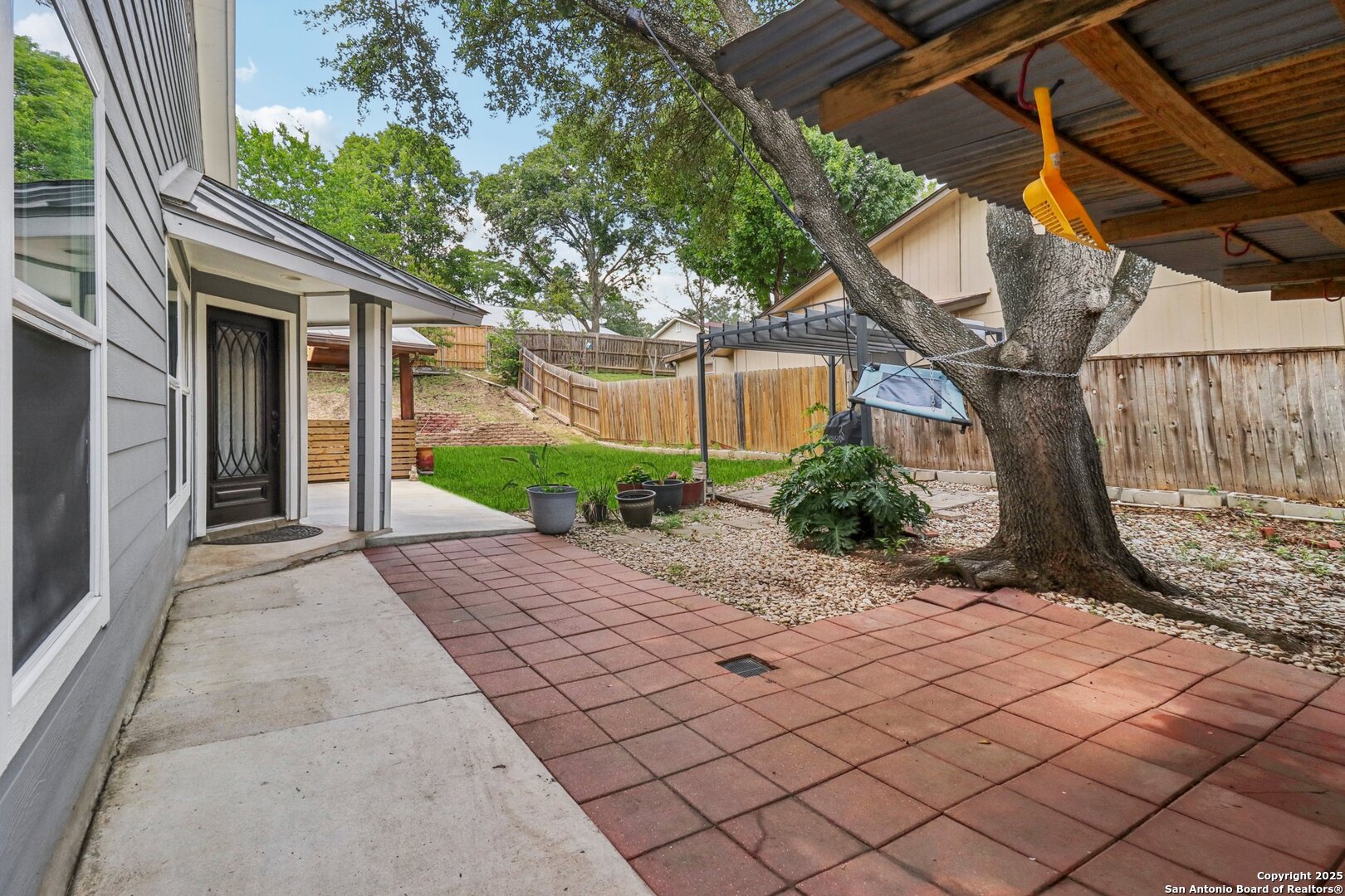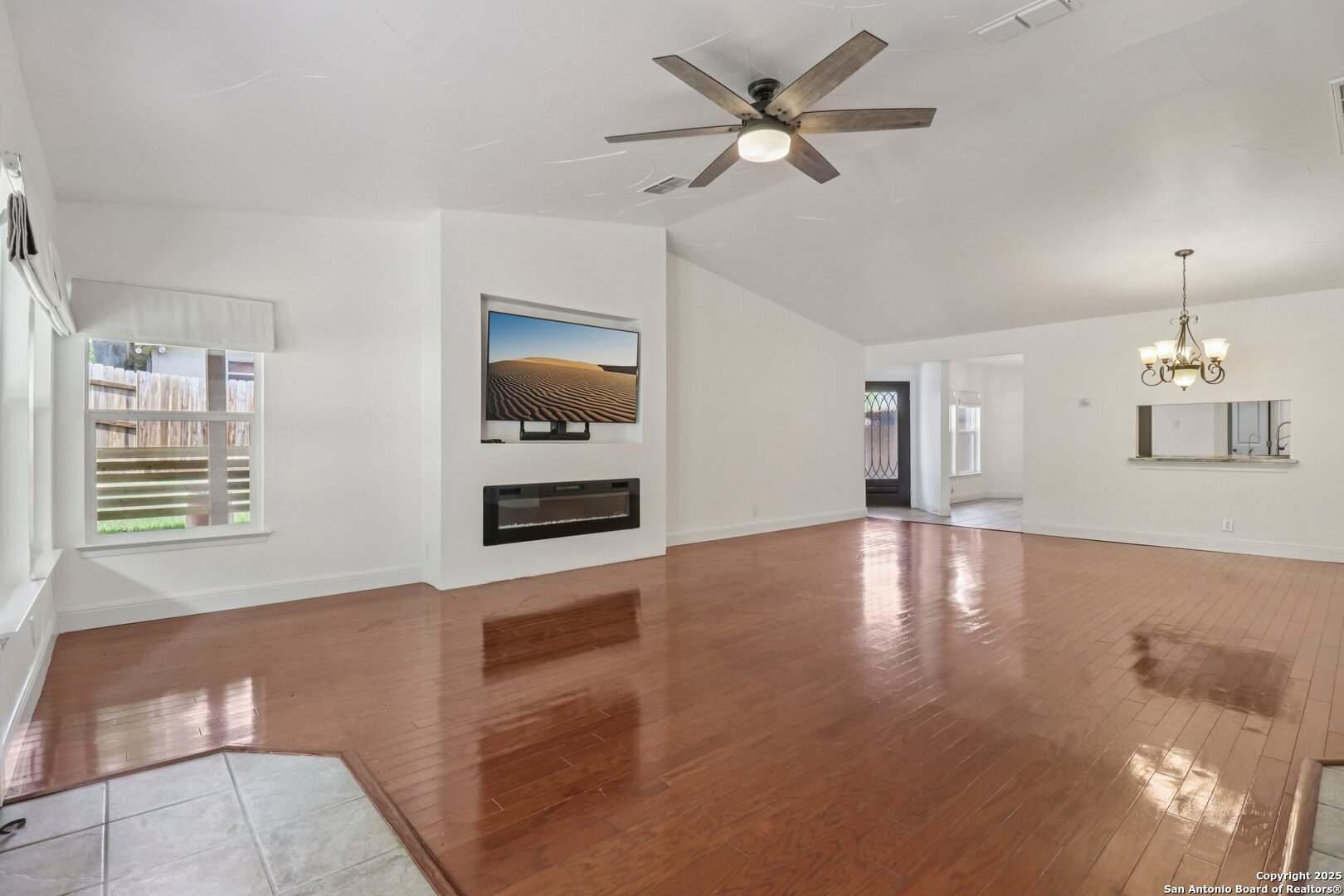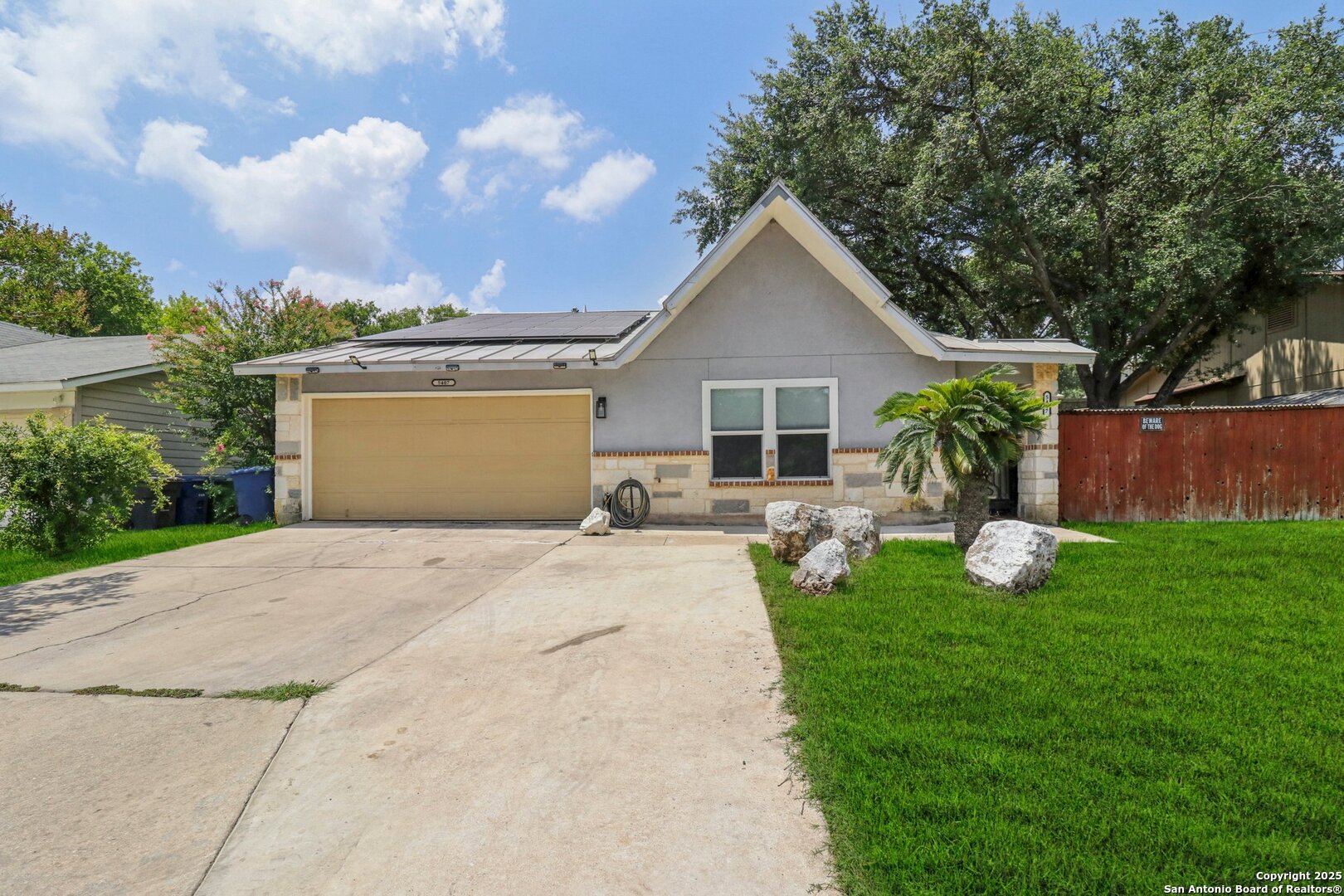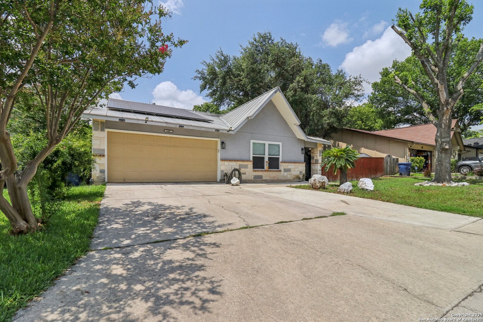 Welcome to 5407 Vista Run - A thoughtfully updated home in a desirable NEISD neighborhood! This beautifully maintained property features a durable metal roof and solar panels, providing energy efficiency and long-term savings. Inside, you'll find fresh interior paint and no carpet throughout, giving the home a clean, modern feel. The kitchen and bathrooms have been recently renovated, offering stylish finishes and functionality. A cozy new electric fireplace and built-in entertainment center create a perfect focal point in the living area, while a small private office provides a quiet space for working from home or managing daily tasks. Additional upgrades include a whole-home water filtration system for clean, healthy water throughout. Situated in a quiet, established neighborhood with quick access to schools, shopping, and major highways, this move-in-ready home combines comfort, efficiency, and convenience.
