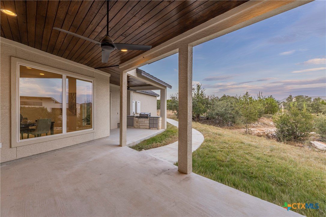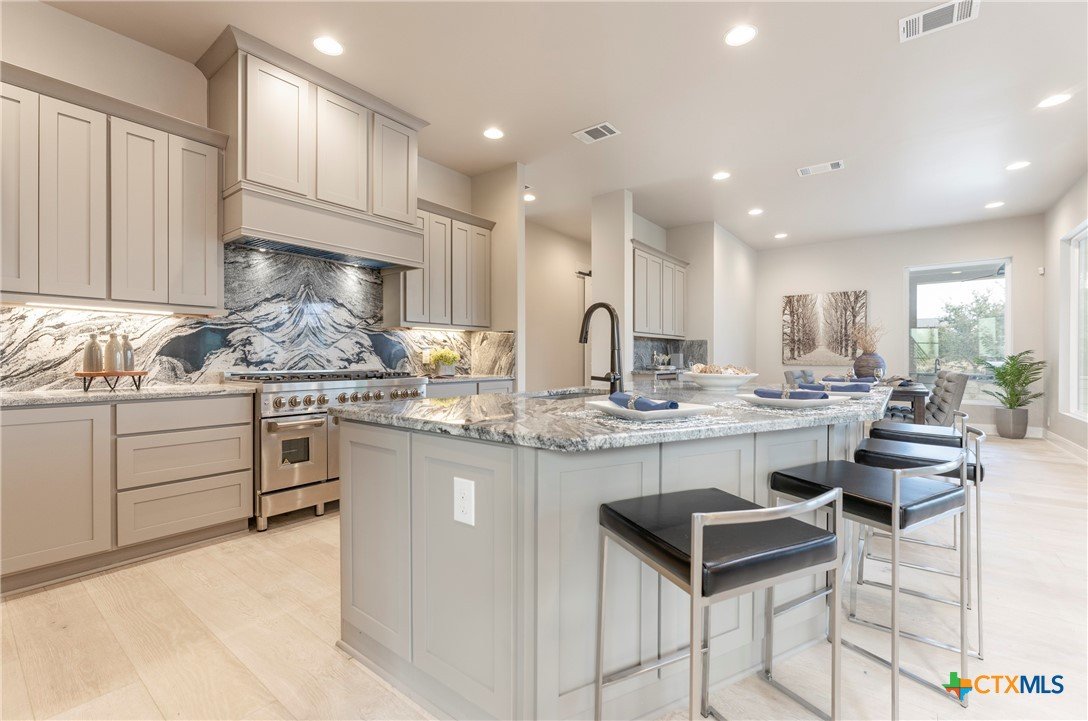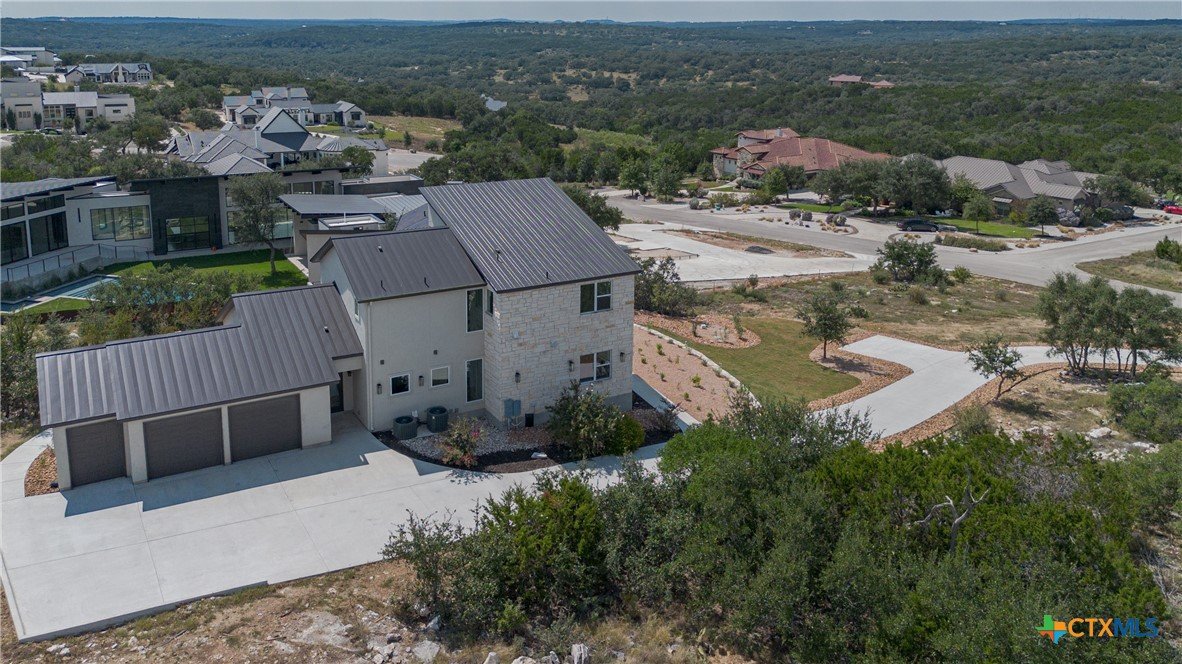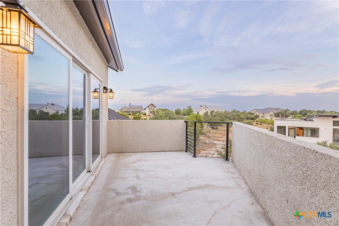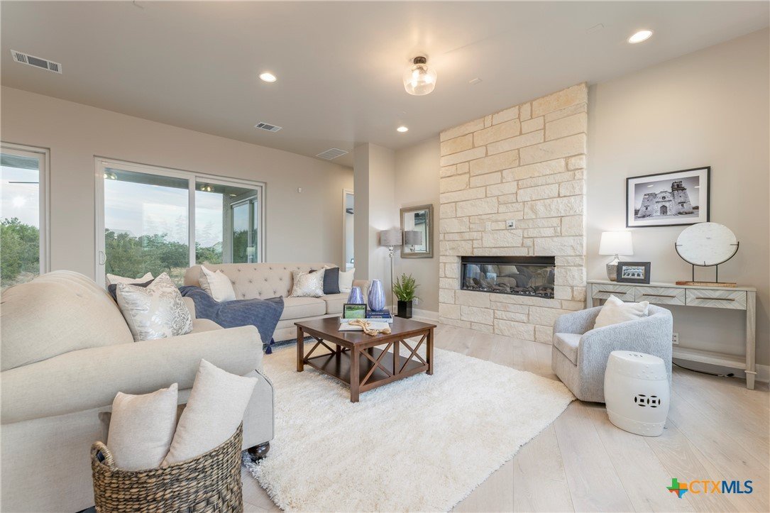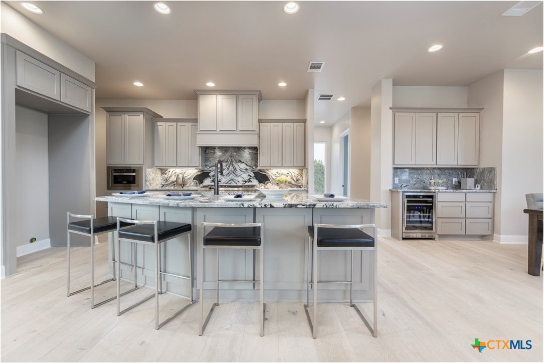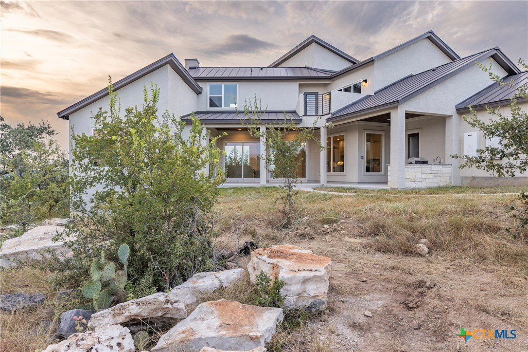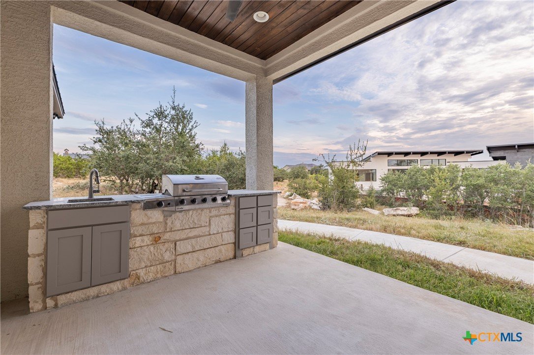 Owner Financing -Welcome to Luxury Living in Copper Ridge Perched on elevated road with Hill Country views, this exquisite 4/4.5/3 estate combines contemporary design with timeless elegance. Bathed in natural light, the open-concept floor plan has spacious living room anchored by a striking limestone fireplace and oversized windows. A stylish dry bar with wine refrigerator, abundant cabinetry, and extra counter space makes entertaining effortless. A chef's dream kitchen, professional-grade ZLINE apps, dual dishwashers, custom cabinetry, a center island/breakfast bar, and granite countertops with matching backsplash. This culinary space is as functional as it is beautiful-perfect for gatherings. The primary suite, located on the main level for privacy, with expansive windows, private patio access, and a spa-inspired bath featuring: double granite vanity, soaking tub, and an oversized double-headed shower. Walk-in closet gives abundant storage. Also on the first floor is a dedicated office/flex room. Upstairs, a versatile loft offers versatility: secondary living area, media lounge, playroom, or home office-along with a private balcony ideal for morning coffee or evening wine while enjoying the Hill Country views. Secondary bedrooms are generously sized, filled with natural light and capturing beautiful vistas. Step outside to a covered patio designed for true Texas living. The outdoor kitchen is equipped with granite counters, a sink, and a built-in grill-ideal for entertaining and weekend BBQs. One of the half-baths is conveniently located off the patio, allowing guests to enjoy the outdoor space without needing to go inside, making this a perfect year-round gathering spot. This home is also equipped with Cat 6 wiring and a whole-home surround sound system for seamless connectivity and entertainment. Don't miss this rare opportunity to own an extraordinary Copper Ridge residence-a perfect blend of luxury, comfort, and the unmatched beauty of the Texas Hill Country.