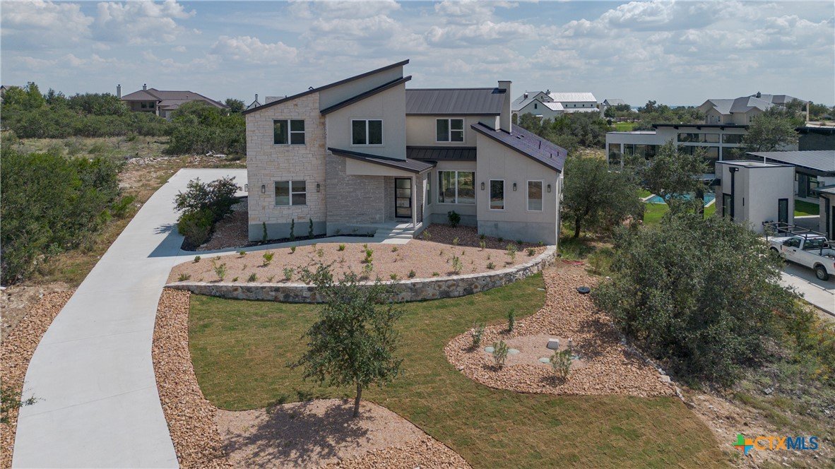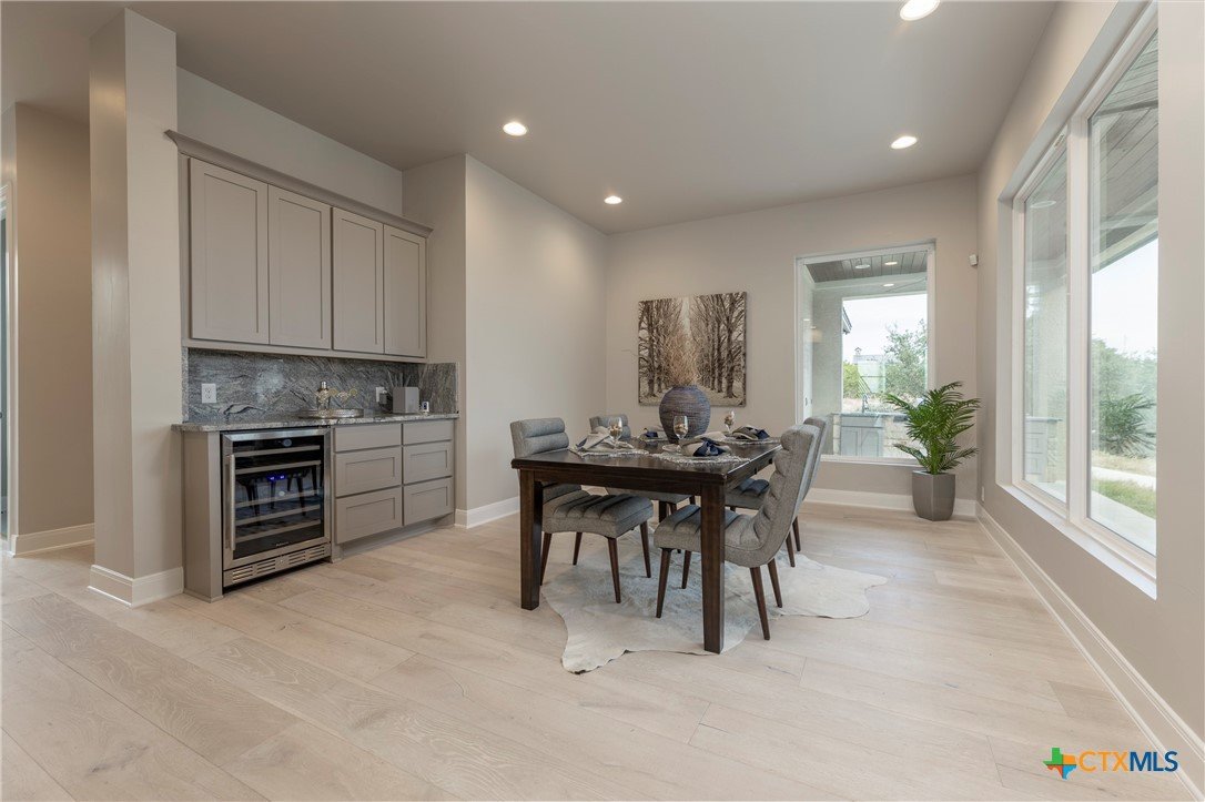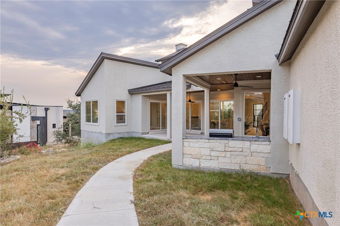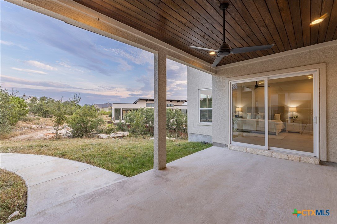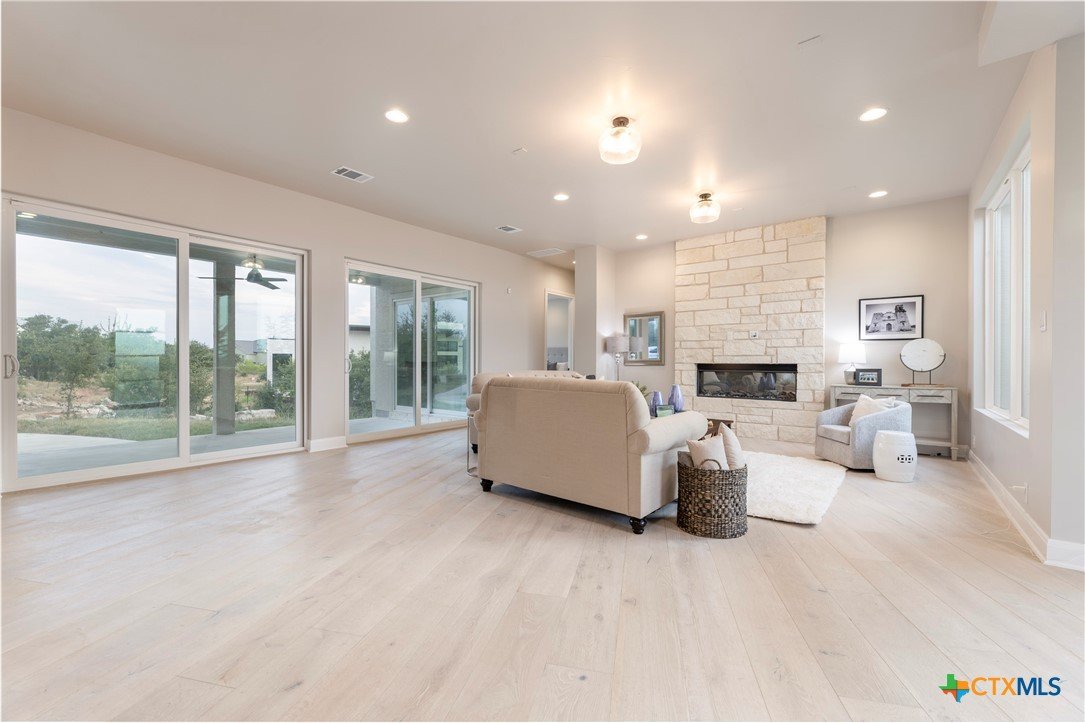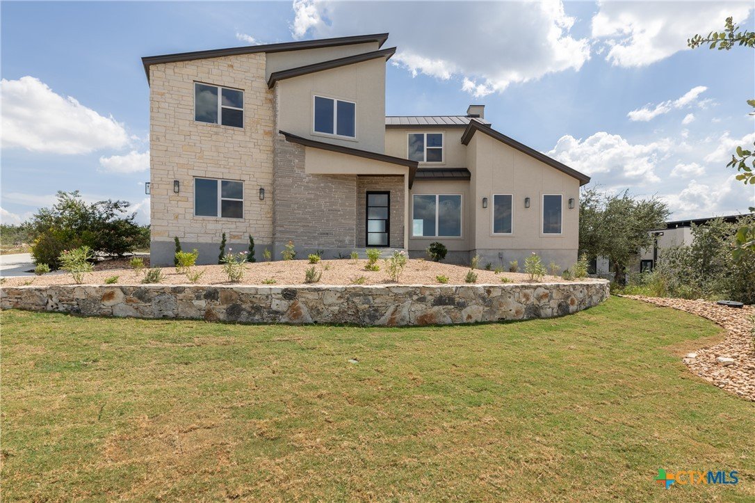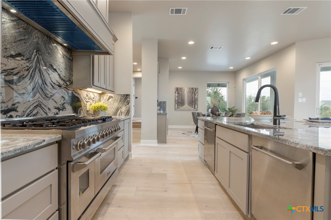Owner Financing -Welcome to Luxury Living in Copper Ridge Perched on elevated road with Hill Country views, this exquisite 4/4.5/3 estate combines contemporary design with timeless elegance. Bathed in natural light, the open-concept floor plan has spacious living room anchored by a striking limestone fireplace and oversized windows. A stylish dry bar with wine refrigerator, abundant cabinetry, and extra counter space makes entertaining effortless. A chef's dream kitchen, professional-grade ZLINE apps, dual dishwashers, custom cabinetry, a center island/breakfast bar, and granite countertops with matching backsplash. This culinary space is as functional as it is beautiful-perfect for gatherings. The primary suite, located on the main level for privacy, with expansive windows, private patio access, and a spa-inspired bath featuring: double granite vanity, soaking tub, and an oversized double-headed shower. Walk-in closet gives abundant storage. Also on the first floor is a dedicated office/flex room. Upstairs, a versatile loft offers versatility: secondary living area, media lounge, playroom, or home office-along with a private balcony ideal for morning coffee or evening wine while enjoying the Hill Country views. Secondary bedrooms are generously sized, filled with natural light and capturing beautiful vistas. Step outside to a covered patio designed for true Texas living. The outdoor kitchen is equipped with granite counters, a sink, and a built-in grill-ideal for entertaining and weekend BBQs. One of the half-baths is conveniently located off the patio, allowing guests to enjoy the outdoor space without needing to go inside, making this a perfect year-round gathering spot. This home is also equipped with Cat 6 wiring and a whole-home surround sound system for seamless connectivity and entertainment. Don't miss this rare opportunity to own an extraordinary Copper Ridge residence-a perfect blend of luxury, comfort, and the unmatched beauty of the Texas Hill Country.