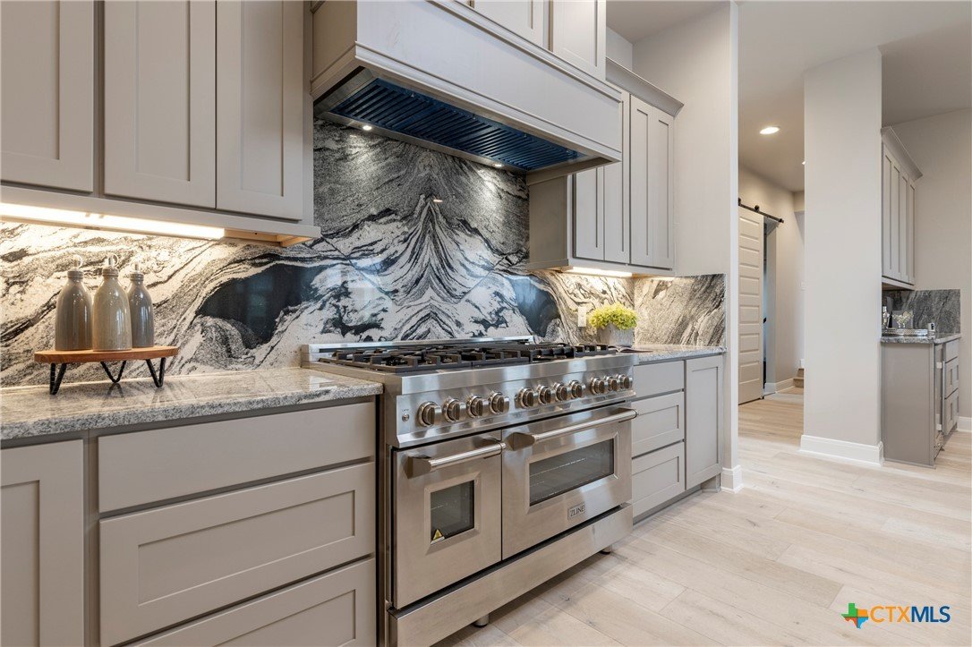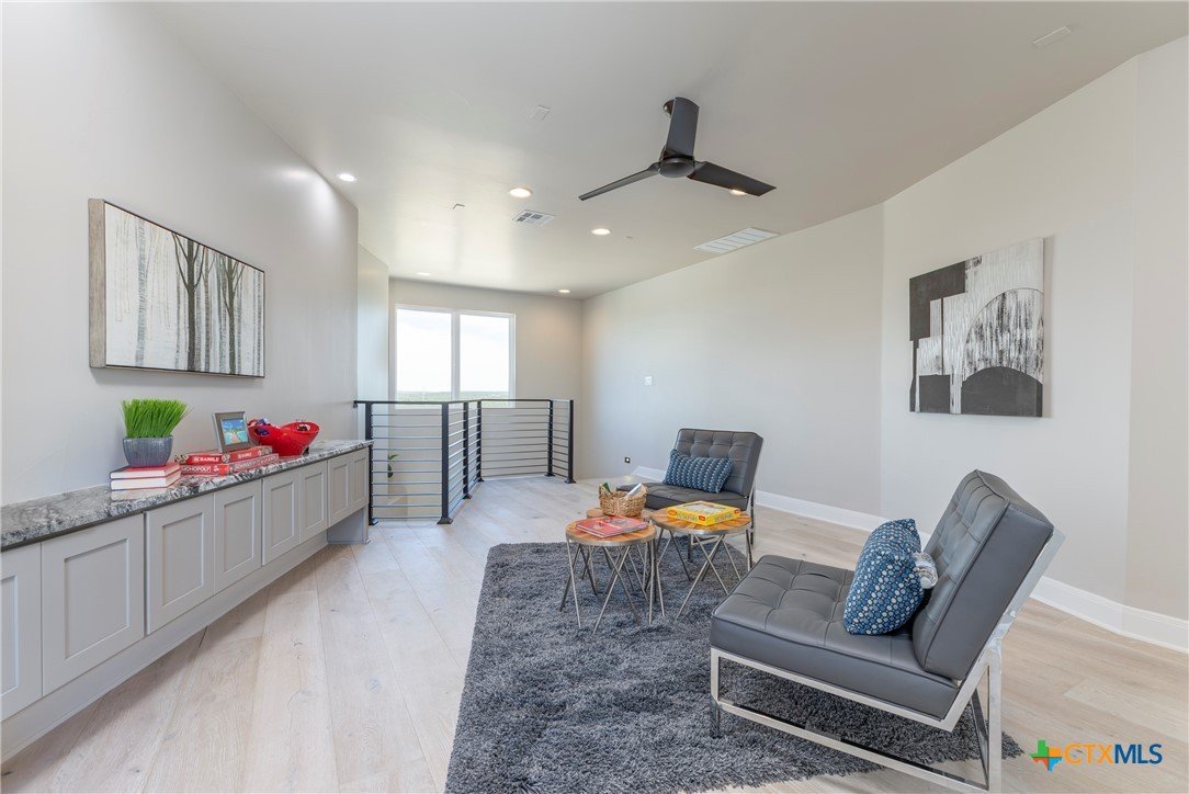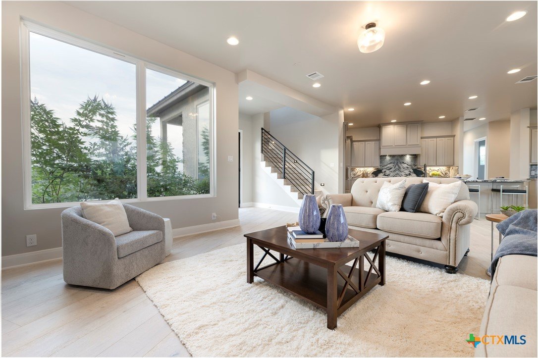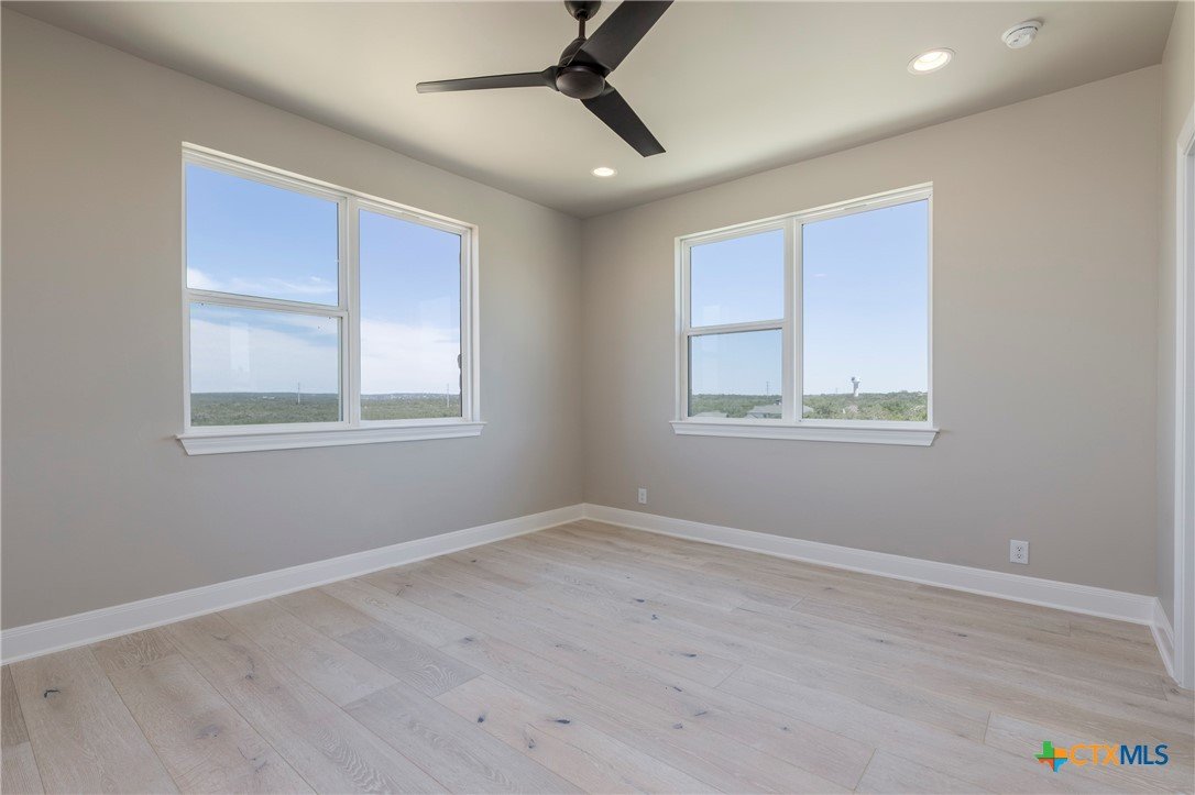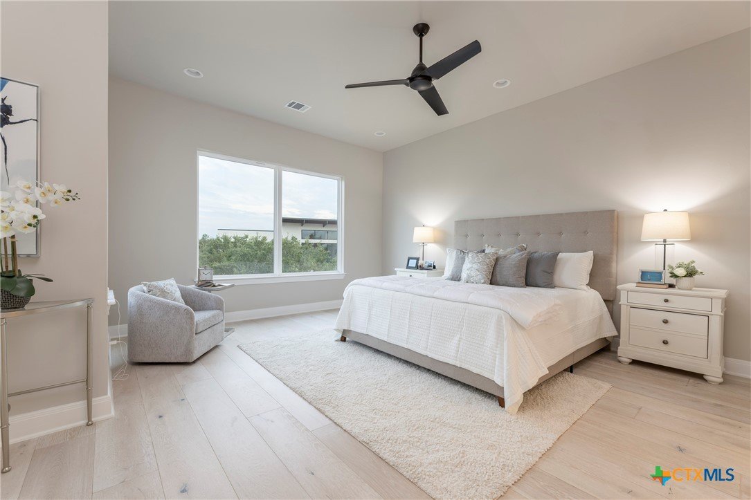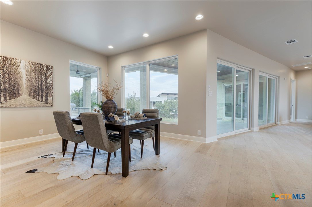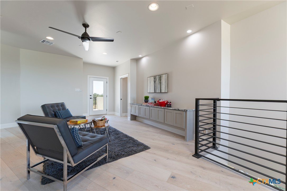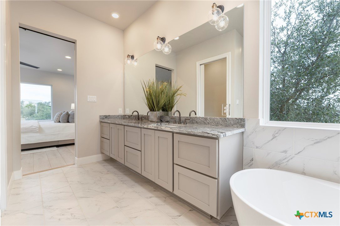 Owner Financing -Welcome to Luxury Living in Copper Ridge Perched on elevated road with Hill Country views, this exquisite 4/4.5/3 estate combines contemporary design with timeless elegance. Bathed in natural light, the open-concept floor plan has spacious living room anchored by a striking limestone fireplace and oversized windows. A stylish dry bar with wine refrigerator, abundant cabinetry, and extra counter space makes entertaining effortless. A chef's dream kitchen, professional-grade ZLINE apps, dual dishwashers, custom cabinetry, a center island/breakfast bar, and granite countertops with matching backsplash. This culinary space is as functional as it is beautiful-perfect for gatherings. The primary suite, located on the main level for privacy, with expansive windows, private patio access, and a spa-inspired bath featuring: double granite vanity, soaking tub, and an oversized double-headed shower. Walk-in closet gives abundant storage. Also on the first floor is a dedicated office/flex room. Upstairs, a versatile loft offers versatility: secondary living area, media lounge, playroom, or home office-along with a private balcony ideal for morning coffee or evening wine while enjoying the Hill Country views. Secondary bedrooms are generously sized, filled with natural light and capturing beautiful vistas. Step outside to a covered patio designed for true Texas living. The outdoor kitchen is equipped with granite counters, a sink, and a built-in grill-ideal for entertaining and weekend BBQs. One of the half-baths is conveniently located off the patio, allowing guests to enjoy the outdoor space without needing to go inside, making this a perfect year-round gathering spot. This home is also equipped with Cat 6 wiring and a whole-home surround sound system for seamless connectivity and entertainment. Don't miss this rare opportunity to own an extraordinary Copper Ridge residence-a perfect blend of luxury, comfort, and the unmatched beauty of the Texas Hill Country.