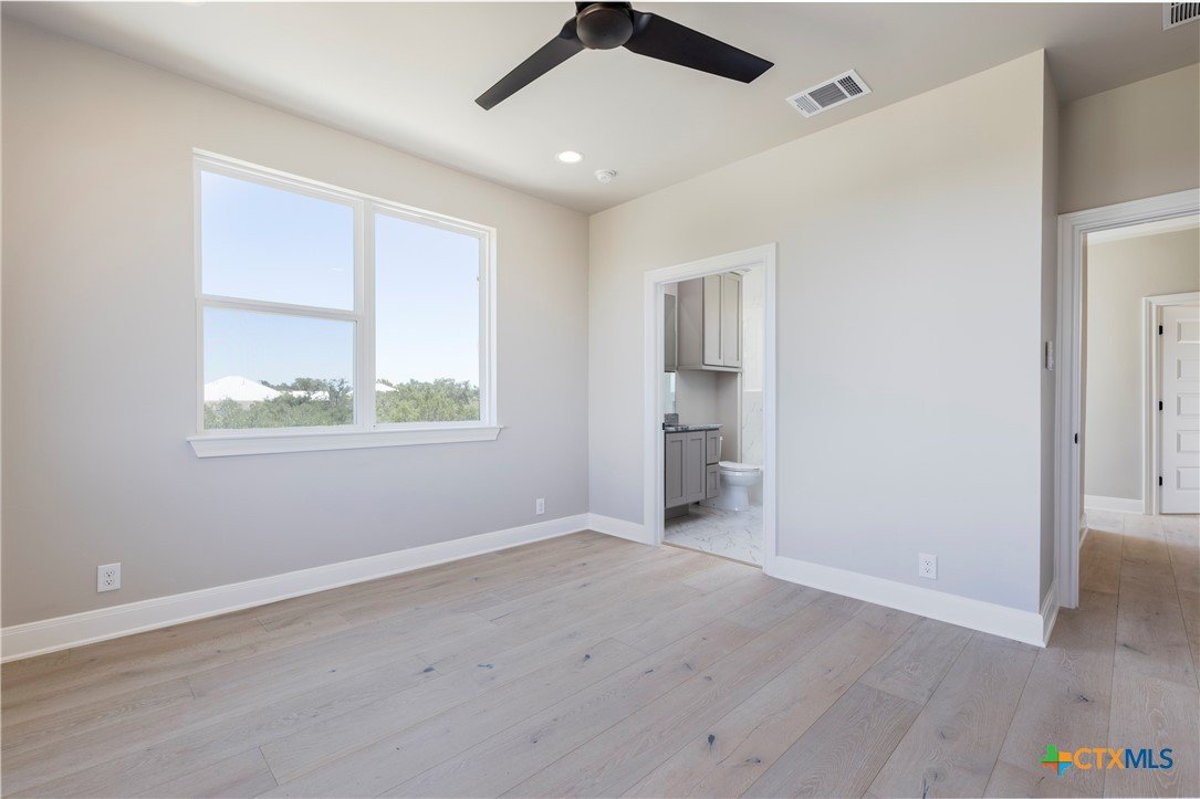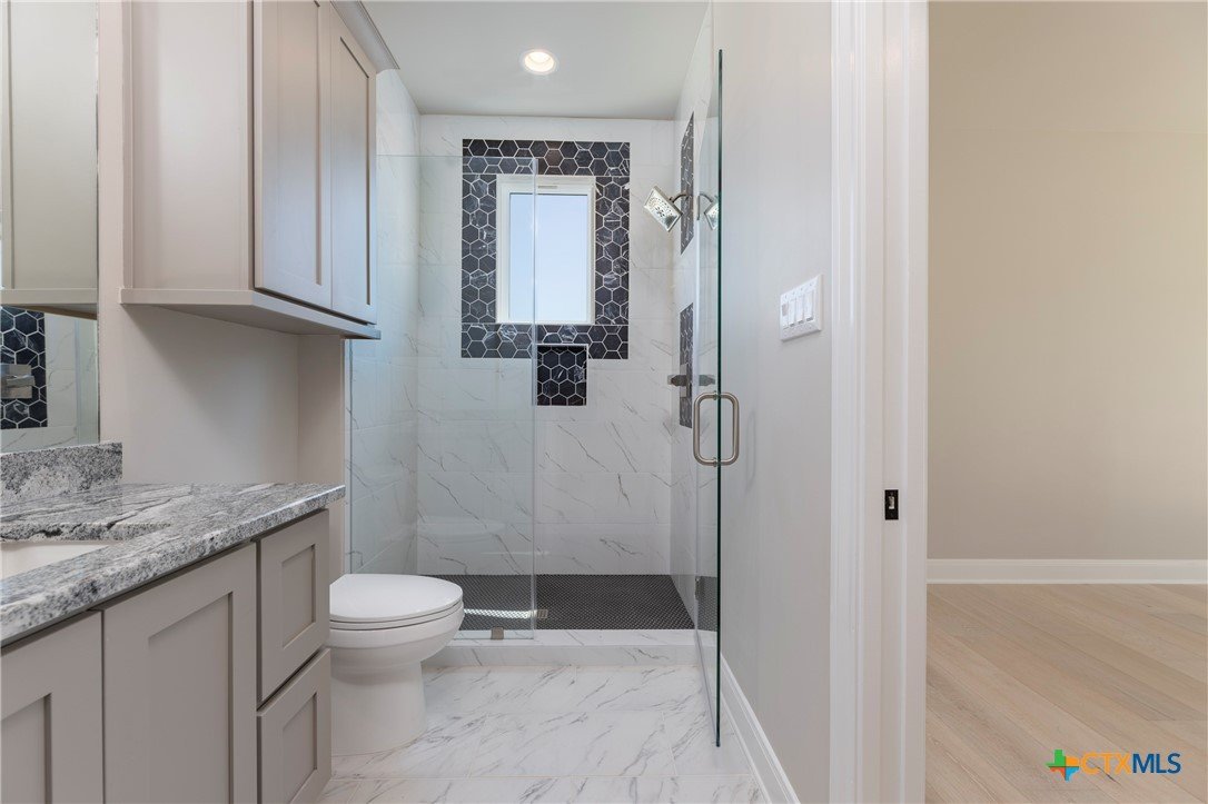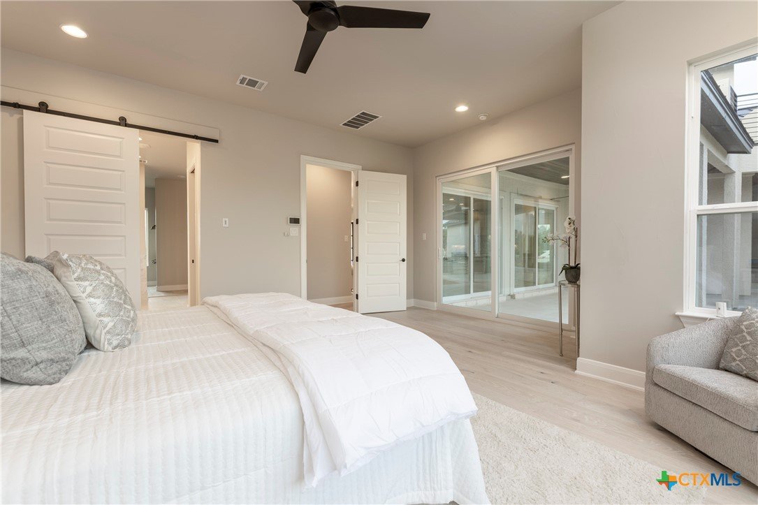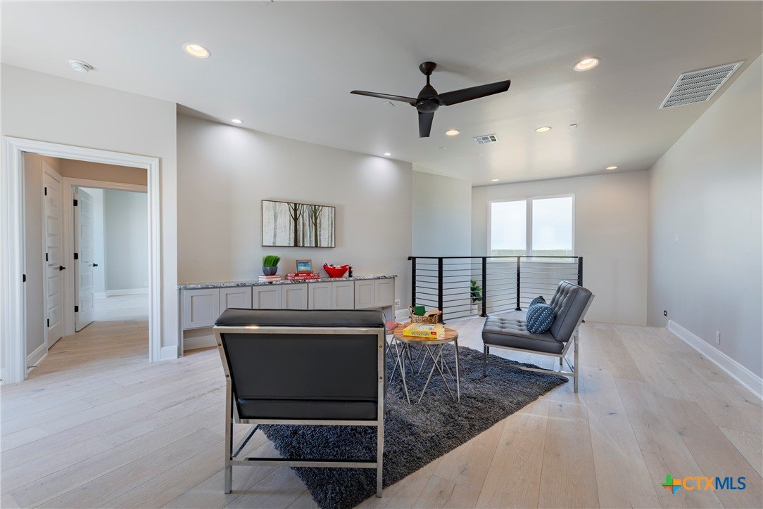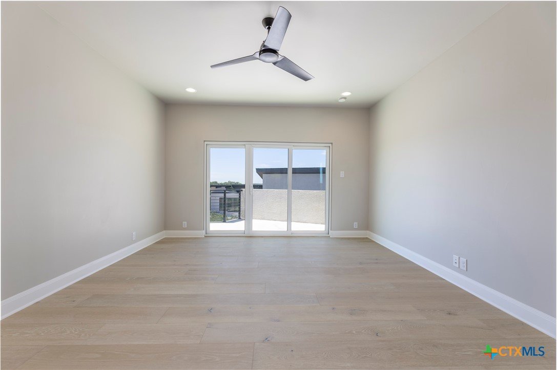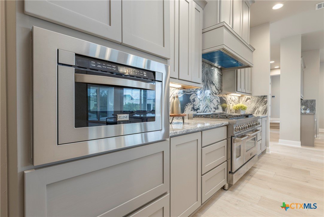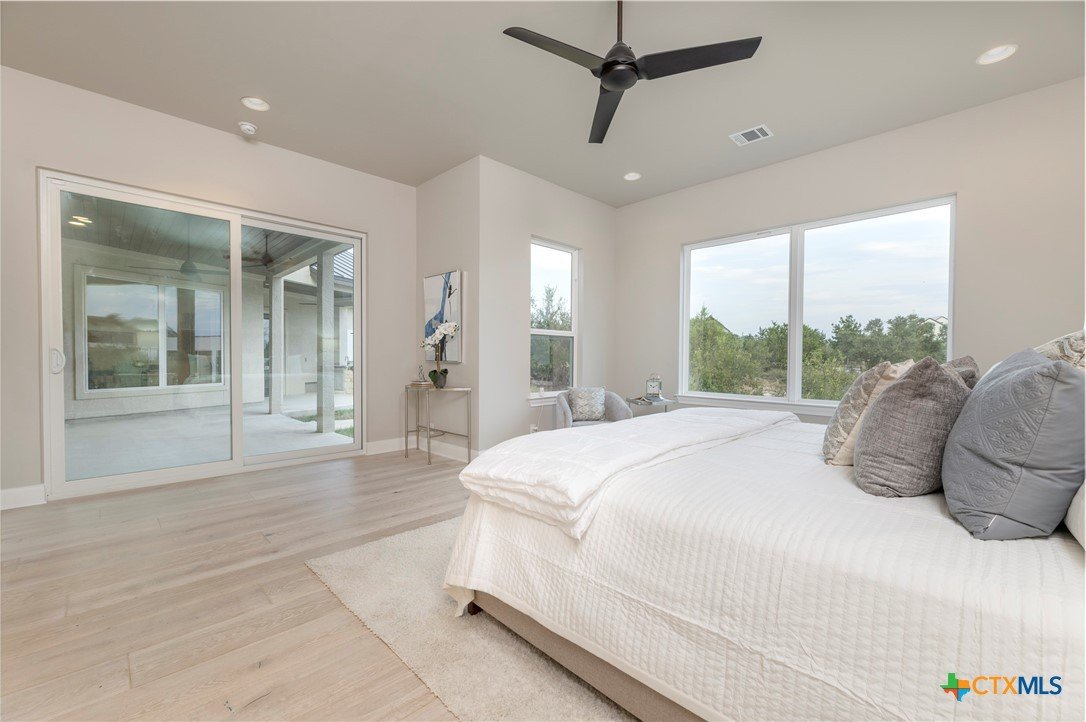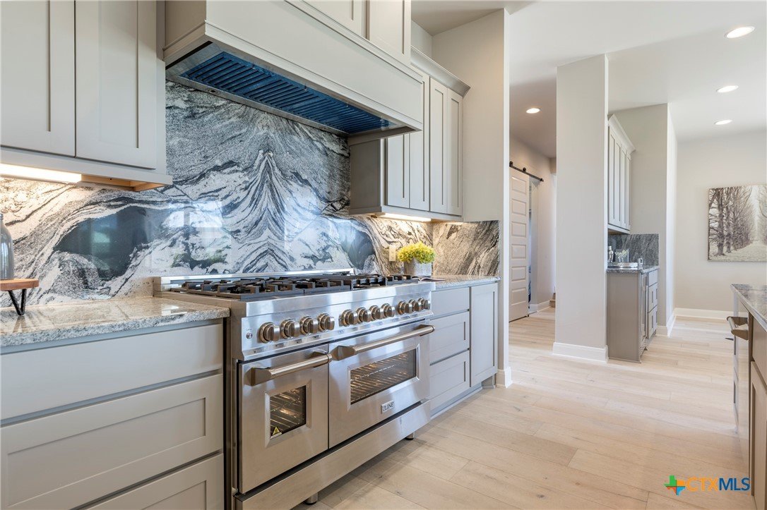 Owner Financing -Welcome to Luxury Living in Copper Ridge Perched on elevated road with Hill Country views, this exquisite 4/4.5/3 estate combines contemporary design with timeless elegance. Bathed in natural light, the open-concept floor plan has spacious living room anchored by a striking limestone fireplace and oversized windows. A stylish dry bar with wine refrigerator, abundant cabinetry, and extra counter space makes entertaining effortless. A chef's dream kitchen, professional-grade ZLINE apps, dual dishwashers, custom cabinetry, a center island/breakfast bar, and granite countertops with matching backsplash. This culinary space is as functional as it is beautiful-perfect for gatherings. The primary suite, located on the main level for privacy, with expansive windows, private patio access, and a spa-inspired bath featuring: double granite vanity, soaking tub, and an oversized double-headed shower. Walk-in closet gives abundant storage. Also on the first floor is a dedicated office/flex room. Upstairs, a versatile loft offers versatility: secondary living area, media lounge, playroom, or home office-along with a private balcony ideal for morning coffee or evening wine while enjoying the Hill Country views. Secondary bedrooms are generously sized, filled with natural light and capturing beautiful vistas. Step outside to a covered patio designed for true Texas living. The outdoor kitchen is equipped with granite counters, a sink, and a built-in grill-ideal for entertaining and weekend BBQs. One of the half-baths is conveniently located off the patio, allowing guests to enjoy the outdoor space without needing to go inside, making this a perfect year-round gathering spot. This home is also equipped with Cat 6 wiring and a whole-home surround sound system for seamless connectivity and entertainment. Don't miss this rare opportunity to own an extraordinary Copper Ridge residence-a perfect blend of luxury, comfort, and the unmatched beauty of the Texas Hill Country.