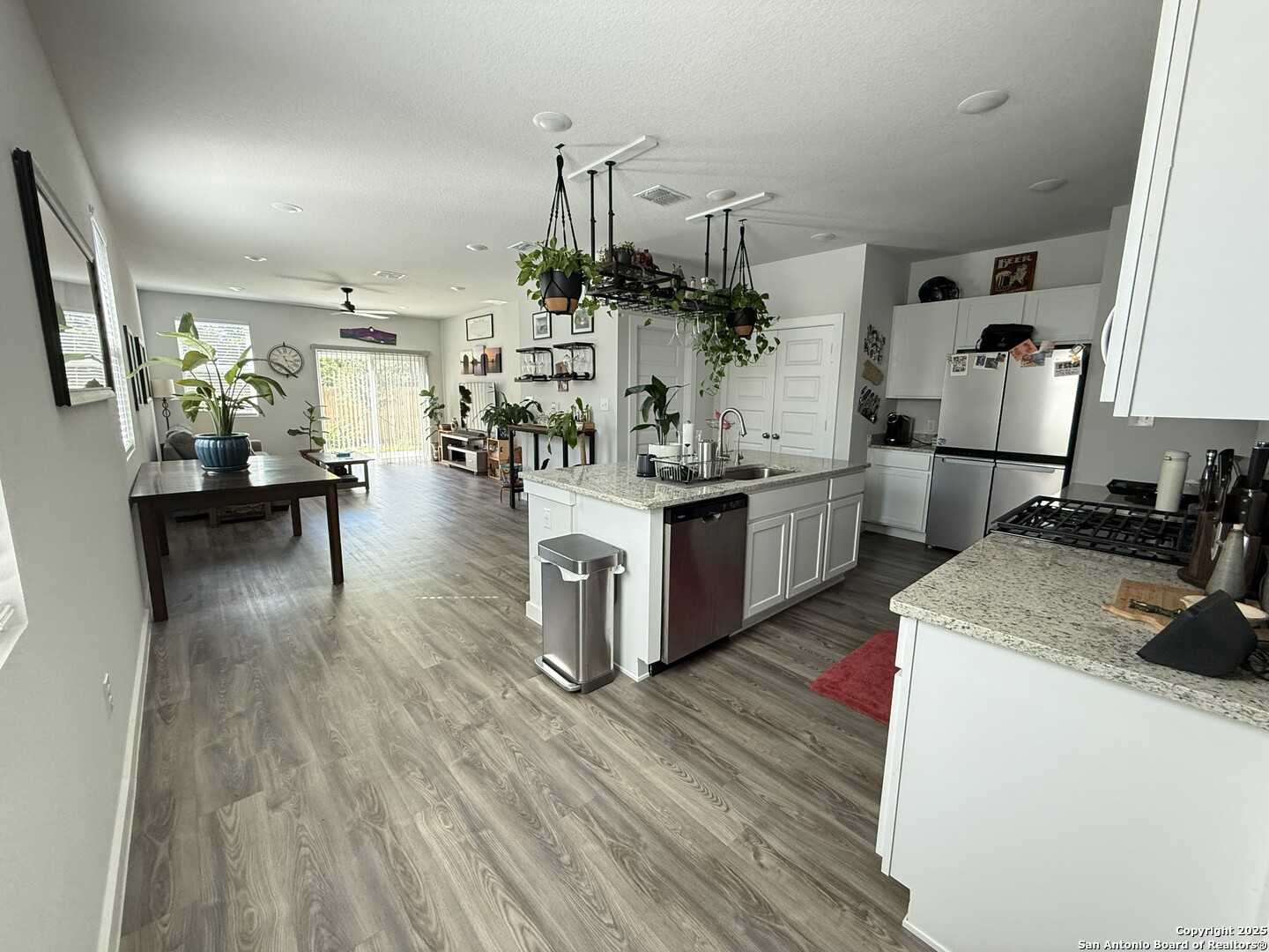 We are excited to share details on a Charming four-bedroom, single-story home located in the desirable Blue Ridge Ranch community. This property offers a comfortable, open-concept living experience. The kitchen features an open layout with bright white cabinetry and a central island. A separate laundry room and a water softener system add convenience. The spacious master suite is thoughtfully separated from the secondary bedrooms for privacy, and includes double sinks and a walk-in closet. A key feature of the property is its location backing up directly to a peaceful greenbelt.