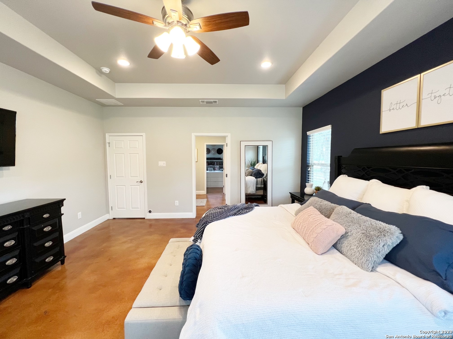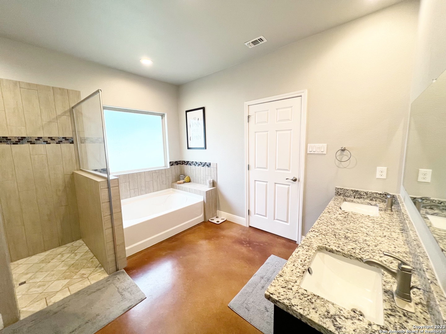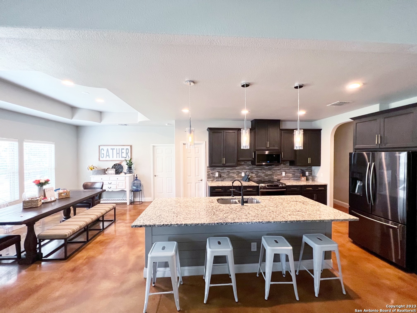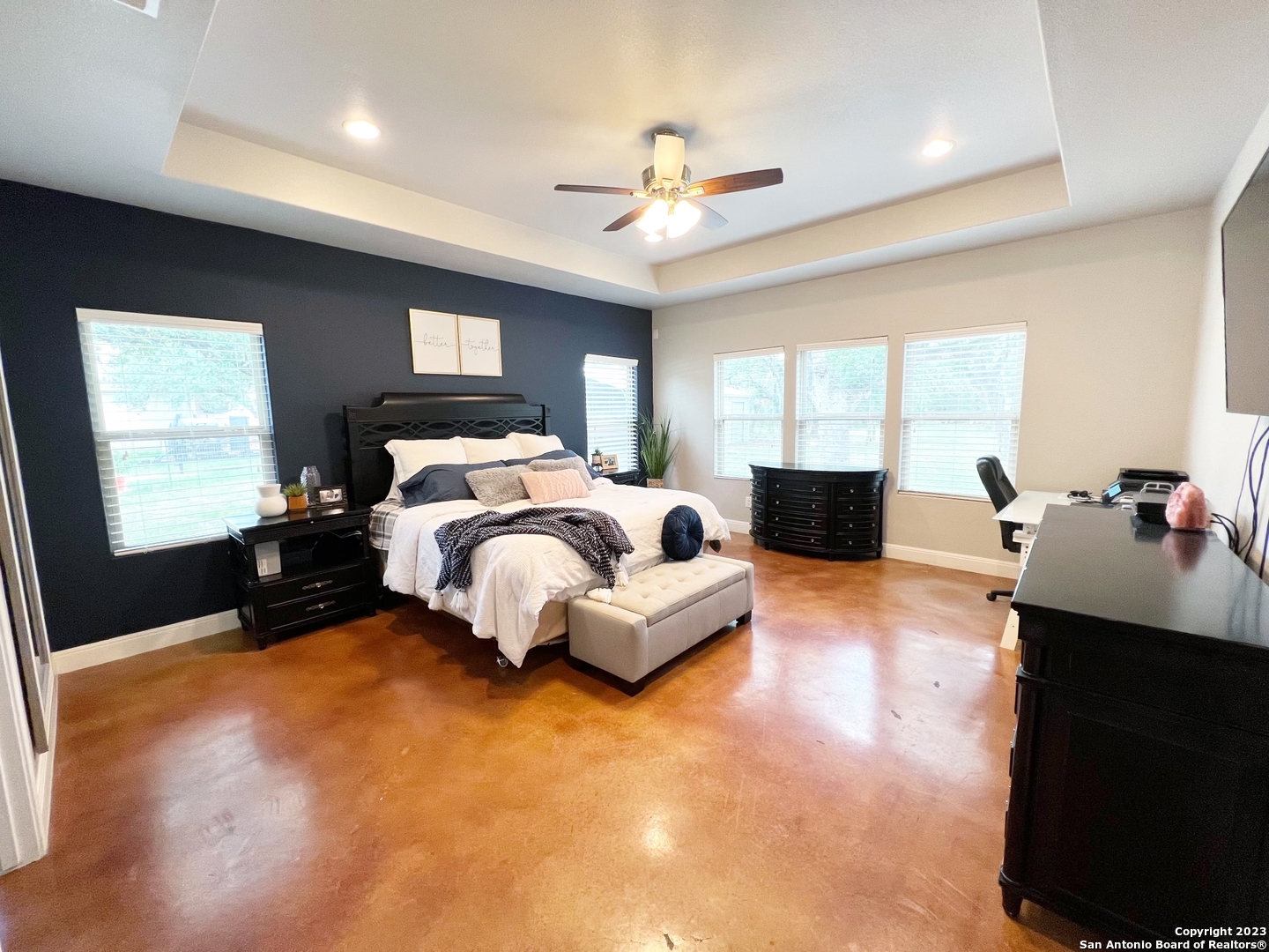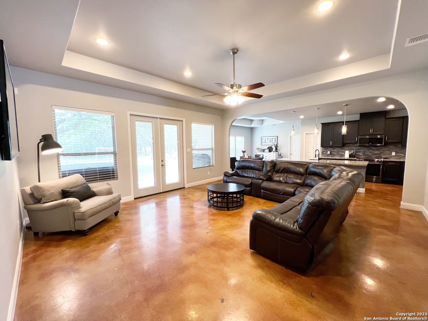 Welcome to this stunning one-story home! Featuring 4 bedrooms, 2 full baths, and one half bath, this residence offers a spacious and open floor plan that seamlessly connects the kitchen, dining room, and living room. With beautiful stained concrete floors throughout, the house exudes a Texas Hill County contemporary elegance. The kitchen is a true highlight, boasting granite countertops, a large island with ample seating, stainless steel appliances, custom cabinets, and a generously sized walk-in pantry. It's a perfect space for culinary adventures and entertaining guests. The master bathroom serves as a luxurious retreat, with an oversized walk-in shower, seperate tub, double vanity, and a massive walk-in closet for all your storage needs. It's a sanctuary designed for comfort and relaxation. The fourth bedroom, currently used as an office, offers versatility as a media room or game room, providing endless entertainment possibilities. On the other side of the house, two additional bedrooms share a convenient jack and jill full-size bathroom, ensuring privacy and functionality. Situated on a .73-acre lot on a quiet culdesac, this home provides a peaceful and serene setting. The neighborhood offers three POA parks,a park on the river with private access including a pool park, Pavilion Park with a covered pavilion, lighted tennis court, basketball rims, and all parks equipped with restrooms and BBQ pits. These amenities foster a strong sense of community. One exceptional feature of this property is the inclusion of a 18x30 boat storage with additional storage. This dedicated space provides ample room to safely store your boat, ensuring it remains protected from the elements and easily accessible whenever you're ready for your next aquatic adventure. Located in the esteemed Comal Independent School District, this home guarantees access to top-notch schools, ensuring an excellent education. Moreover, the picturesque beauty of the Texas Hill Country surrounds you, adding to the allure of the location. Don't miss the opportunity to make this remarkable house your own. Come and see it today, and embark on a journey to create lasting memories in the heart of the Texas Hill Country.