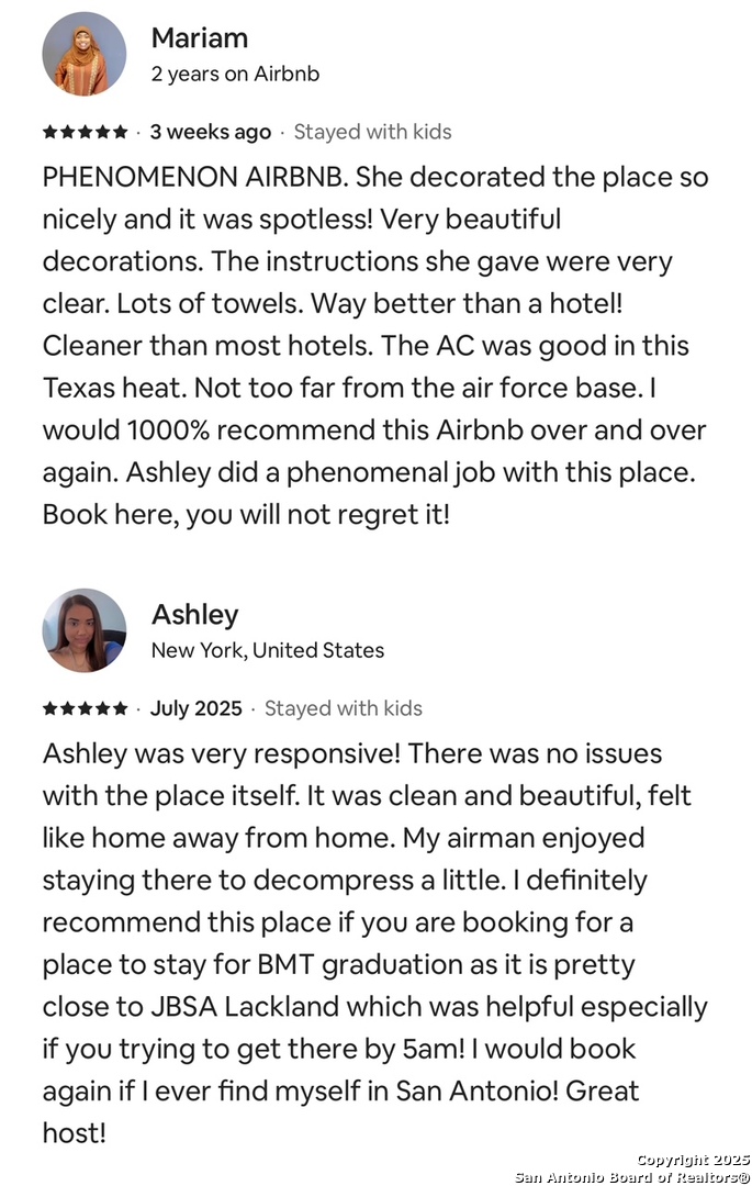 INVESTOR SPECIAL OR FIRST TIME HOME BUYER...This home has been operating as a cash flowing short term rental on the AIRBNB Platform for the last 2 1/2 years hosting Lackland Airforce BMT military families weekly. A WELL-KEPT home offering an open space concept, vinyl plank and carpet in bedrooms, NEW water heater (November 2022), NEW Granite kitchen countertops, white cabinetry, recessed lighting, and ceiling fans in every room, freshly painted walls and trim. Modern elegance at an affordable price! Close proximity to Lackland AFB, Pearsall Park, Shopping centers, and Freeways. Make this home filled with love and design. Everything BELOW $190k!! ALL Appliances, furniture, and decor, negotiable to convey with property. This is a MUST SEE and won't last long.