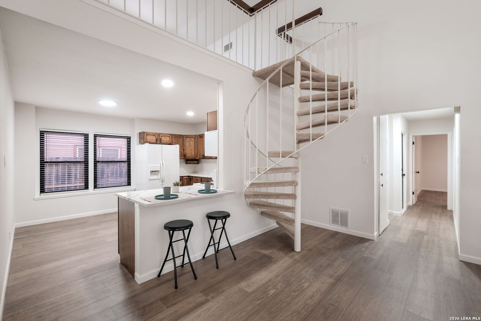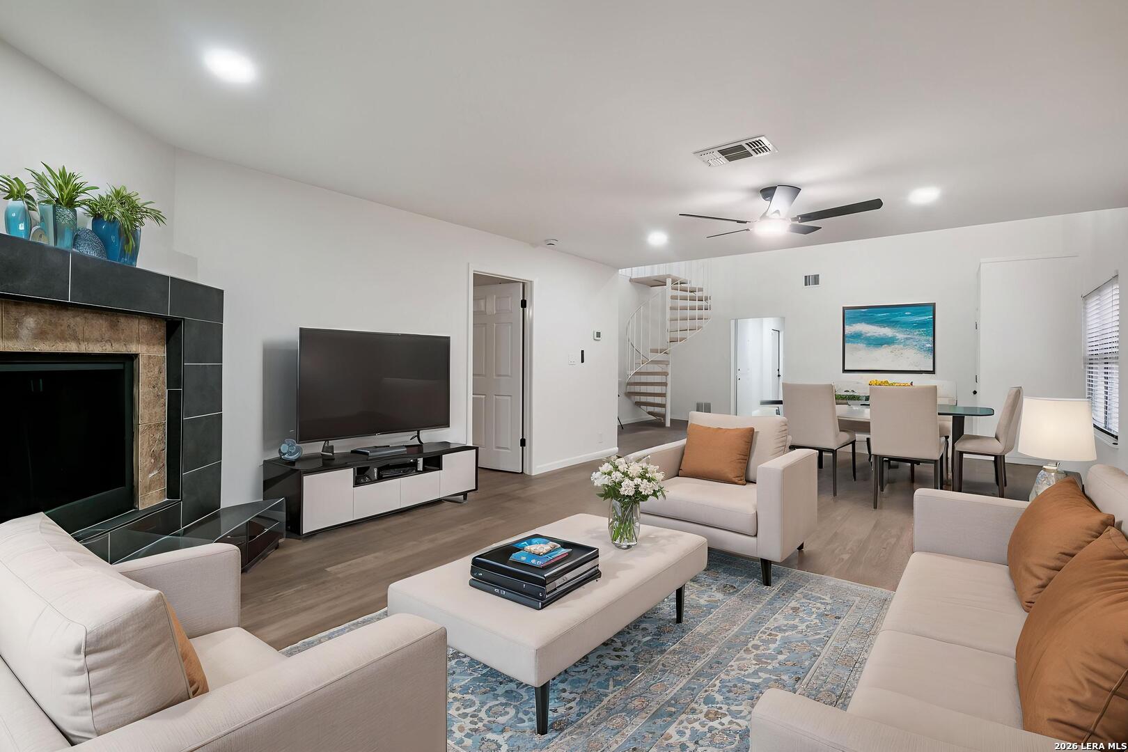 Welcome to this beautifully updated home offering modern finishes, functional space, and unbeatable convenience - all with NO HOA! Step inside to discover brand-new wood laminate flooring installed January 2026 - completely carpet-free for a clean, low-maintenance lifestyle. The open-concept floor plan creates an effortless flow between the living, dining, and kitchen areas, making it ideal for entertaining. The kitchen is designed to impress with quartz countertops, ample cabinetry, and a layout that opens directly into the main living space so you're never disconnected from family or guests. The primary suite is thoughtfully positioned on the opposite side of the home from the secondary bedrooms for added privacy. The suite features a spacious layout with a dedicated sitting area or even an office space, double closets, and a remodeled en-suite bathroom - giving it a fresh, modern feel. Upstairs, a unique spiral staircase leads to a versatile loft space perfect for a second living area, home office, game room, or flex space to fit your needs. Located with easy access to Loop 1604, commuting is a breeze plus convenient access to shopping, dining, and everyday essentials and just minutes from Randolph Air Force Base. This home checks all the boxes: modern updates, flexible living spaces, privacy in layout, and a prime Northeast San Antonio location!