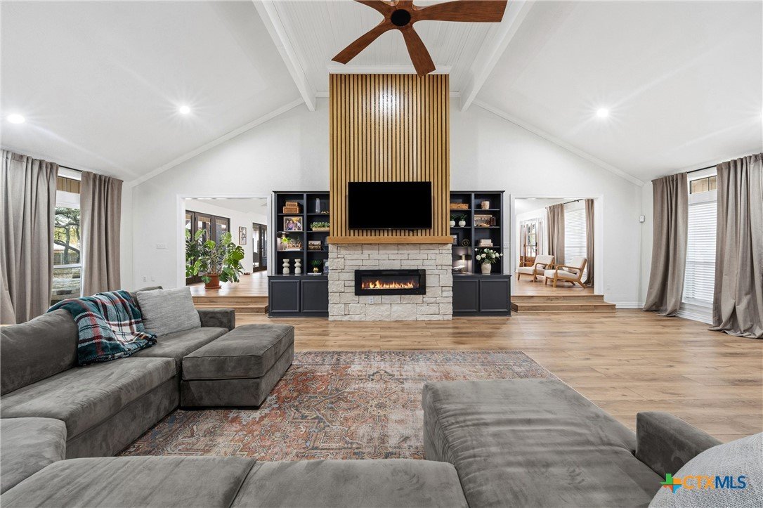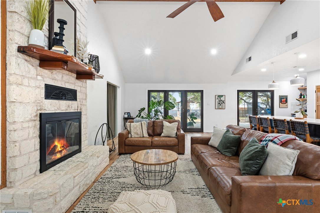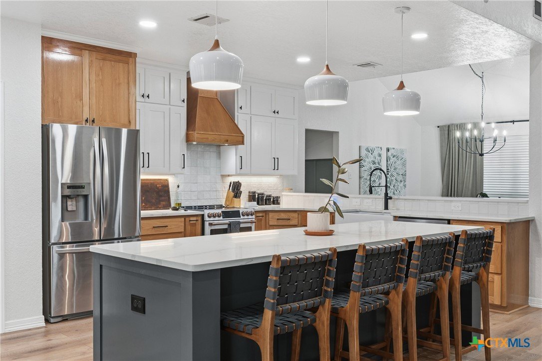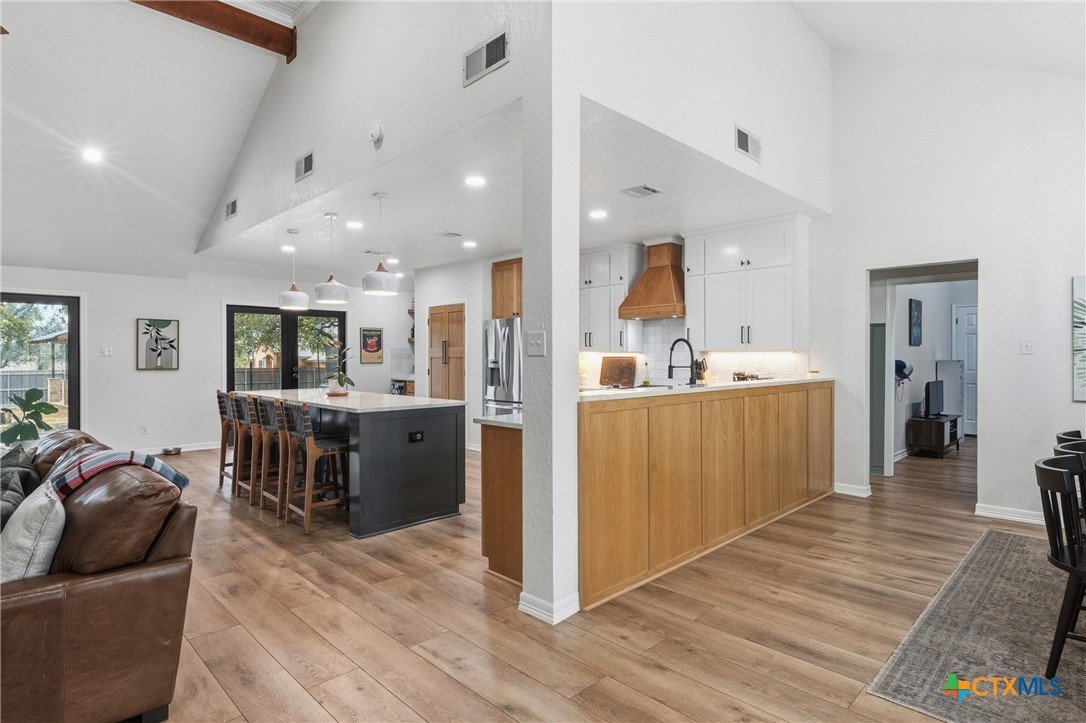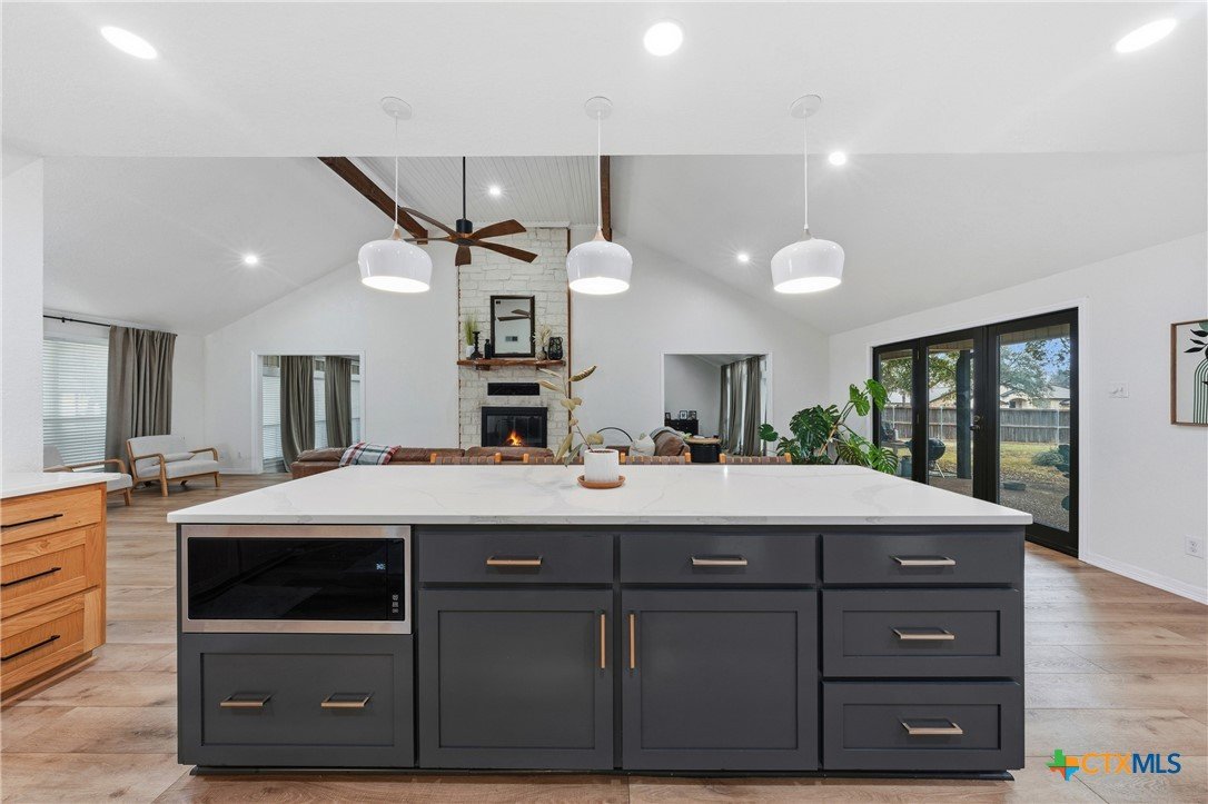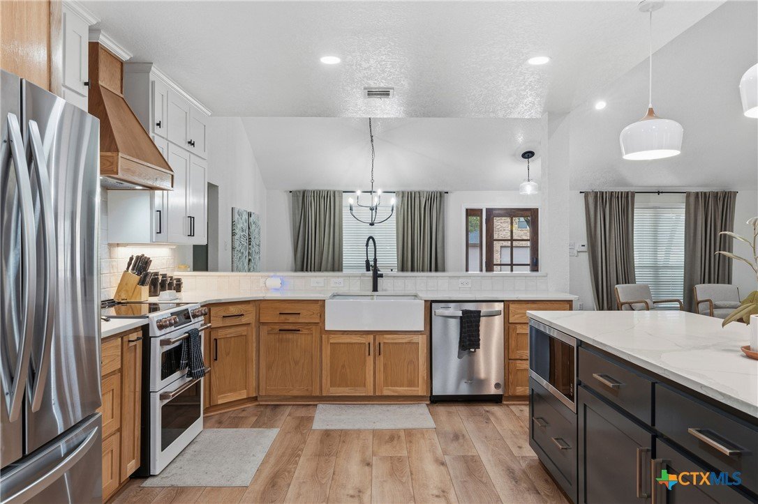 Set on nearly an acre beneath a stunning canopy of around 60 mature oak trees, this exquisitely remodeled ranch-style farmhouse offers refined luxury, thoughtful design, and exceptional versatility. The home features 5 bedrooms, 3.5 bathrooms, and 3 distinct living areas, creating effortless flow for daily family living and entertaining. The open-concept kitchen is a showpiece, appointed with quartz countertops, custom white oak cabinetry, farmhouse sink, double ovens, wet bar, and butler’s pantry, all centered around a large island and seamlessly opening to a spacious living area with a wood burning fireplace. Oversized front and back porches and a covered patio with outdoor fireplace extend the living space outdoors in every season. The private primary suite is a true sanctuary, boasting two expansive, separate closets, a spa-inspired bath with zero-entry walk-in shower, dual white oak vanities, and a soaking tub. On the other side of the home, a dedicated kids’ wing offers its own living room, two bedrooms, full bath, and two lofts, providing ideal separation and flexibility. Additional features include a 2-car attached garage, and a 2-bay high-ceiling carport for your "toys" with attached flex room with central hvac currently used as a home gym, with a full bath. The back yard also boasts a greenhouse, and metal building for storage or future shop space. This one-of-a-kind property delivers luxury living with focus on functionality in a serene, tree-filled setting designed for modern lifestyles.