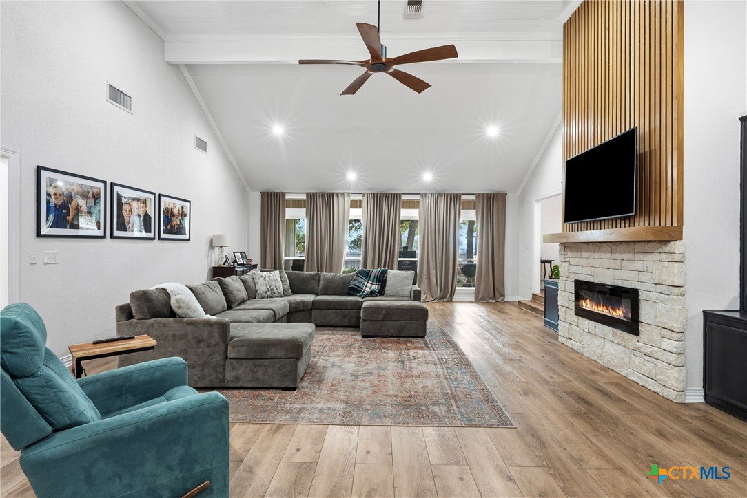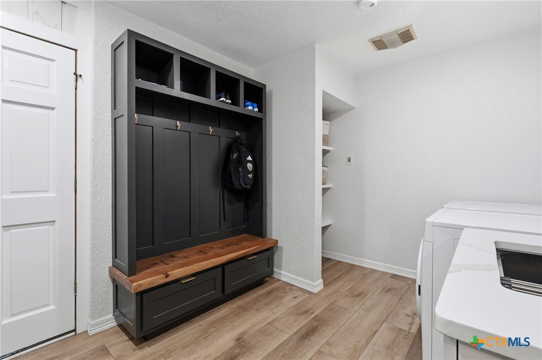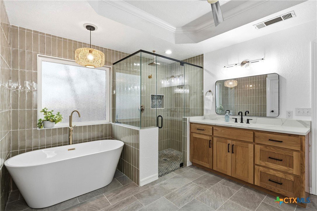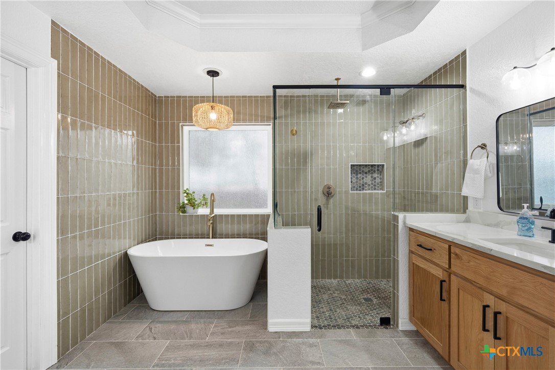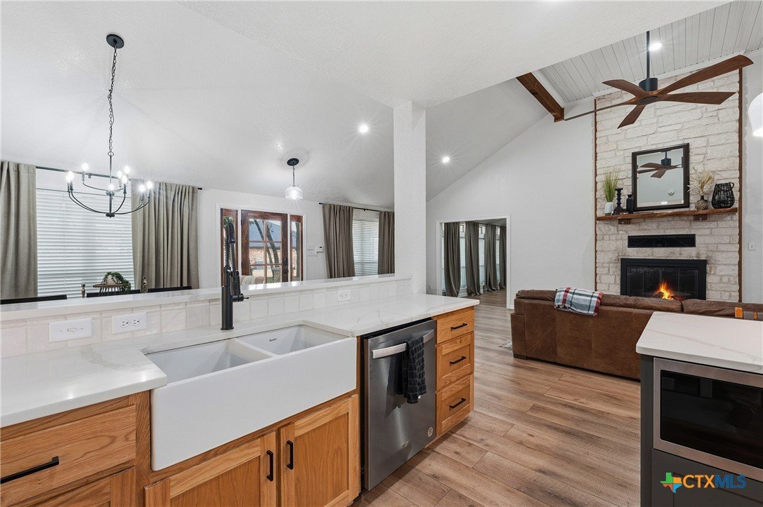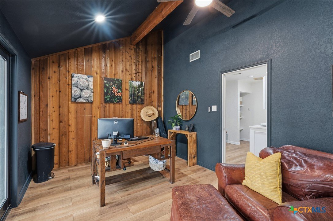 Set on nearly an acre beneath a stunning canopy of around 60 mature oak trees, this exquisitely remodeled ranch-style farmhouse offers refined luxury, thoughtful design, and exceptional versatility. The home features 5 bedrooms, 3.5 bathrooms, and 3 distinct living areas, creating effortless flow for daily family living and entertaining. The open-concept kitchen is a showpiece, appointed with quartz countertops, custom white oak cabinetry, farmhouse sink, double ovens, wet bar, and butler’s pantry, all centered around a large island and seamlessly opening to a spacious living area with a wood burning fireplace. Oversized front and back porches and a covered patio with outdoor fireplace extend the living space outdoors in every season. The private primary suite is a true sanctuary, boasting two expansive, separate closets, a spa-inspired bath with zero-entry walk-in shower, dual white oak vanities, and a soaking tub. On the other side of the home, a dedicated kids’ wing offers its own living room, two bedrooms, full bath, and two lofts, providing ideal separation and flexibility. Additional features include a 2-car attached garage, and a 2-bay high-ceiling carport for your "toys" with attached flex room with central hvac currently used as a home gym, with a full bath. The back yard also boasts a greenhouse, and metal building for storage or future shop space. This one-of-a-kind property delivers luxury living with focus on functionality in a serene, tree-filled setting designed for modern lifestyles.