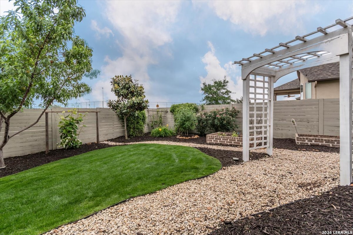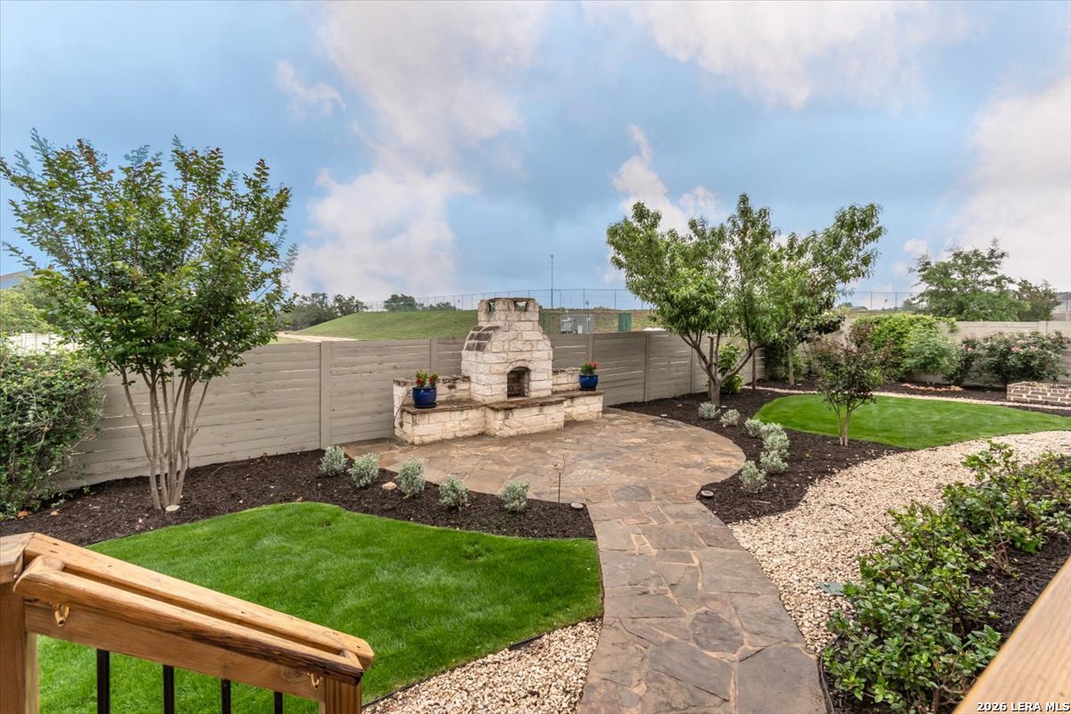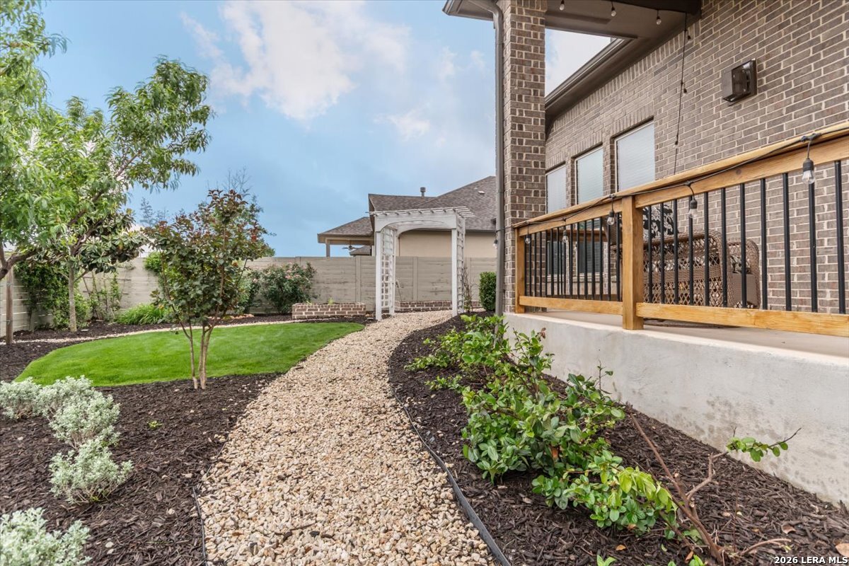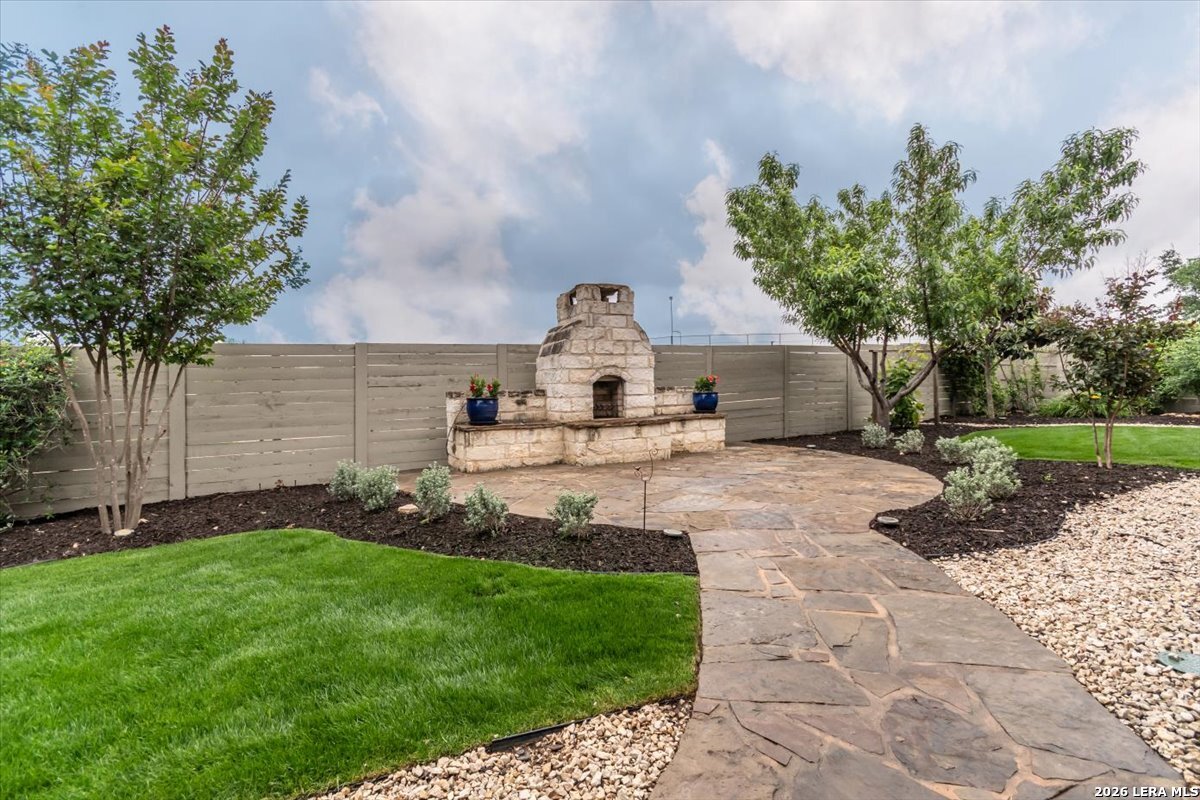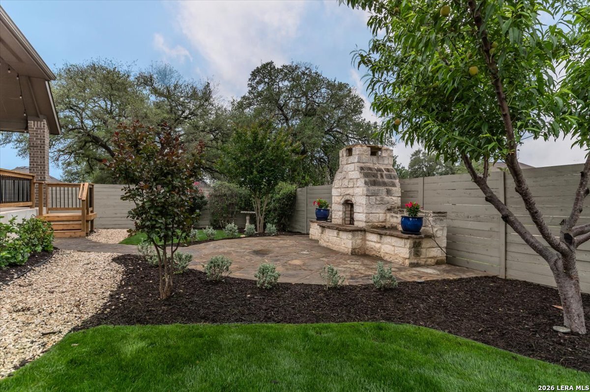 Welcome to your inviting oasis offering 4-bedroom, 3 full bath home with approximately 2,679 sq. ft. of thoughtfully designed living space. A long, wide entry hall creates a grand first impression, leading into the open-concept living and dining area with views of the beautifully maintained backyard. The spacious kitchen is ideal for entertaining, featuring granite countertops, a gas cooktop, double ovens, a generous pantry, and abundant tall cabinetry. The private primary suite offers a relaxing retreat with dual vanities, a walk-in shower, soaking tub, and an oversized walk-in closet with built-in shelving. Secondary bedrooms all include walk-in closets with a functional layout offering both shared and private bath access. Step outside to enjoy a stunning backyard complete with a large, covered patio, brick outdoor fireplace, and mature fruiting landscape including a peach tree, grapevines, and blackberry bushes-perfect for relaxing or hosting gatherings. No back neighbors for added privacy, Additional highlights include a 3-car garage with a third bay equipped with 220V electrical for an EV and a tankless water heater for efficiency. Attic space is floored for extra storage. Located in a vibrant community featuring a lazy river pool, resort-style pool, fitness center, and an active lifestyle atmosphere. Conveniently close to schools, shopping, dining, and city center. This home truly has it all!
