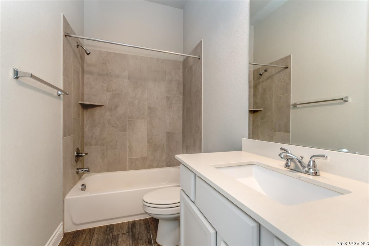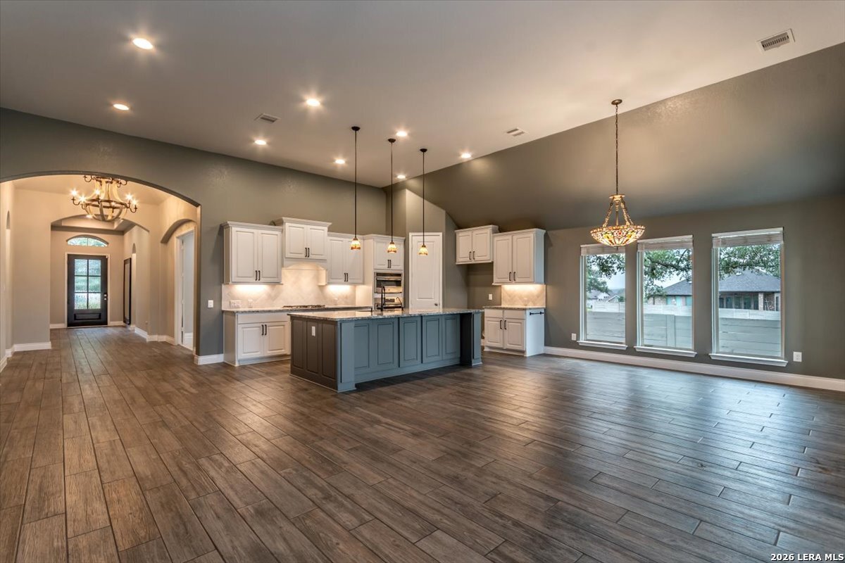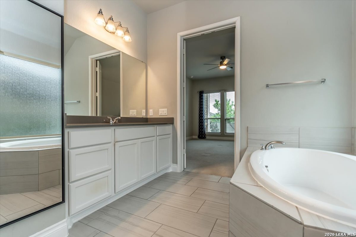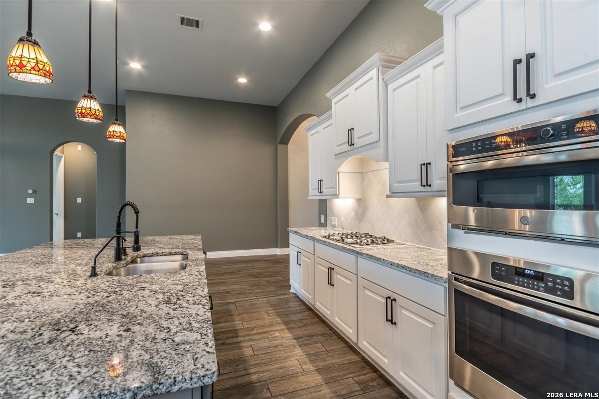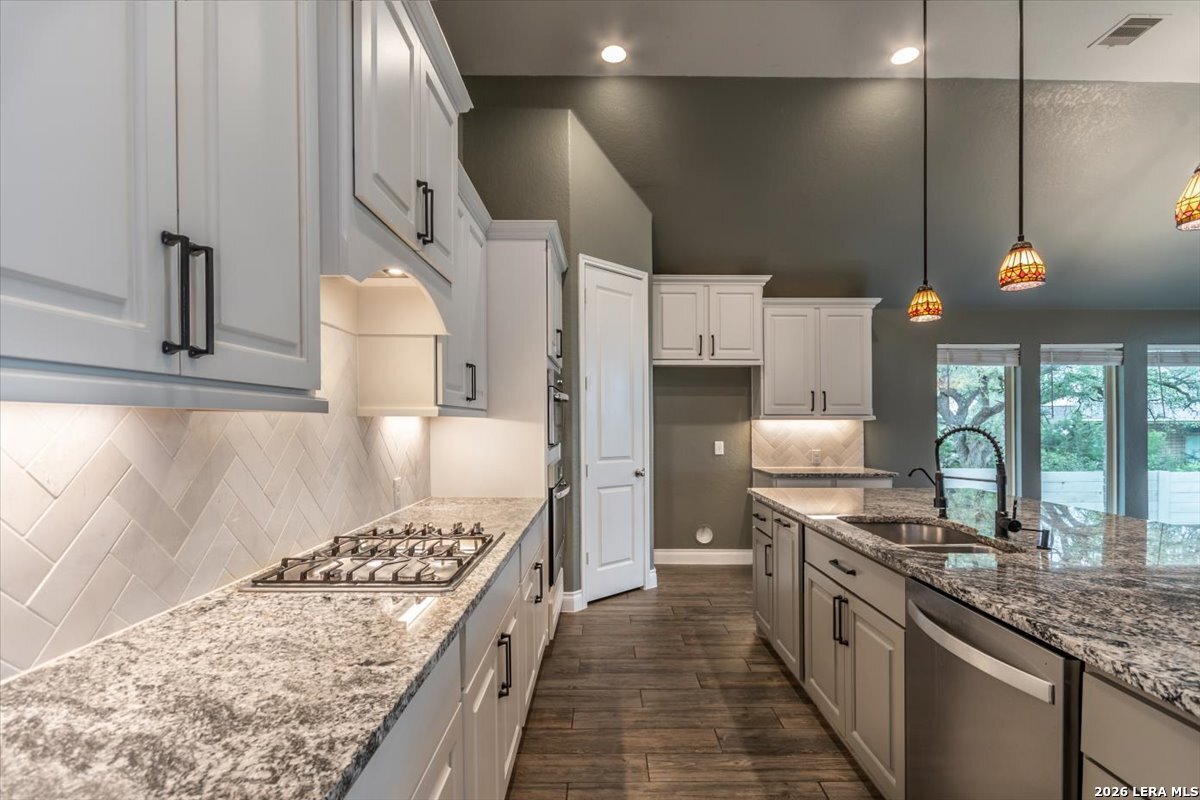 Welcome to your inviting oasis offering 4-bedroom, 3 full bath home with approximately 2,679 sq. ft. of thoughtfully designed living space. A long, wide entry hall creates a grand first impression, leading into the open-concept living and dining area with views of the beautifully maintained backyard. The spacious kitchen is ideal for entertaining, featuring granite countertops, a gas cooktop, double ovens, a generous pantry, and abundant tall cabinetry. The private primary suite offers a relaxing retreat with dual vanities, a walk-in shower, soaking tub, and an oversized walk-in closet with built-in shelving. Secondary bedrooms all include walk-in closets with a functional layout offering both shared and private bath access. Step outside to enjoy a stunning backyard complete with a large, covered patio, brick outdoor fireplace, and mature fruiting landscape including a peach tree, grapevines, and blackberry bushes-perfect for relaxing or hosting gatherings. No back neighbors for added privacy, Additional highlights include a 3-car garage with a third bay equipped with 220V electrical for an EV and a tankless water heater for efficiency. Attic space is floored for extra storage. Located in a vibrant community featuring a lazy river pool, resort-style pool, fitness center, and an active lifestyle atmosphere. Conveniently close to schools, shopping, dining, and city center. This home truly has it all!