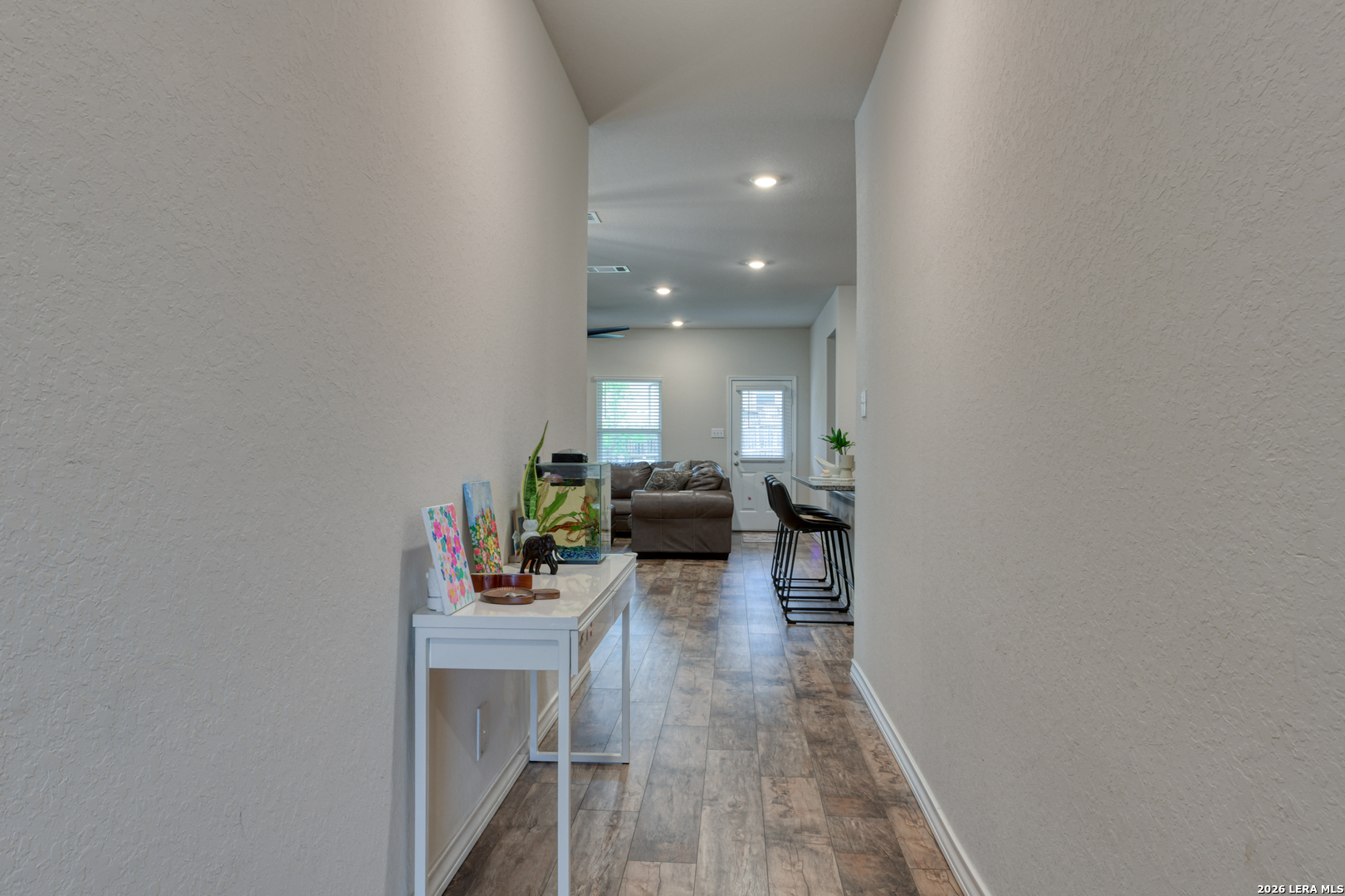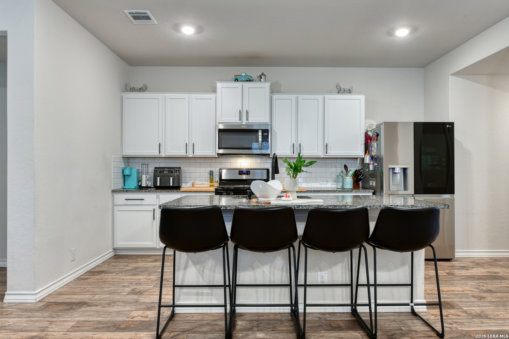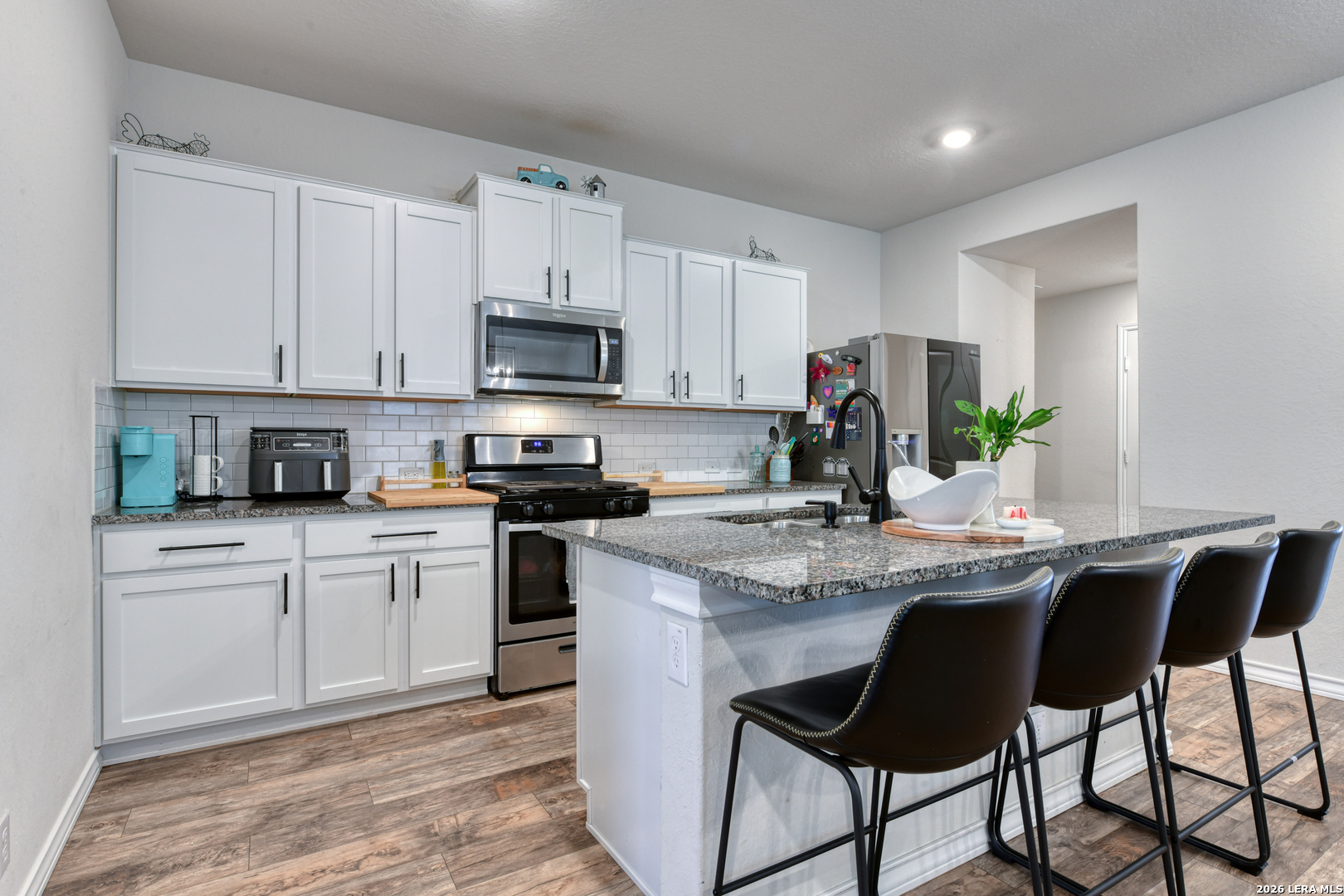 Welcome to The Caden floor plan in Brookstone Creek-where smart design meets everyday comfort in this beautifully maintained single-story home in San Antonio. Offering 1595 sq ft, 3 bedrooms, and 2 full baths, this home features an open-concept layout. The kitchen is the heart of the home, showcasing stainless steel appliances, gas cooking, a deep farmhouse sink, classic white subway tile backsplash, and a spacious island with seating. An extended pantry provides abundant storage and functionality. The private primary suite offers a relaxing retreat with a tiled walk-in shower and generous walk-in closet. Secondary bedrooms are well-sized with ample closet space and natural light. Additional features include luxury vinyl flooring throughout main living areas and wet zones, covered patio, sprinkler system, water softener, EV-ready 220V outlet, added attic storage platforms, and security system. Conveniently located near shopping, dining, and major highways, this home combines modern finishes with practical upgrades-ready for its next owner.