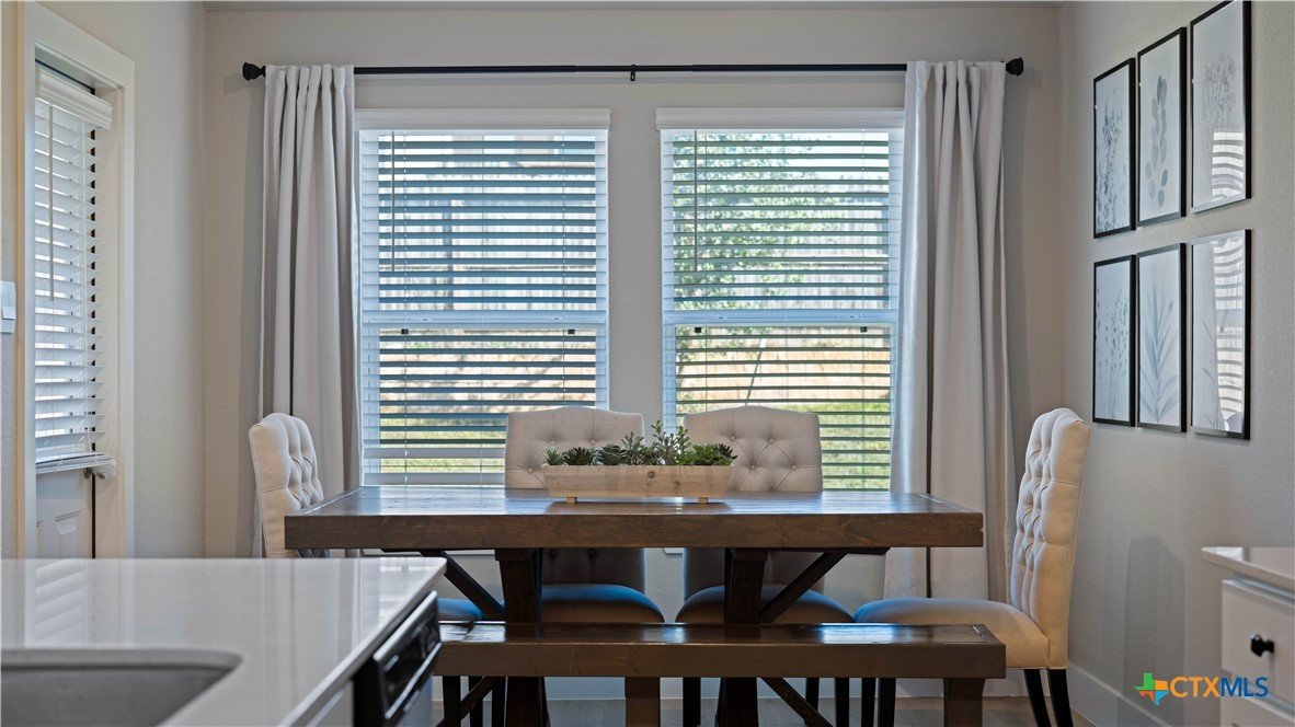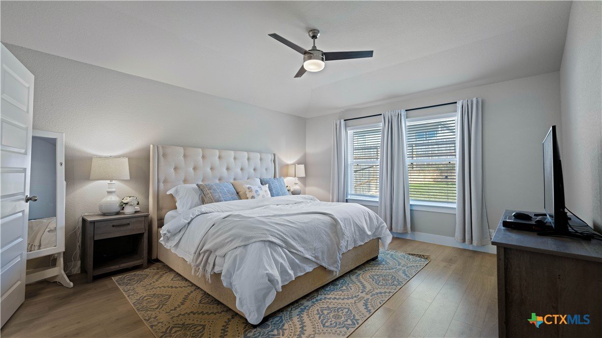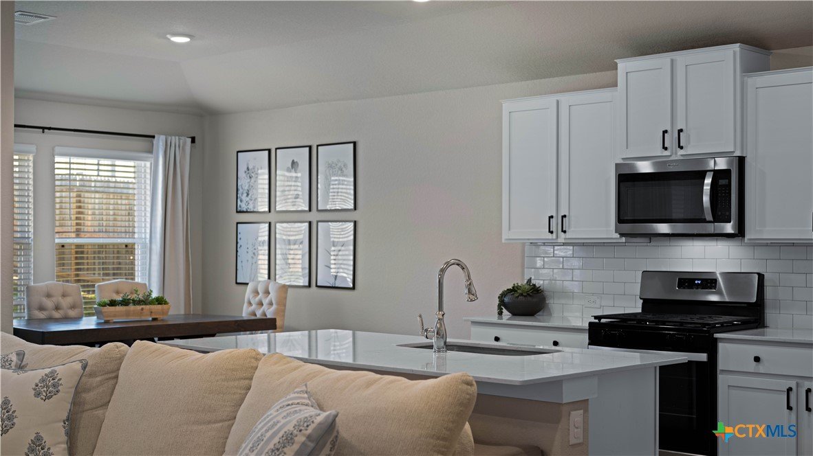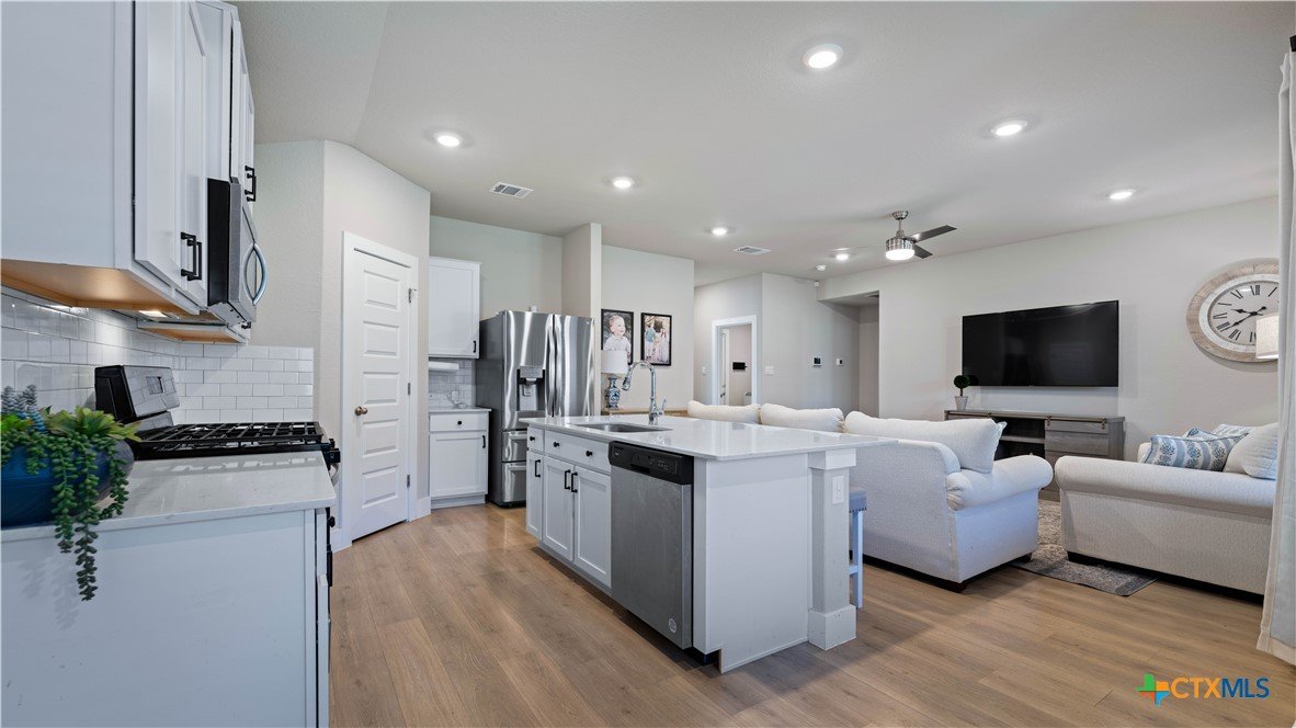 The Fargo plan blends timeless farmhouse inspiration with modern comfort in this beautifully crafted single-story home offering 1,665 square feet of thoughtfully designed living space. With four bedrooms and two bathrooms, the layout balances openness and privacy, beginning with an extended foyer that leads into a light-filled open-concept living room, kitchen, and dining room-ideal for both everyday living and entertaining. The kitchen is the heart of the home, featuring quartz countertops, stainless steel appliances, an oven/range combo, a walk-in corner pantry, and a generous center island with a deep single-bowl sink. A refrigerator is included for added convenience. Light oak Mohawk RevWood flooring throughout the home enhances the farmhouse aesthetic with warmth, durability, and a cohesive upscale finish. The dining room opens to a covered patio and professionally landscaped backyard with full irrigation, creating a seamless indoor-outdoor living experience. Privately situated, the primary suite offers a serene retreat with dual vanity sinks, an expansive walk-in closet, a separate water closet, and a spacious walk-in shower accented with classic white subway tile. Three secondary bedrooms and a full bathroom are thoughtfully positioned on the opposite side of the home for comfort and privacy. Additional highlights include tile flooring in all bathrooms and the utility room, faux wood cordless window blinds, and a pre-plumbed water softener loop. Completing the home is the Home Is Connected Smart Home package, featuring a smart thermostat, smart light switch, home hub, smart front door lock, video doorbell, and 24/7 video surveillance, offering modern convenience and peace of mind. VA Loan Assumption for VA buyer available!